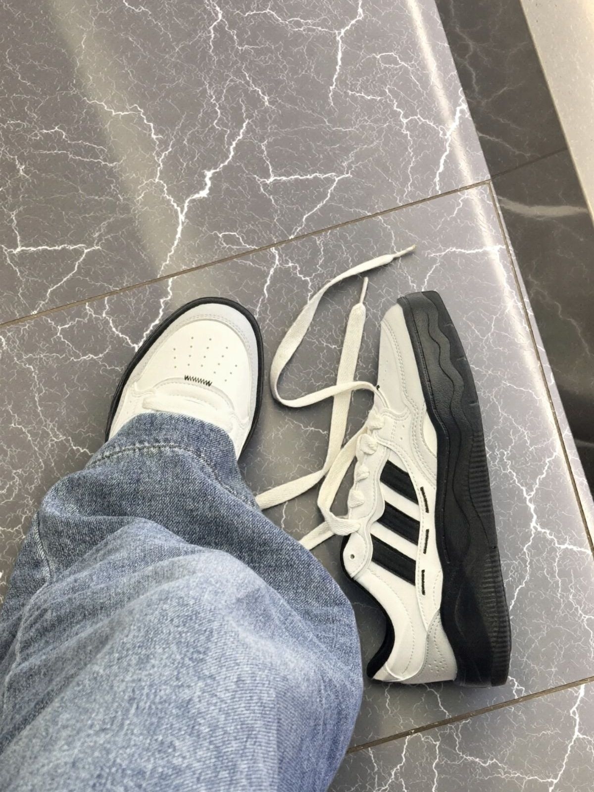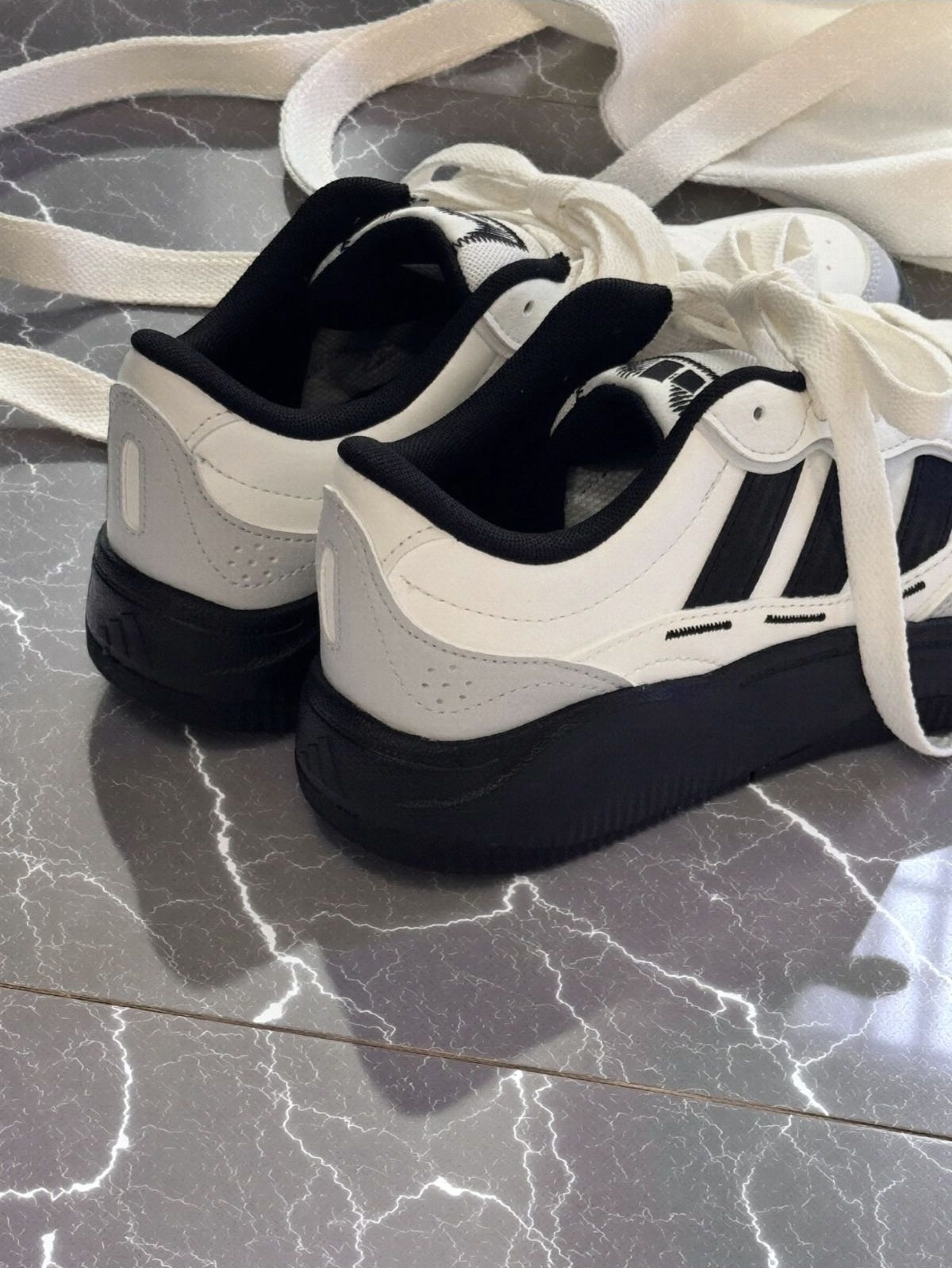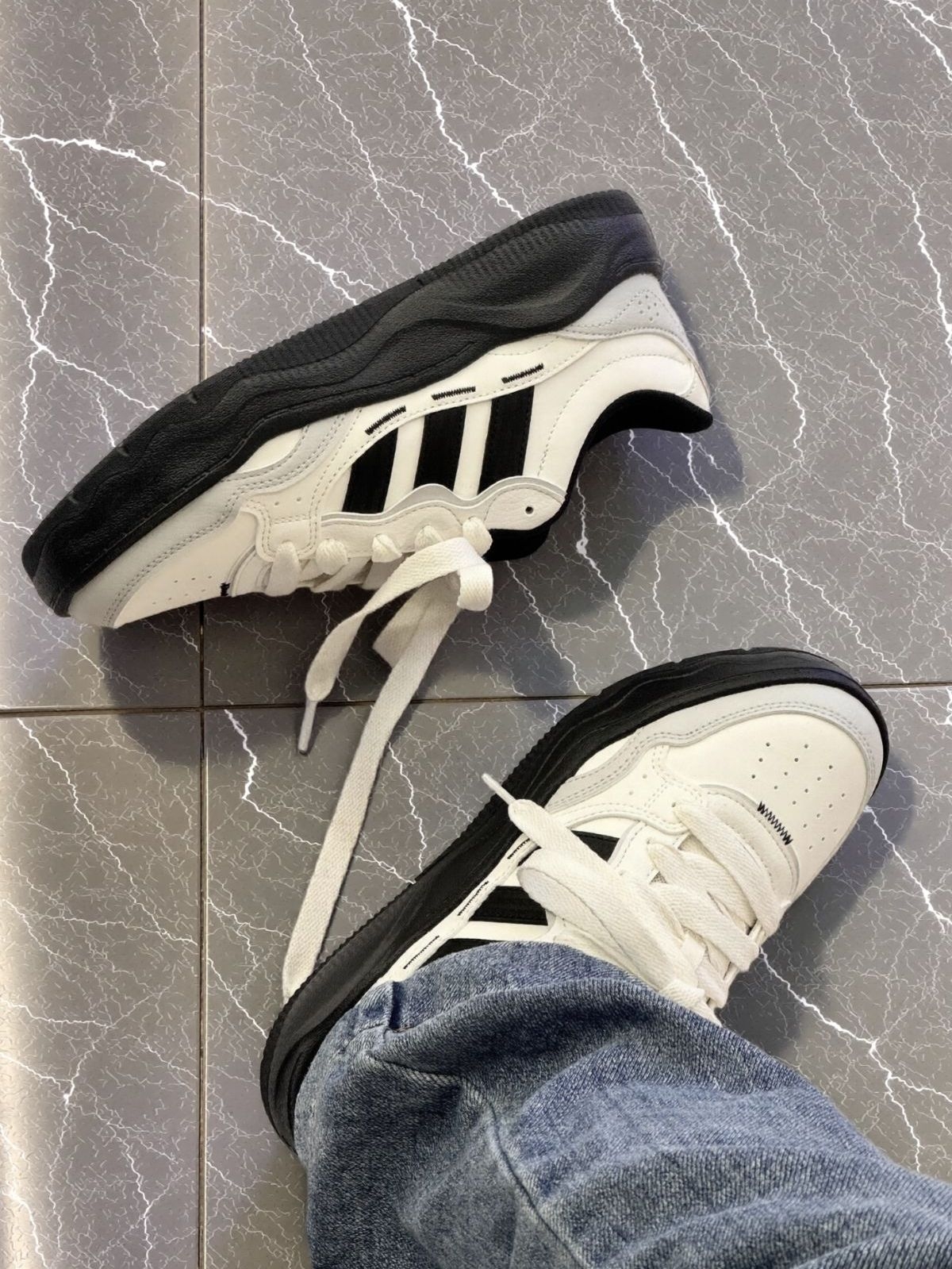 经典的三条杠搭配熊猫配色,怎么搭都不出错。今 天随手配了条直筒牛仔裤,慵懒又随性。 原本担心厚底会硬,没想到踩下去软软的,暴走一 天都不磨脚。皮面材质透气不闷脚,厚底设计还能 缓解久站的疲惫。还好打理,脏了用湿巾一擦就干 净了。出门逛街、上班通勤都能穿#板鞋春日氛围 感