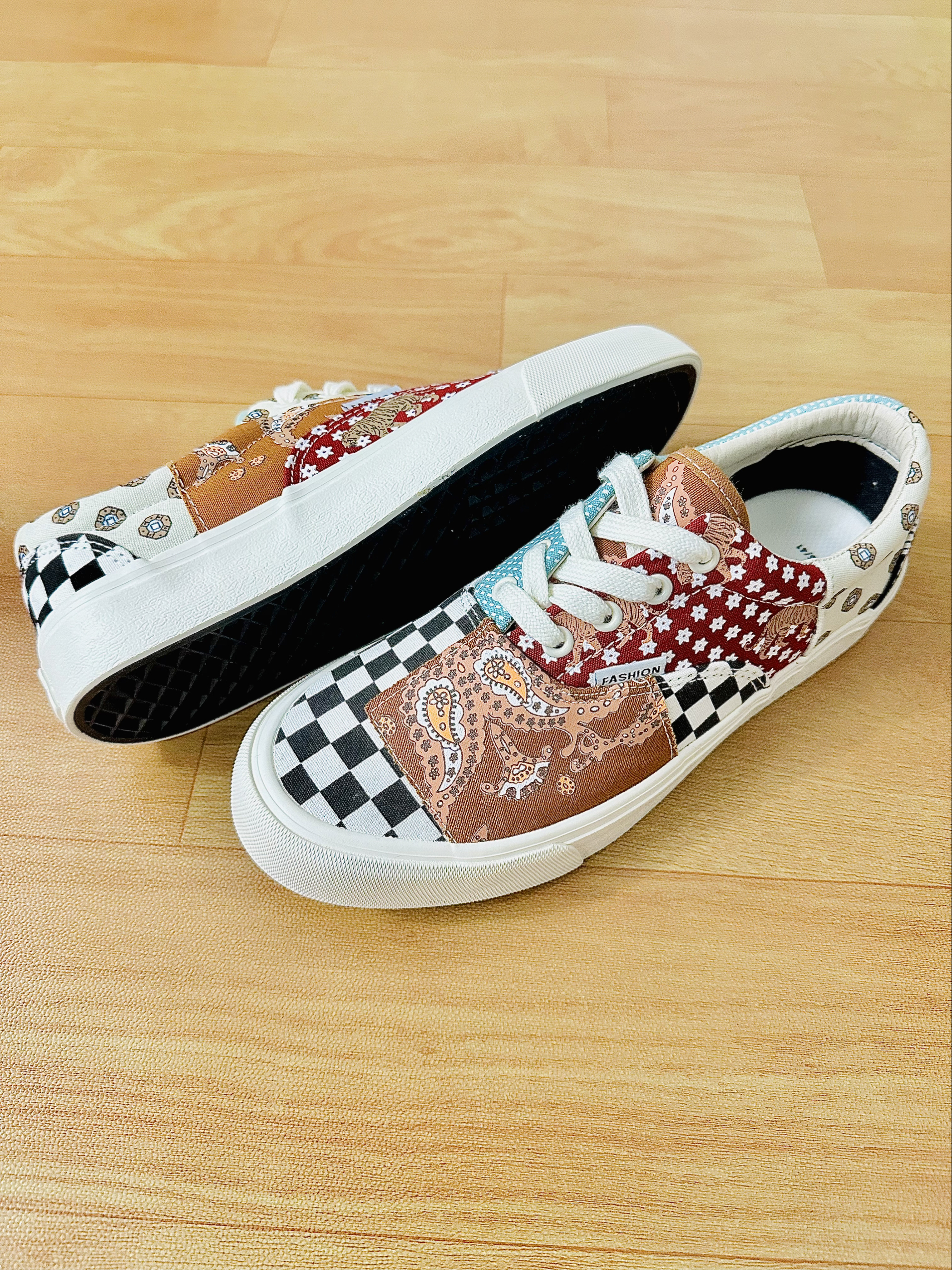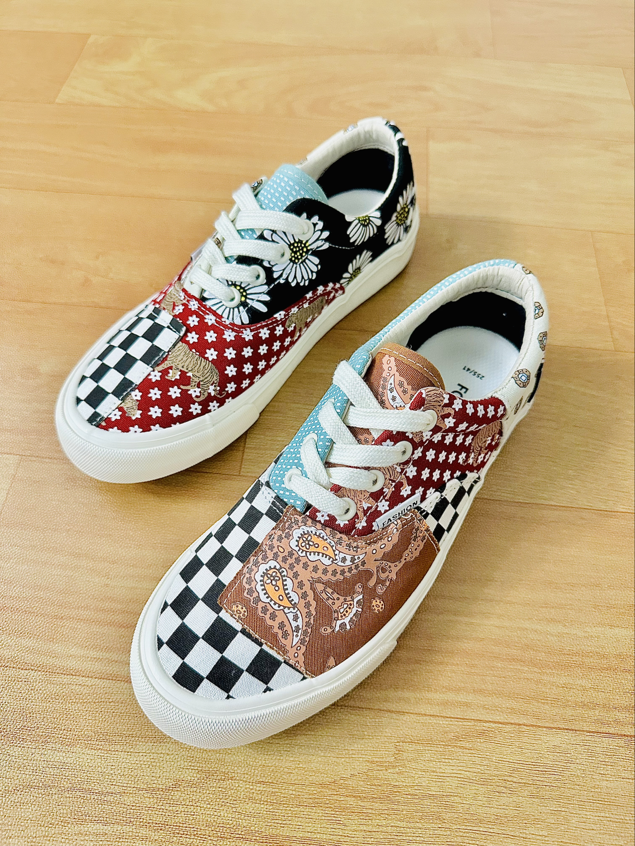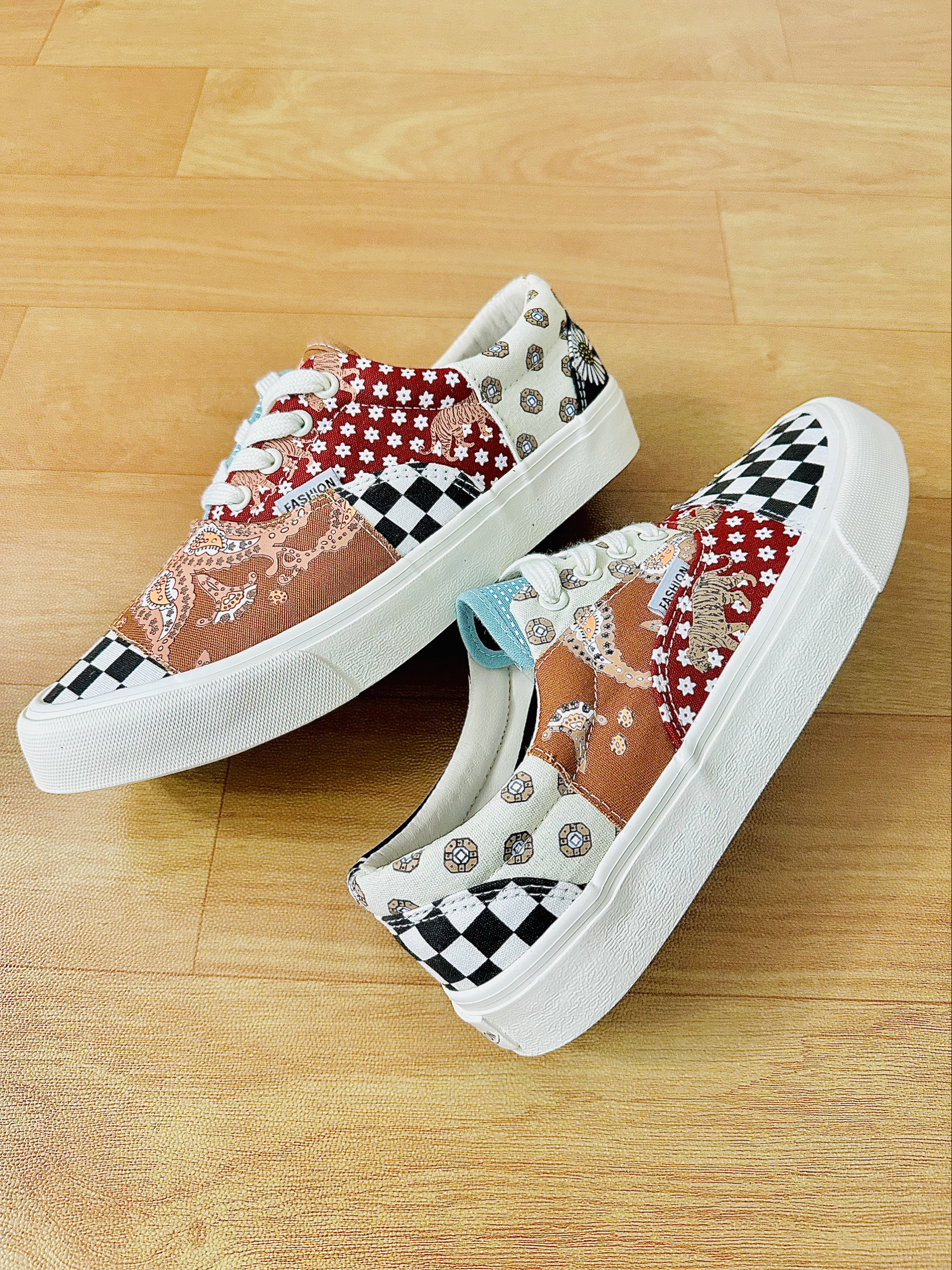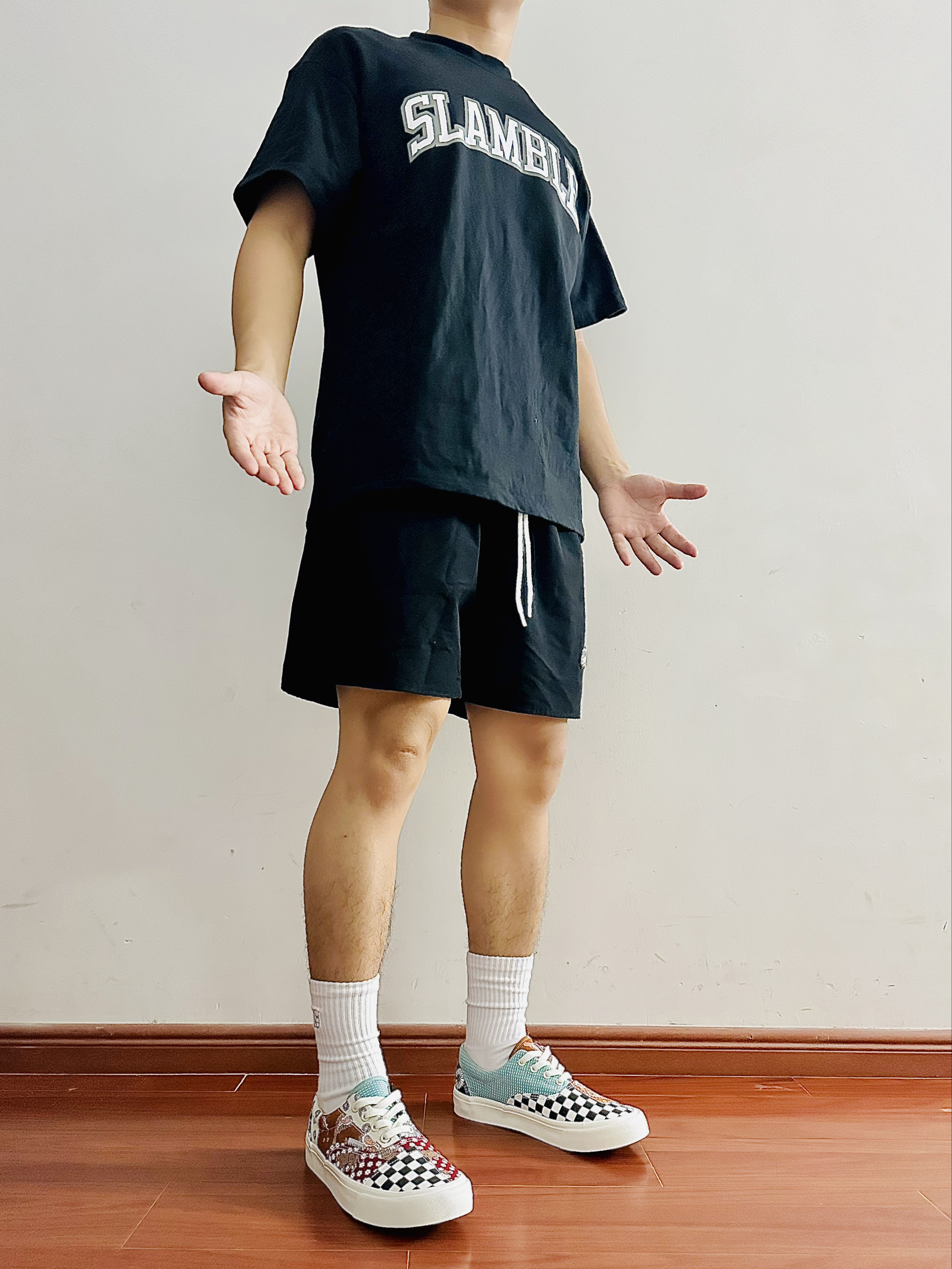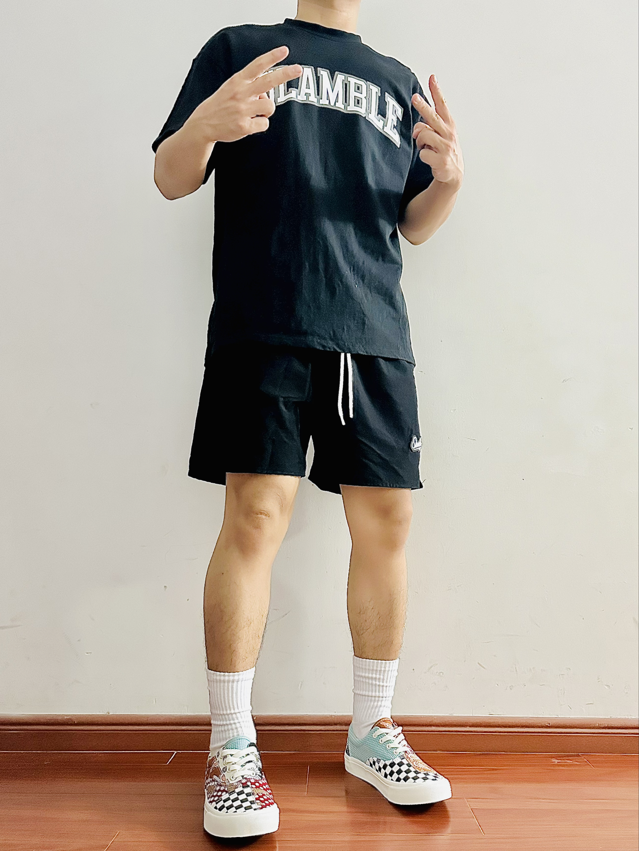 今天日常出门就这样穿还不错吧 黑色印花短袖➕黑色短裤➕腰果花板鞋 👟: FOREVER 21 腰果花系列板鞋 看的第一眼就被它 鞋面的腰果花元素吸引💫 鞋面使用多种皮革和帆布材质拼接 质感细腻柔软 颜值很不错很吸睛😍 日常搭配一条短裤和白色长袜 很显青春阳光