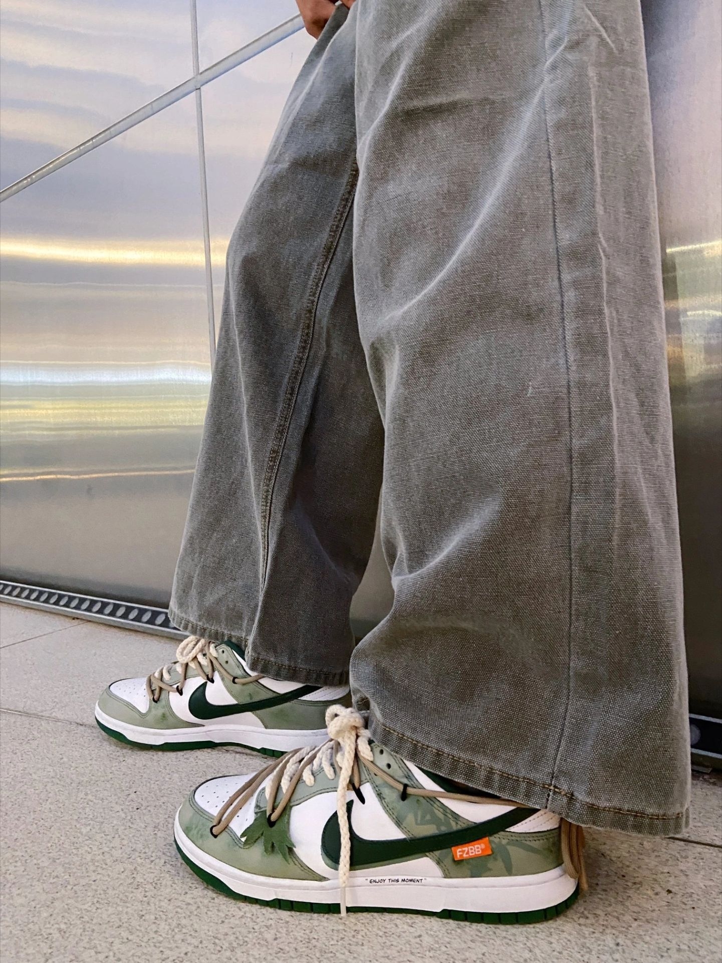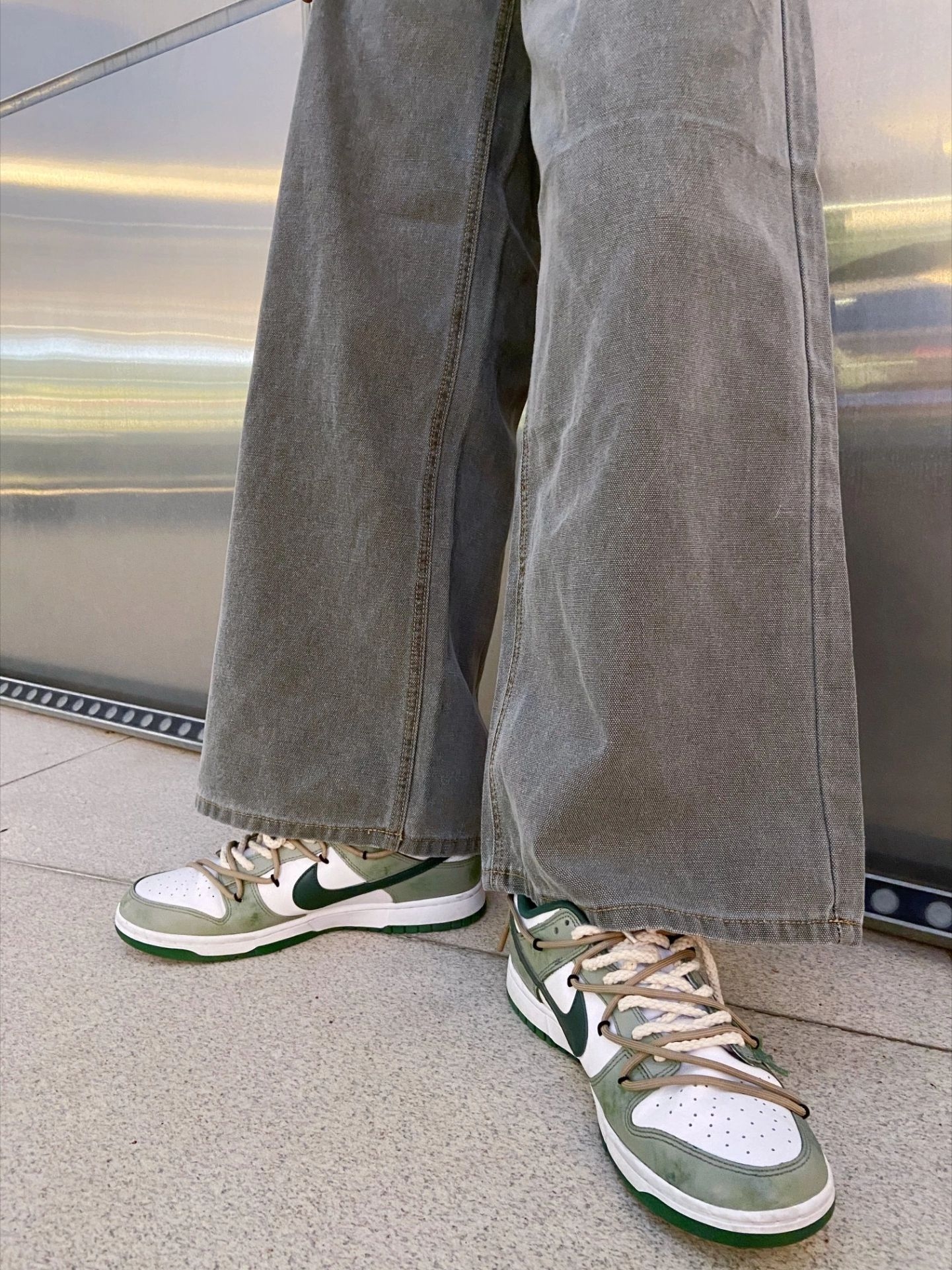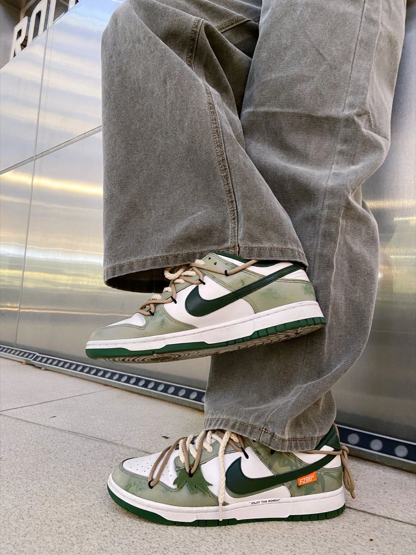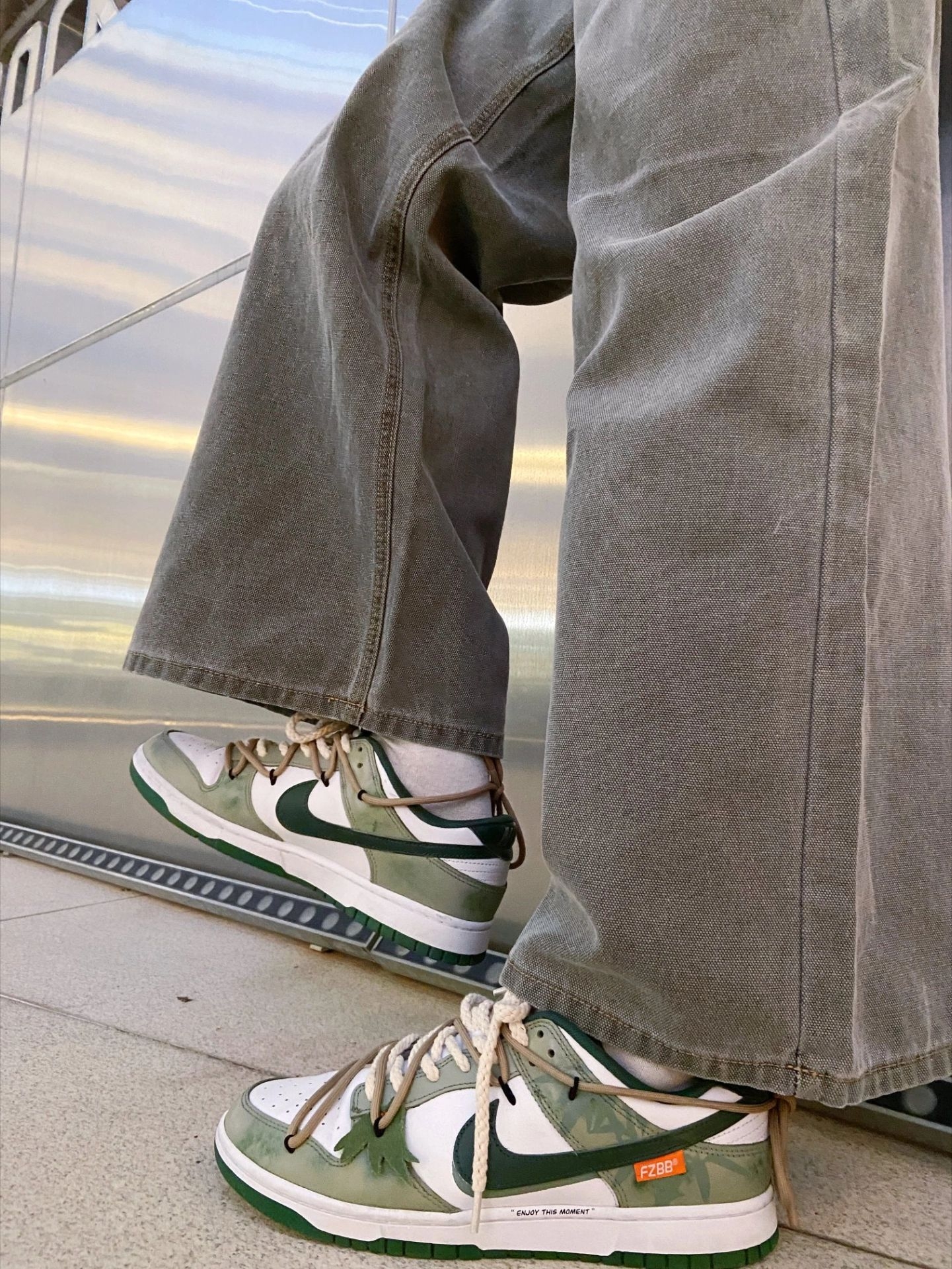 我的新Dunk青竹林,穿得我不想换鞋|||最近天天踩这双Nike Dunk Low青竹林,脚都快粘在鞋上了——这国风做旧感真的戳死我! 白绿主调像把春天的青竹林揉进鞋里,墨绿做旧加浅绿渐变,还有鞋身的迷彩纹理,远看像竹林里的光影,近看细节超有层次;双绳绑带的解构设计我超爱,每次系的时候都要松松垮垮绕两圈,街头感刚好,比原版多了点小个性,昨天穿去滑板,朋友盯着我脚说:“你这绑带系得比我鞋还帅”。 搭...