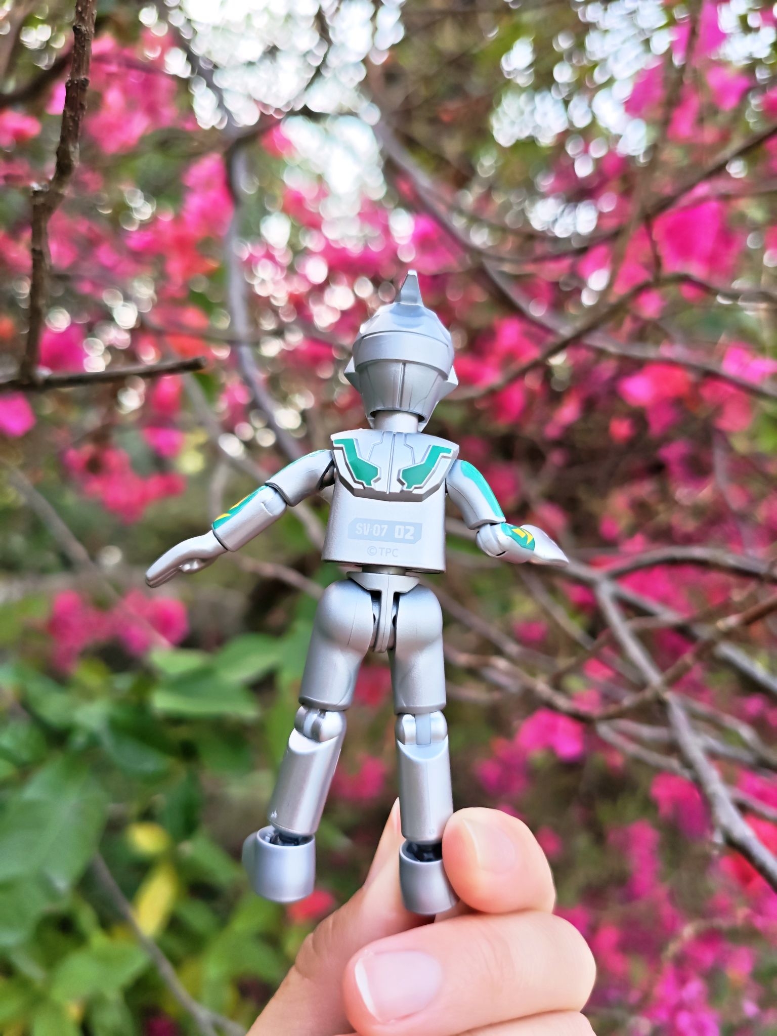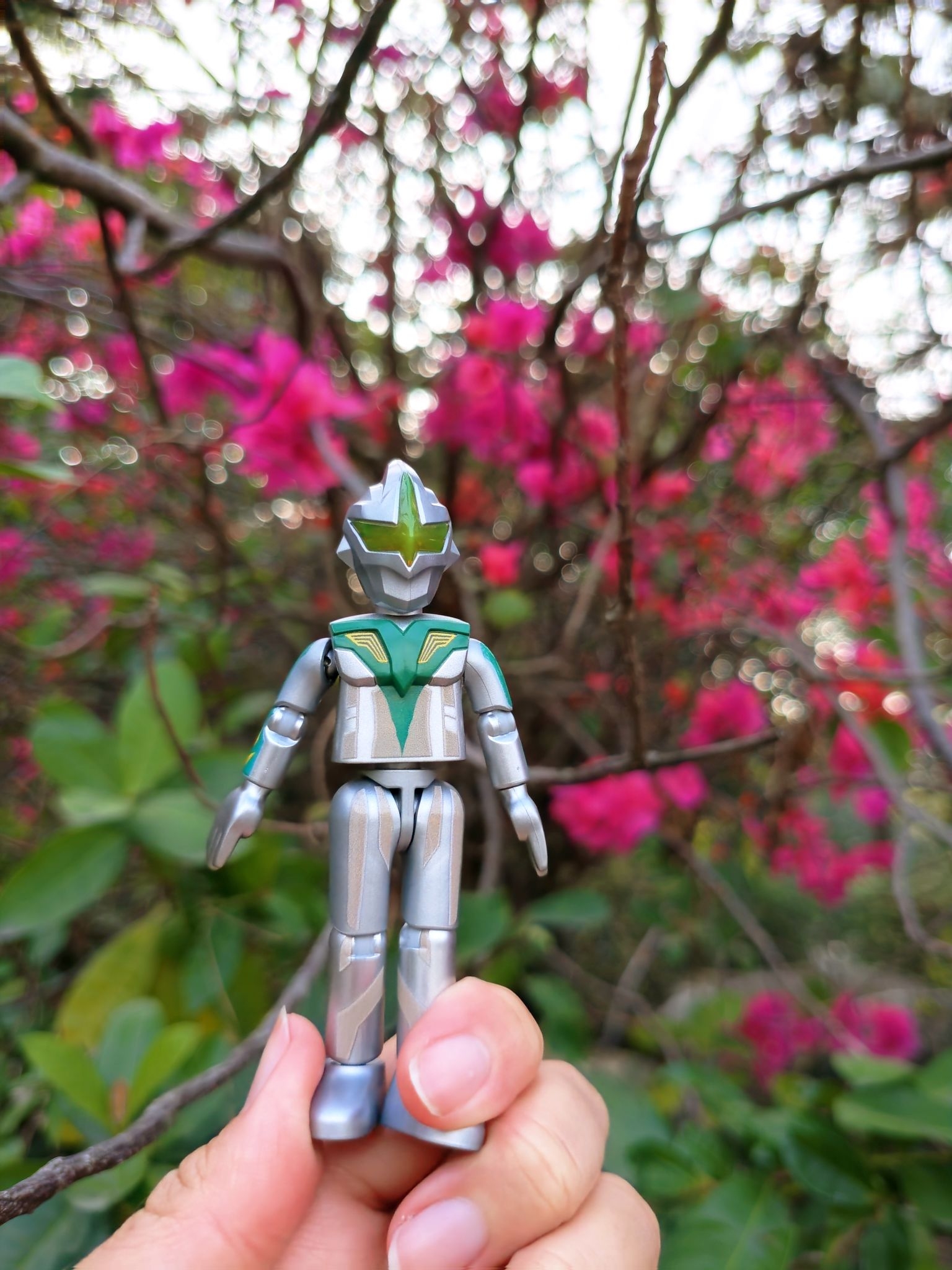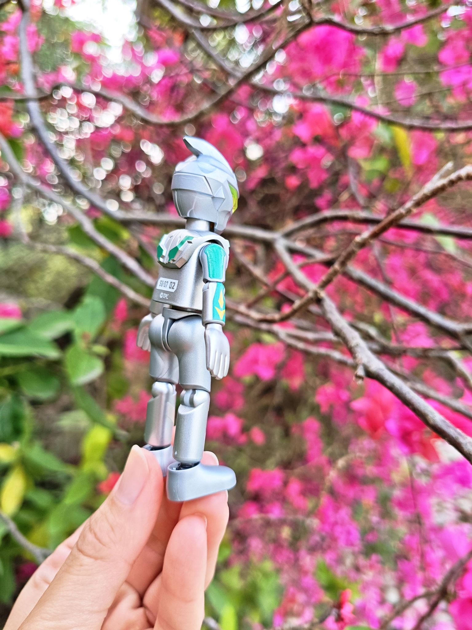 春日三角梅开得正好,忍不住把我的镜子骑士手办掏出来晒晒太阳~ 银绿配色清冷又高级,额头的绿色水晶面罩和胸口V形纹路还原度拉满,金属漆面在阳光下泛着细腻光泽,摸起来也很有分量。
