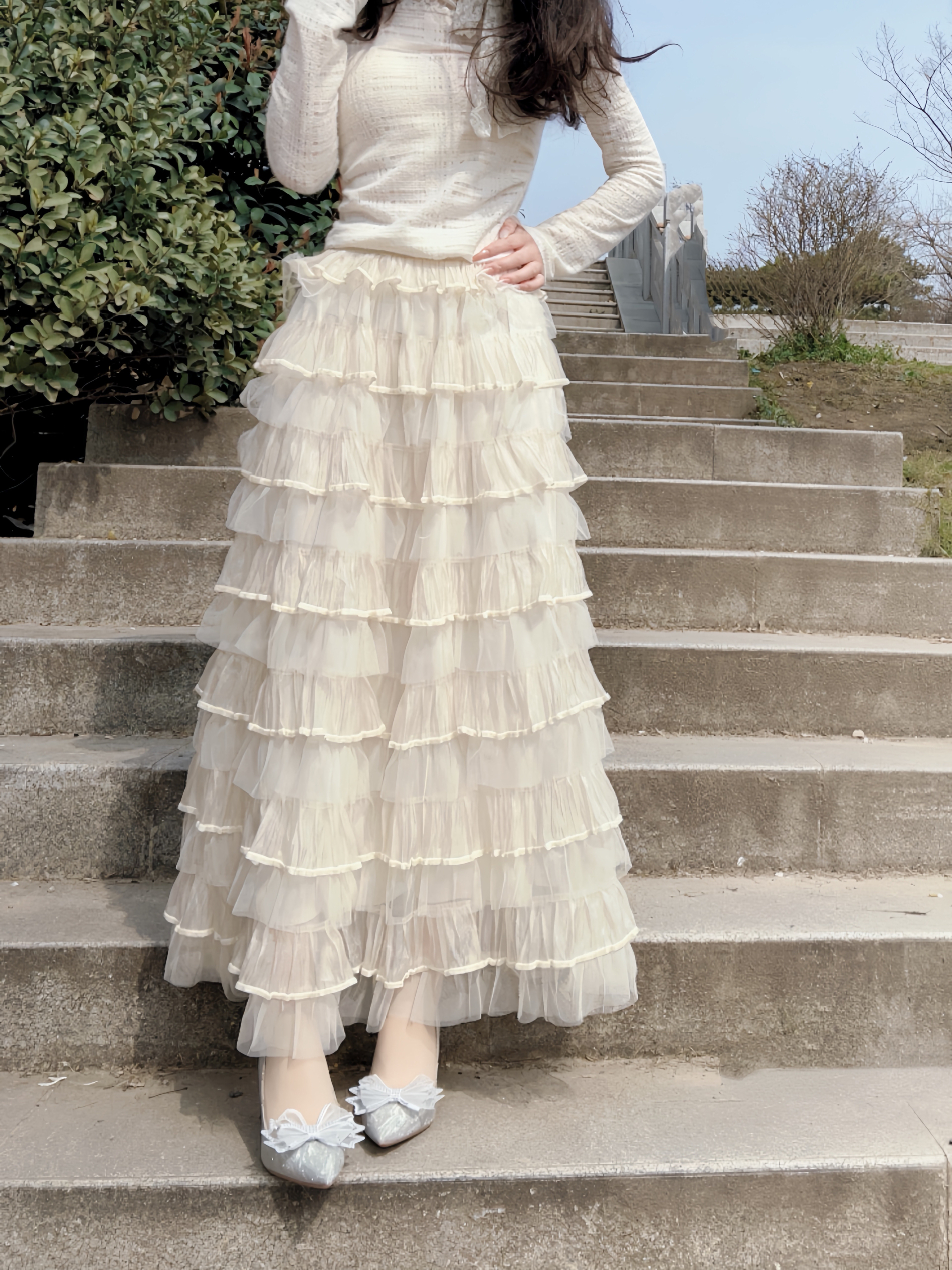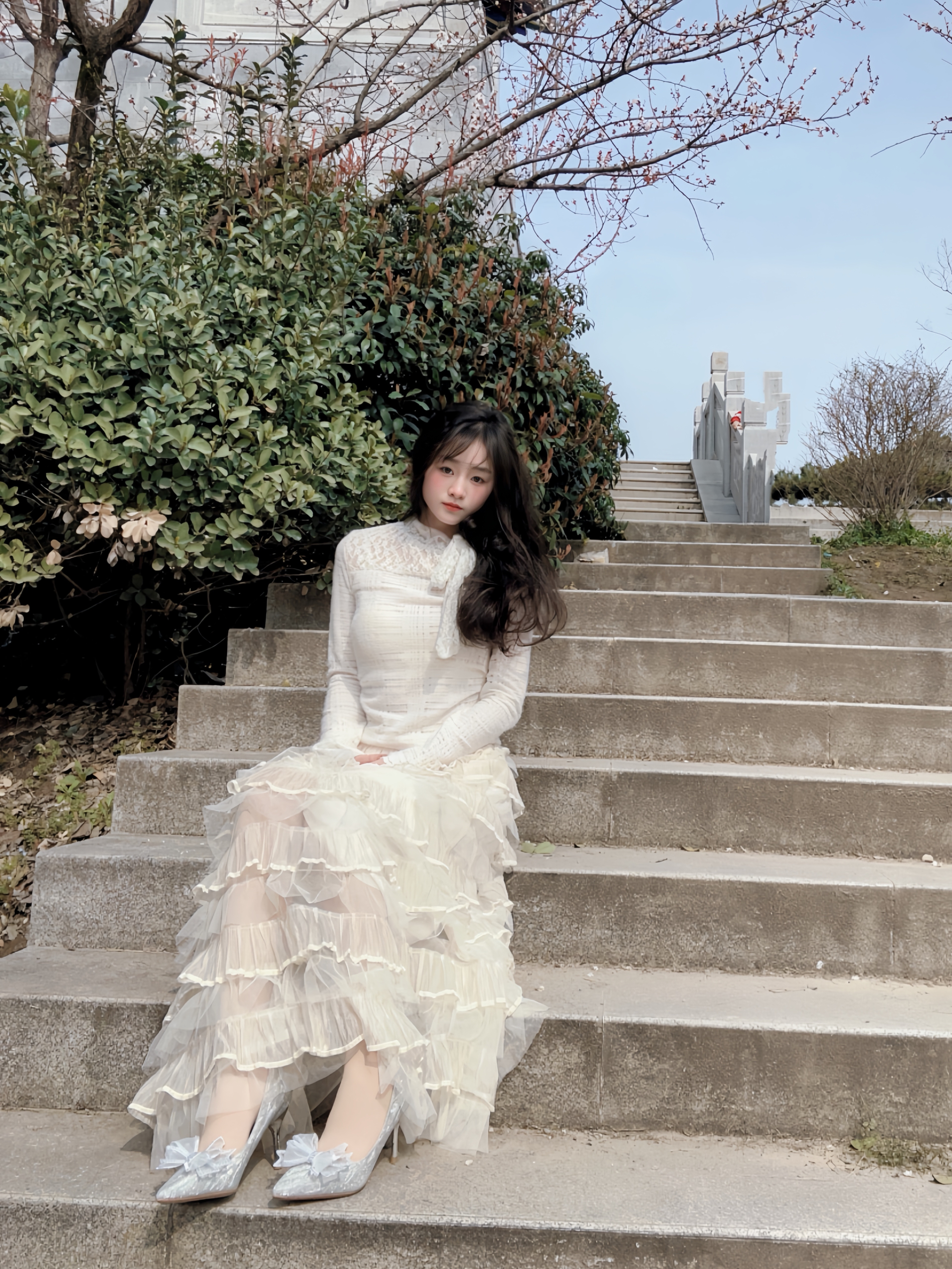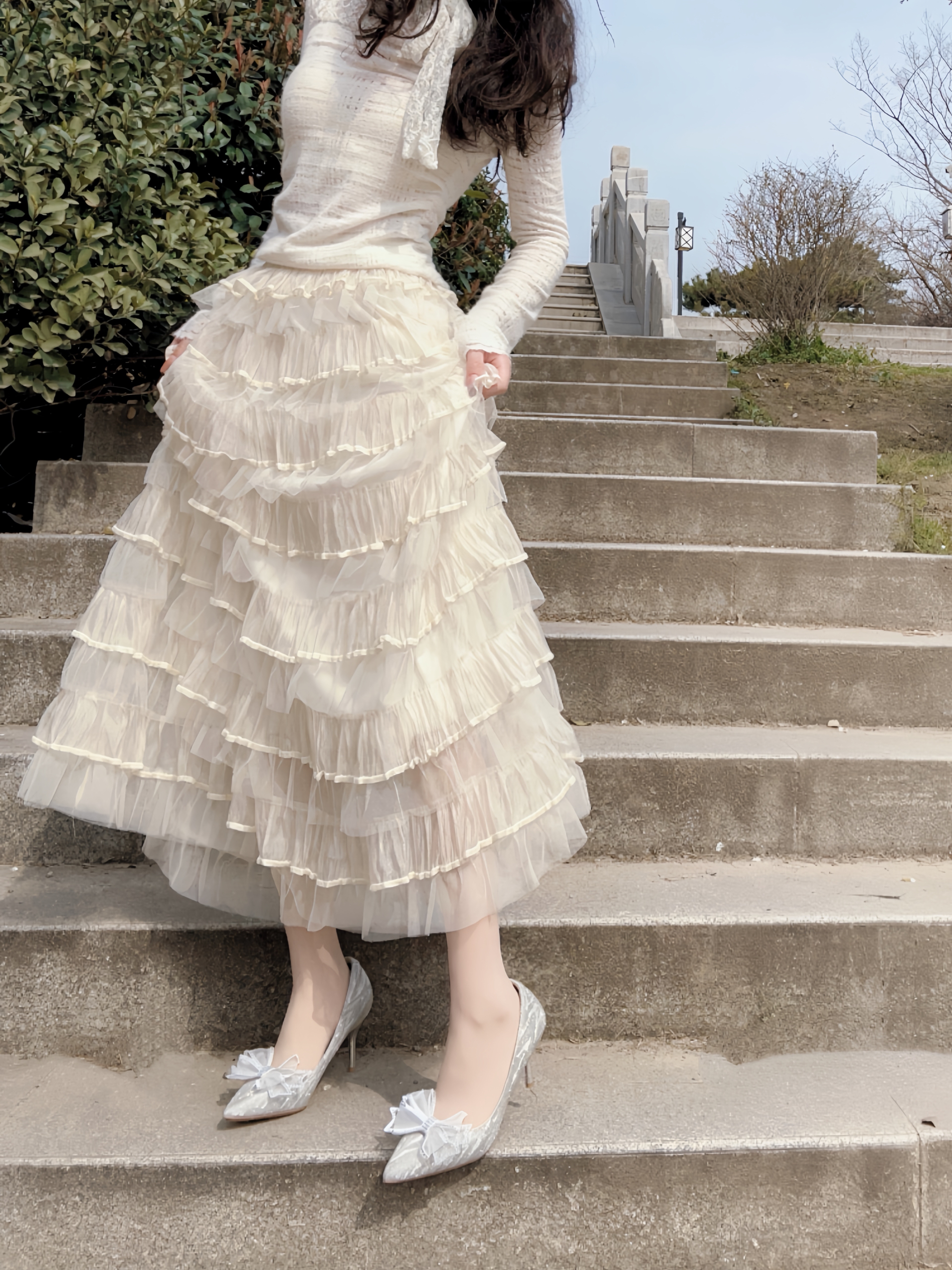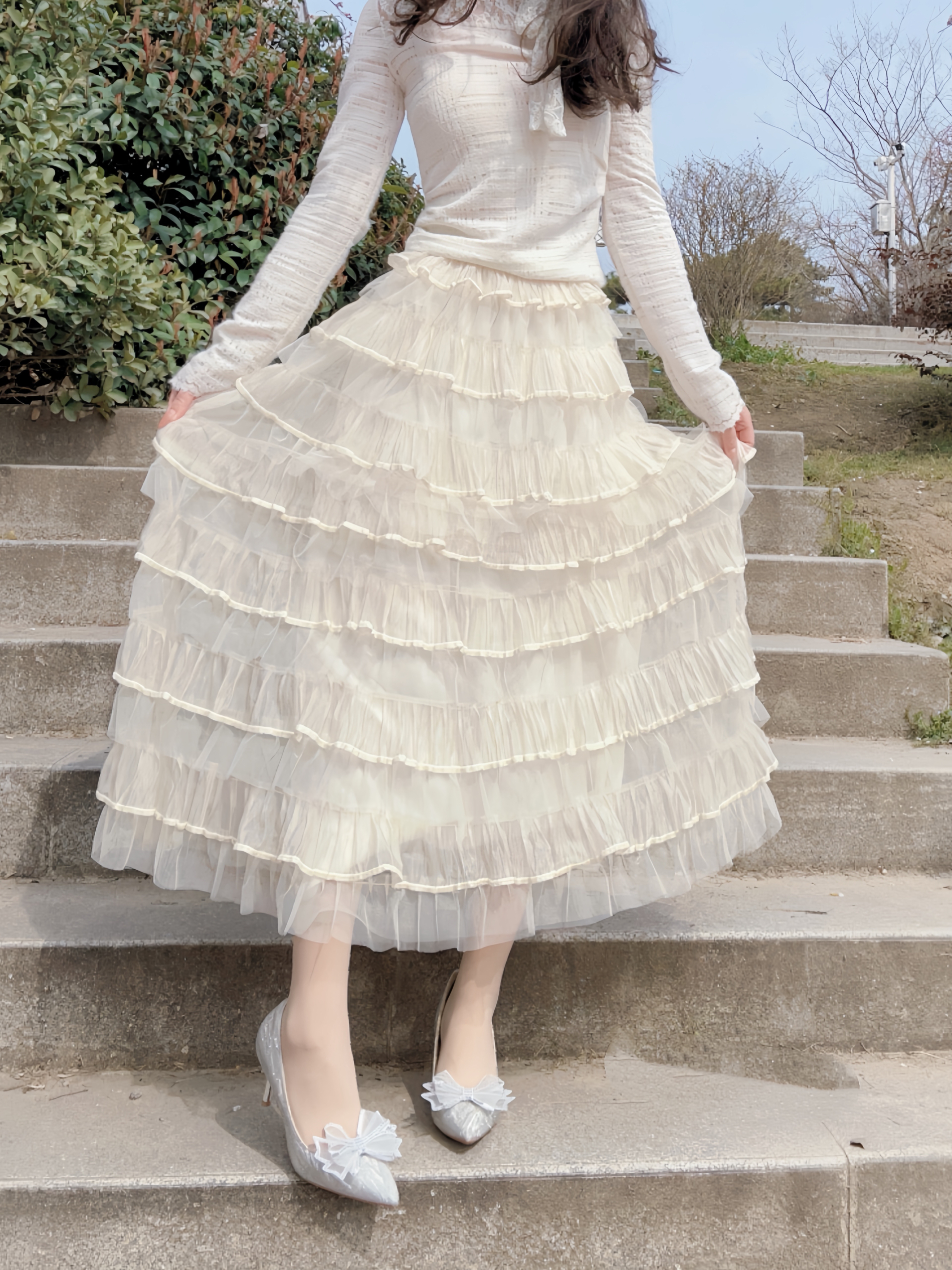 万物复苏 正是拍照好时节 高跟鞋是必不可少的氛围之一 搭配今天的半身蛋糕裙 想不出片都有点难哇🎊 银色在太阳下闪闪发光 鞋头蝴蝶结🎀搭配 温柔感满满 走楼梯也是稳稳当当滴 有这么一双很难不爱😻