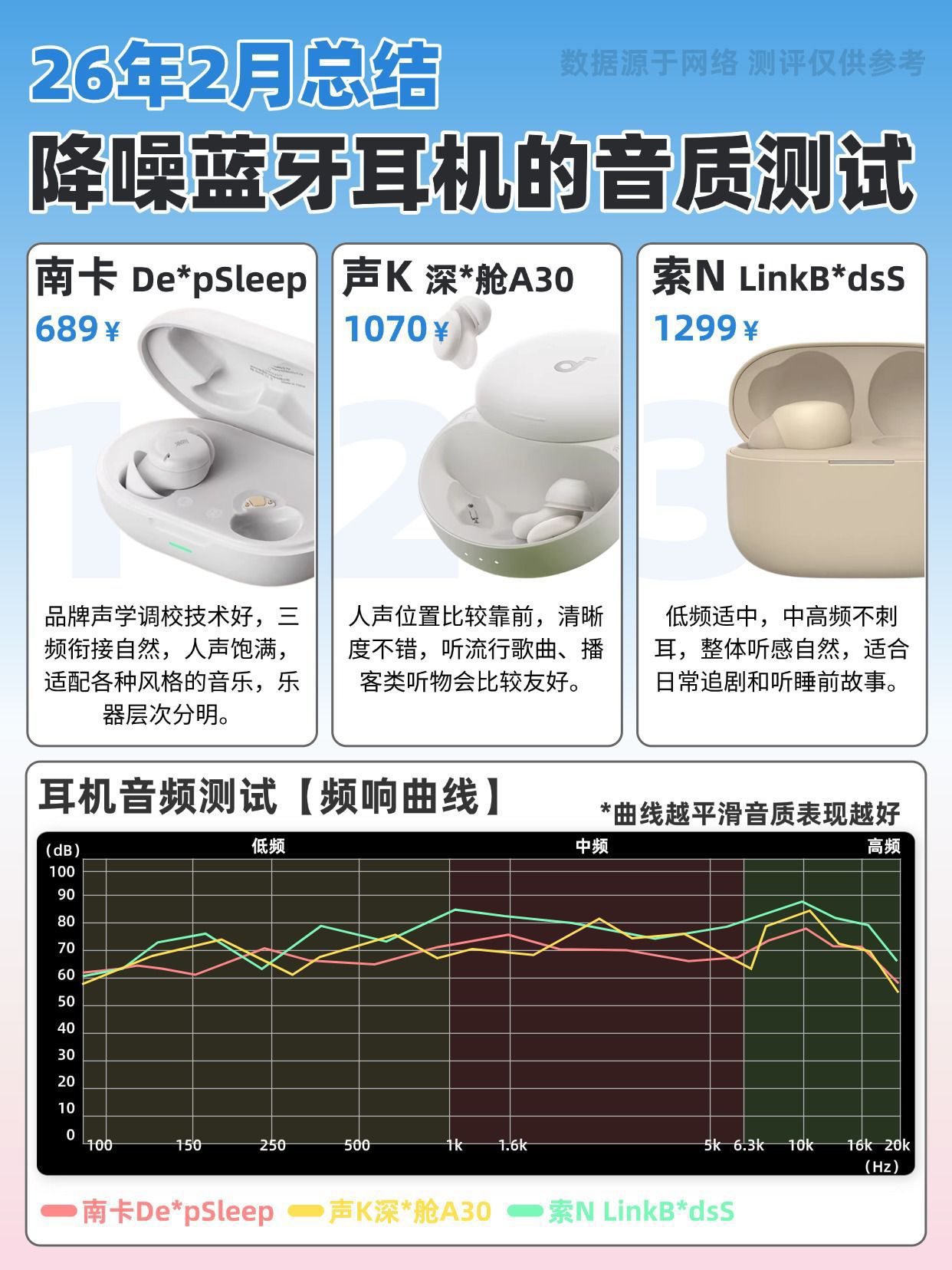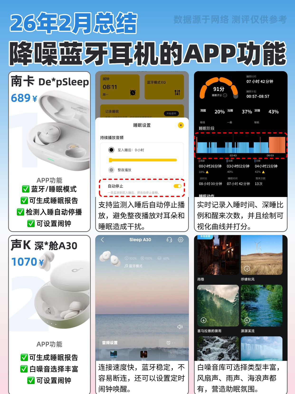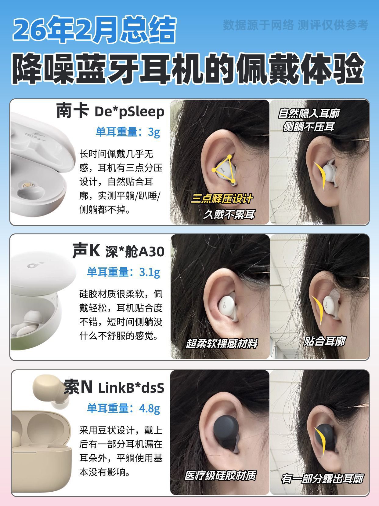 2026年总结睡觉可用的降噪蓝牙耳机推荐 我们一生有三分之一的时间都在睡眠中度过,好睡眠真的太重要了。不少朋友都在找戴着舒服、还能降噪的睡觉耳机,我专门挑了三款睡眠耳机实测,给有需要的小伙伴做个参考~ 南卡 DeepSleep 整体表现出色,耳机能很好地贴合耳廓,佩戴自然又舒服,侧睡、翻身都不压耳、不硌耳,也不容易移位;音质调校得很舒服,三频衔接流畅,不管是听歌还是播放白噪音,还原度都很高;还...