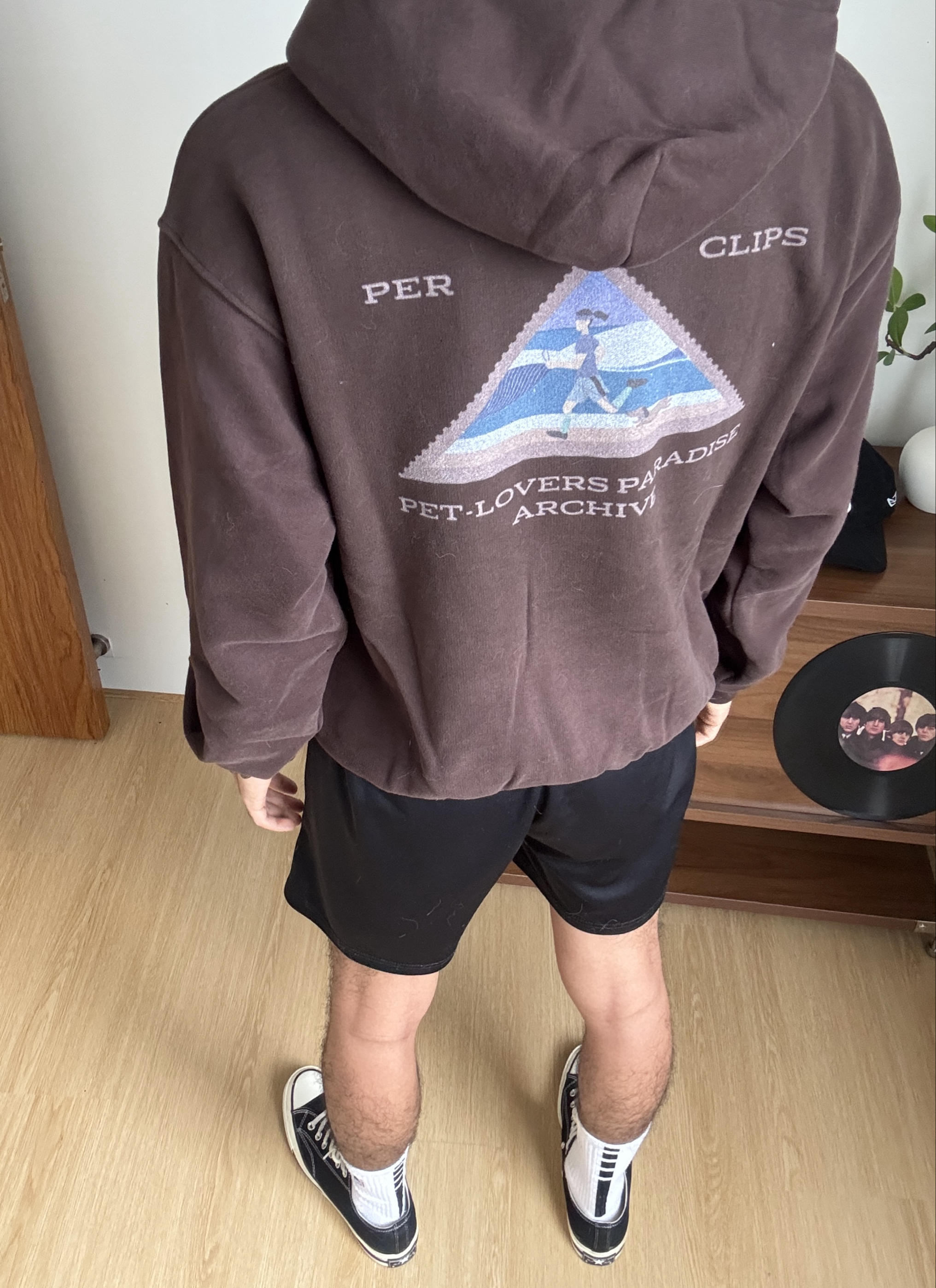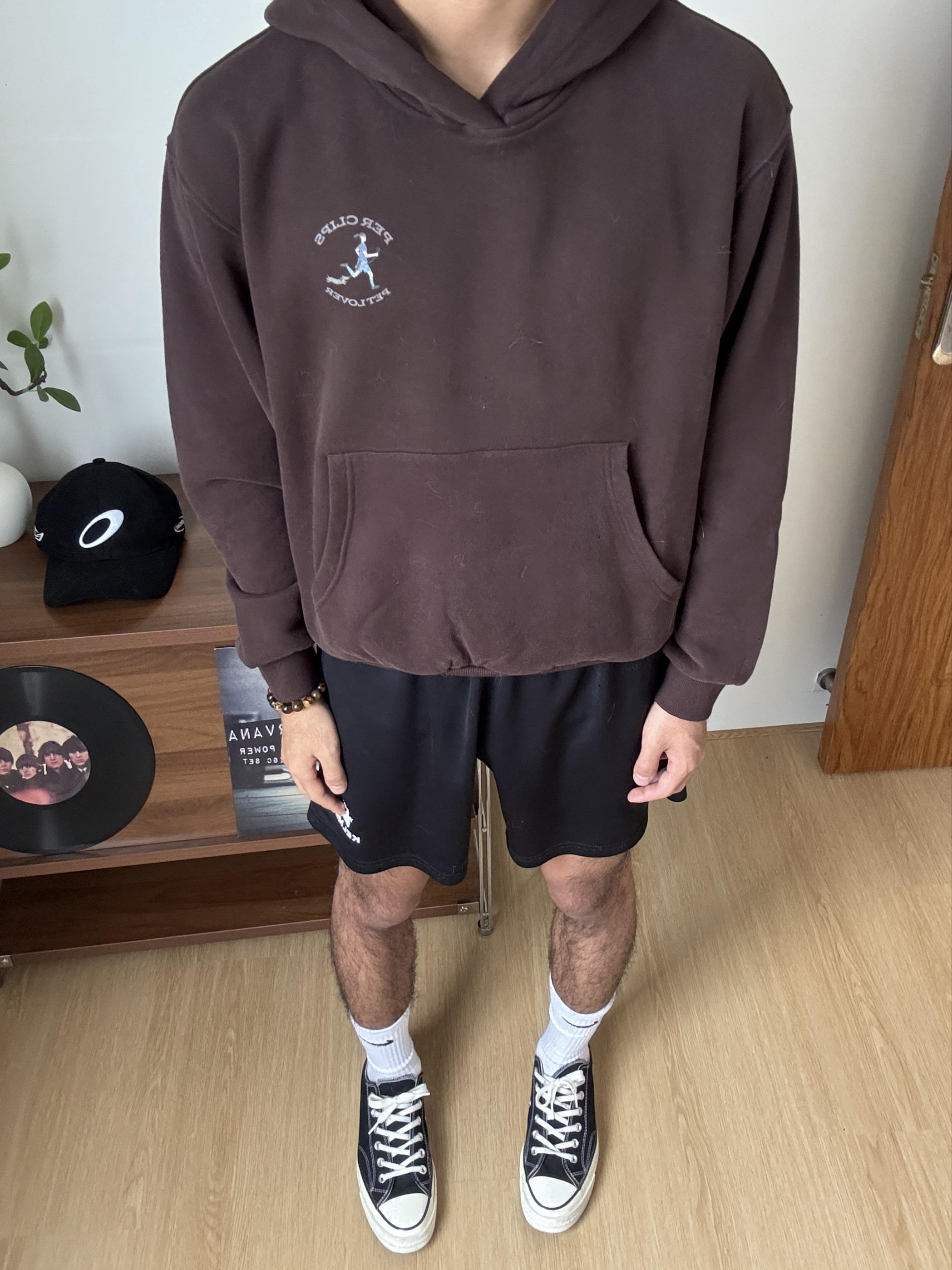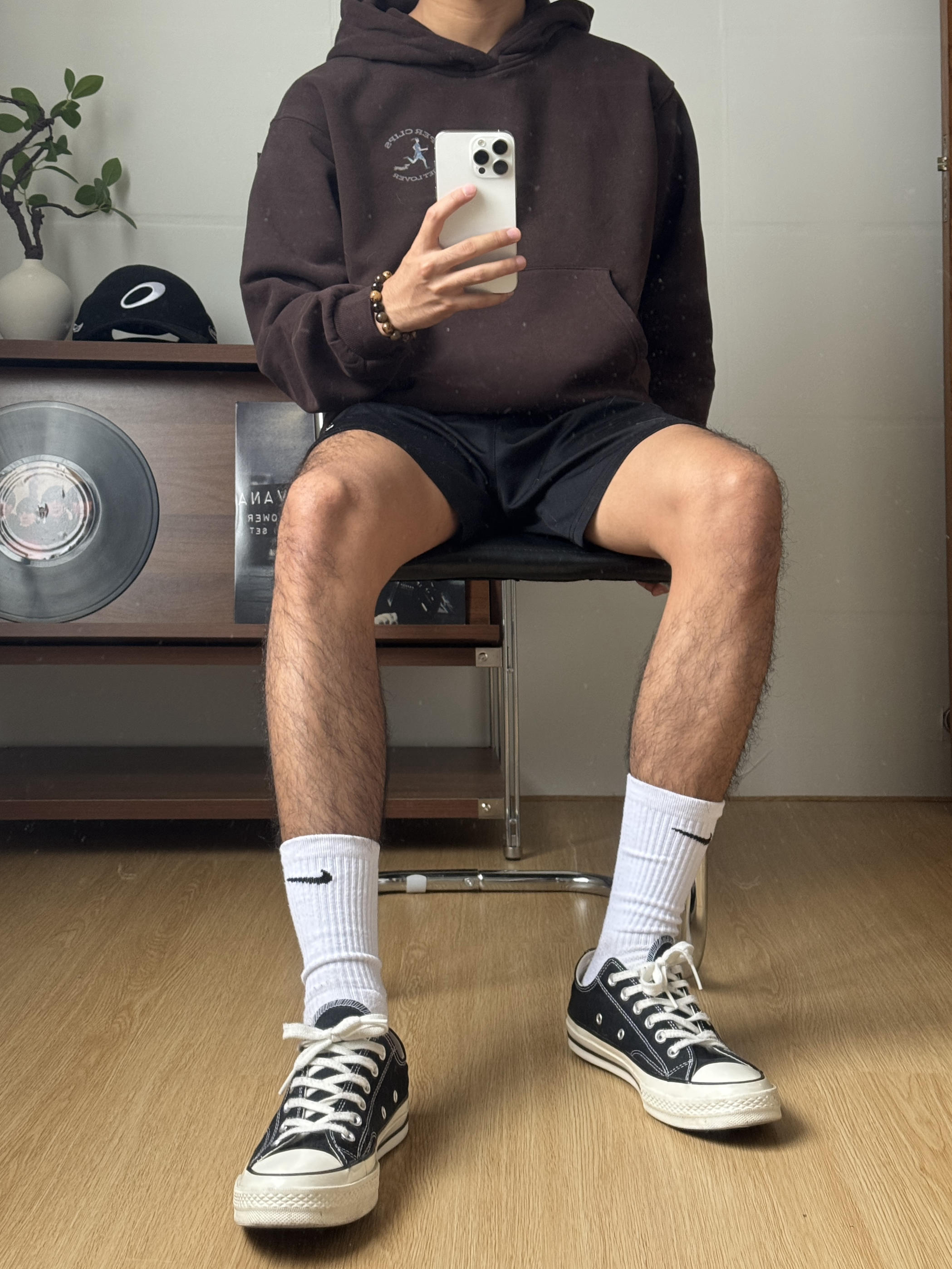 深棕连帽卫衣自带慵懒松弛感,胸口的小刺绣低调又有细节。搭配KELME速干短裤,运动感与日常感无缝衔接。白袜卷边露出Nike小勾,再踩上经典的Converse 1970s帆布鞋,黑皮在暖棕调下更显质感。整套look舒服随性,简单耐看,日常出门毫不费力。