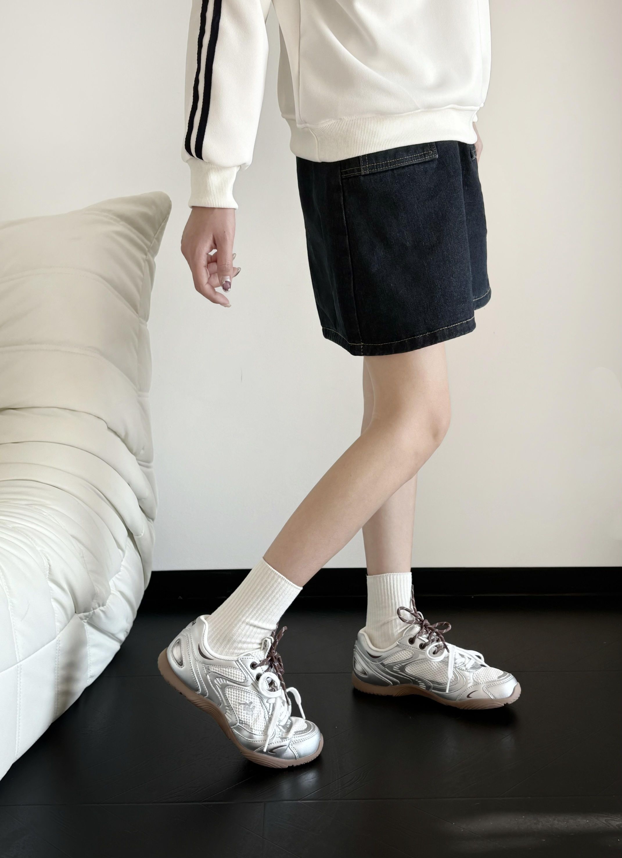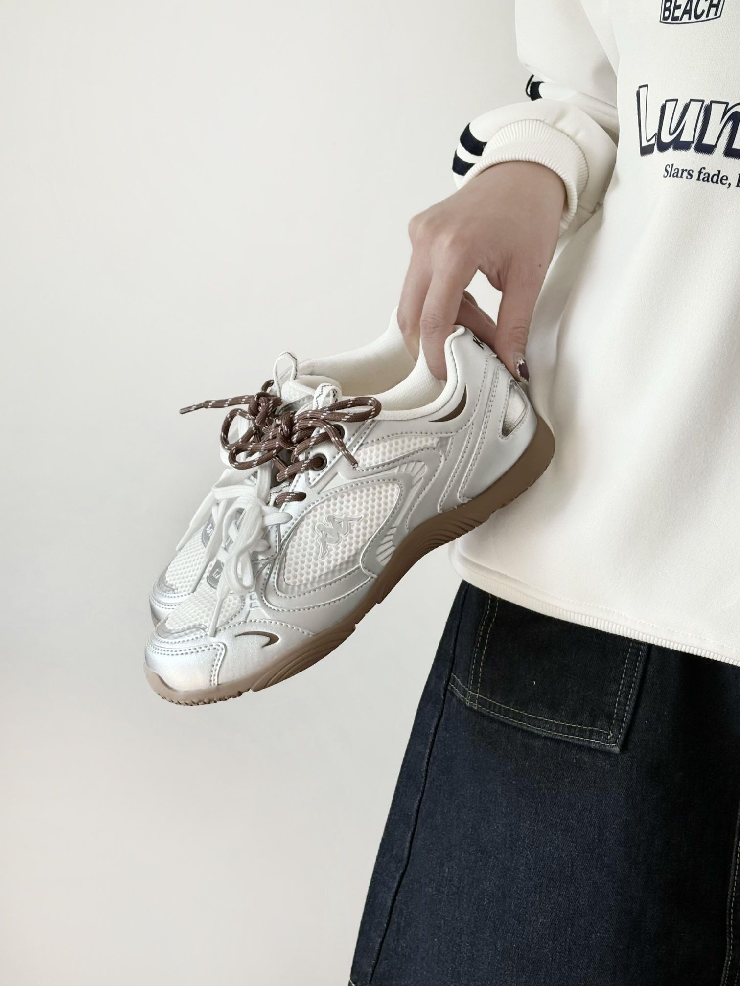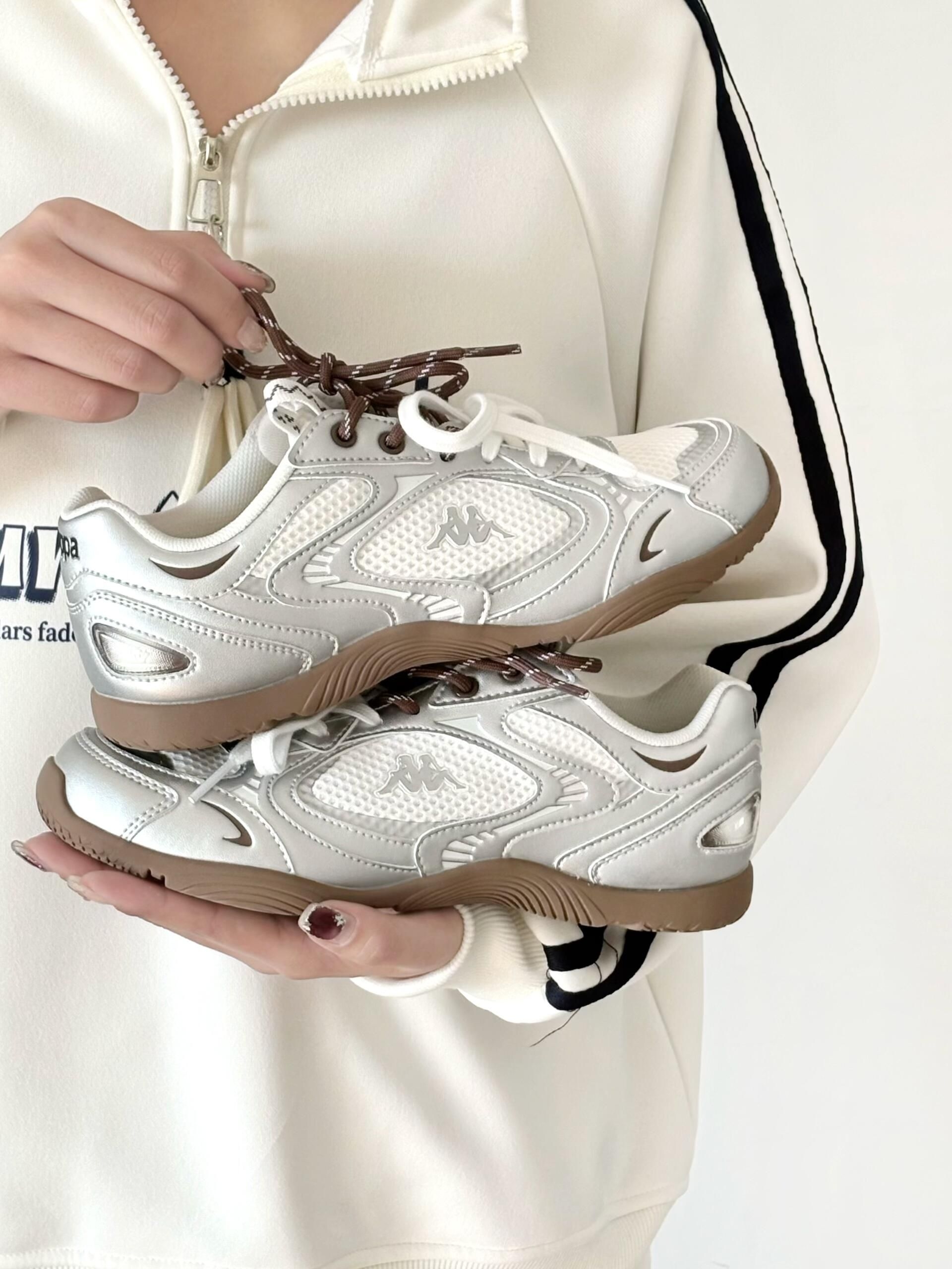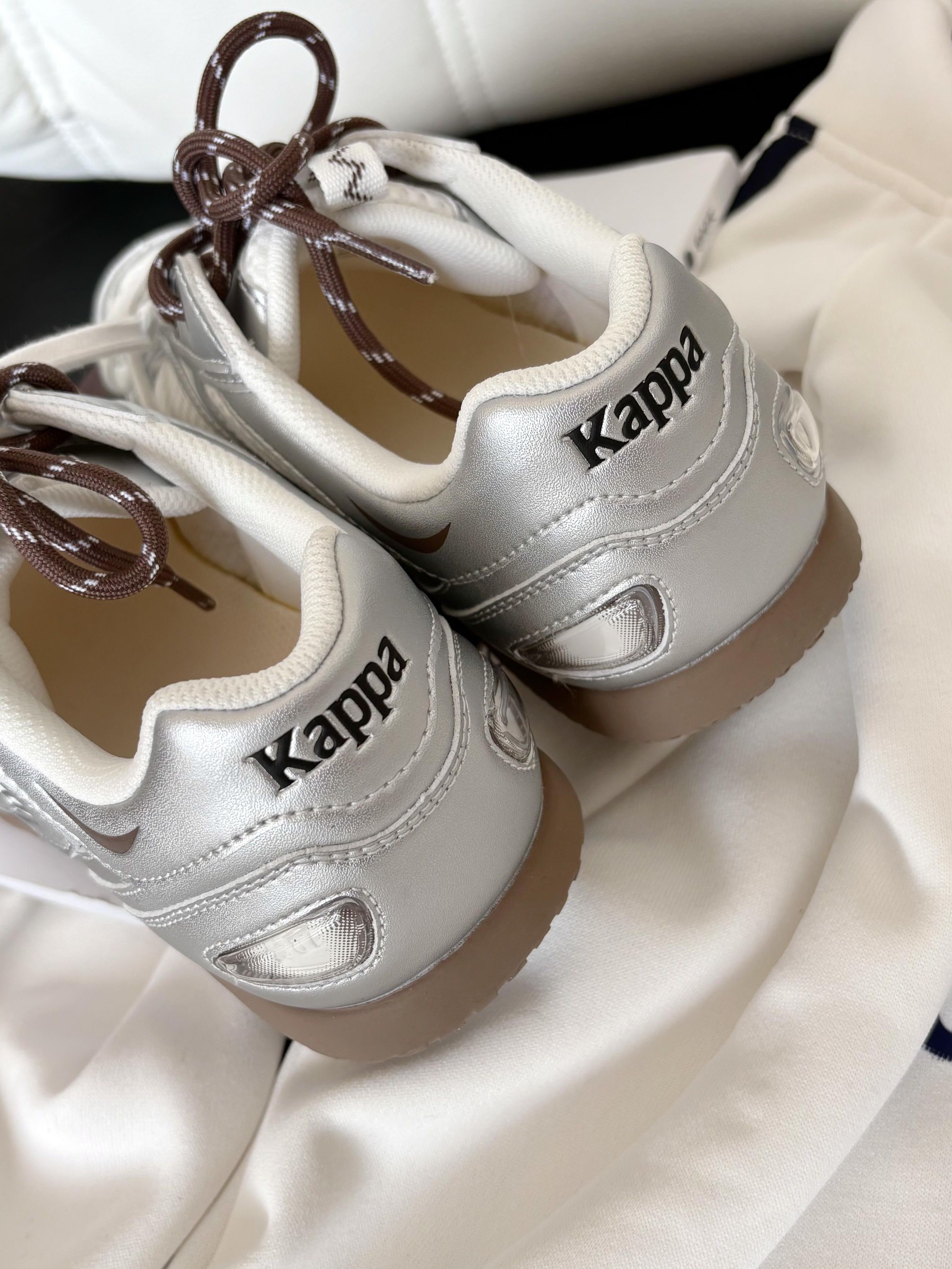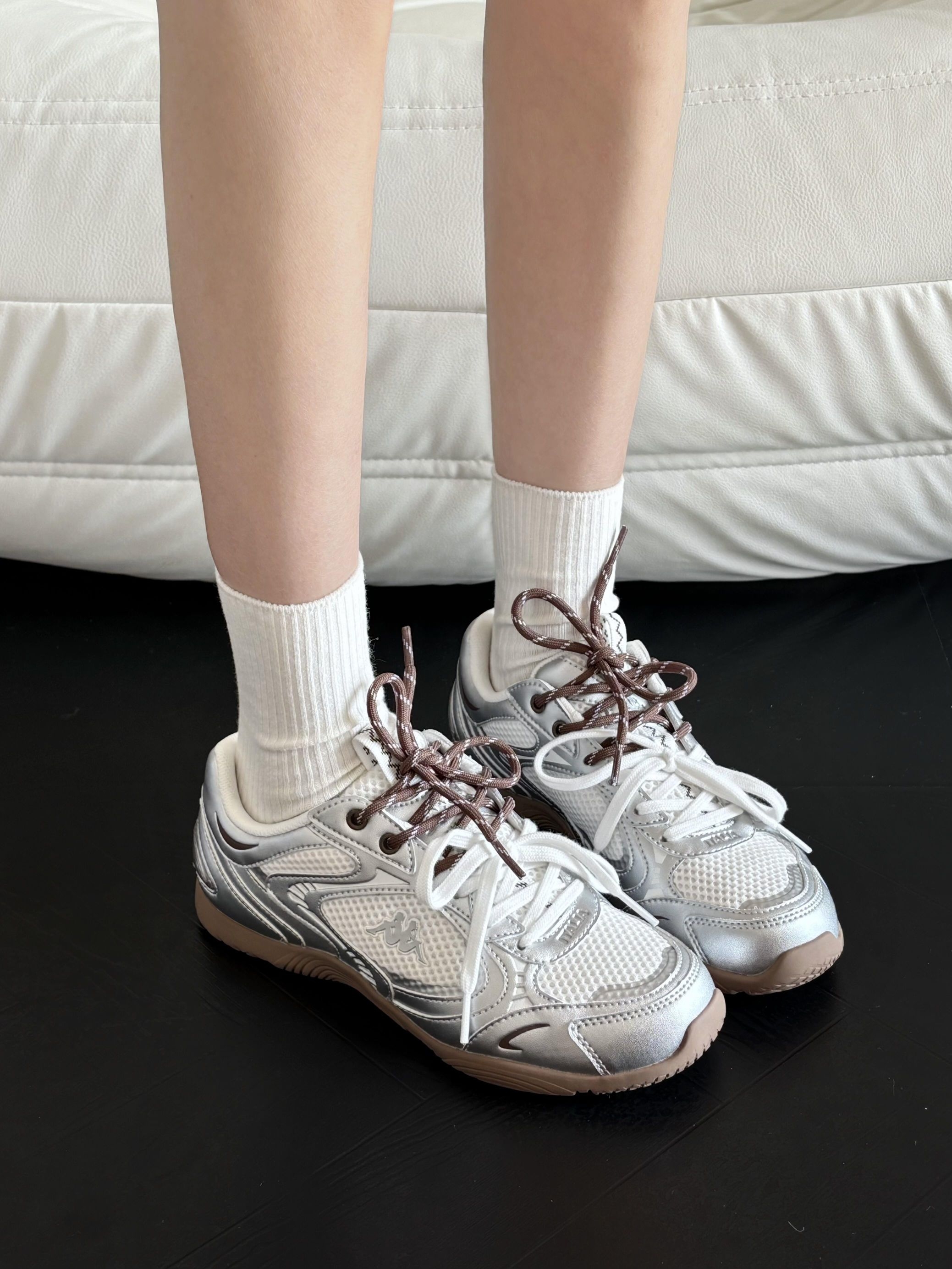踩中复古运动和Y3K未来风的平衡点 这款银色芭蕾德训鞋真的爱辽! 低帮不卡脚踝悄悄显腿长~ 鞋面的流光美学设计超有巧思 在光线下会有细腻的光泽感 不是那种刺眼的亮 而是走起来自带轻盈的光感 织物➕耐磨材质的搭配 实用性方面也很在线 不用担心不抗造 也不会有磨脚挤脚的情况 鞋底的减震和防滑做得很到位 兼顾了好看和好穿,新年约会拜年走久了也不累 复古、未来风、芭蕾元素集一身 Kappa这波真的太懂设计...