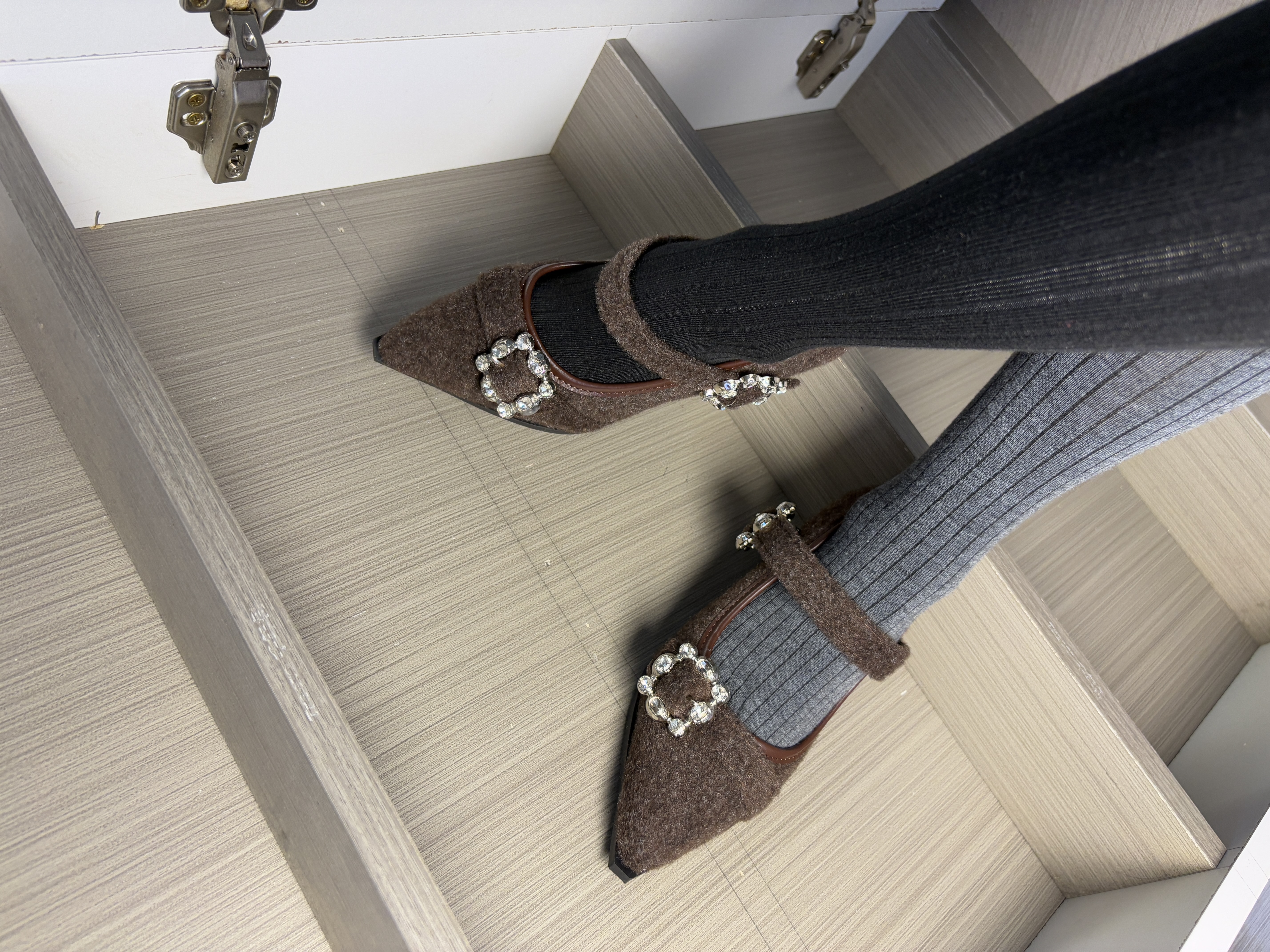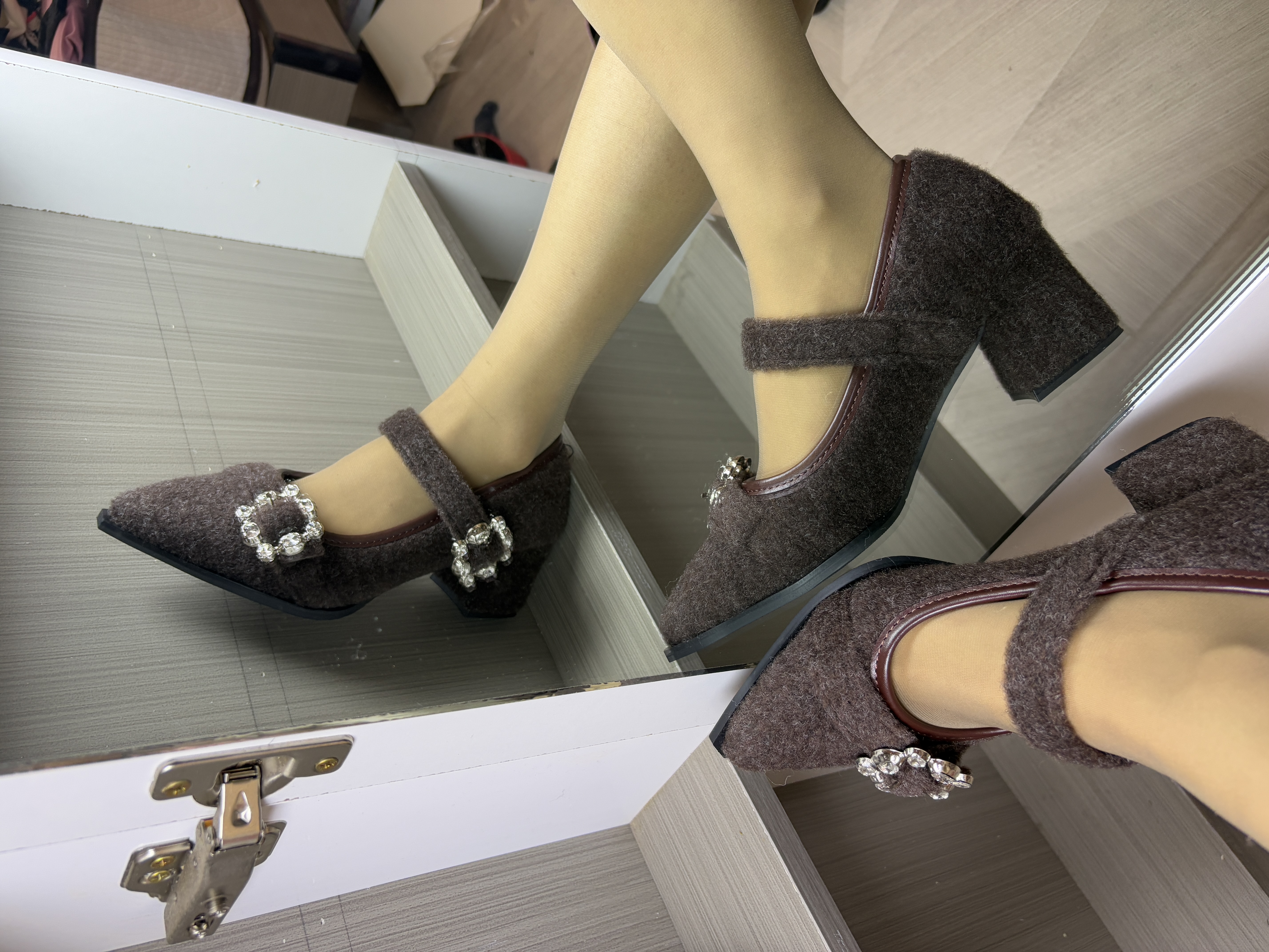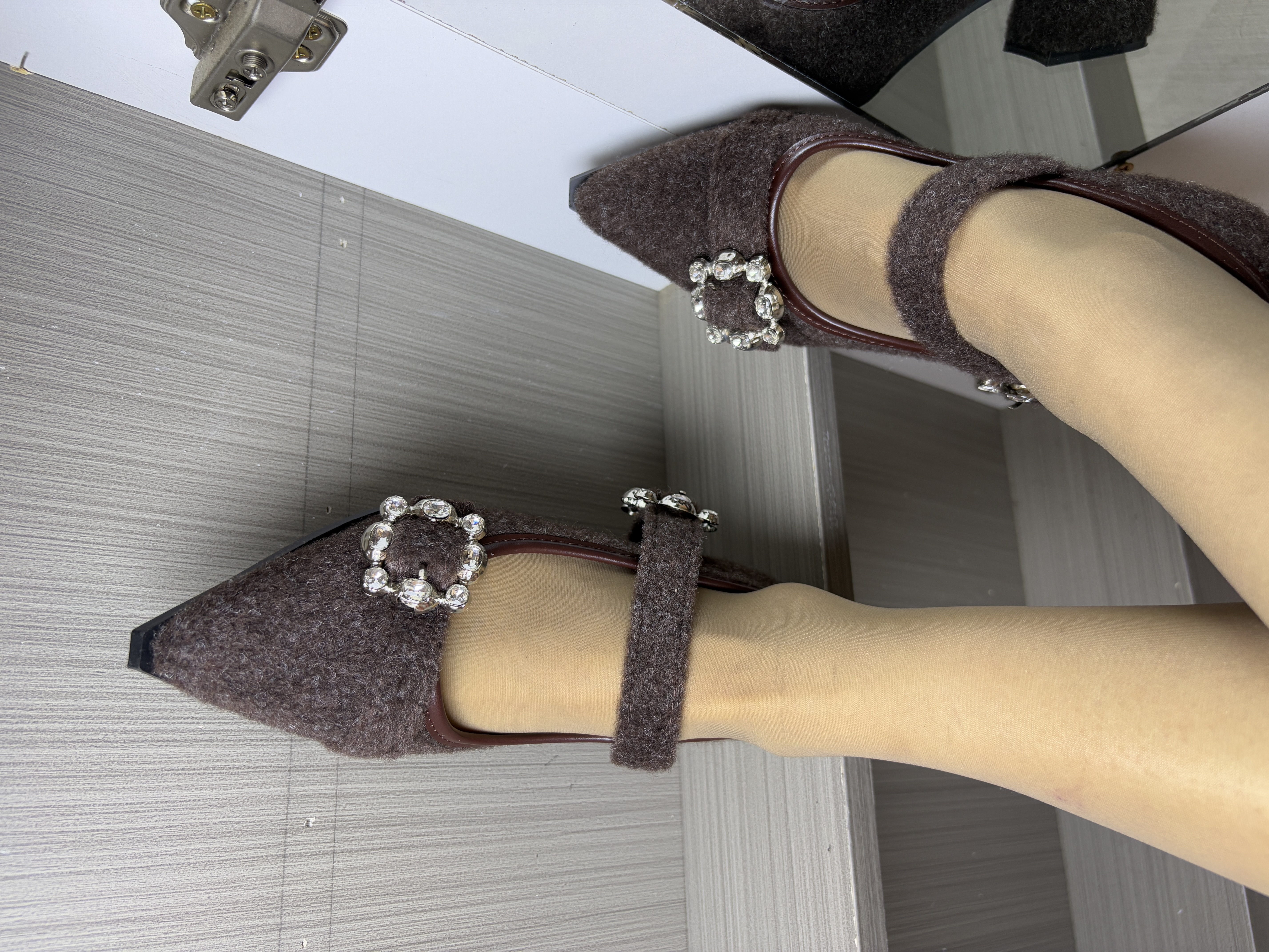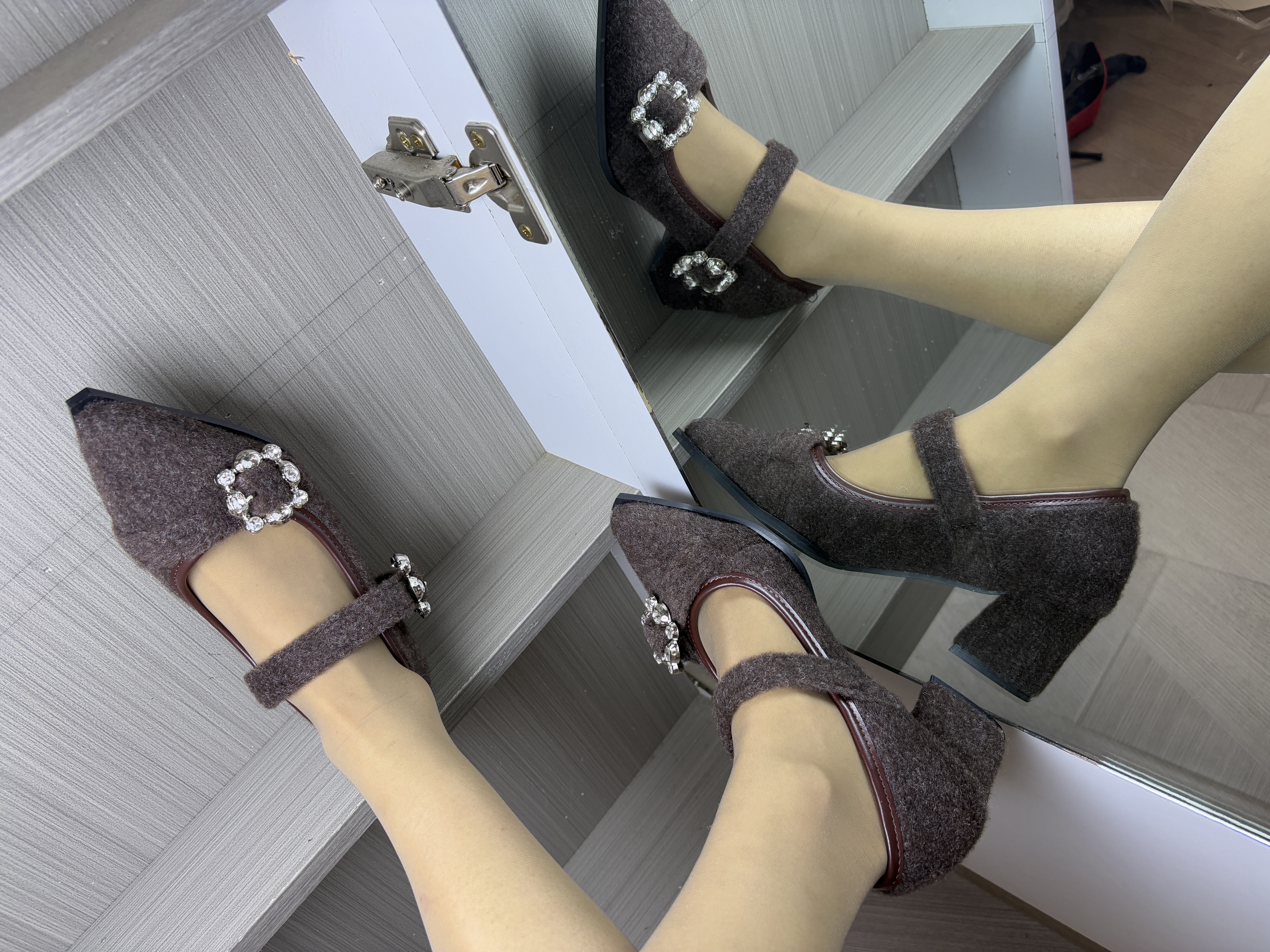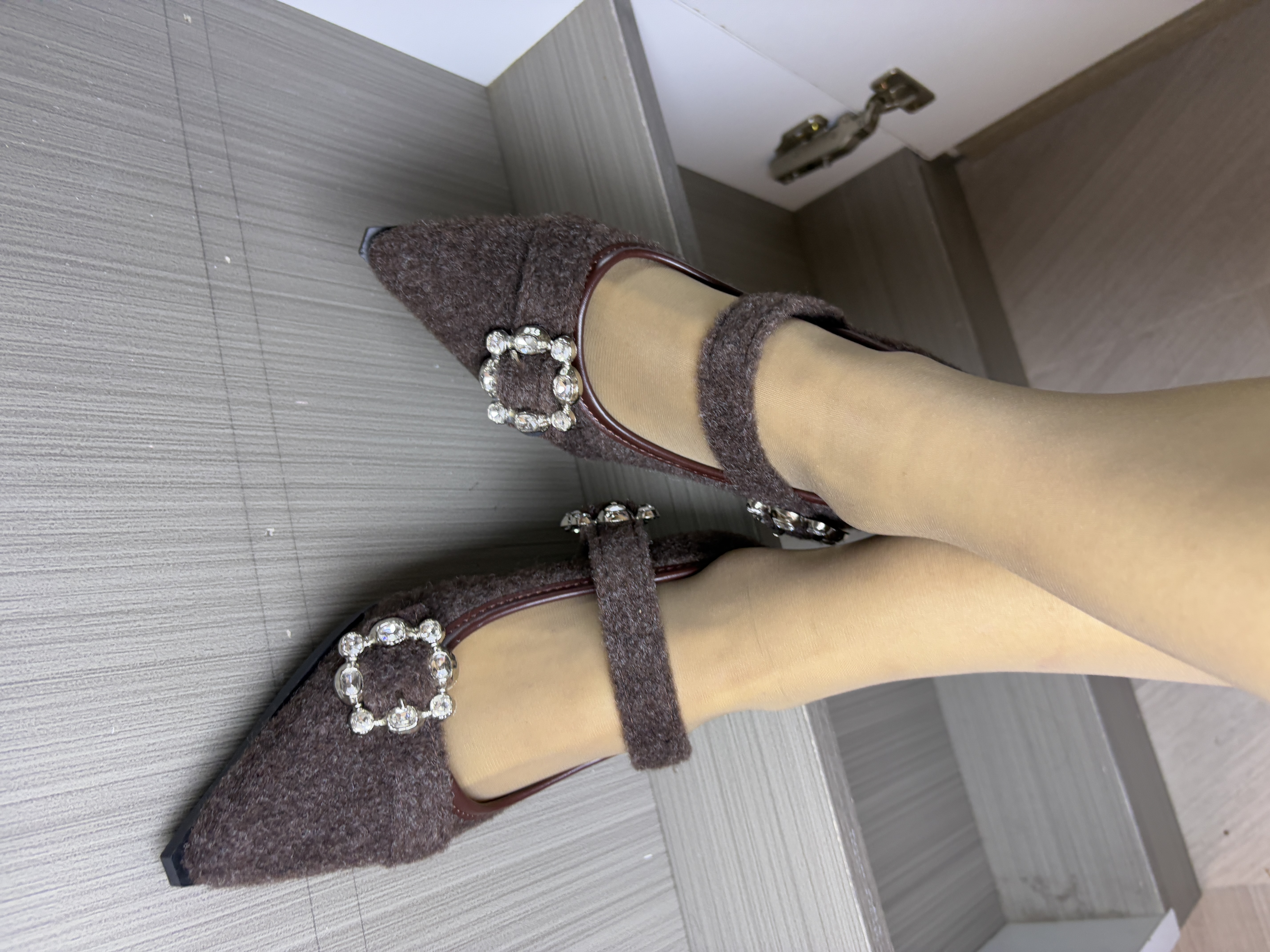 材质与色调:深咖色毛绒面料,自带软糯雾面质感,像把秋冬的温暖裹在脚上,复古又显贵。 • 设计细节:尖头+细跟拉长腿部线条,一字带+水钻方扣是点睛之笔,精致又不浮夸,自带大小姐氛围感。 • 风格适配:偏法式复古风,既能hold住通勤职场,也能适配约会、下午茶等轻熟场景,温柔中带着利落感。