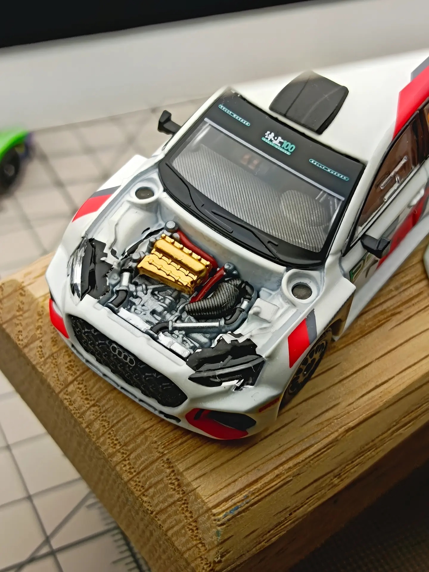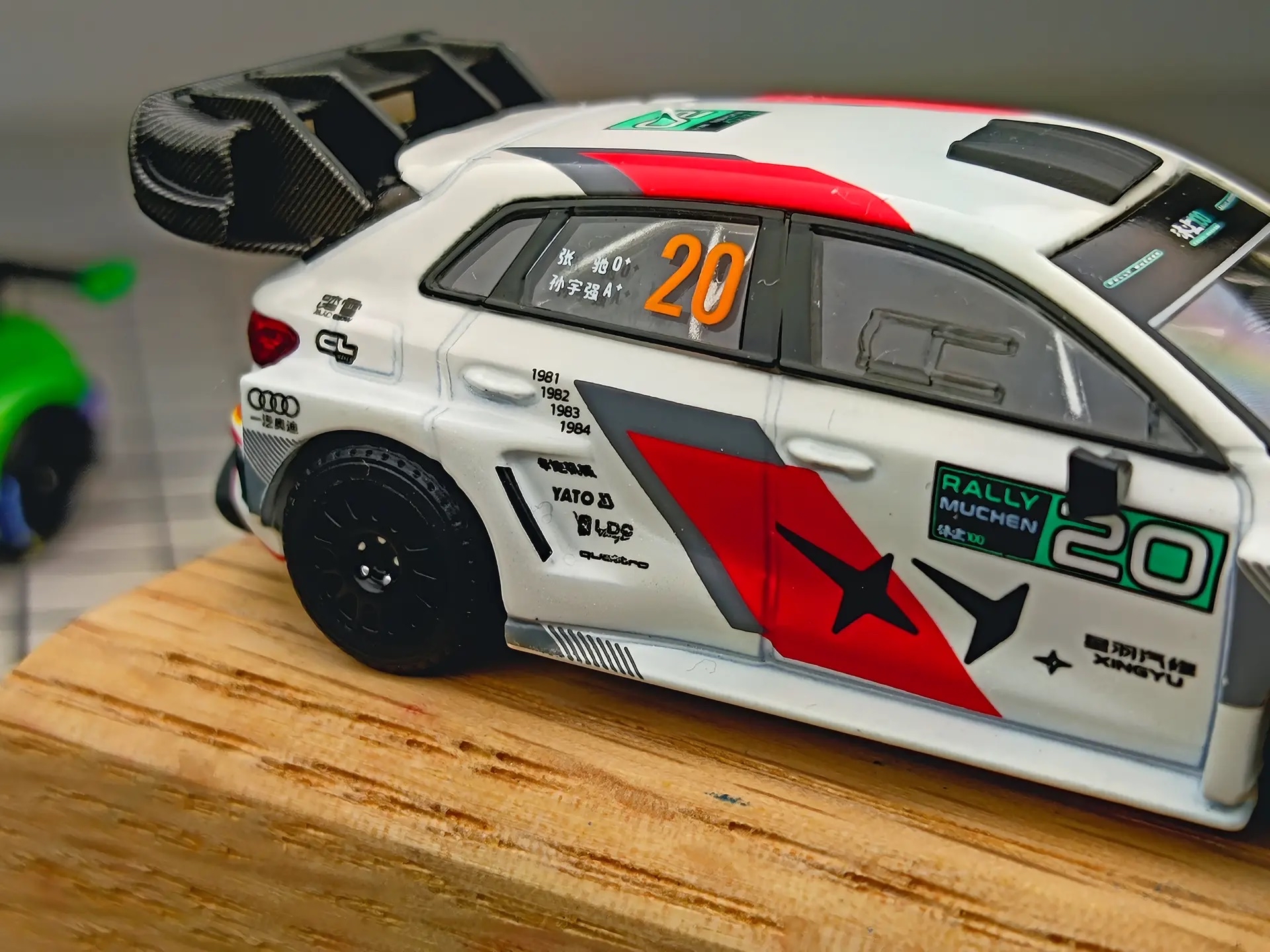 拿到手的瞬间,就被它的细节震撼到了:可开启的引擎盖下,金色的进气歧管、管线分明的发动机舱,甚至碳纤维纹理都清晰可见,仿佛能听到引擎轰鸣。车身拉花还原了真实赛事涂装,“20号”的数字、车手张弛和孙宇强的名字,还有“RALLY MUCHEN”的标识,每一处都在诉说着赛道故事。 最让我惊喜的是它的可玩性:可拆卸的前盖、大尺寸碳纤维尾翼、带细节的轮毂和刹车盘,把玩起来完全不像个静态摆件,更像一台随时能冲...