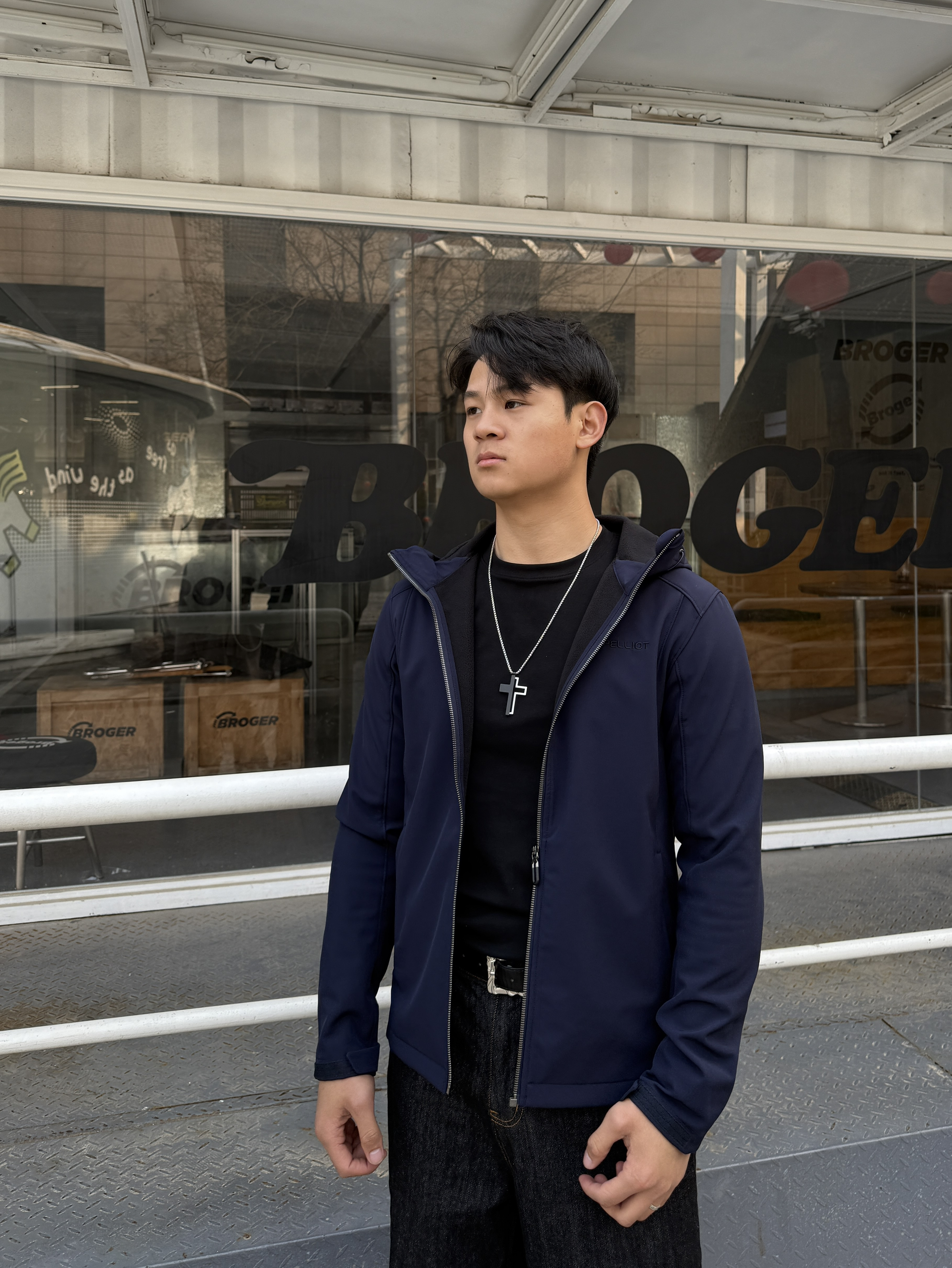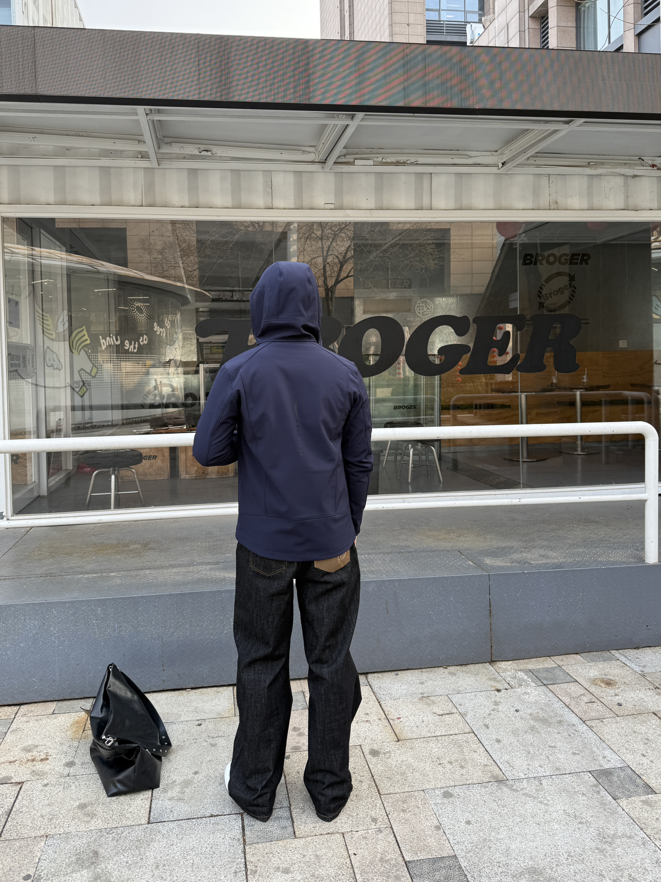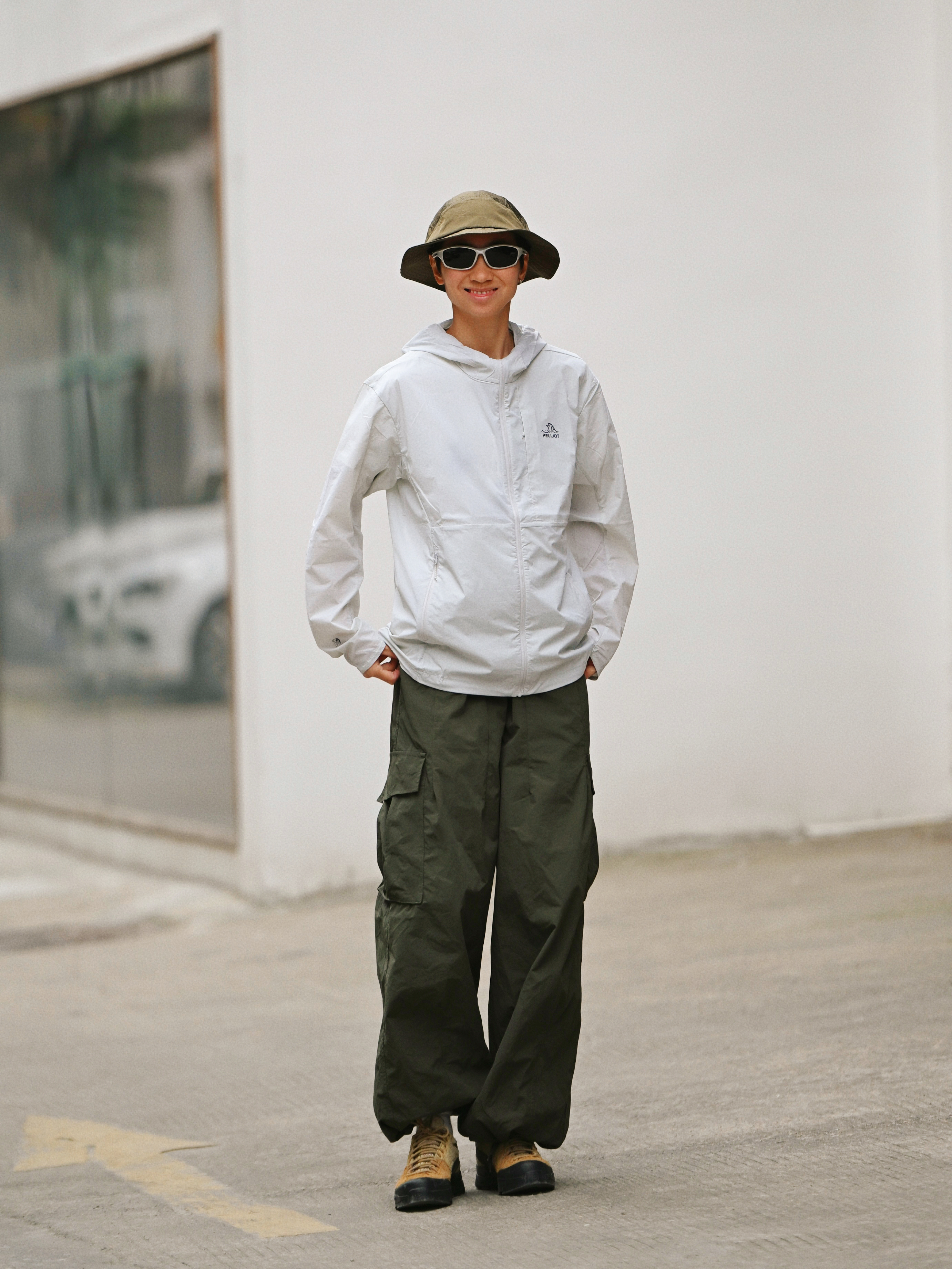 上衣我选择一件户外轻壳外套 防水面料加上头盔式加宽帽檐在户外下雨也不怕 连帽拉链式设计防风穿起脱也方便 内里毛绒面料温度风度同时在线 穿起来轻便舒适不紧绷 裤子我选择一条黑色直筒牛仔裤 鞋子来一个白色板鞋点缀 这样一身下来你认为怎么样?