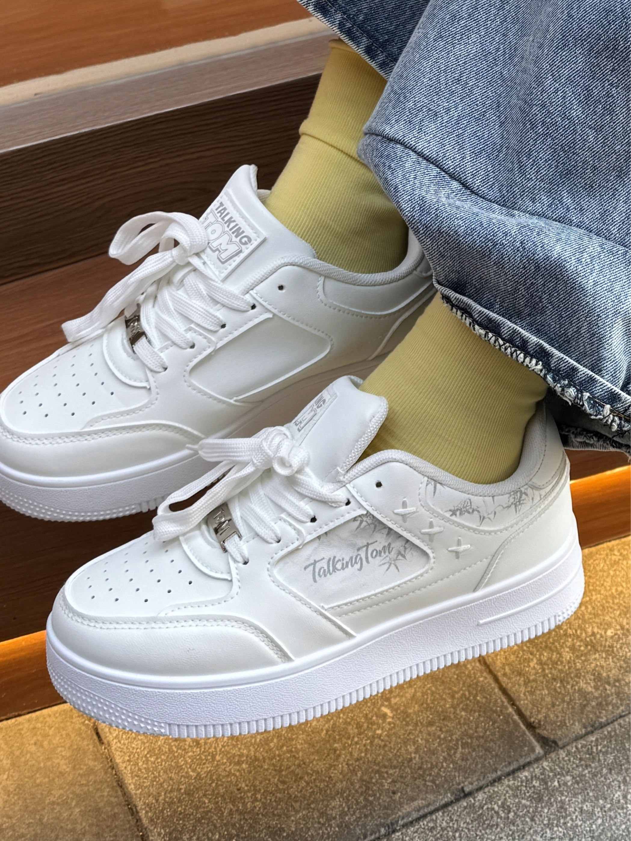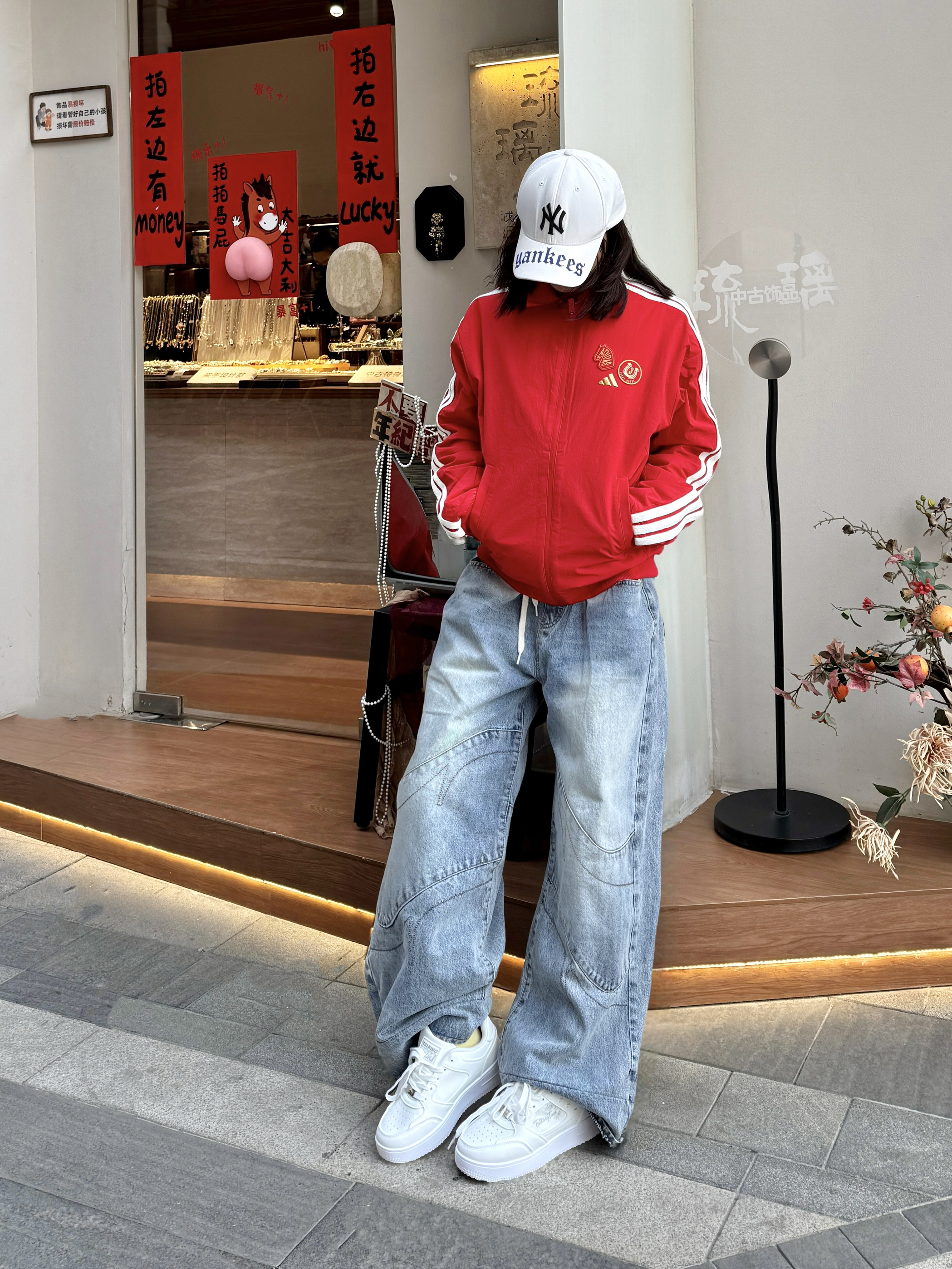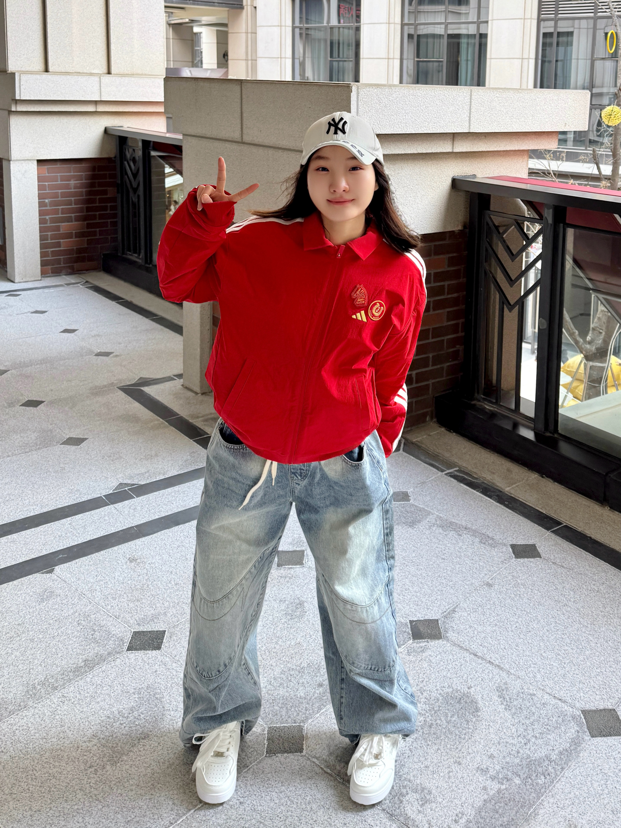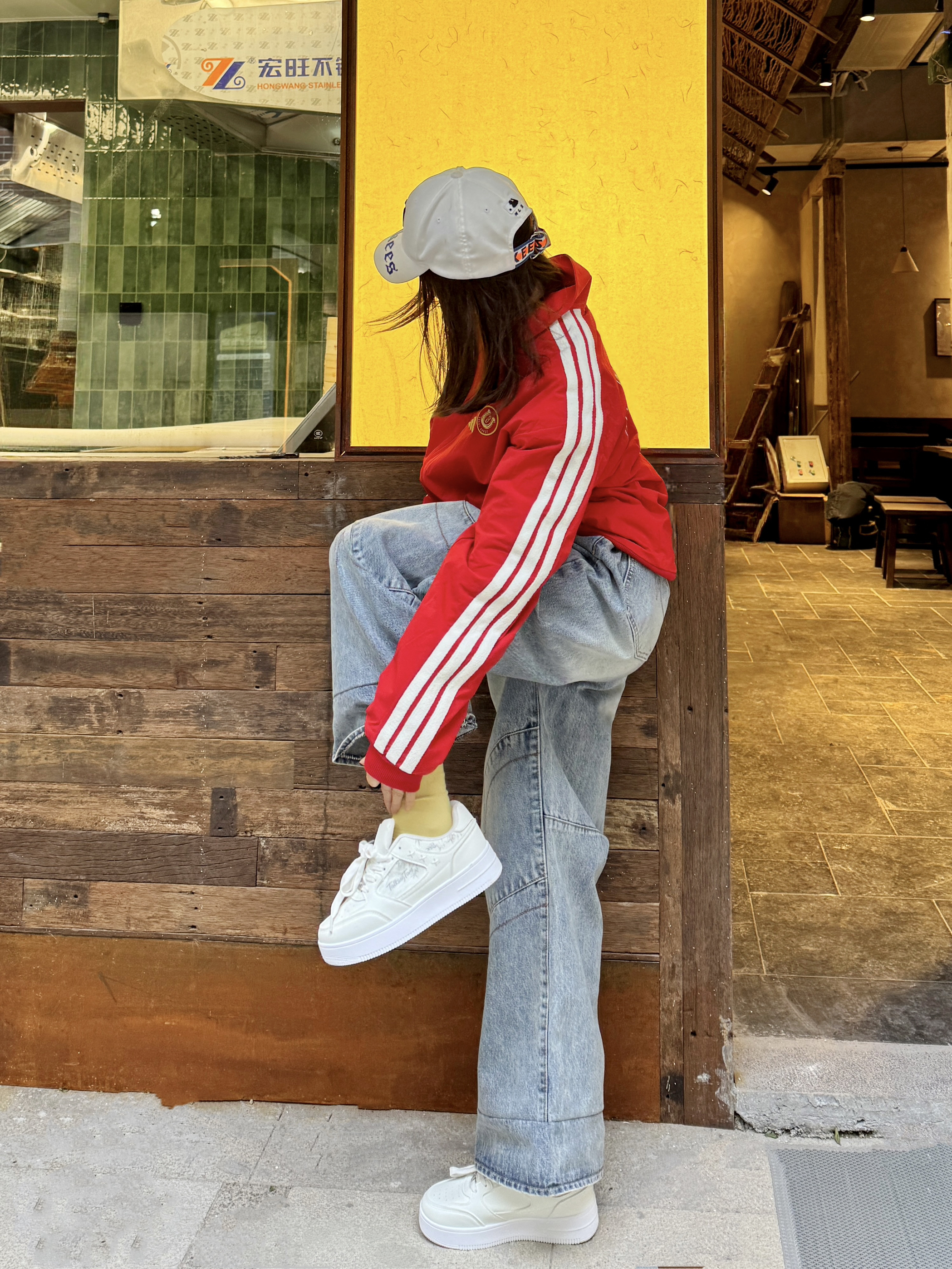 过年模式切换到打工模式, 整个人都蔫了… 今年决定不摆烂,用一套利落穿搭给自己提气! 红色外套自带新年buff,喜庆又显气色, 宽松牛仔裤+小白鞋,舒服又自在, TALKING TOM 这双小白鞋身简约又有辨识度, 厚底软弹脚感很舒服~