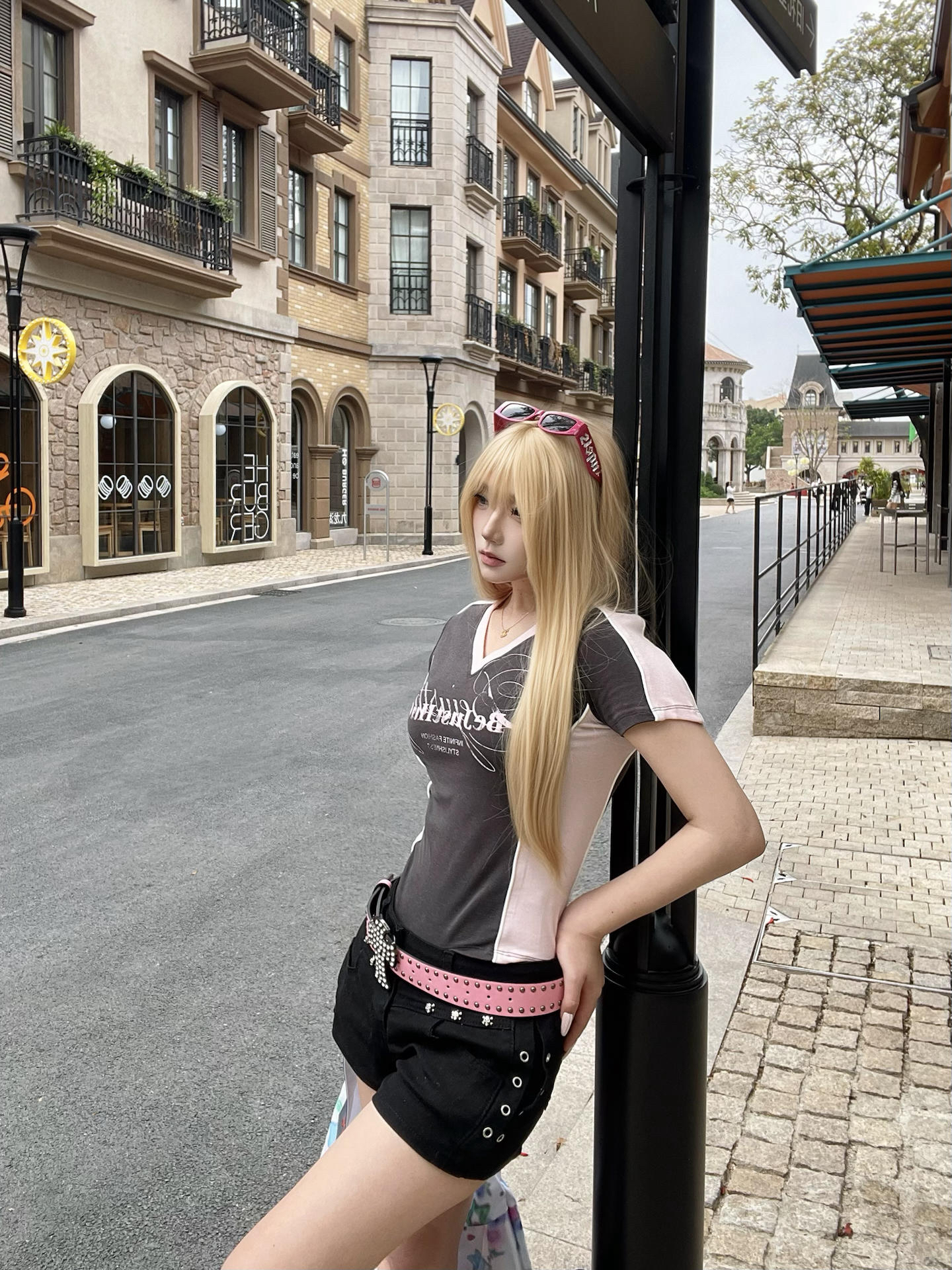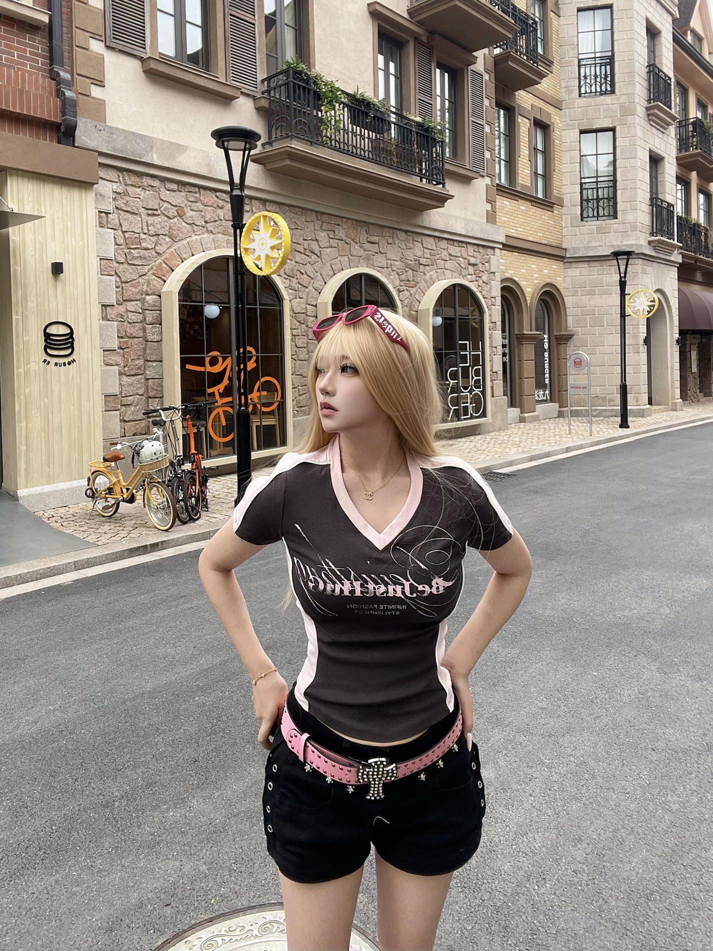 🗣️今日份穿搭分享来啦! BJHG 这件美式复古T恤也太貌美了吧✨,黑粉配色轻松拿捏春夏甜酷氛围🎀,V领➕收腰设计上身很显瘦哦~妥妥的美式辣妹风 日常搭配裙装或短裤都可以,适配性很强✅