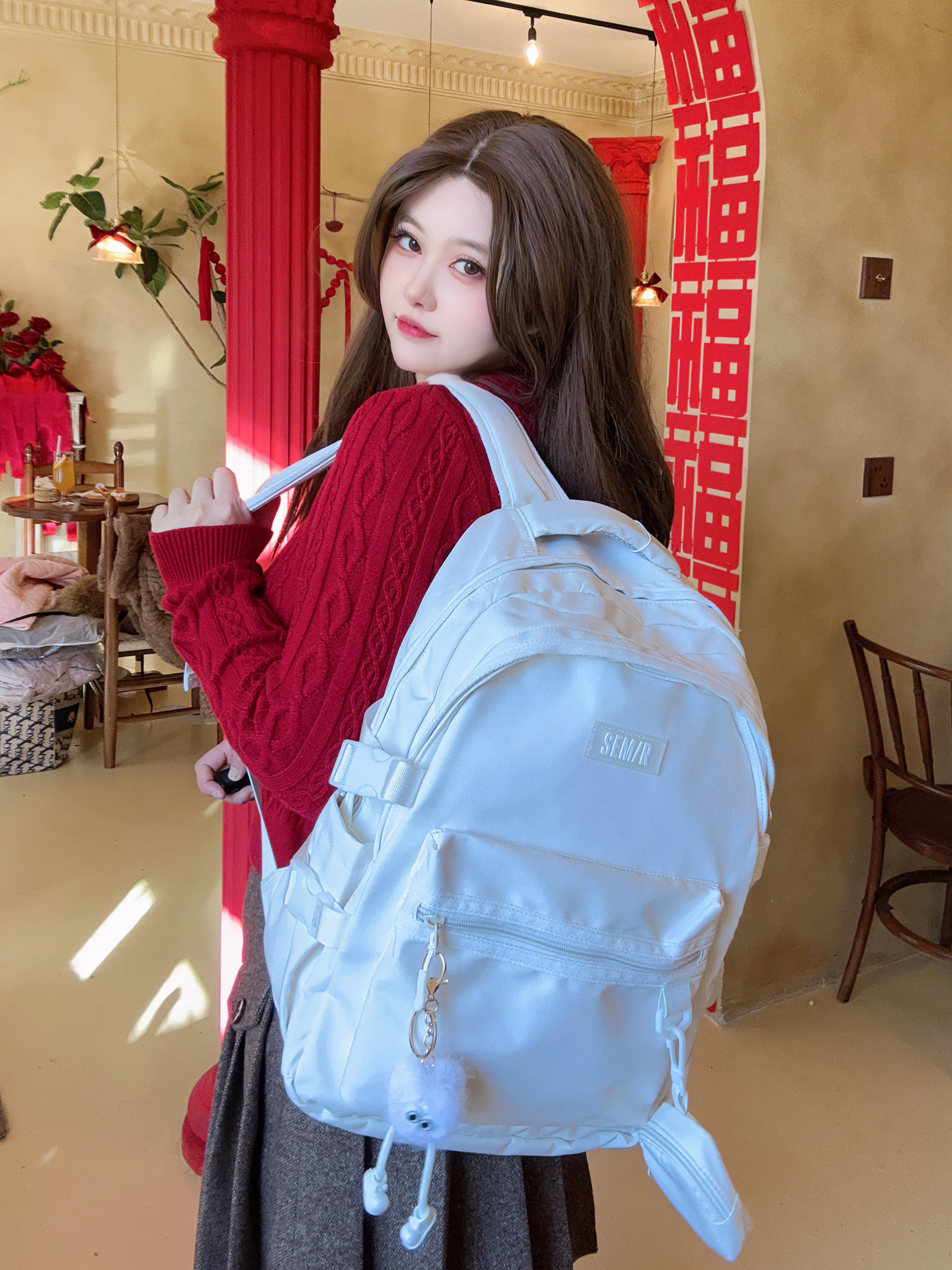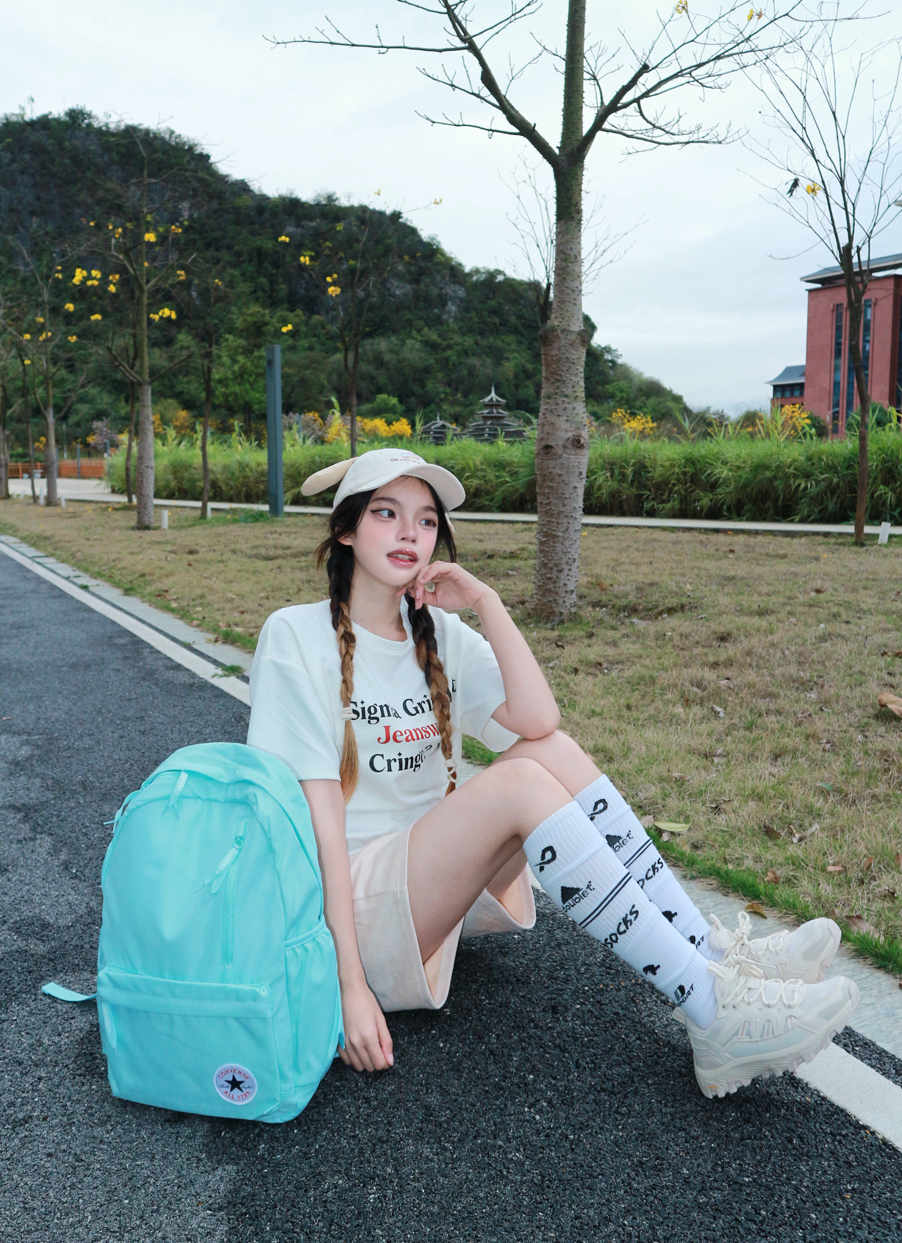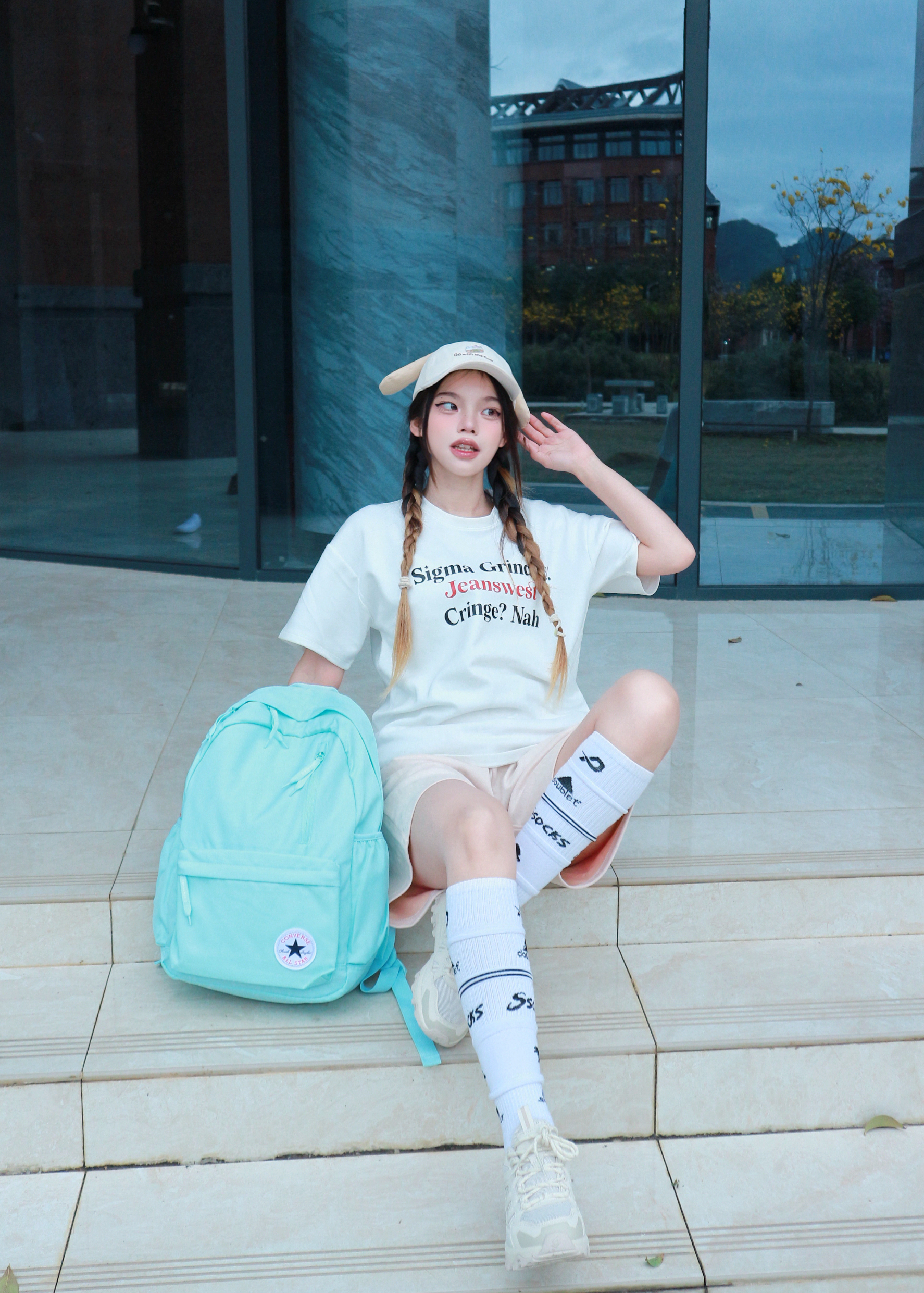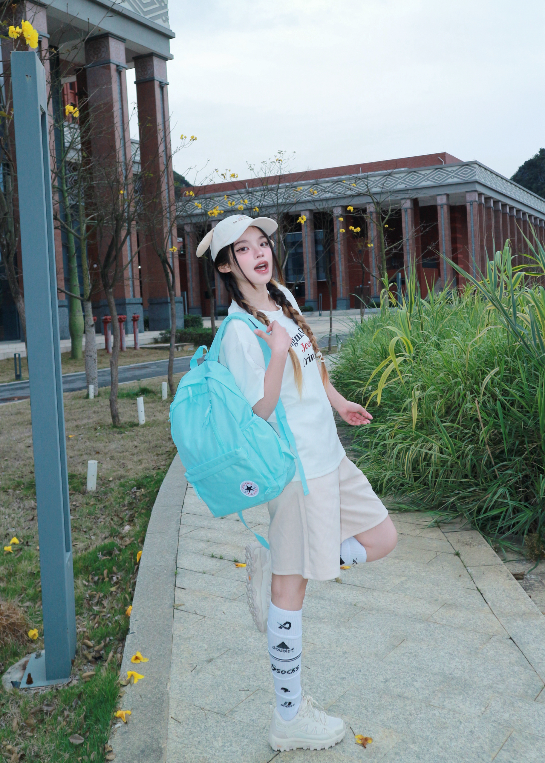 蓝色真的好有春日清透感🩵 我今天的ootd灵感💡 • 穿搭思路:用基础白T+米白短裤做减法 把视觉重点交给薄荷绿书包,整体干净又显白✅ • 配饰小心机:小狗耳朵棒球帽+双麻花辫,瞬间拉满软妹氛围感,和书包的清新感适配度100%🐩 我平常上课/散步/探店都能穿,色系不挑人,阴天也能穿出阳光感☀️
