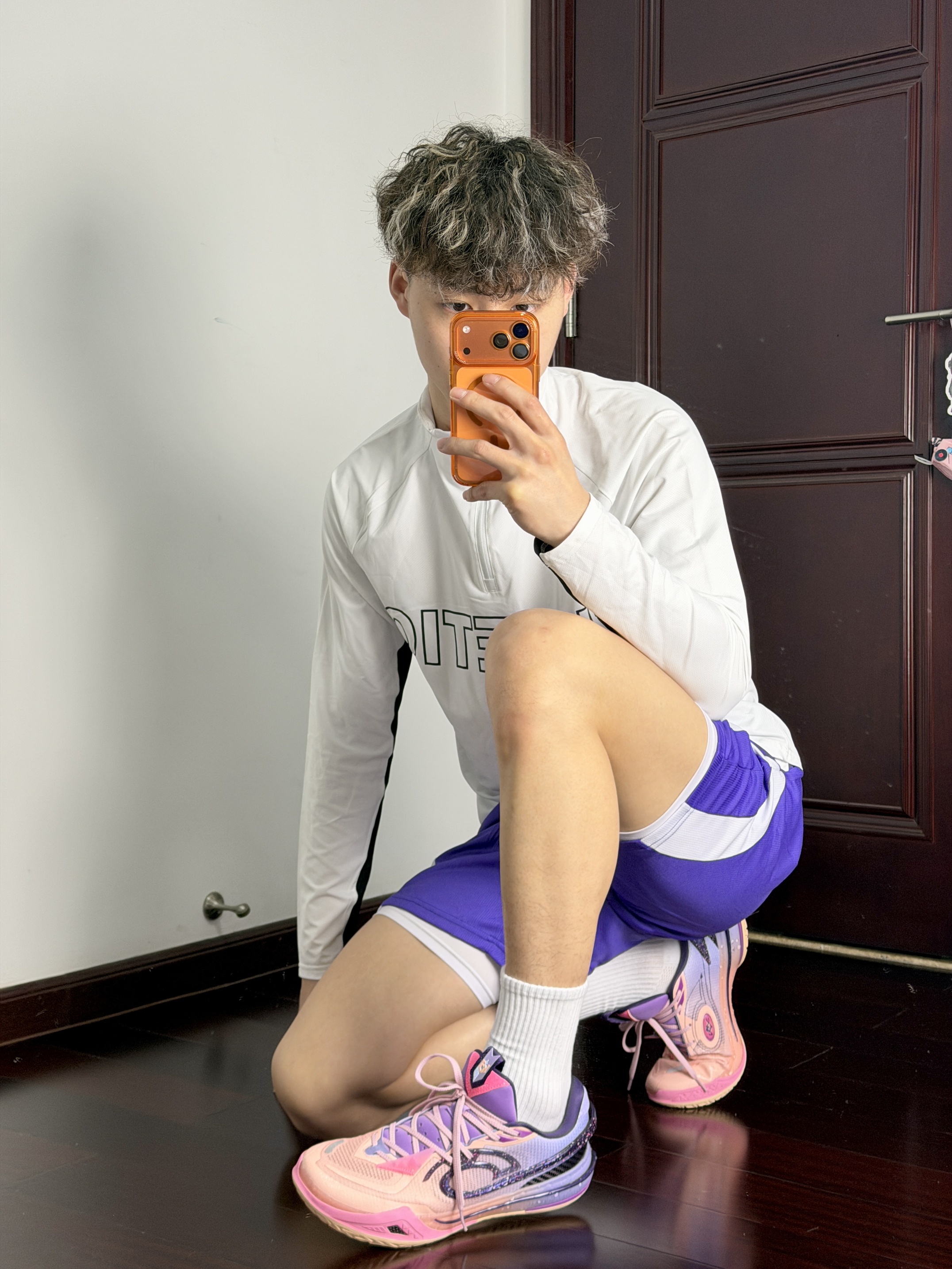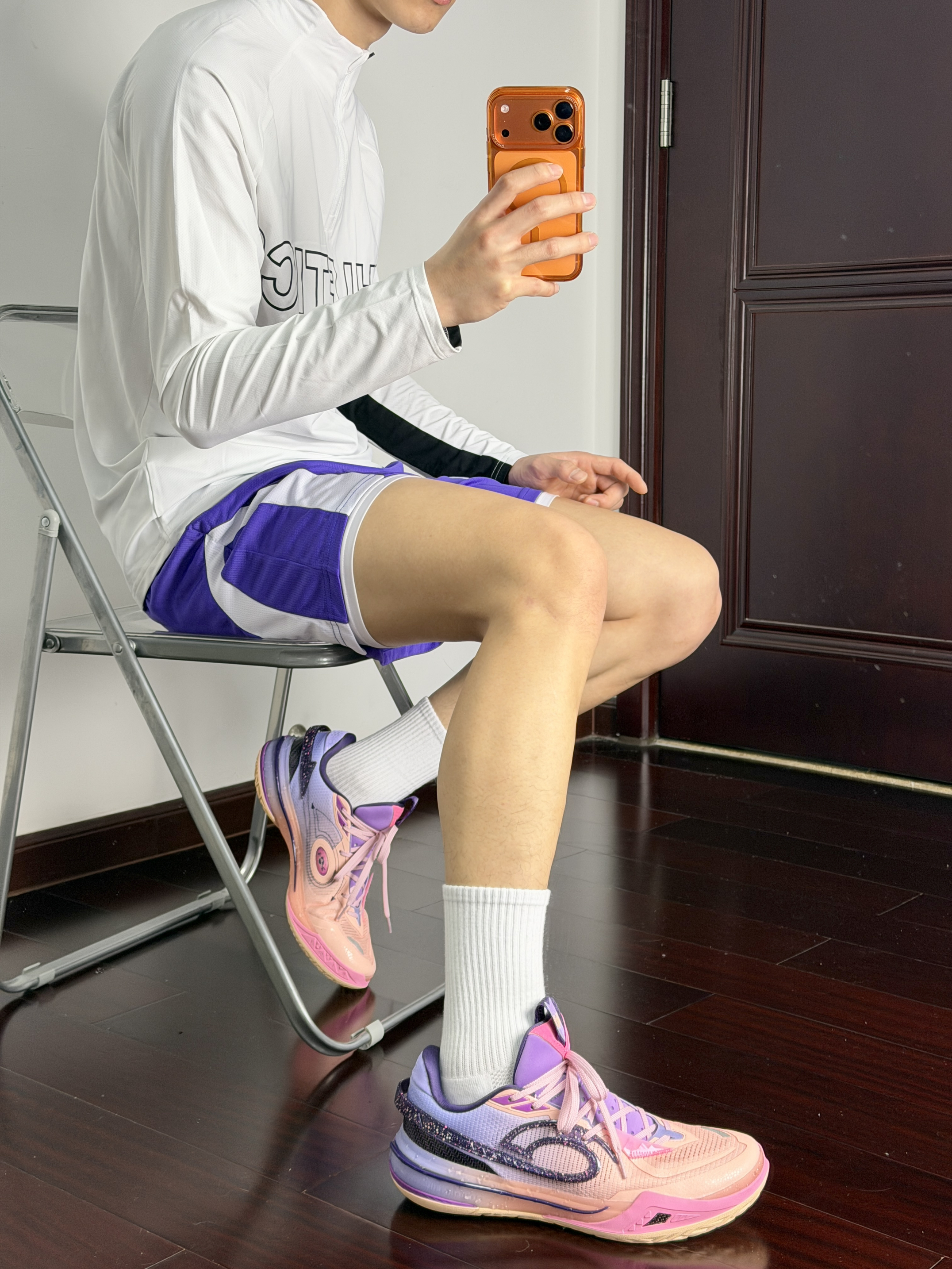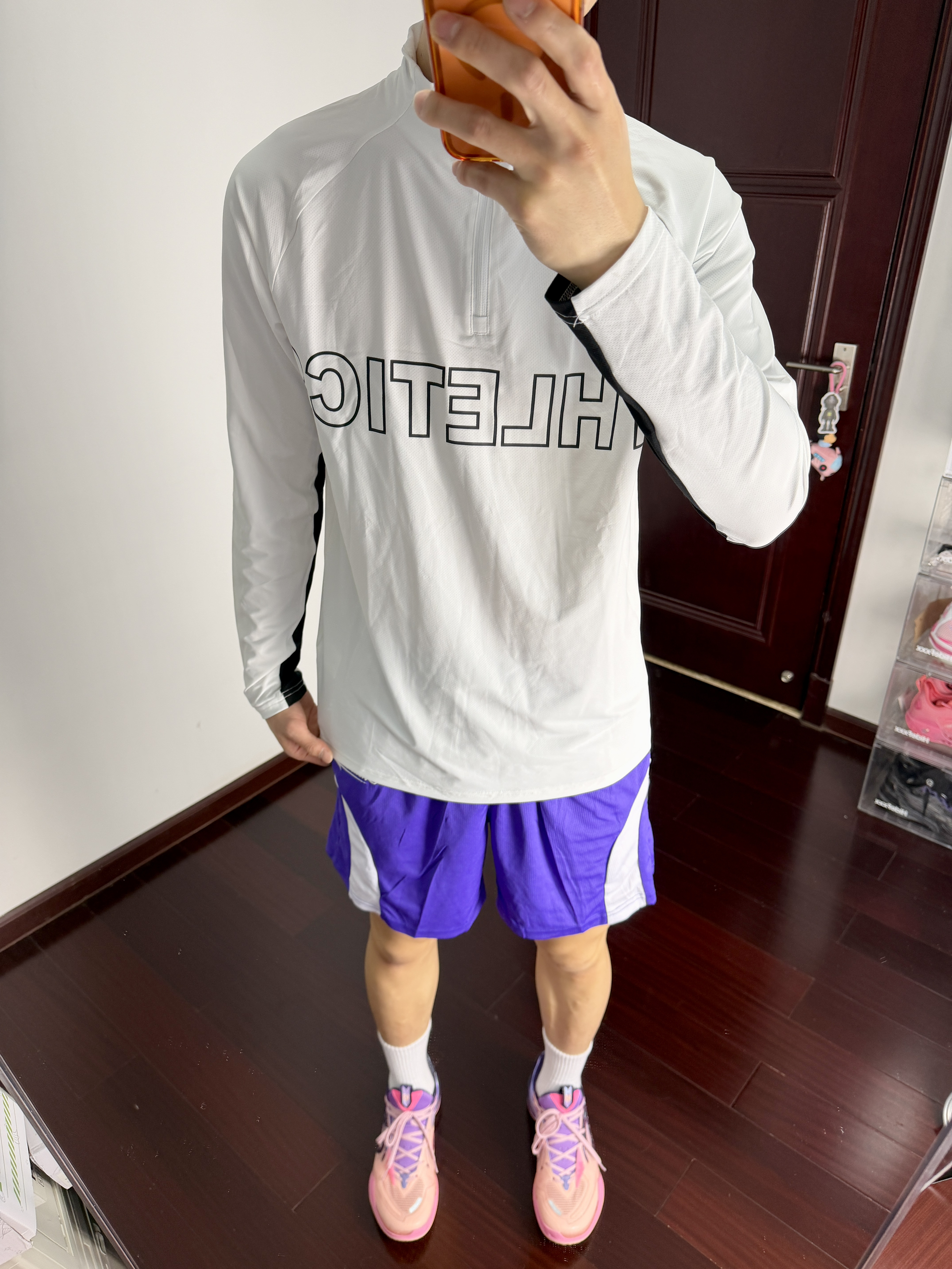 心男生可以不帅但带点紫的韵味穿搭不能不爱呀黑白拉链设计投篮服一看就很帅打球健身穿都蛮棒的再加一条美式紫色短裤跟上脚的粉紫球鞋还蛮搭的够帅也能够满足我的实战需求!