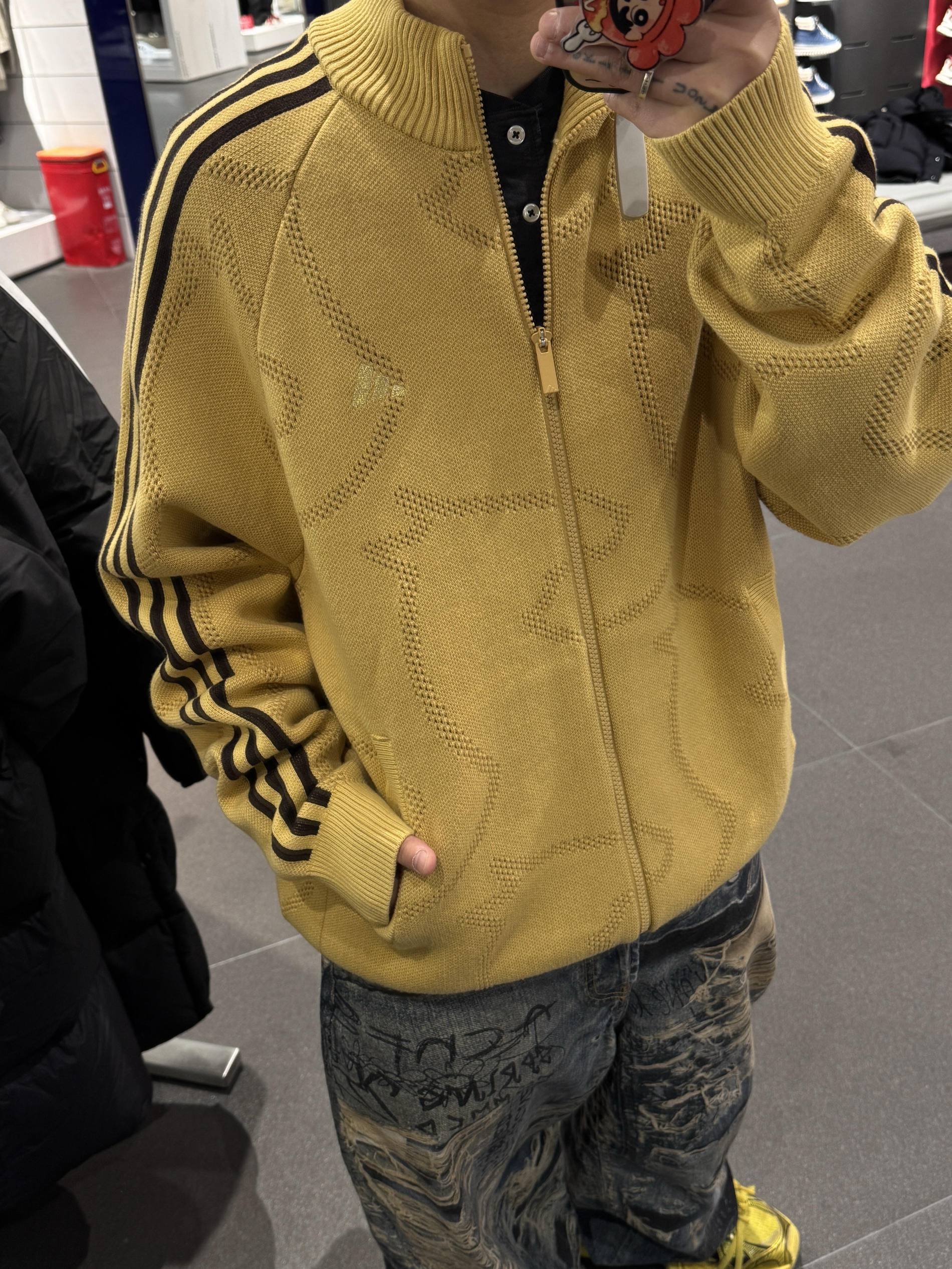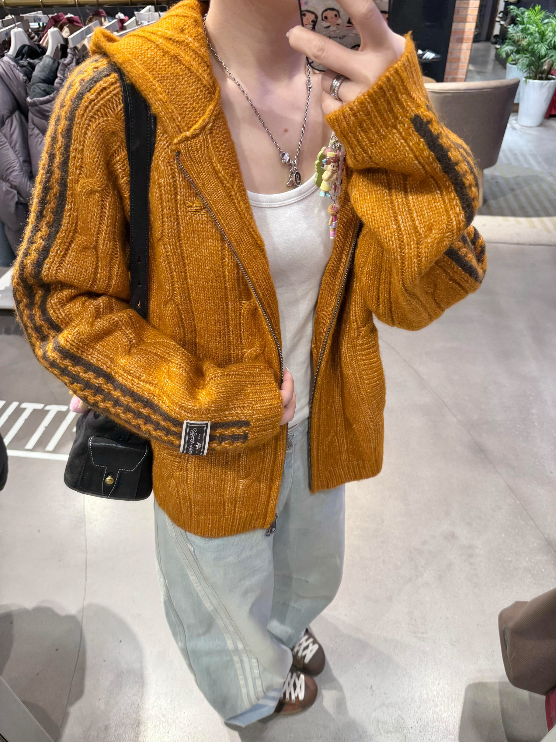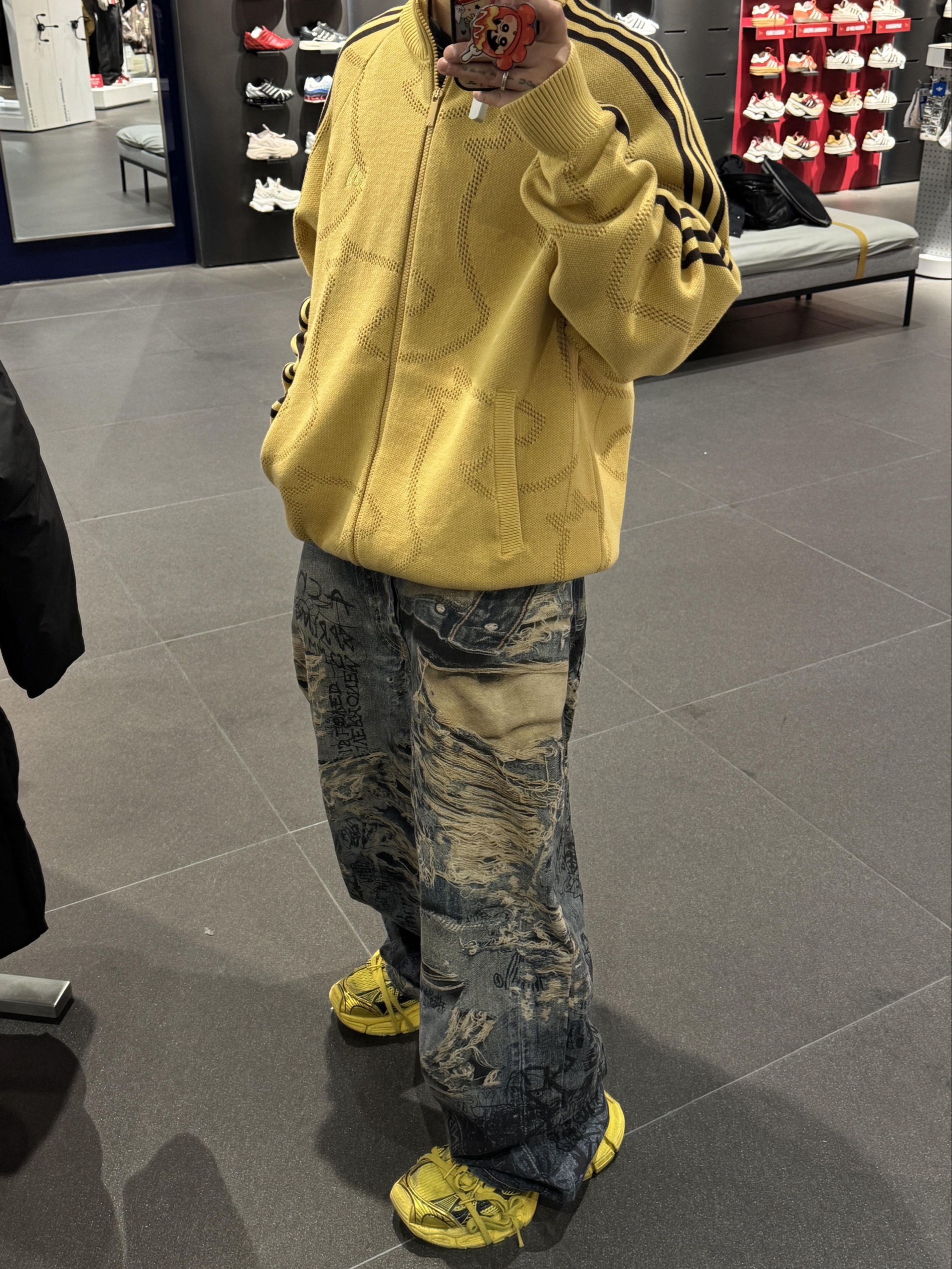 谁懂啊!这件姜黄色针织开衫直接把复古感焊在身上了✨ 经典三条杠+暗纹提花,细节控真的会疯! 暖调姜黄自带阳光滤镜,阴天也能穿出暖洋洋的氛围, 搭配做旧涂鸦牛仔裤,松弛感和街头感直接拉满, 春秋单穿、冬天内搭都能打,三季穿都不违和, 这才是复古运动风该有的样子啊!