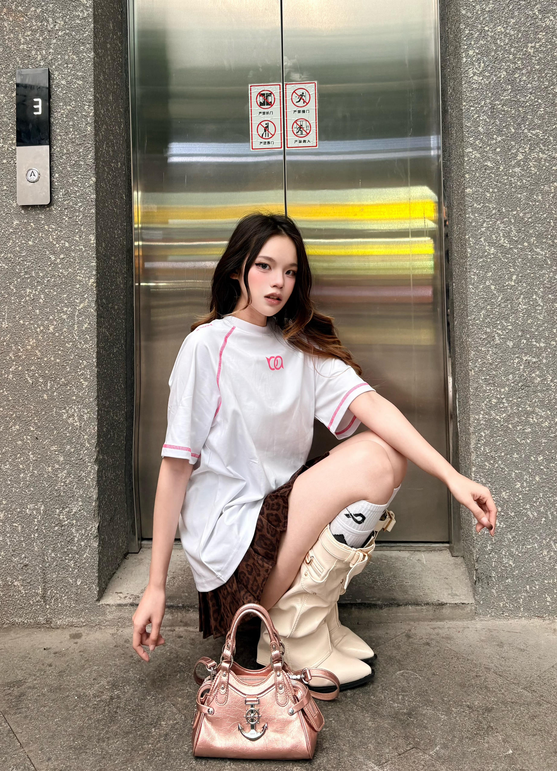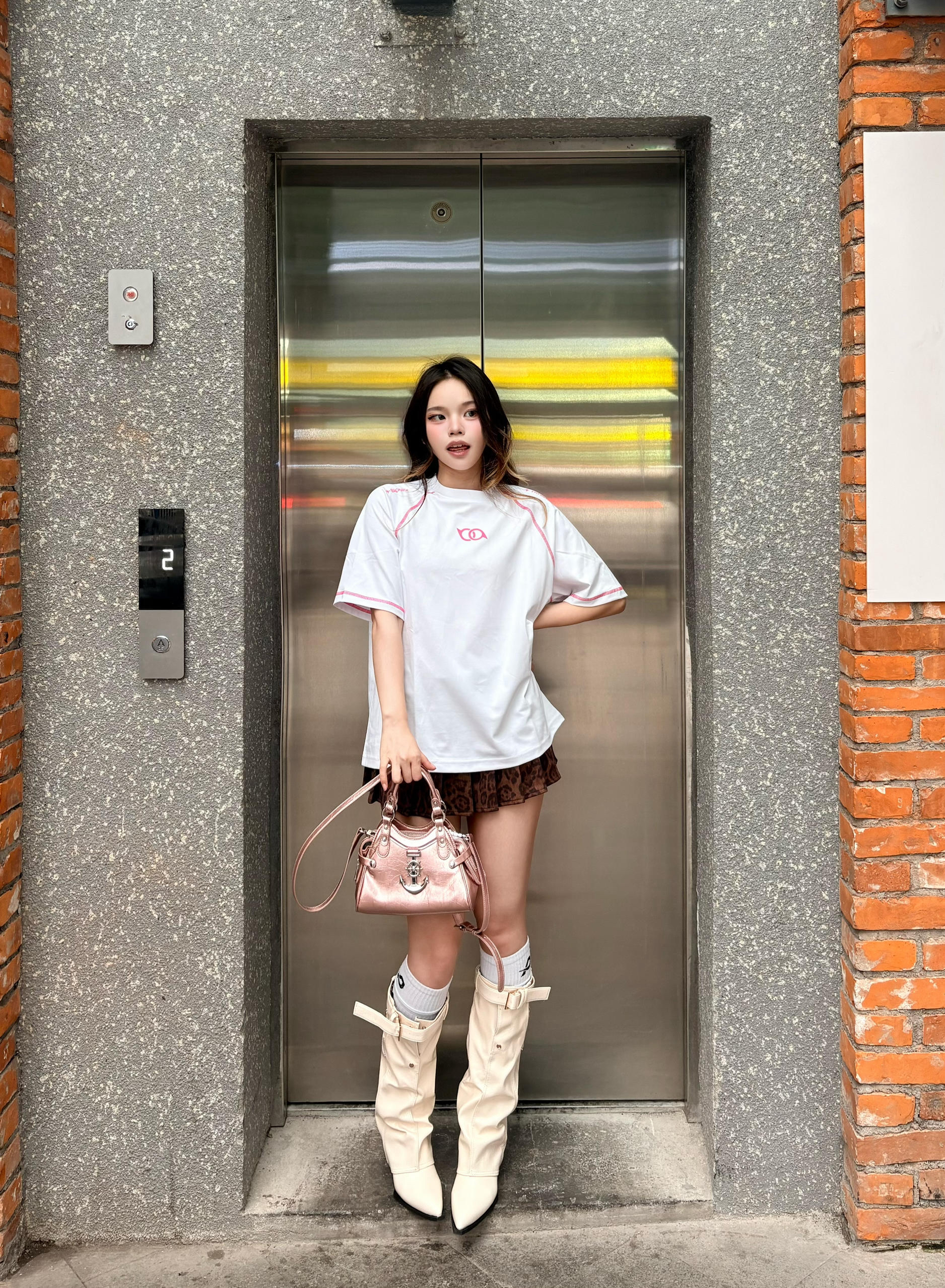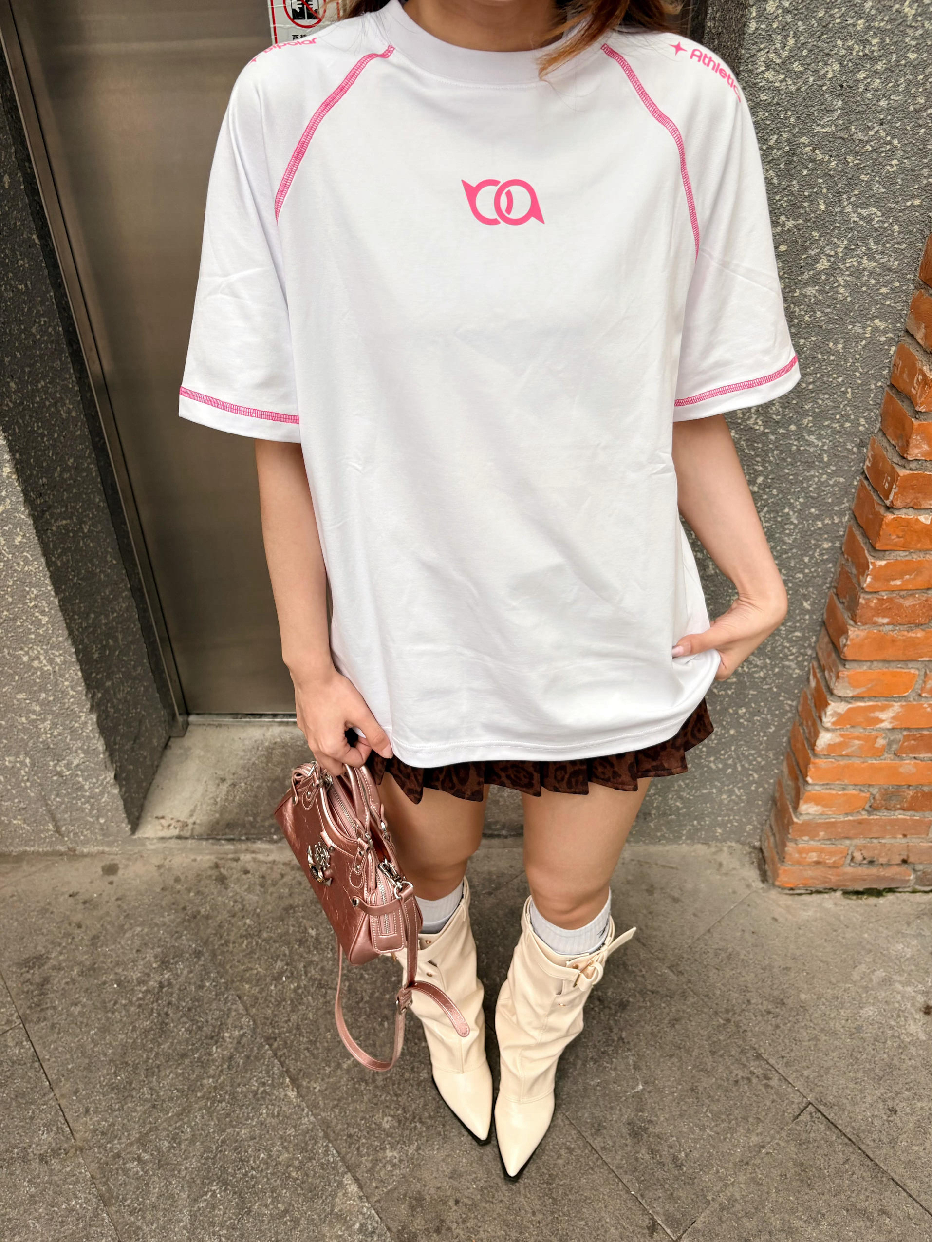 这件t恤白粉撞色T太戳我了 🌸 后背亮眼的玫粉印花+明线包边,美式复古感拉满,宽松版型藏肉又随性。💕 下装搭了超短款格纹裙+堆堆靴,上长下短+同色系粉包呼应,甜酷平衡刚刚好,小个子也能穿出大长腿既视感,春夏出街回头率爆表🩷 我165/96 穿的m