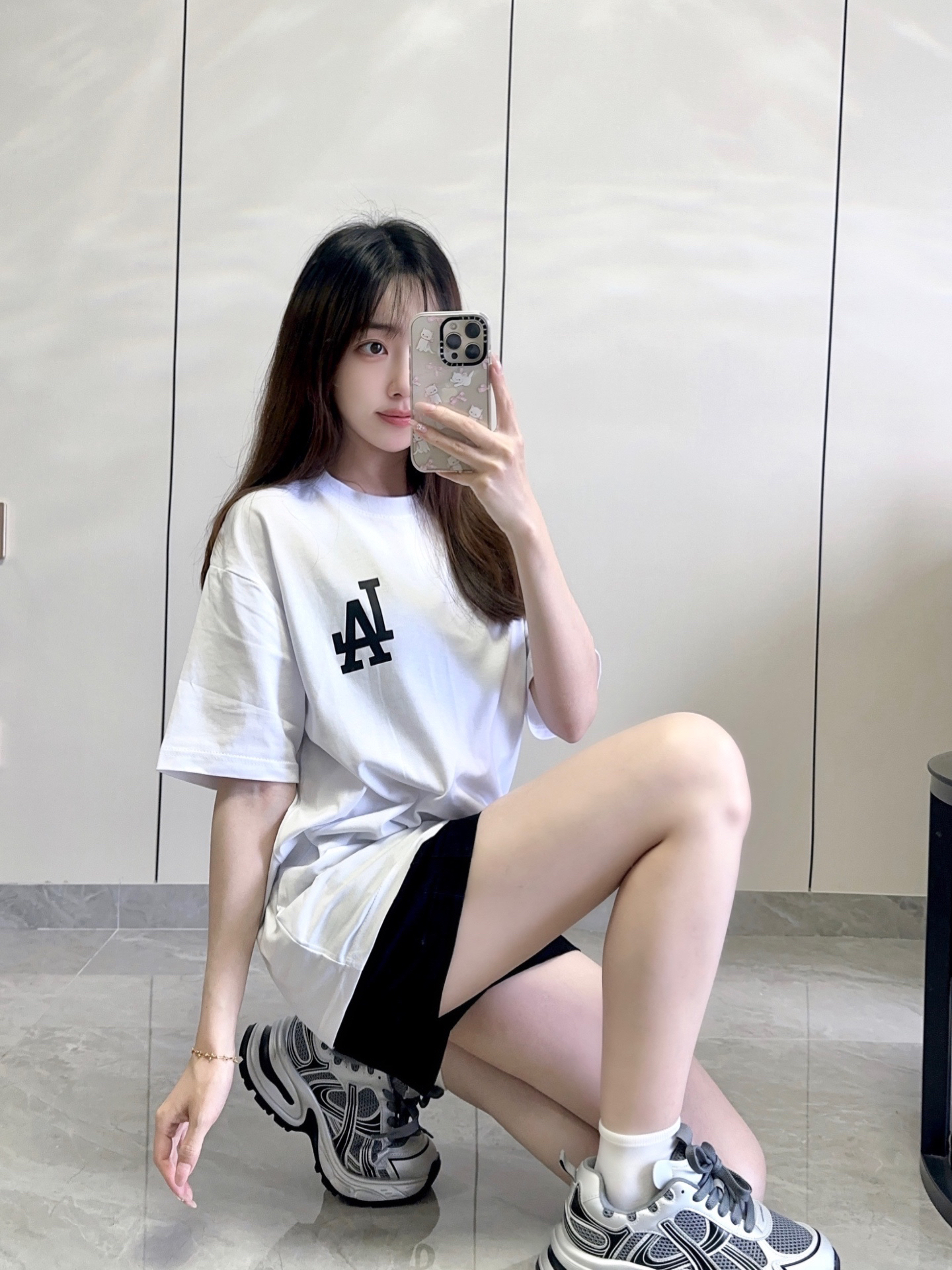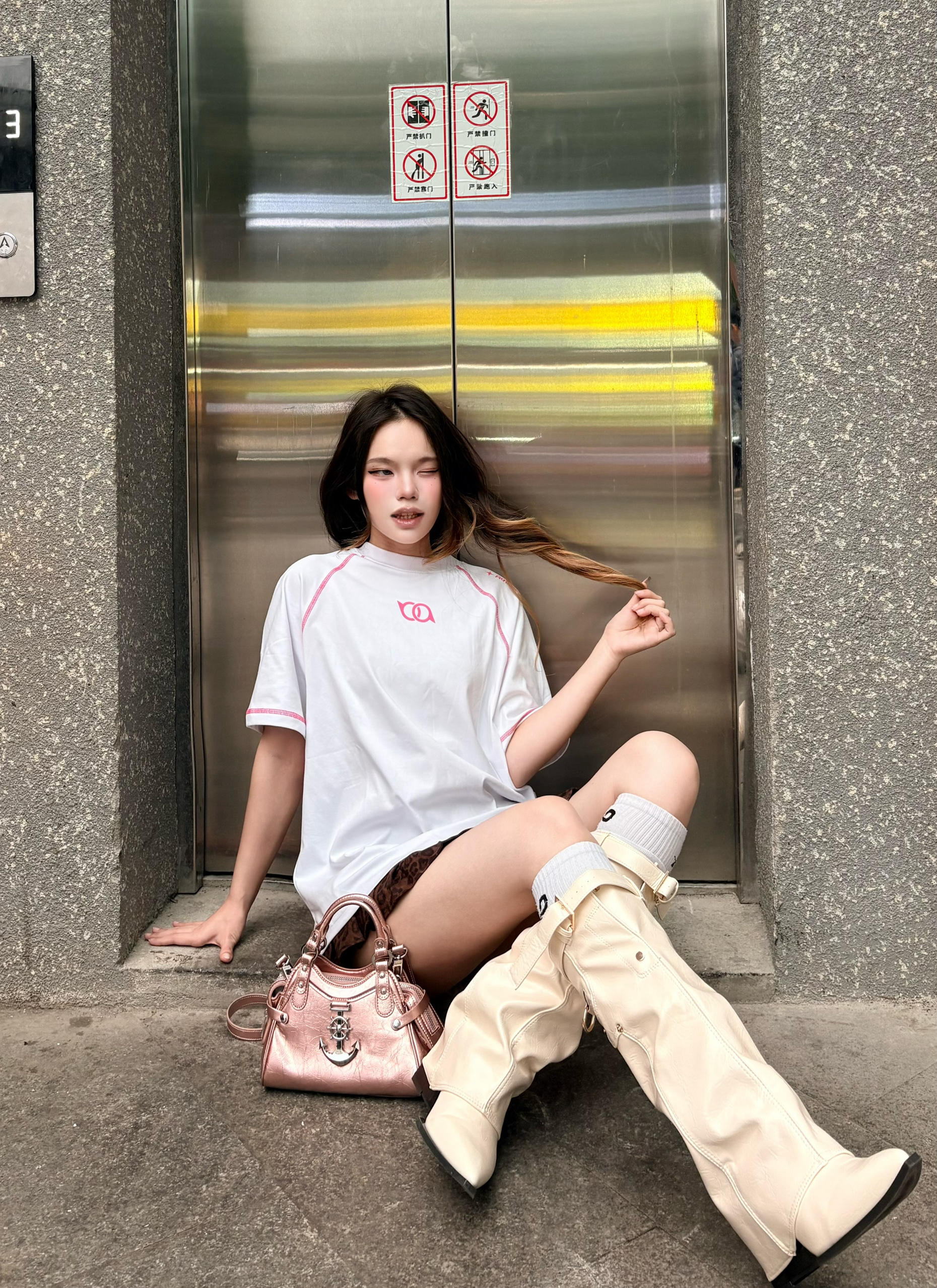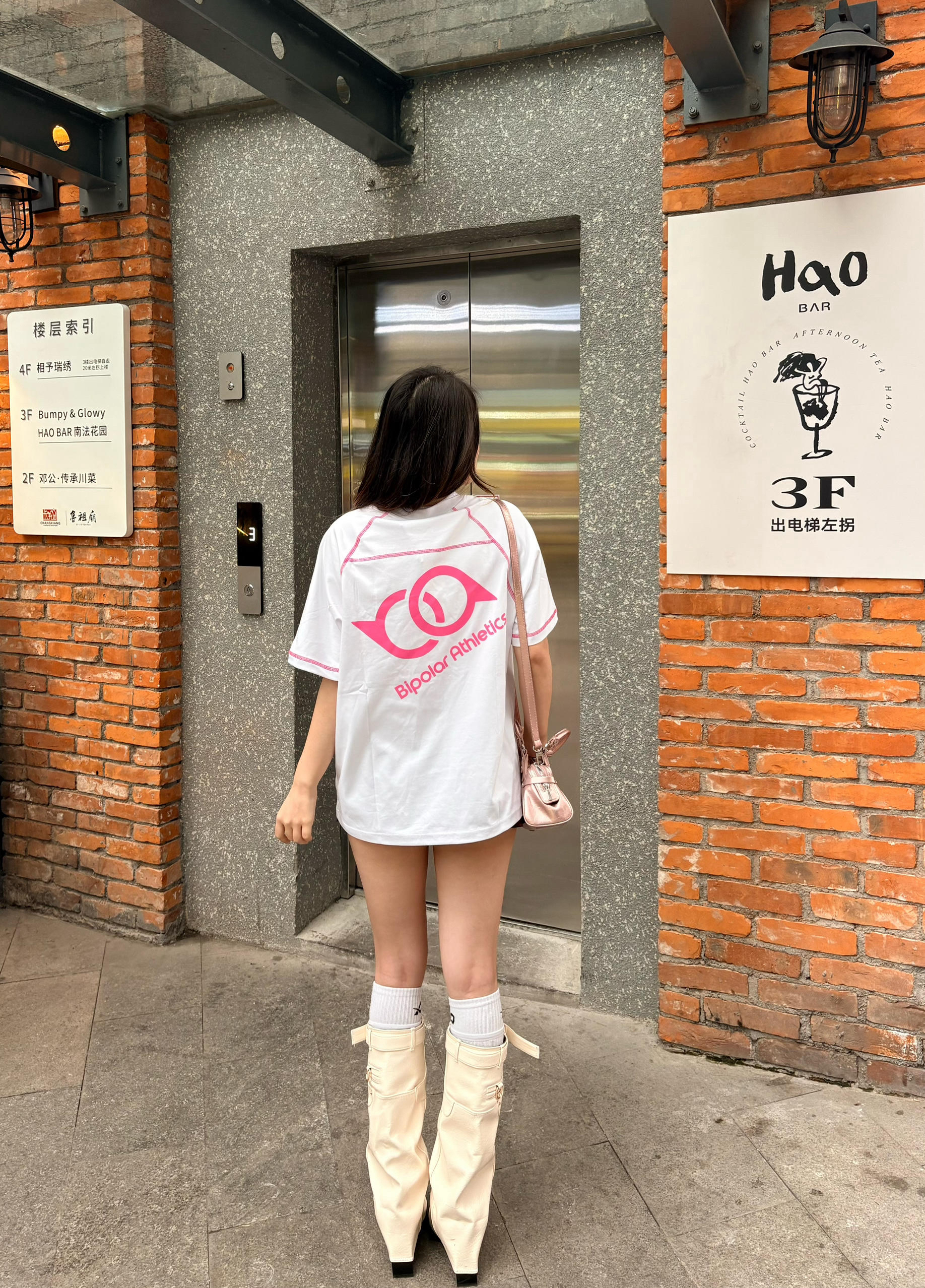 这件t恤白粉撞色T太戳我了 🌸 后背亮眼的玫粉印花+明线包边,美式复古感拉满,宽松版型藏肉又随性。💕 下装搭了超短款格纹裙+堆堆靴,上长下短+同色系粉包呼应,甜酷平衡刚刚好,小个子也能穿出大长腿既视感,春夏出街回头率爆表🩷 我165/96 穿的m