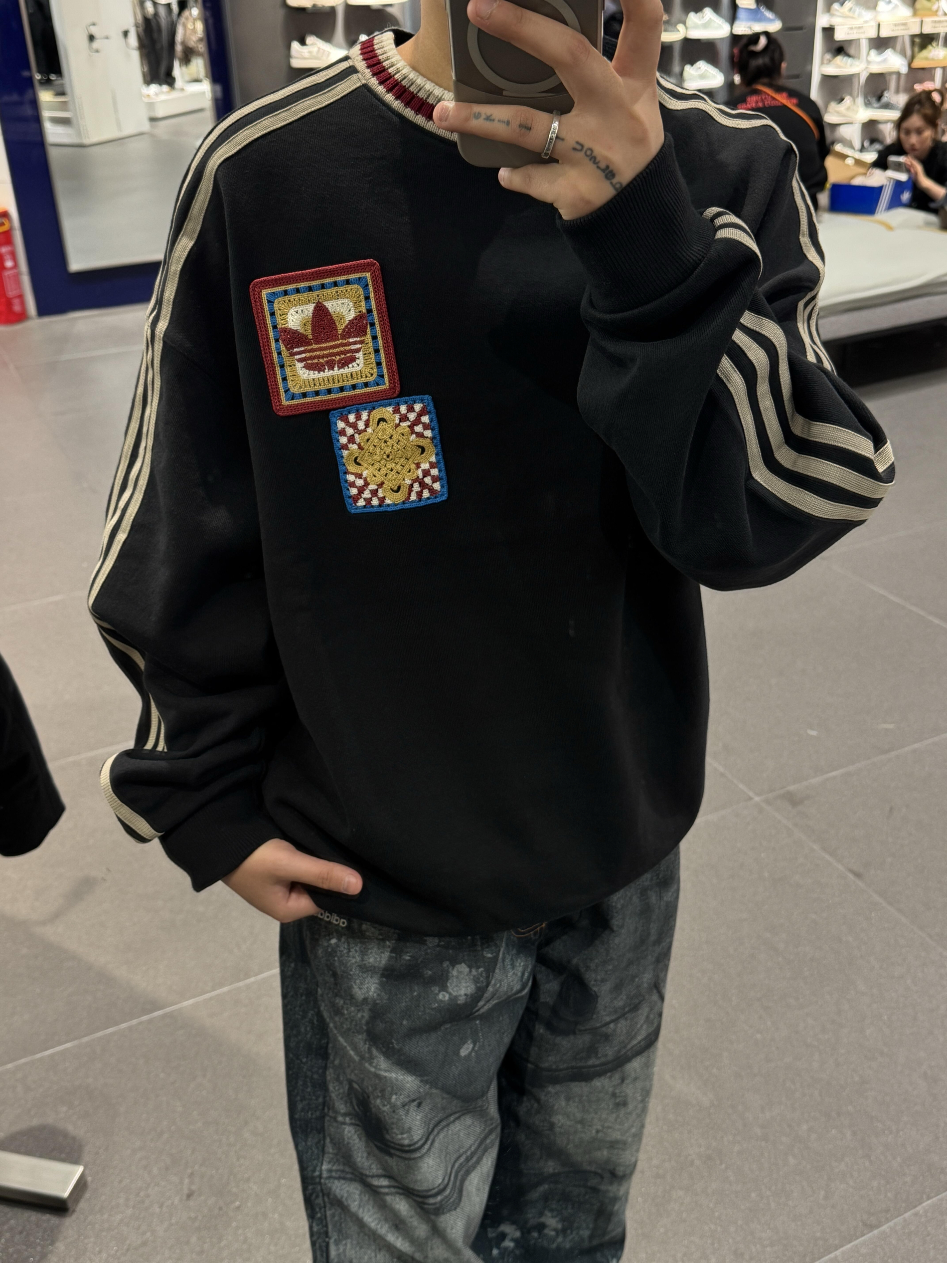 这件三叶草贴布卫衣真的太有感觉了! 黑底耐脏又显瘦,胸口中国结+三叶草贴布细节拉满, 领口撞色罗边复古感拉满,侧边三条杠经典耐看。 搭配做旧牛仔,一套国潮街头风直接拿捏! 新年穿它出门,回头率直接爆表!