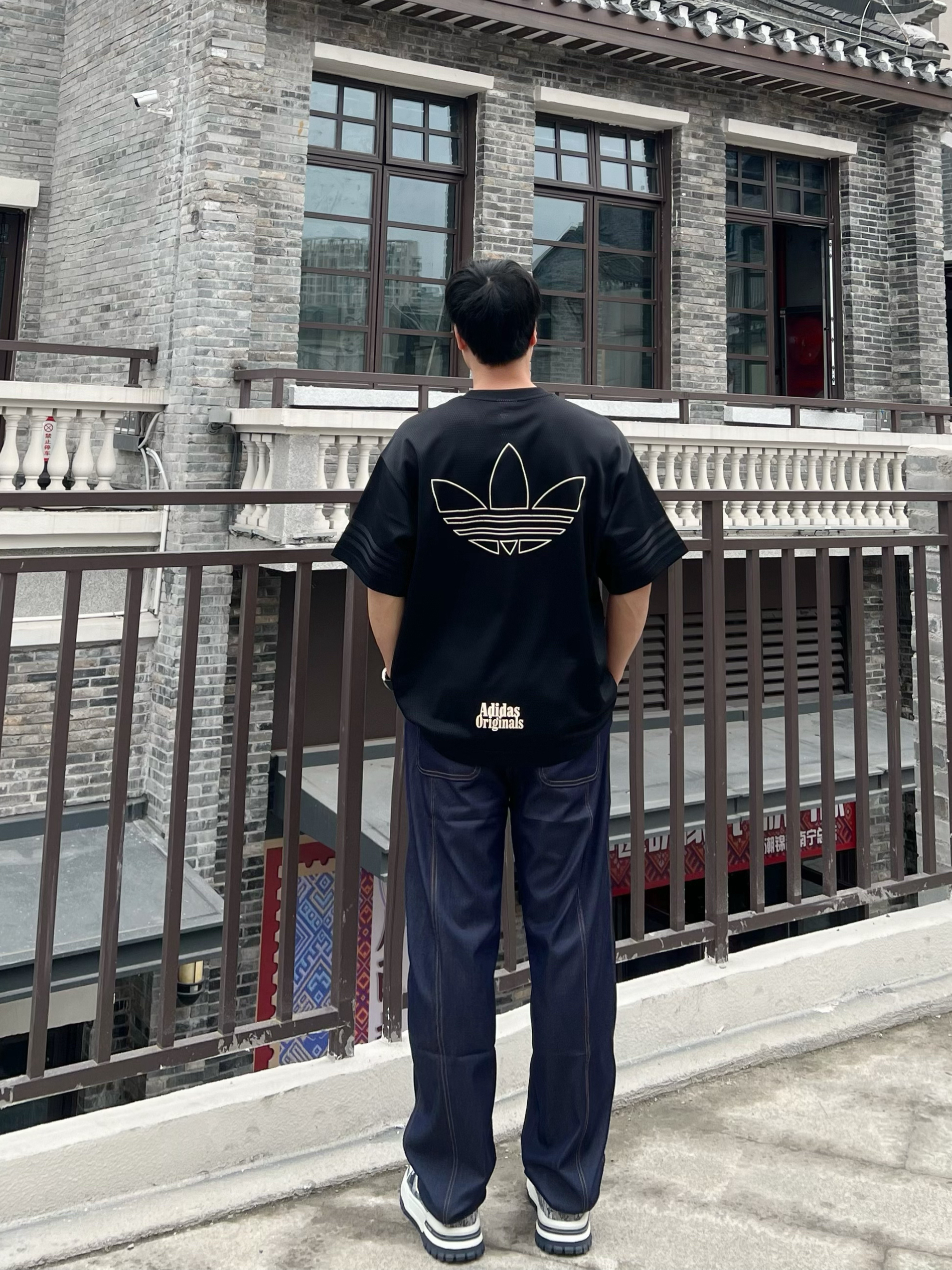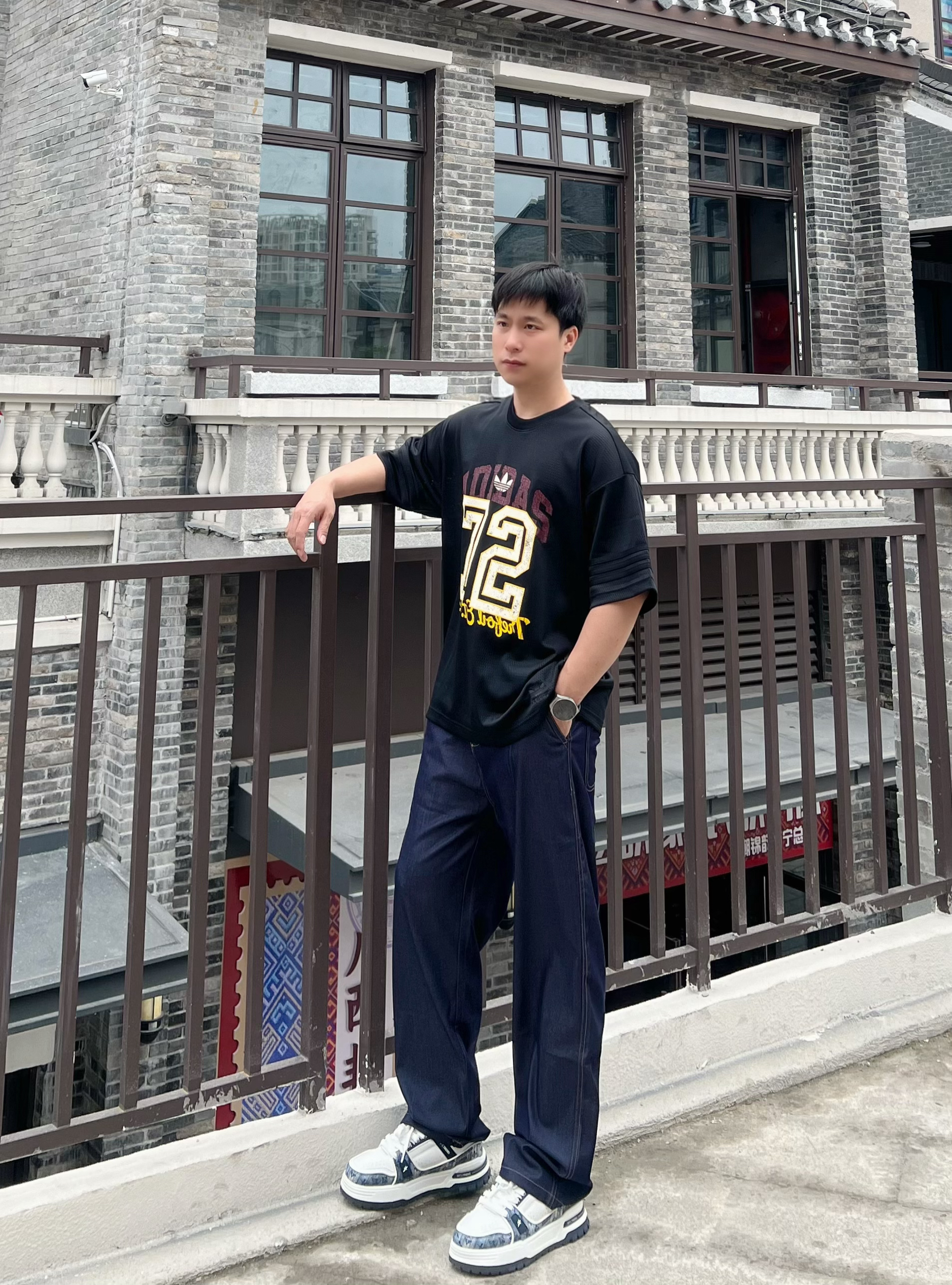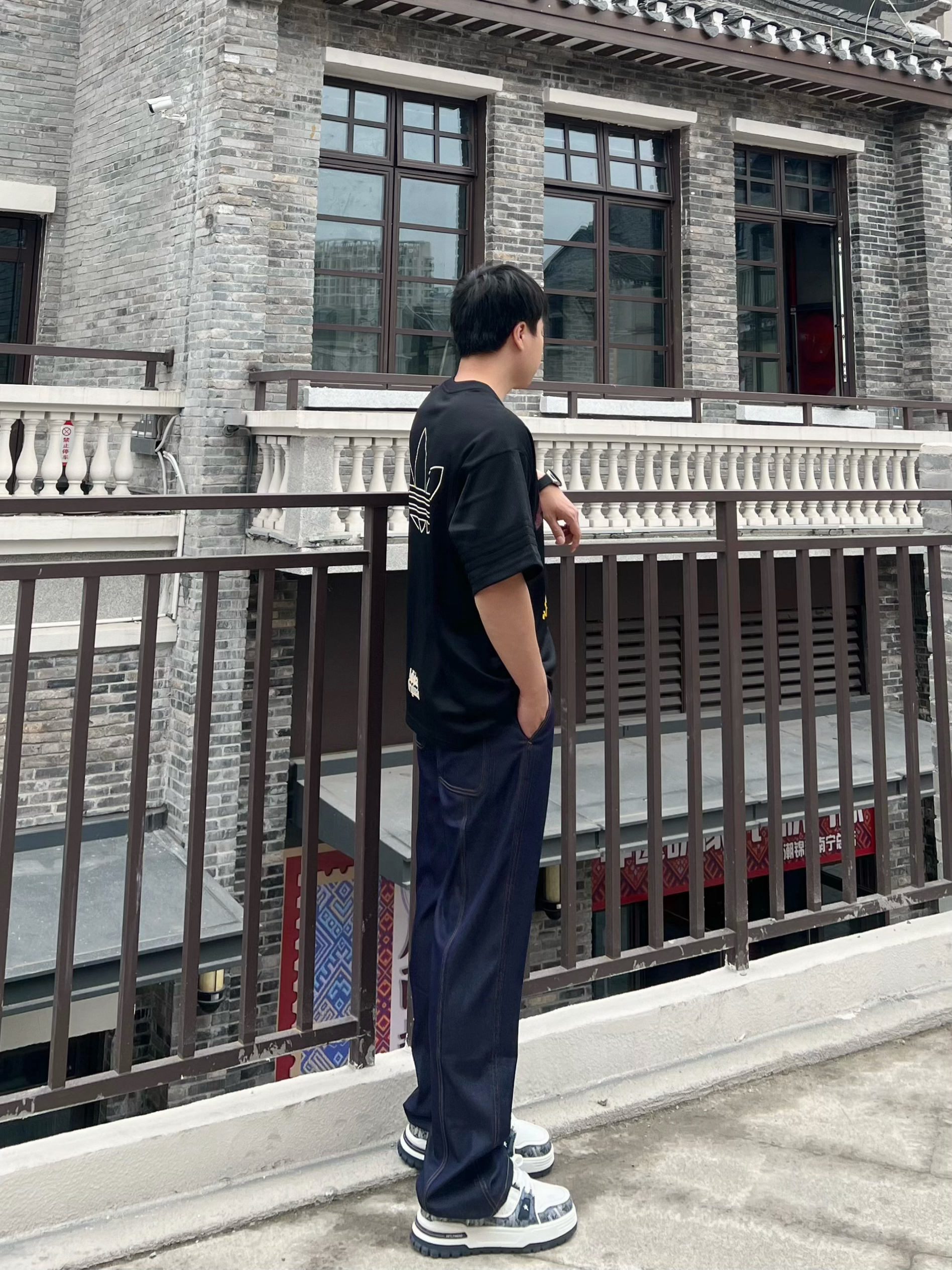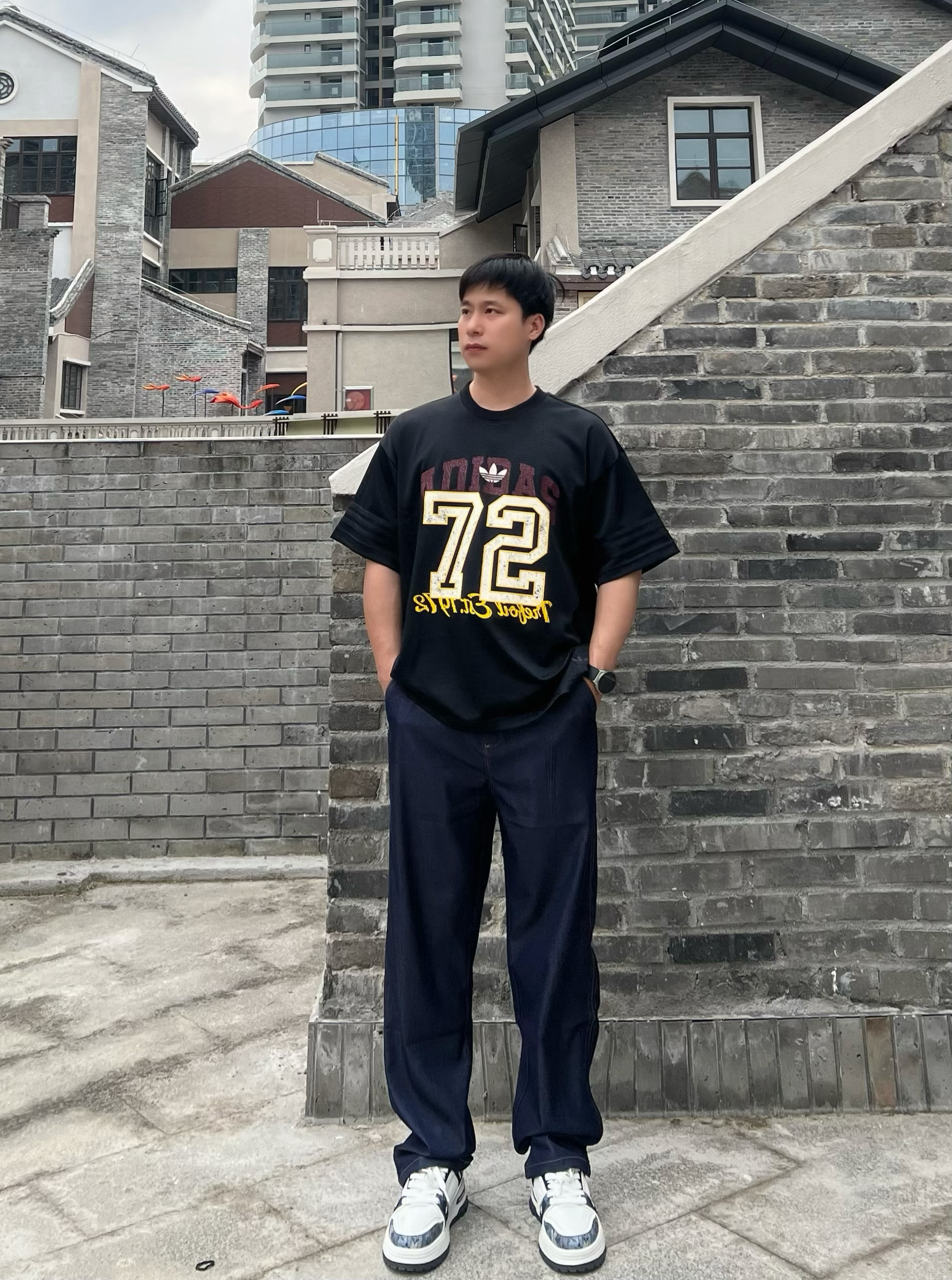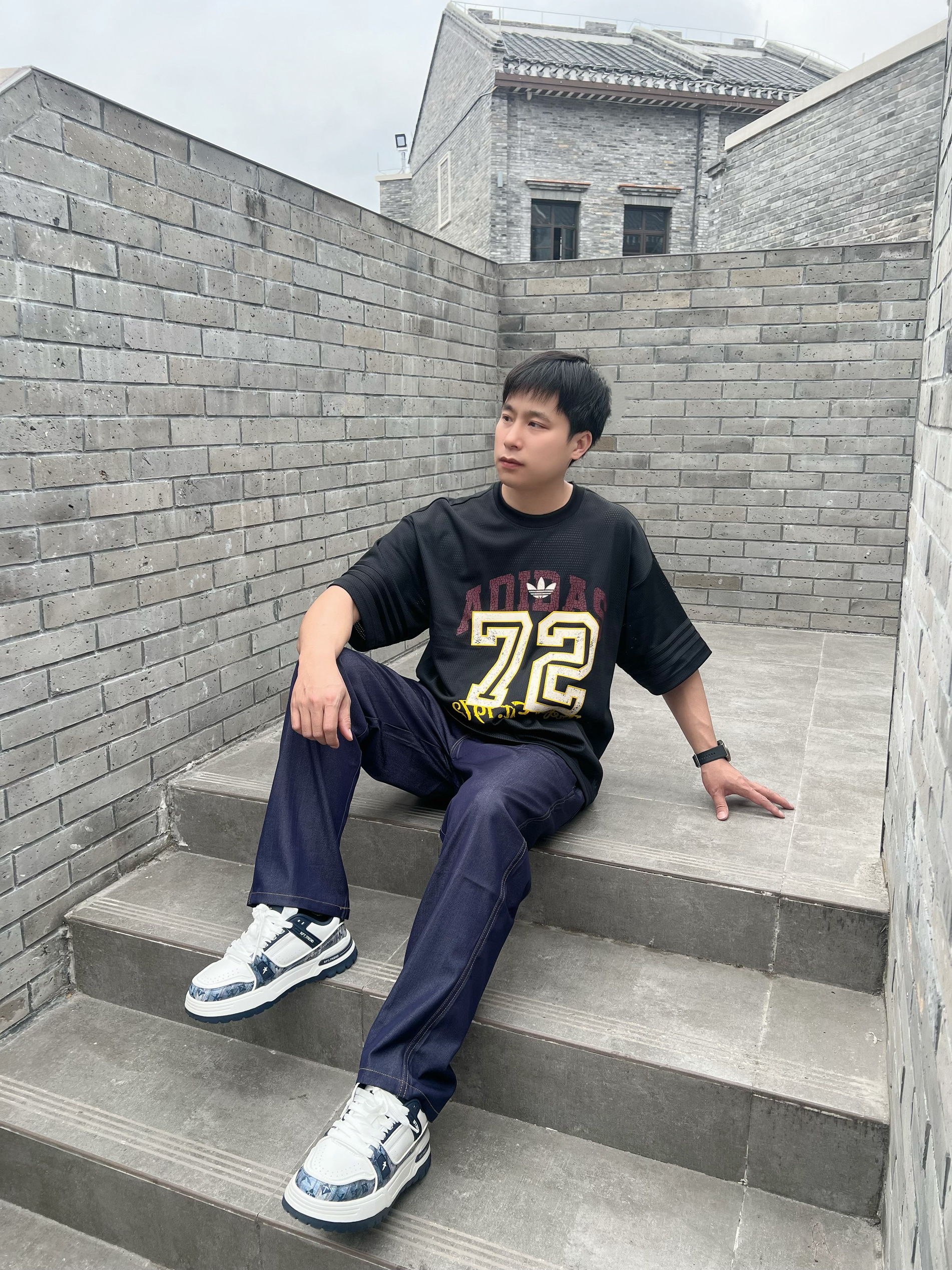 夏天男生穿搭最烦的就是闷汗粘身💦这套是我最近穿得最多的😎完全解决夏日穿搭痛点💕 上衣是阿迪达斯网眼短袖✨整个面料都是带细密透气孔的,30多度的天出门,走一下午也不会贴在背上,比普通棉T透气太多了✨ 宽松落肩的版型,对身材的包容度很高,做旧的印花设计,美式复古感很足,不会太浮夸,日常穿完全不突兀🔥 下装搭的是藏青直筒牛仔裤,选的是薄款软牛仔,夏天穿也不闷腿,裤型是微阔的直筒,搭这双厚底板鞋,还能偷偷...