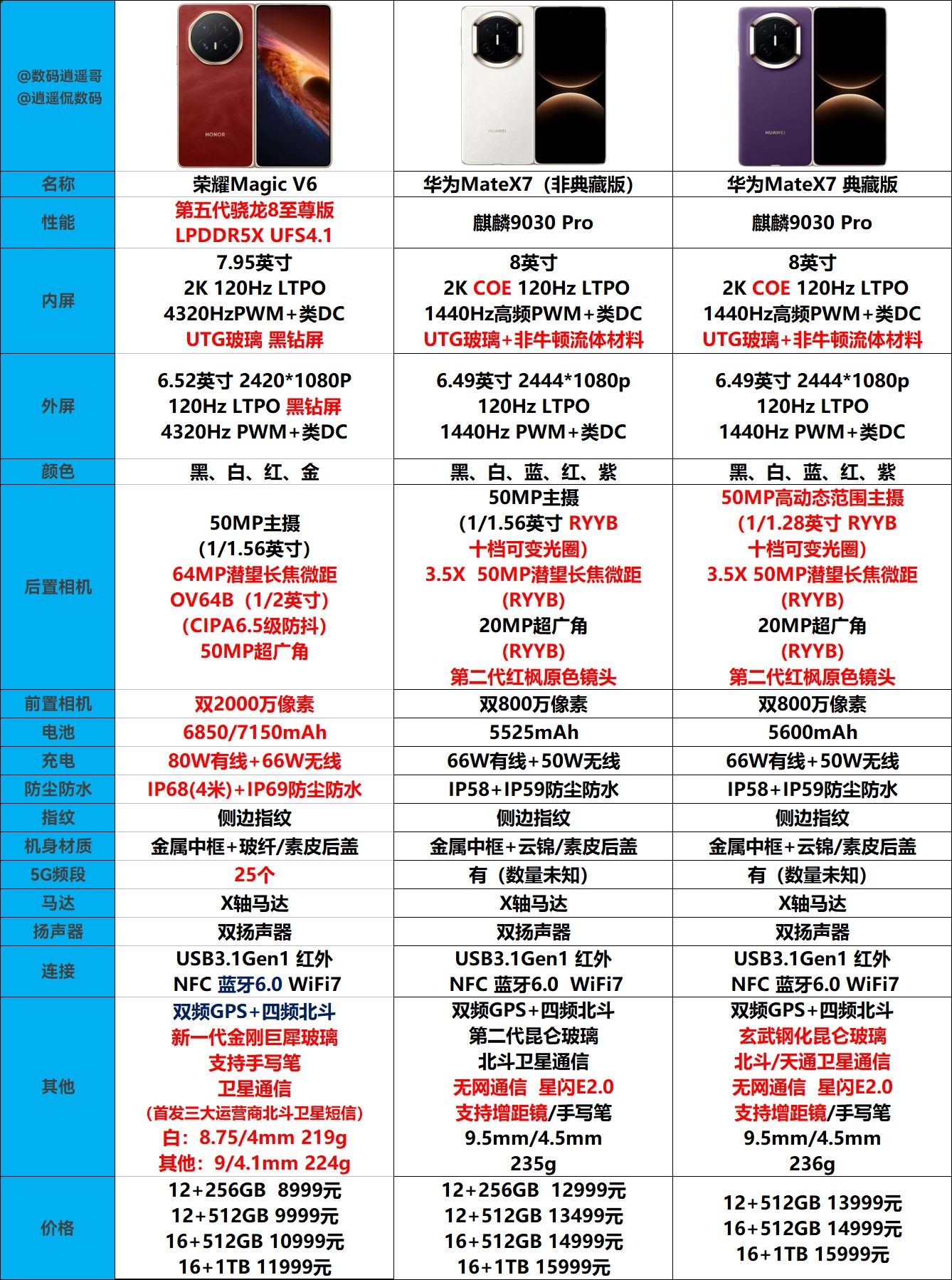 一图看懂|荣耀MagicV6详细对比华为MateX7