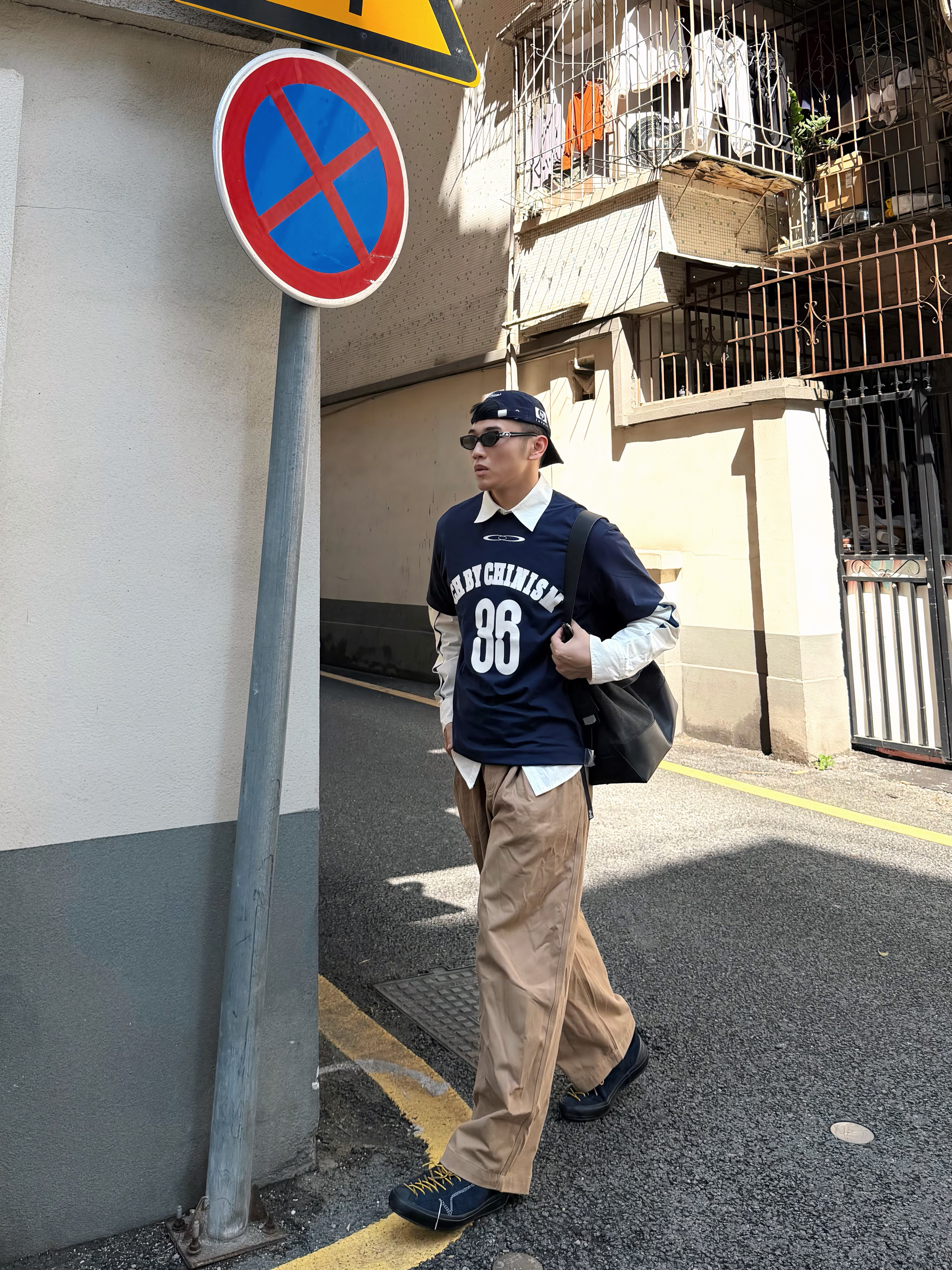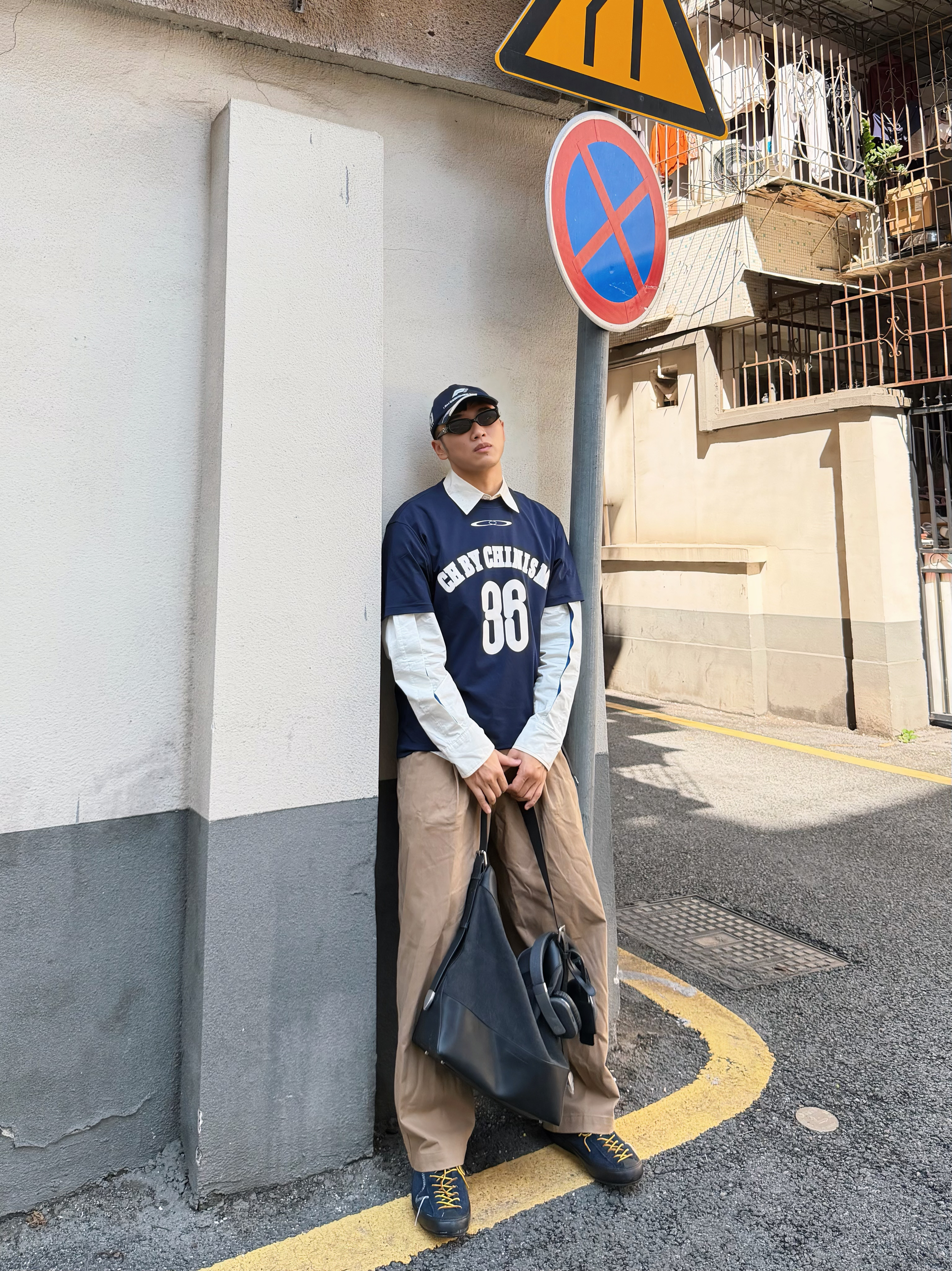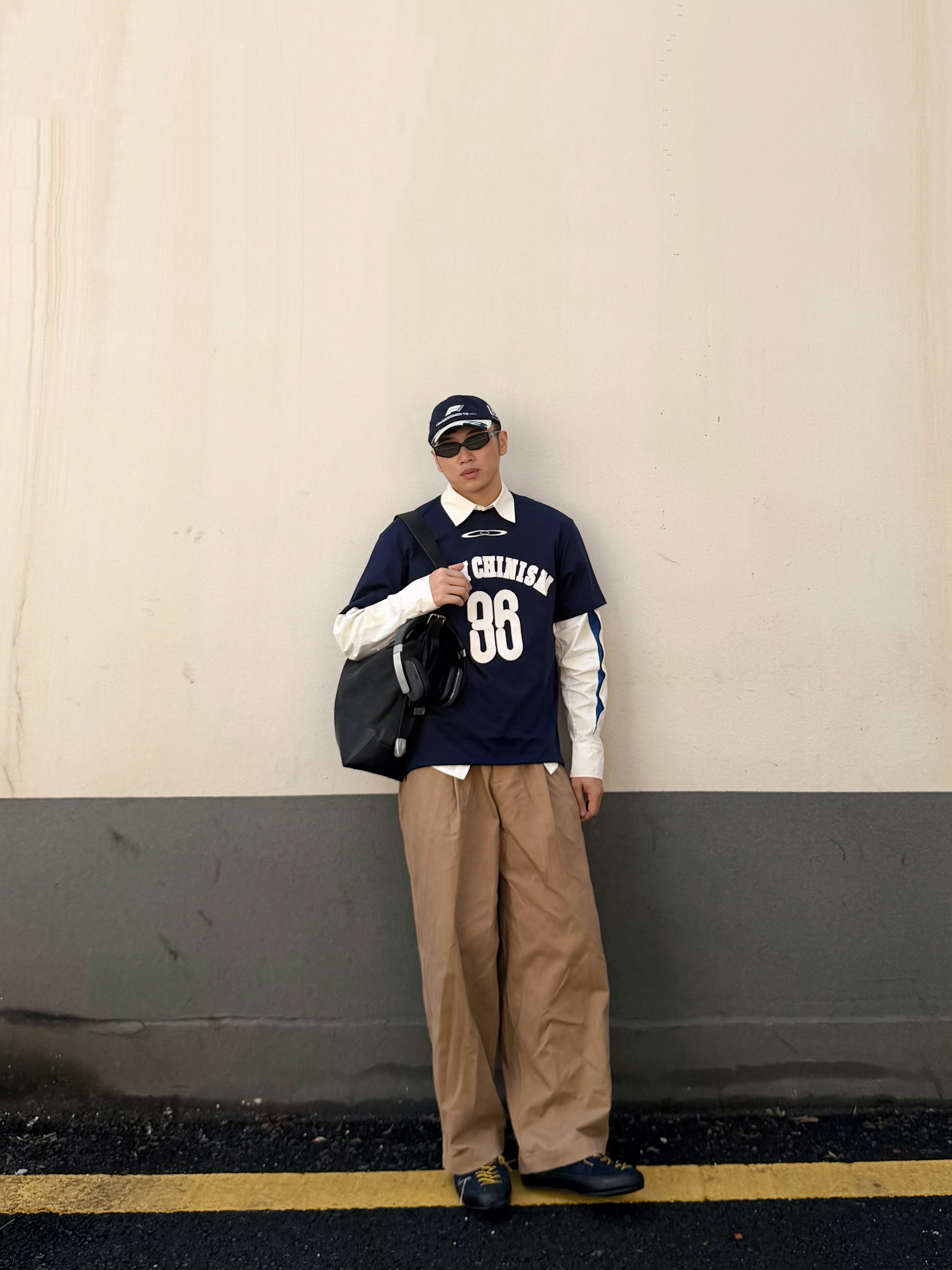 藏青数字球衣叠穿米白尖领衬衫,层次分明又自带松弛感。卡其阔腿裤垂坠感拉满,中和了运动上衣的硬朗,再踩上一双复古黑靴,街头感瞬间拉满。棒球帽与墨镜的加持,让整体造型更具辨识度,随手拎起托特包,耳机挂在包侧,随性又不失细节。 在老巷的斑驳墙影下,早春的阳光刚好,不用刻意凹造型,松弛感与复古感自然融合。这一套既适合citywalk,又能轻松应对日常通勤,把“叠穿”“松弛感”“美式复古”这些早春关键词...