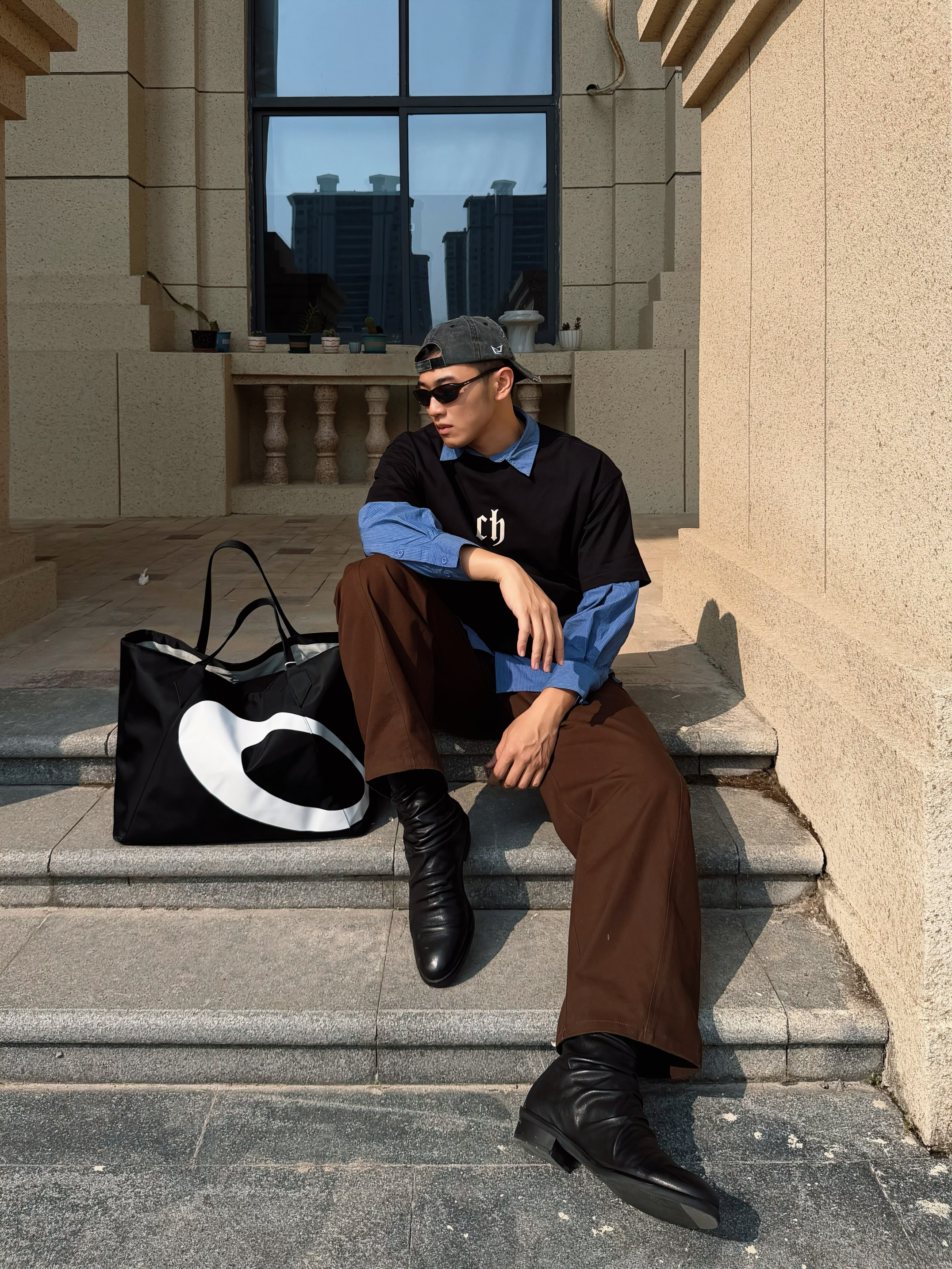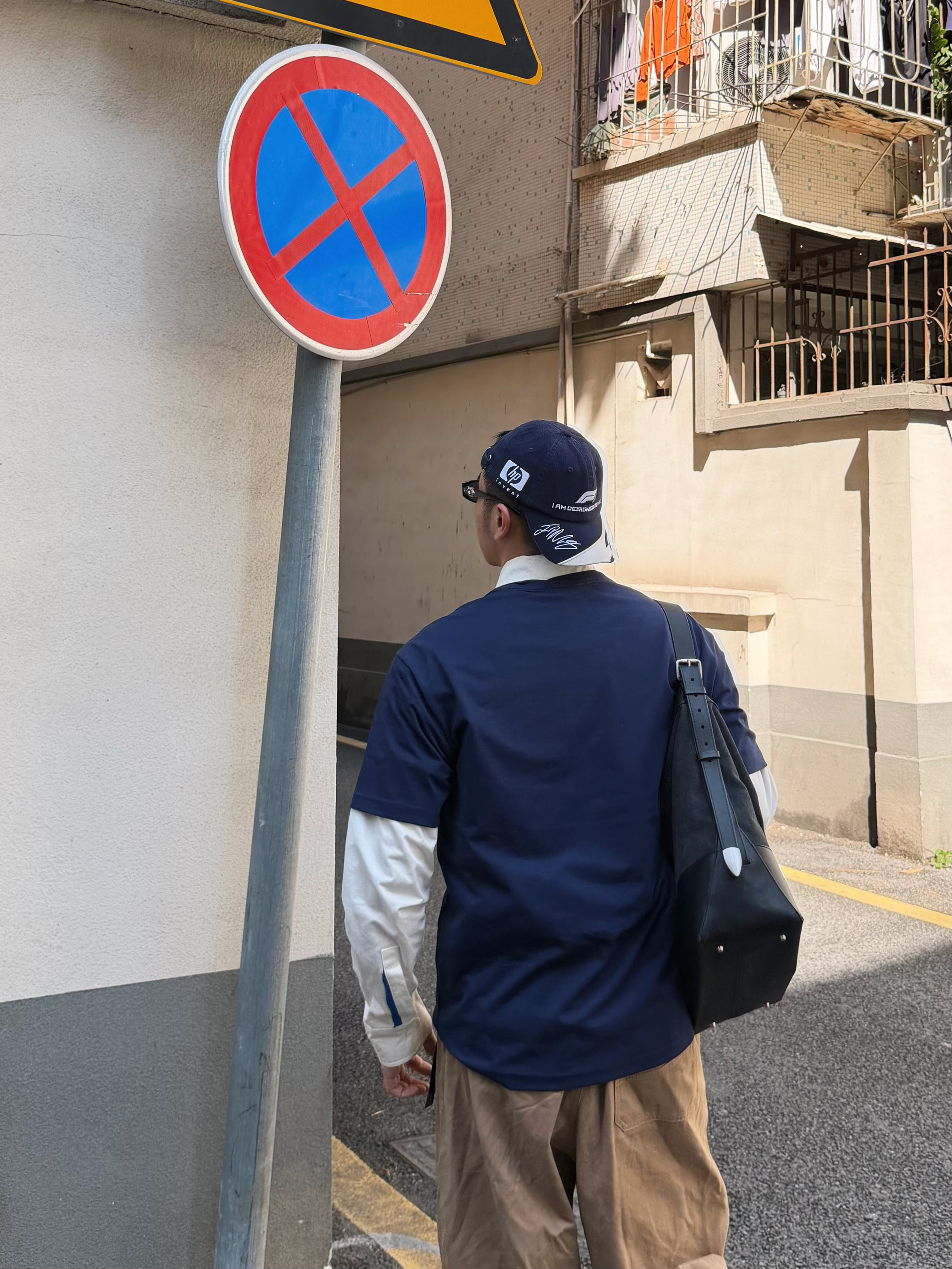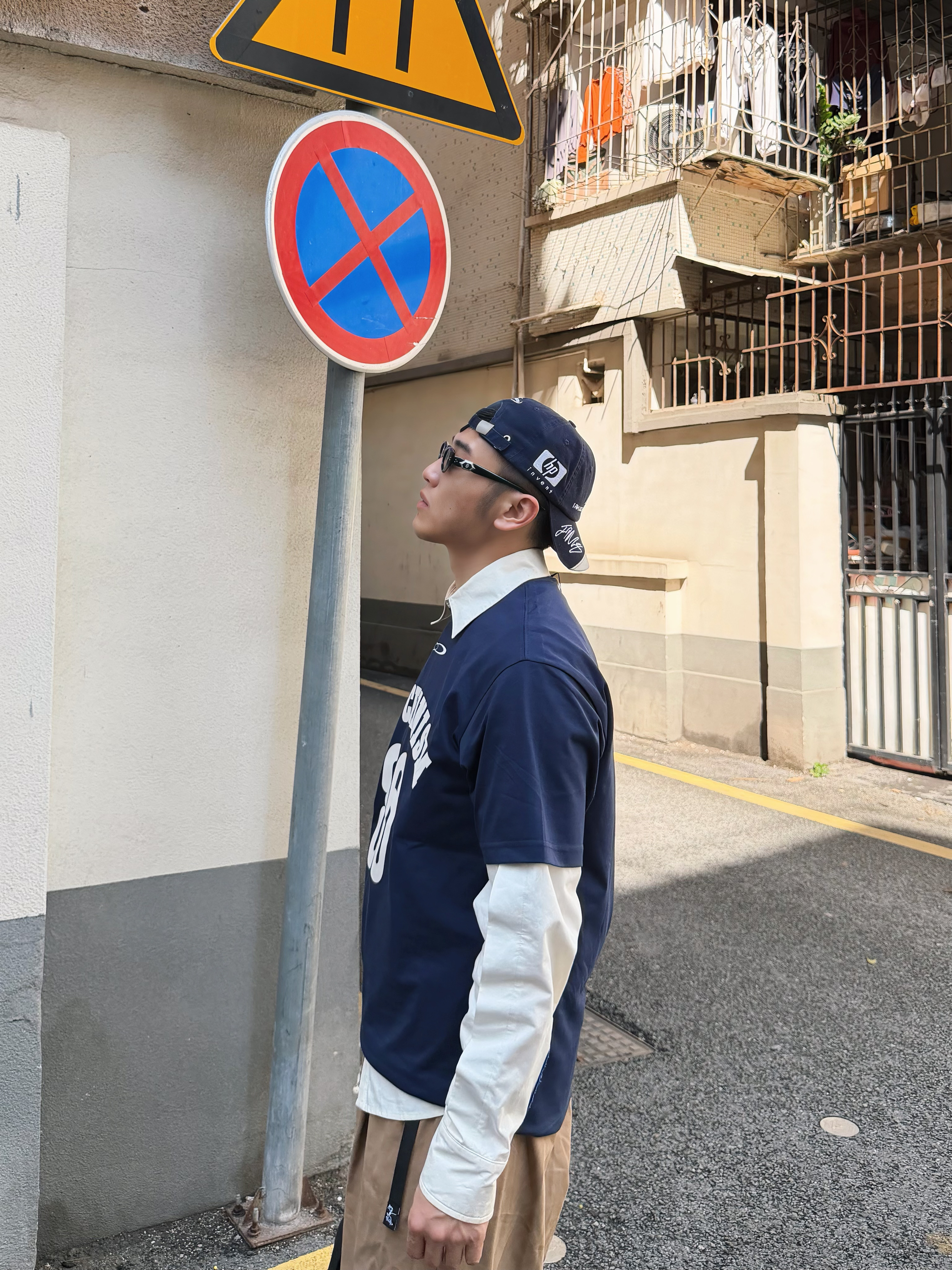 藏青数字球衣叠穿米白尖领衬衫,层次分明又自带松弛感。卡其阔腿裤垂坠感拉满,中和了运动上衣的硬朗,再踩上一双复古黑靴,街头感瞬间拉满。棒球帽与墨镜的加持,让整体造型更具辨识度,随手拎起托特包,耳机挂在包侧,随性又不失细节。 在老巷的斑驳墙影下,早春的阳光刚好,不用刻意凹造型,松弛感与复古感自然融合。这一套既适合citywalk,又能轻松应对日常通勤,把“叠穿”“松弛感”“美式复古”这些早春关键词...