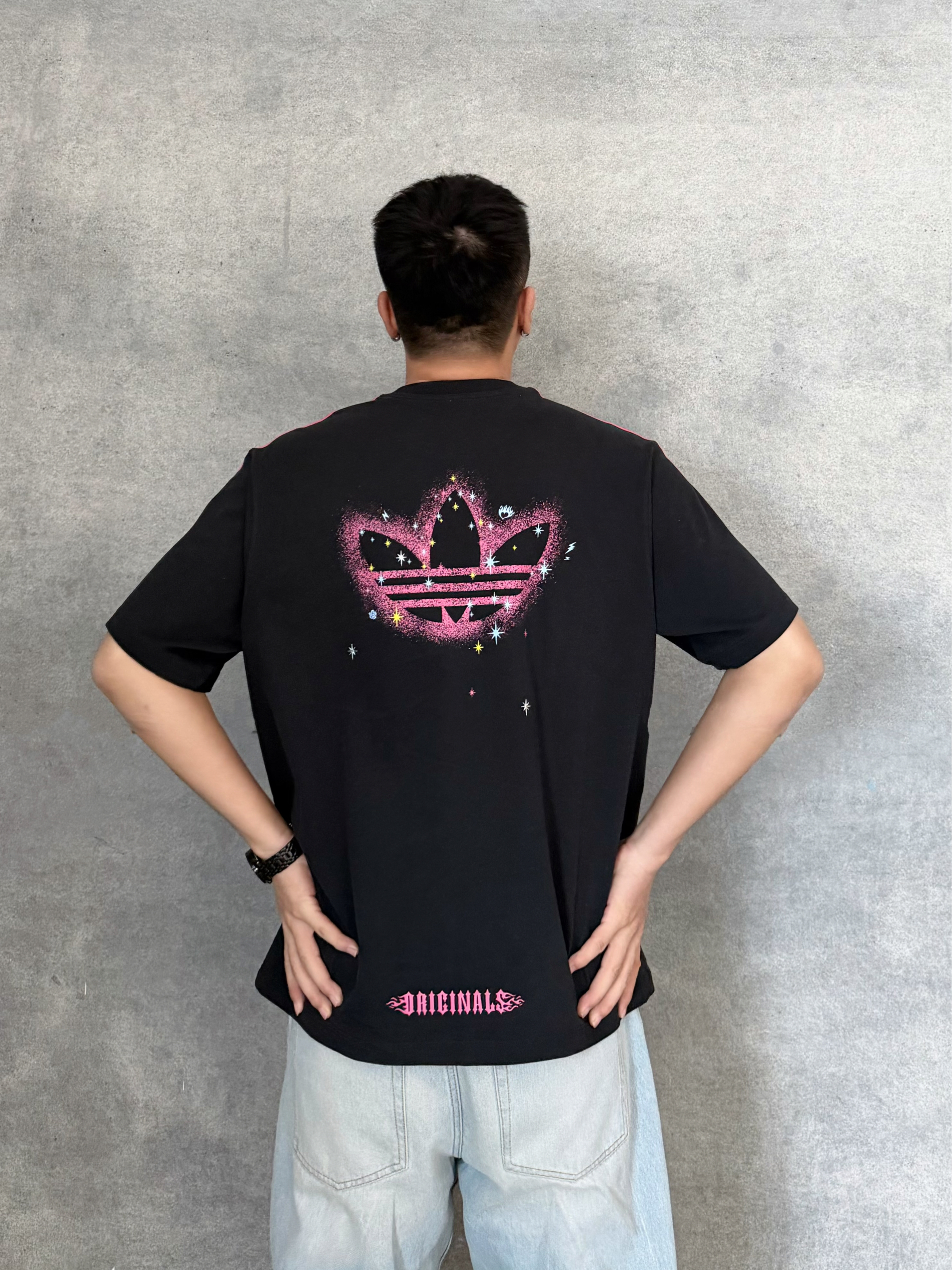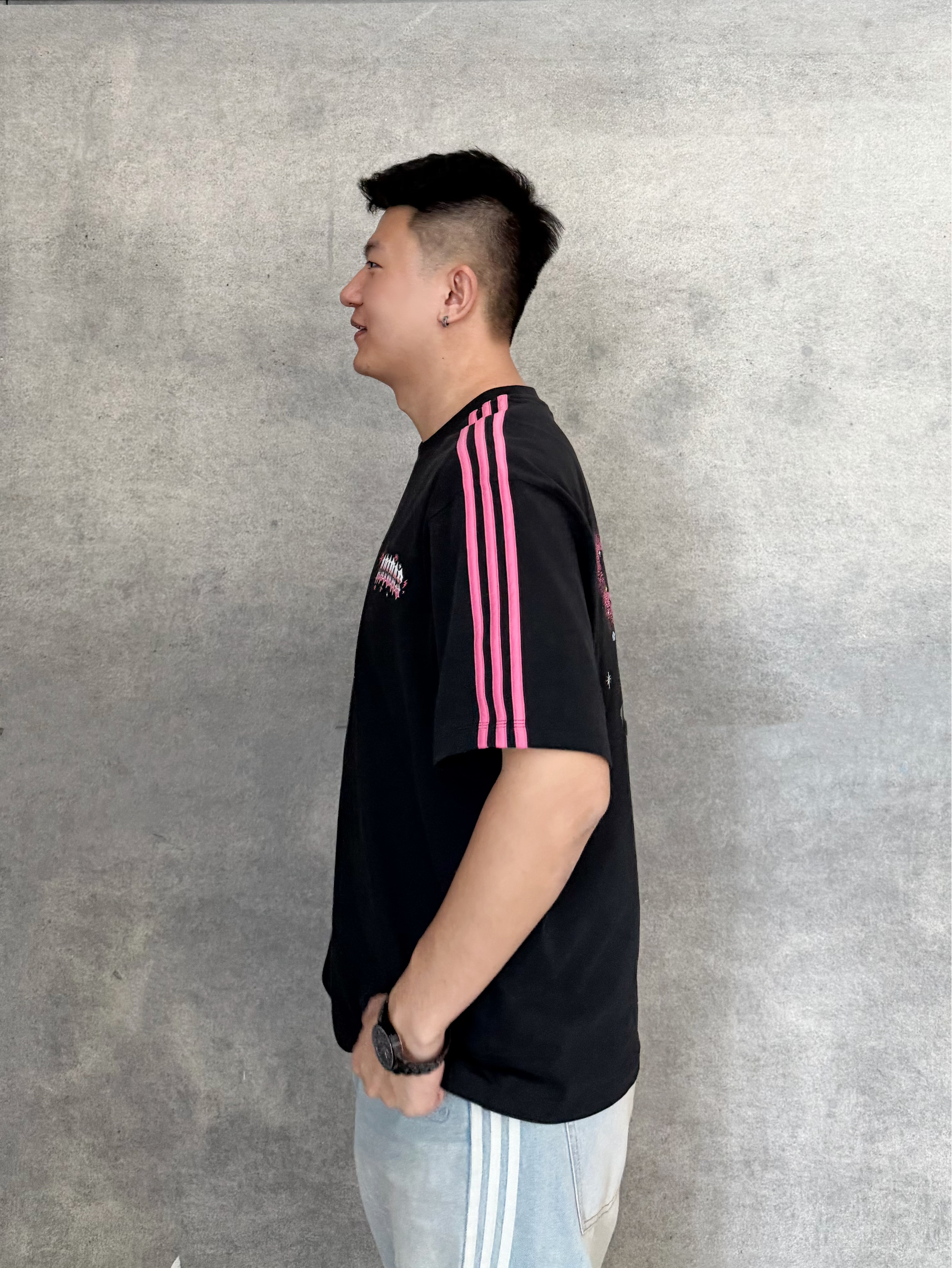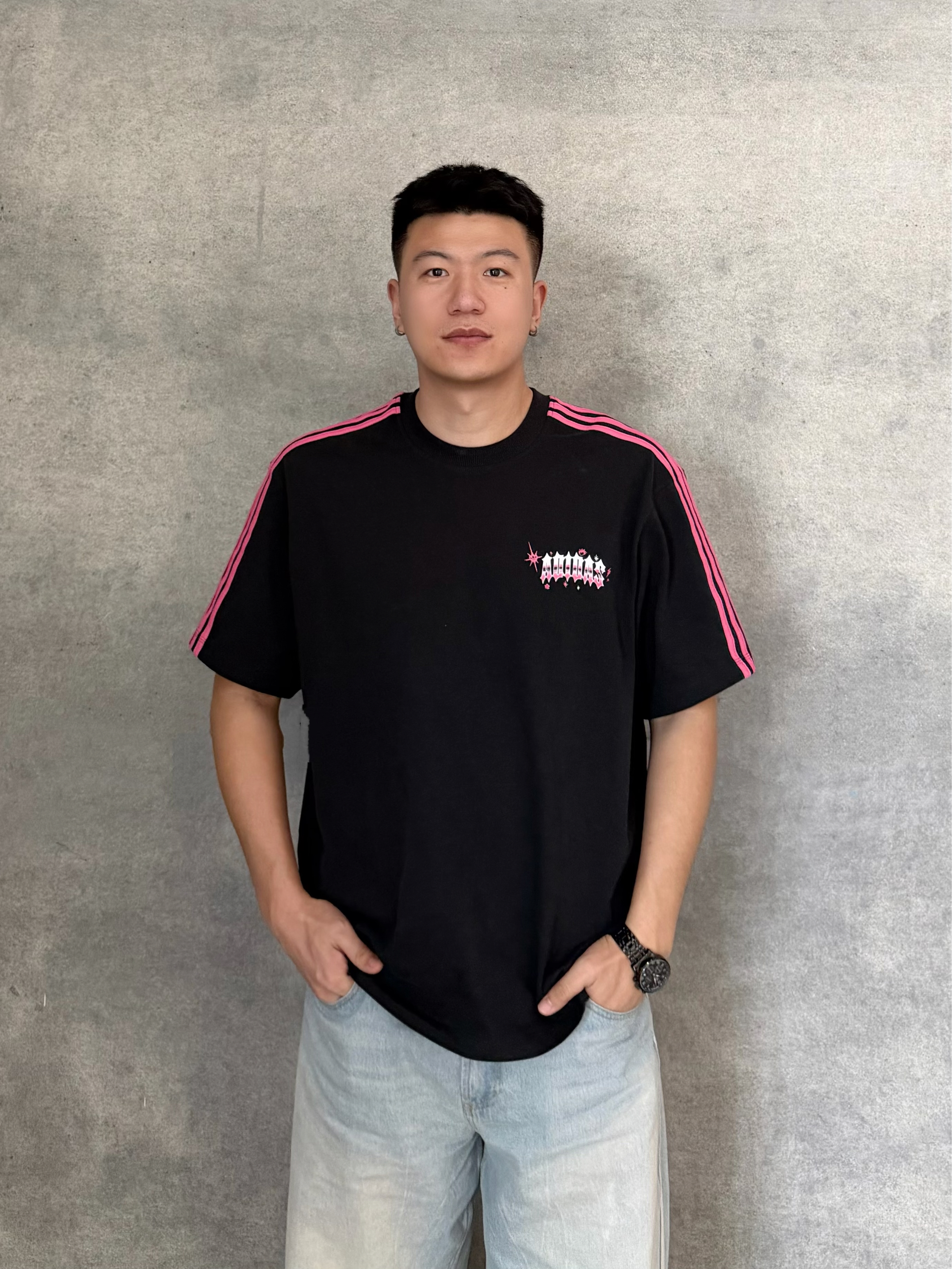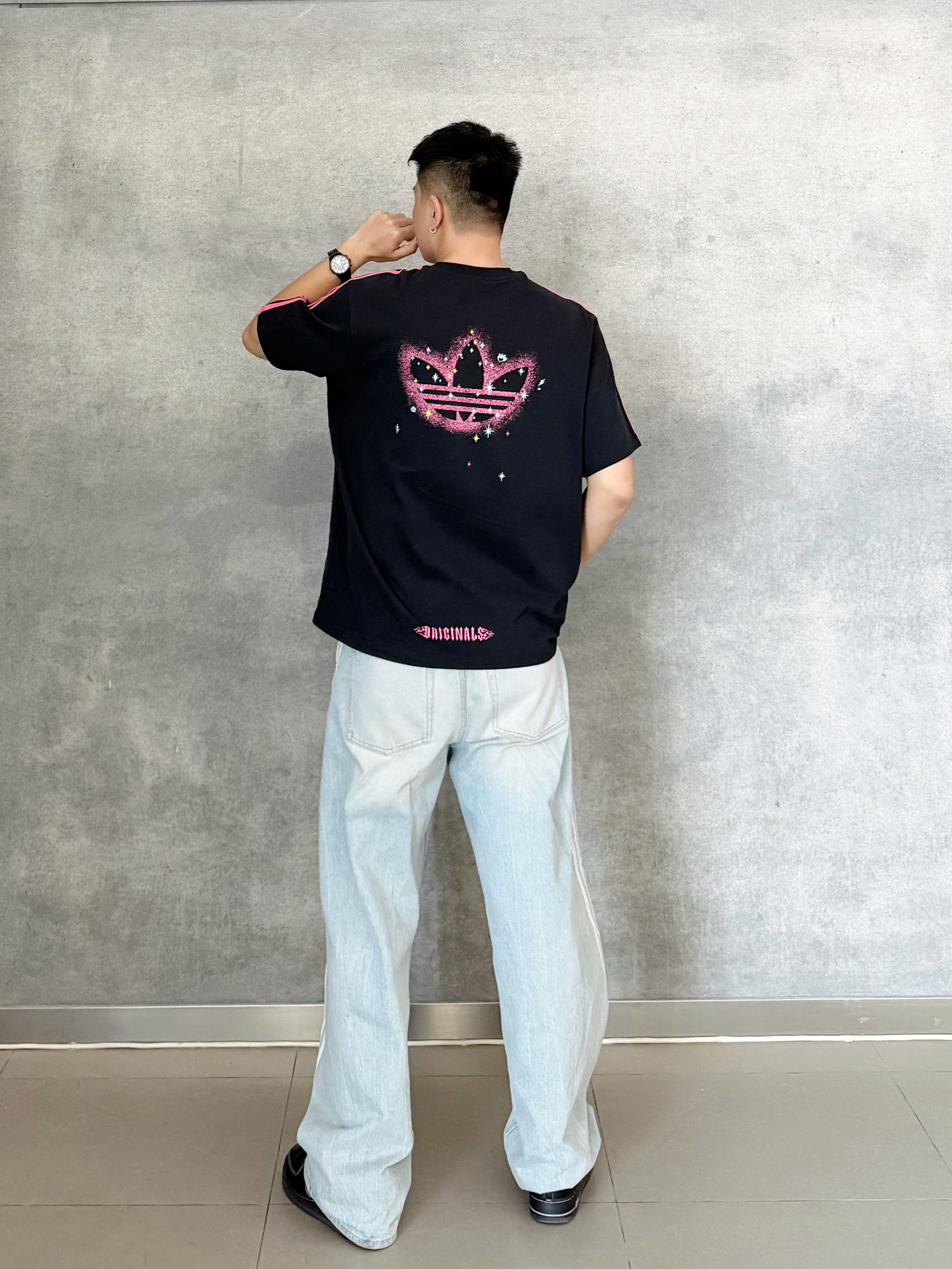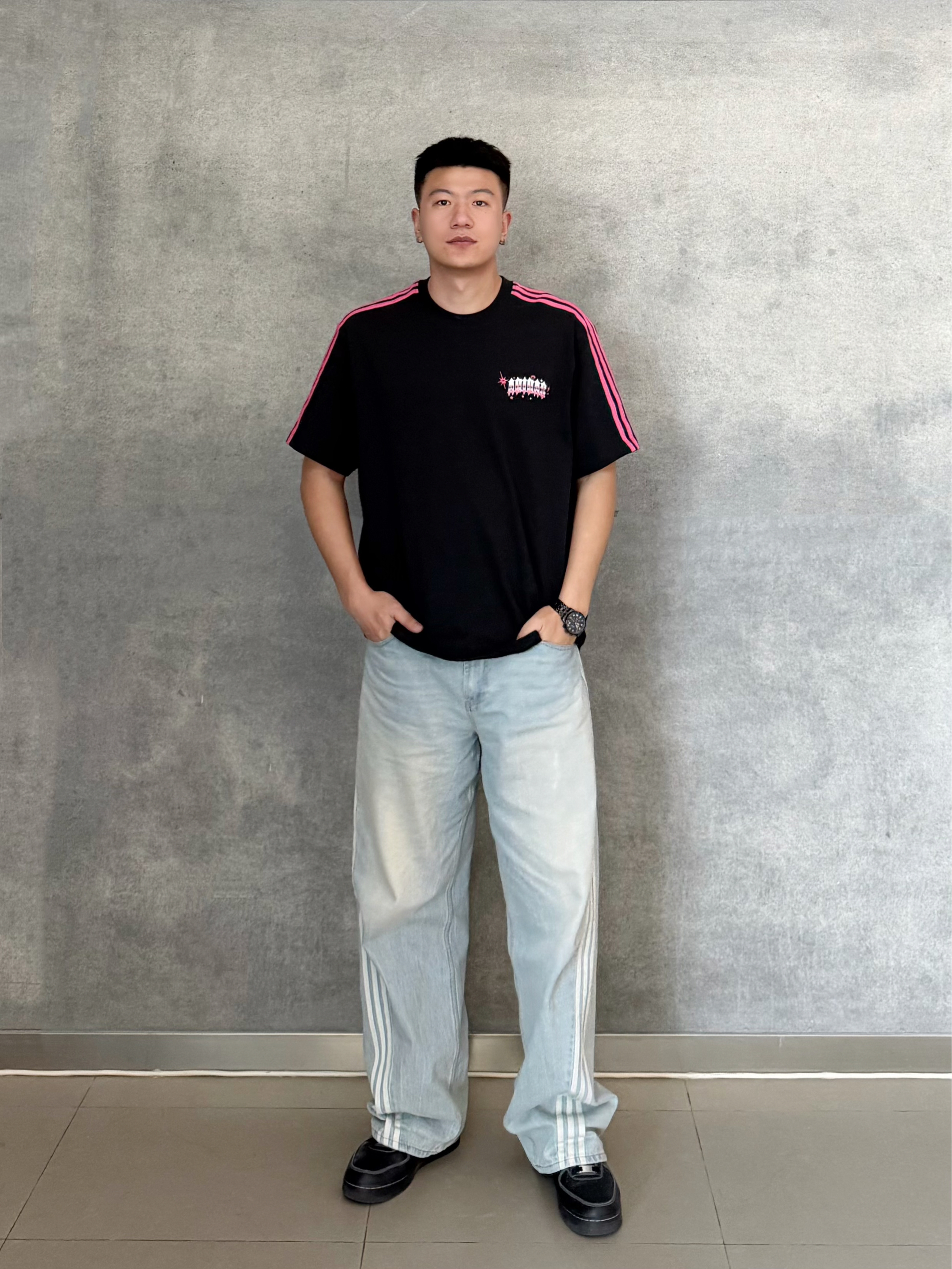 春天就是得穿点显眼的 这件Adidas限定黑粉T恤好酷😎 粉色logo➕背后大印花 黑粉配色廓形感 上身很显眼 下身穿条三叶草浅蓝牛仔裤 真的 长得帅不如穿的帅 这件真滴很酷 我的春季显眼单品✌🏻 👦🏻:188 | 85 👕:XXL 👖:36 你觉得这套适合周末出街还是校园穿搭呢~
