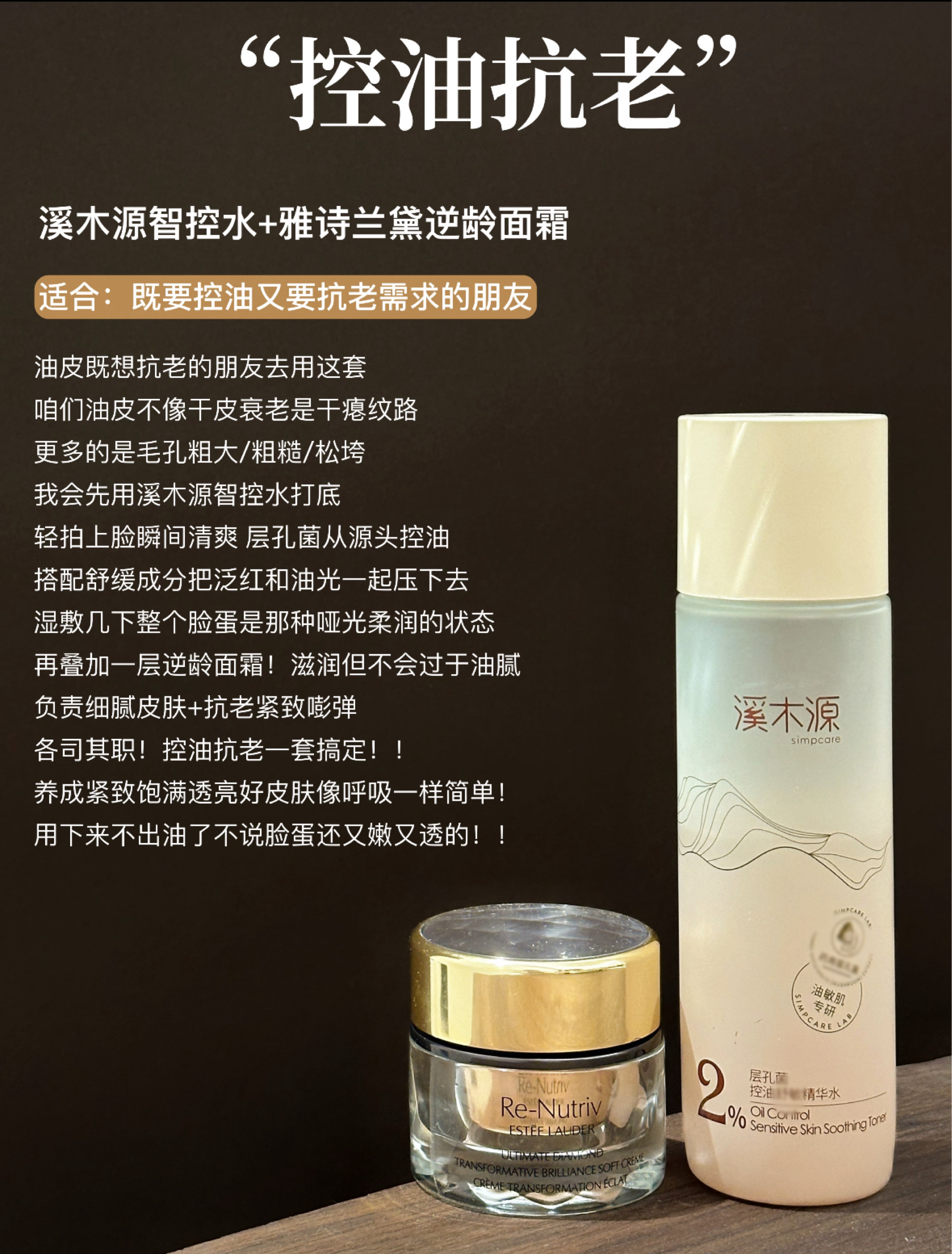 一、控油抗老组合:溪木源智控水 + 雅诗兰黛逆龄面霜 • 目标肤质/问题:适合有初老迹象(如毛孔粗大、皮肤松垮)的油皮/混油皮。不同于干皮抗老的“补油”,油皮抗老需先“控油”,避免营养过剩。 • 使用心法:洁面后,先用智控水轻拍或湿敷,它能瞬间收敛油光,让皮肤呈现哑光柔润的“洁净画布”。这一步骤显著减少了后续面霜的油腻负担。随后使用逆龄面霜,其滋养成分能更专注地作用于紧致嘭弹,实现“清爽抗老”...