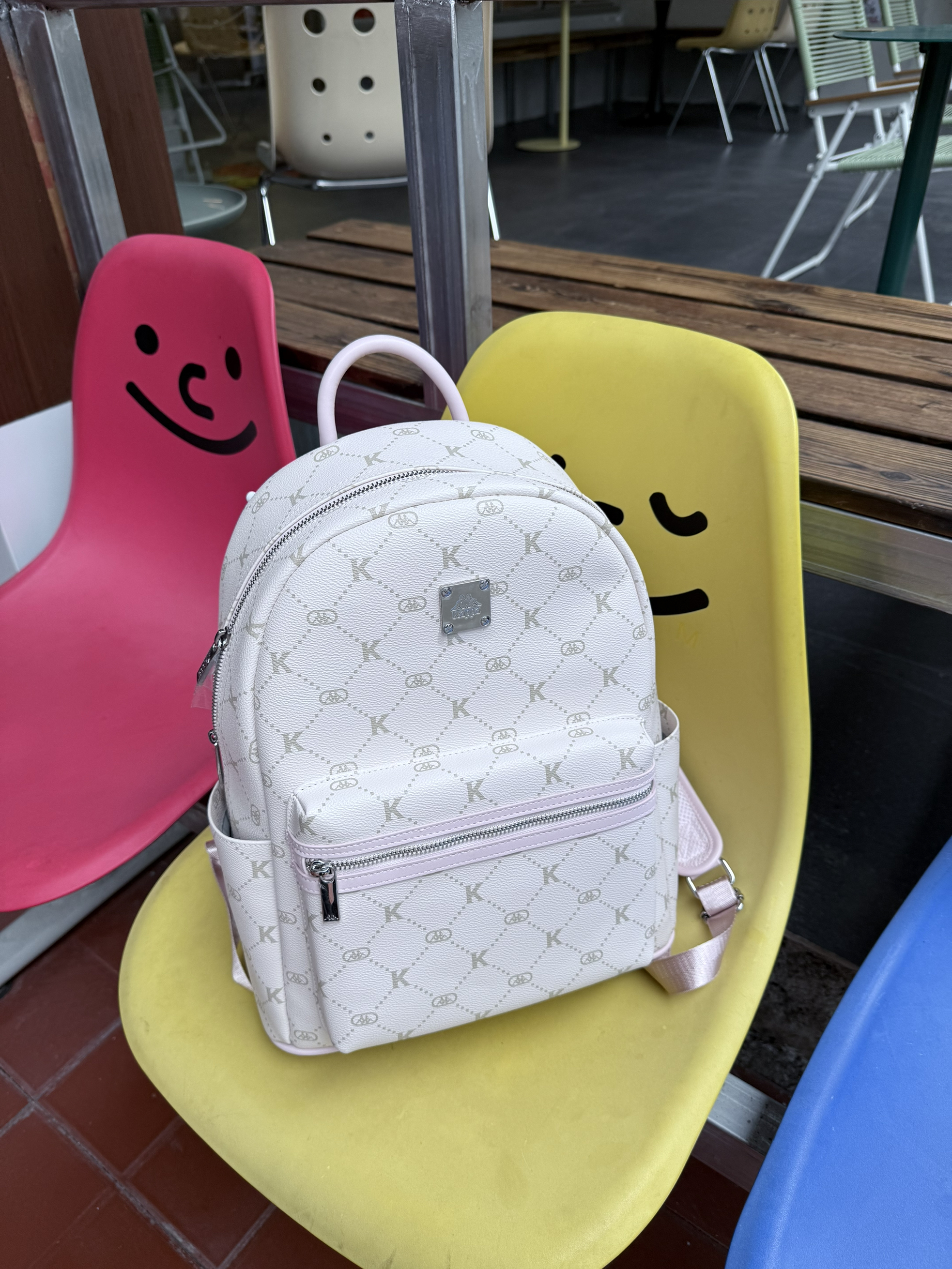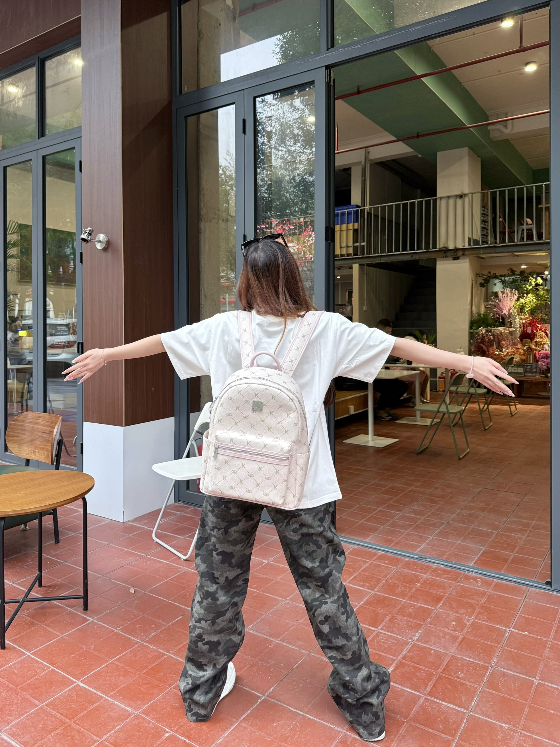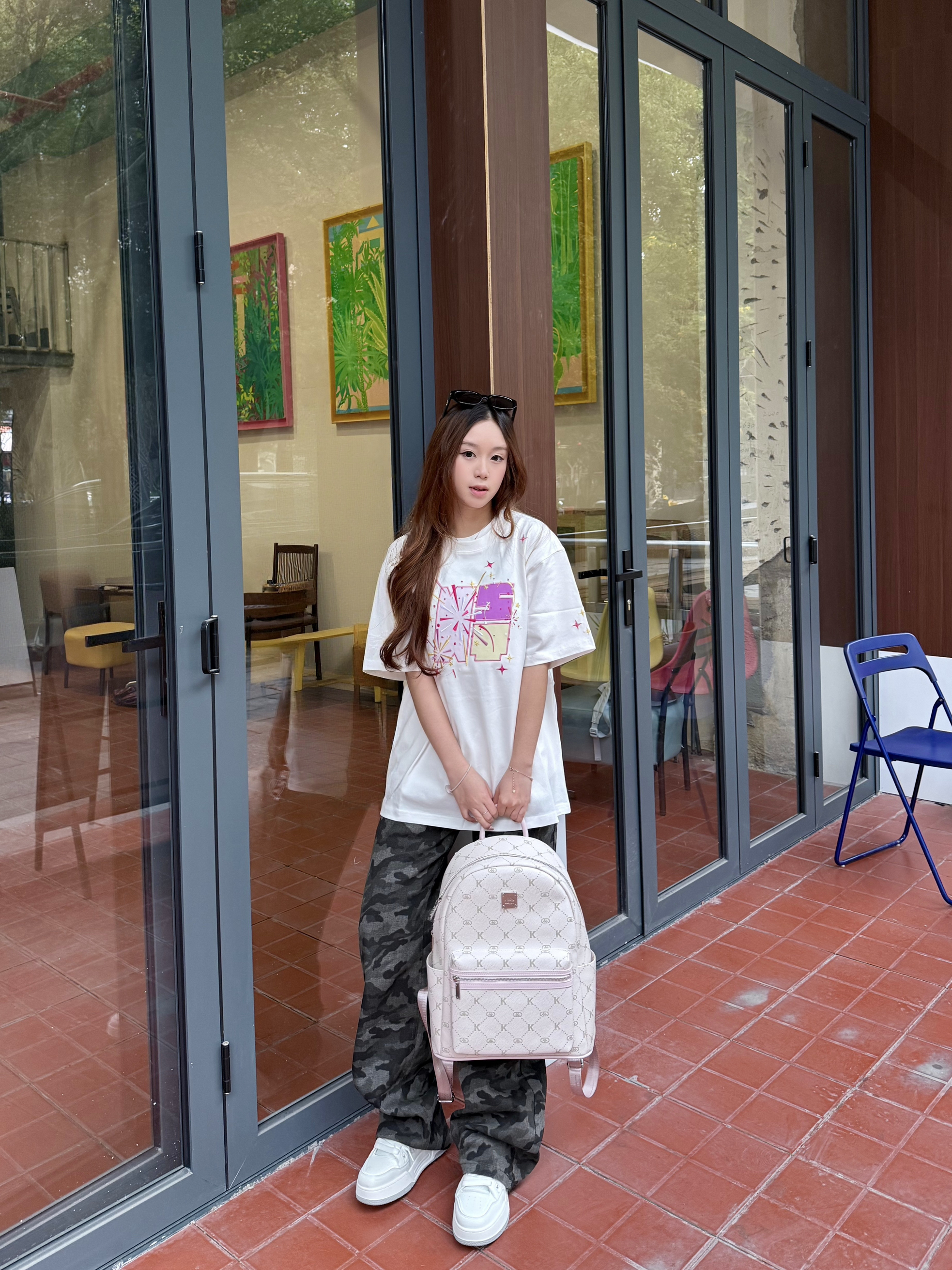 今天带来的是酷酷的粉色系look 上衣先来一件白t打底 裤子就穿深色迷彩👖 衣服上有粉色logo,所以我搭配了kappa这只淘气奶芙粉 大大的双肩包很能给我安全感🔐 包包是很硬挺的,也不容易塌 我拿来装ipad或者装点衣服都稳稳的