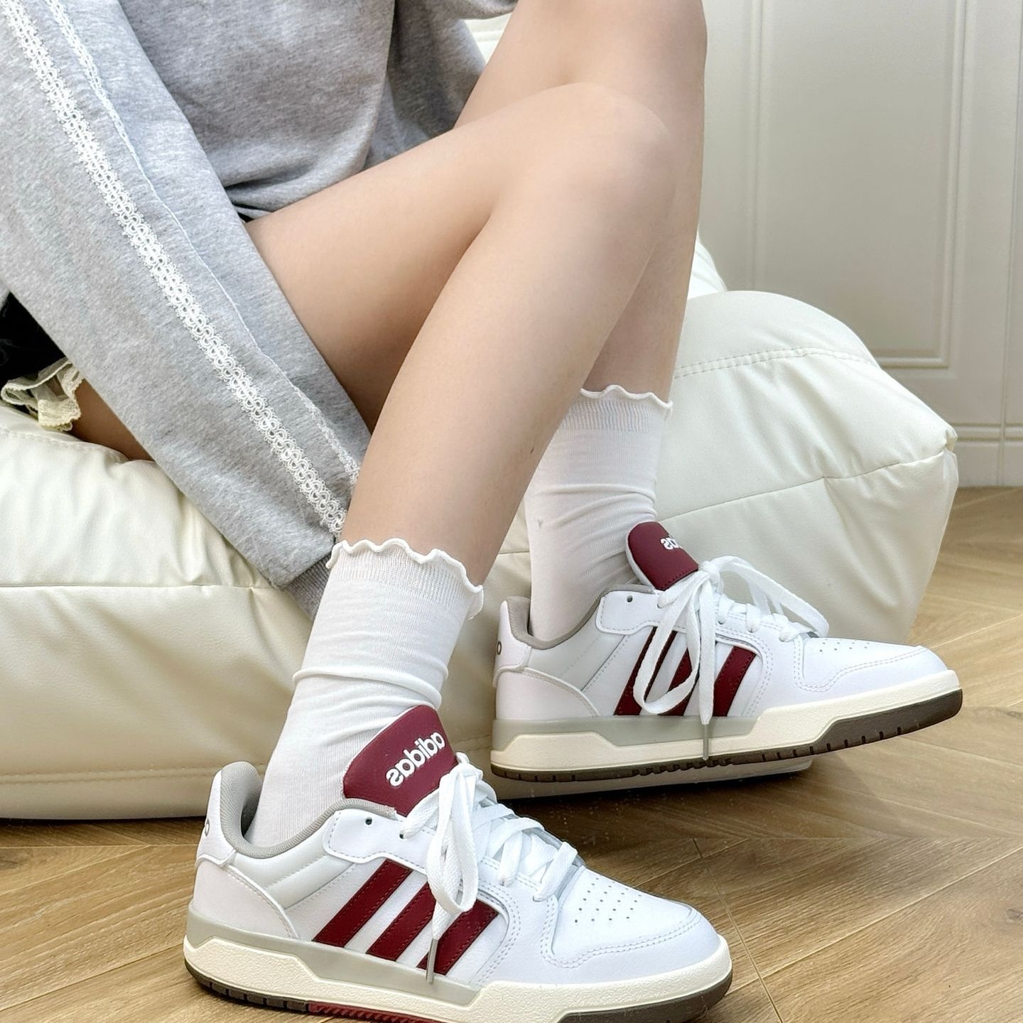 是让人眼前一亮的复古板鞋! 红白撞色显白又洋气~ 搭配蕾丝卫衣+短裤 同色系花边袜叠穿甜酷感 松弛感穿搭轻松拿捏