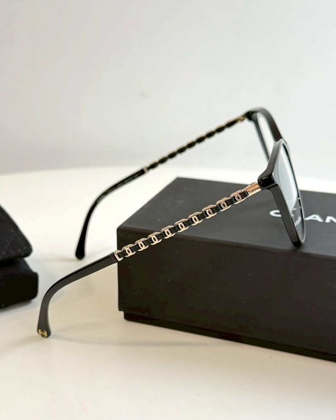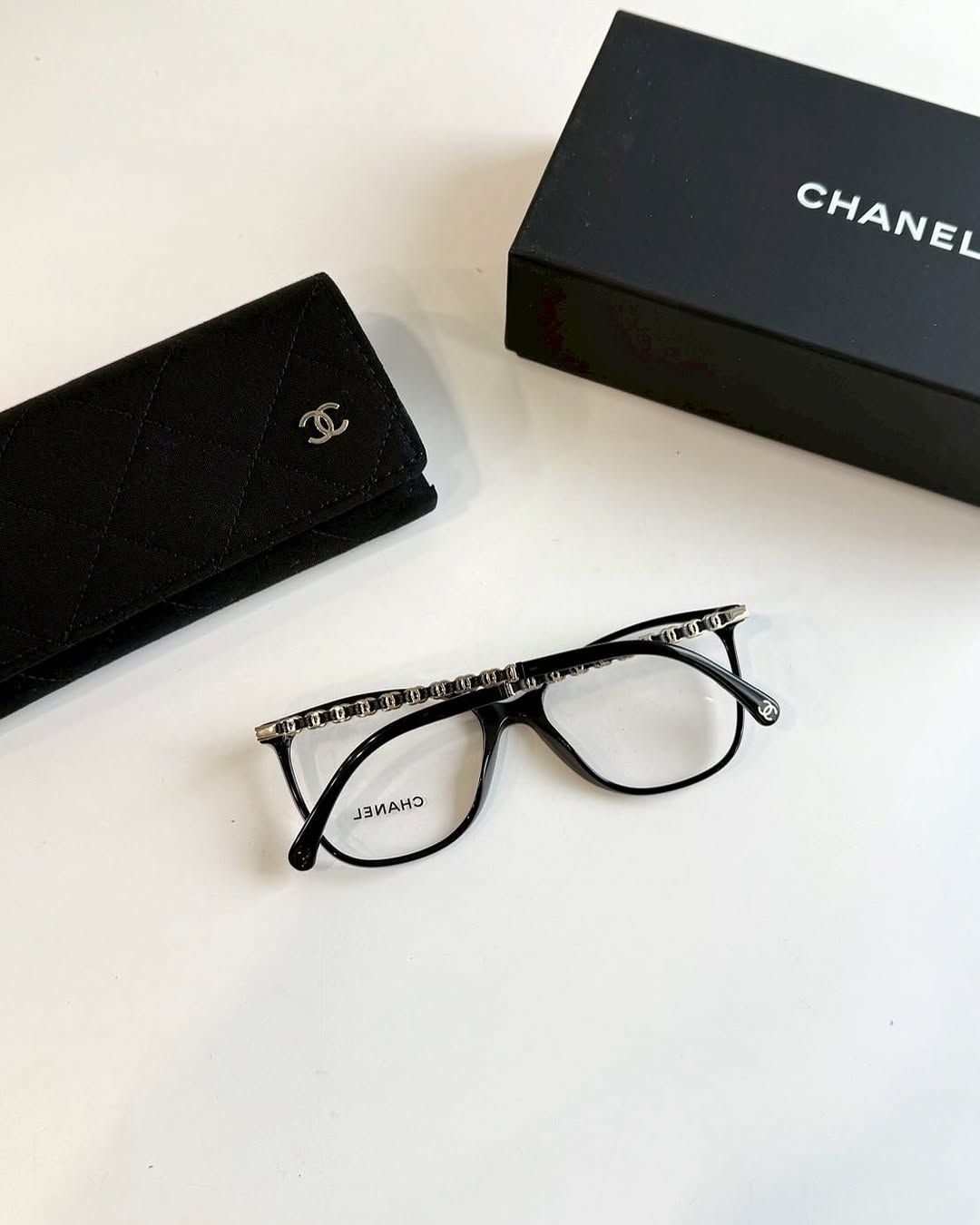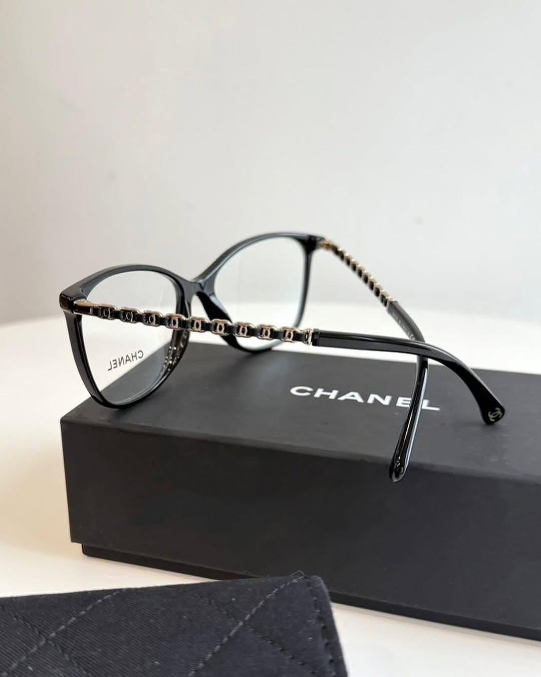 Chanel 平光眼鏡3408 鏡框是偏方形的设计 线条俐落有型 适合大多数臉型 最有特色的是它镜脚上的细节-﹣有經典的双 C logo 和金属鏈链条⛓元素帶有 Chanel 标志性的皮穿链風格就像他們家的包包一樣低調中带着细节感 戴起來很有质感、很耐看还可以拿到眼镜店依照自己的需求加配镜片或变色镜片