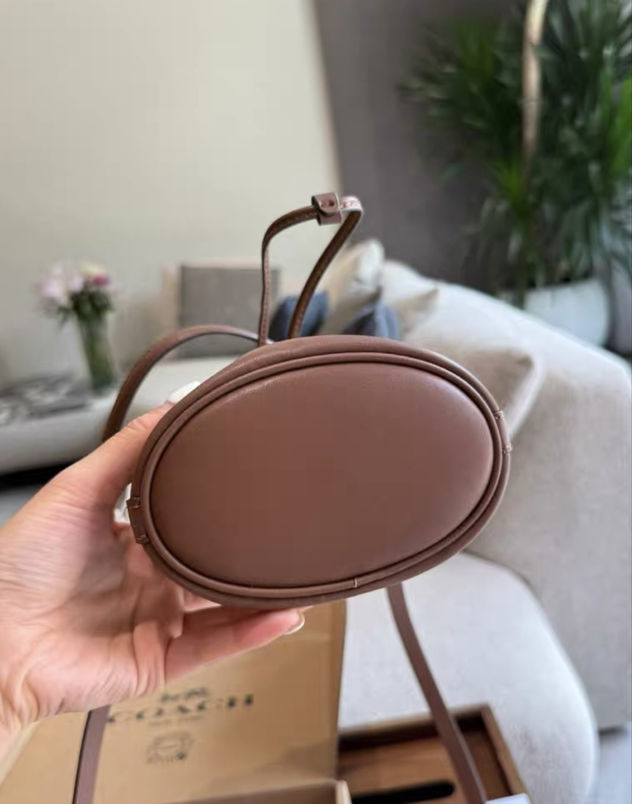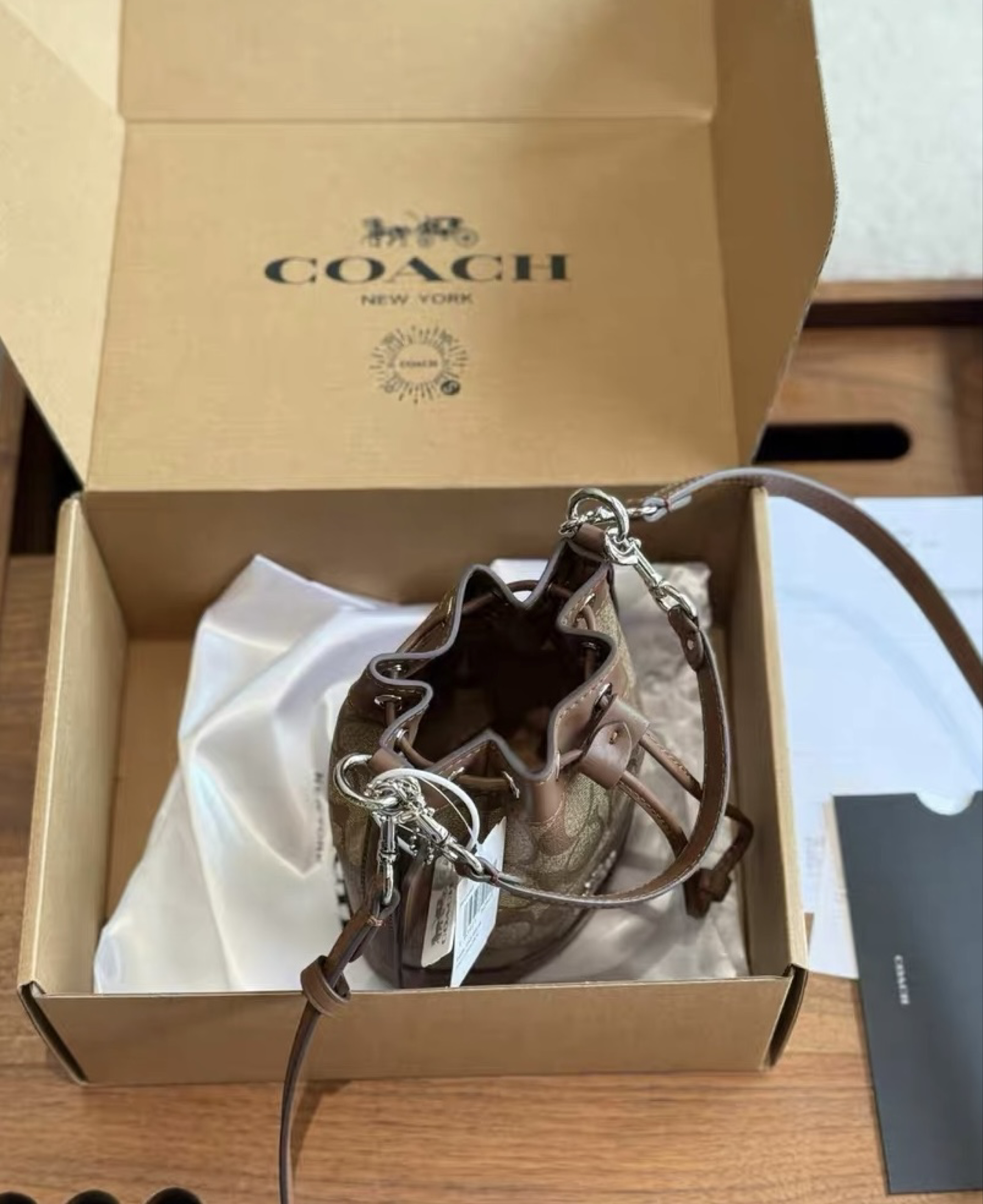 谁能拒绝一只巴掌大的COACH水桶包啊!🥹 本来只是路过专柜随便逛逛 结果一眼被这只Dempsey迷你戳中 经典老花拼深棕皮 抽绳一拉就有那味儿了 拎在手里像个可爱的小福袋 通勤约会都能搭 别看它小 容量真的很争气 口红、粉饼、AirPods、车钥匙全能塞下 斜挎解放双手 手拎又秒变温柔大小姐 连我妈都夸“这包买得太会了” 五金亮得晃眼 走线也工整 几百块入的轻奢感直接拉满 现在出门不带它都觉...