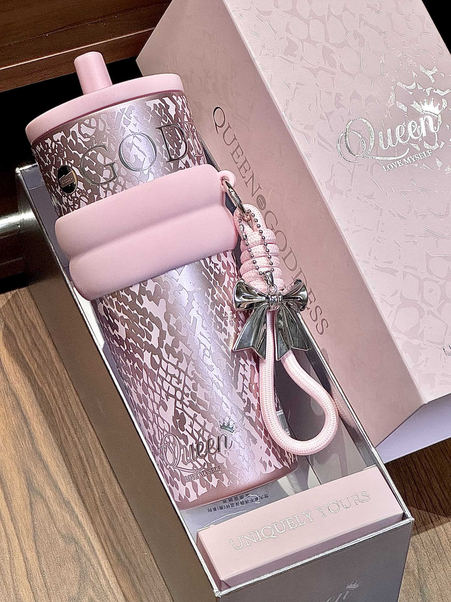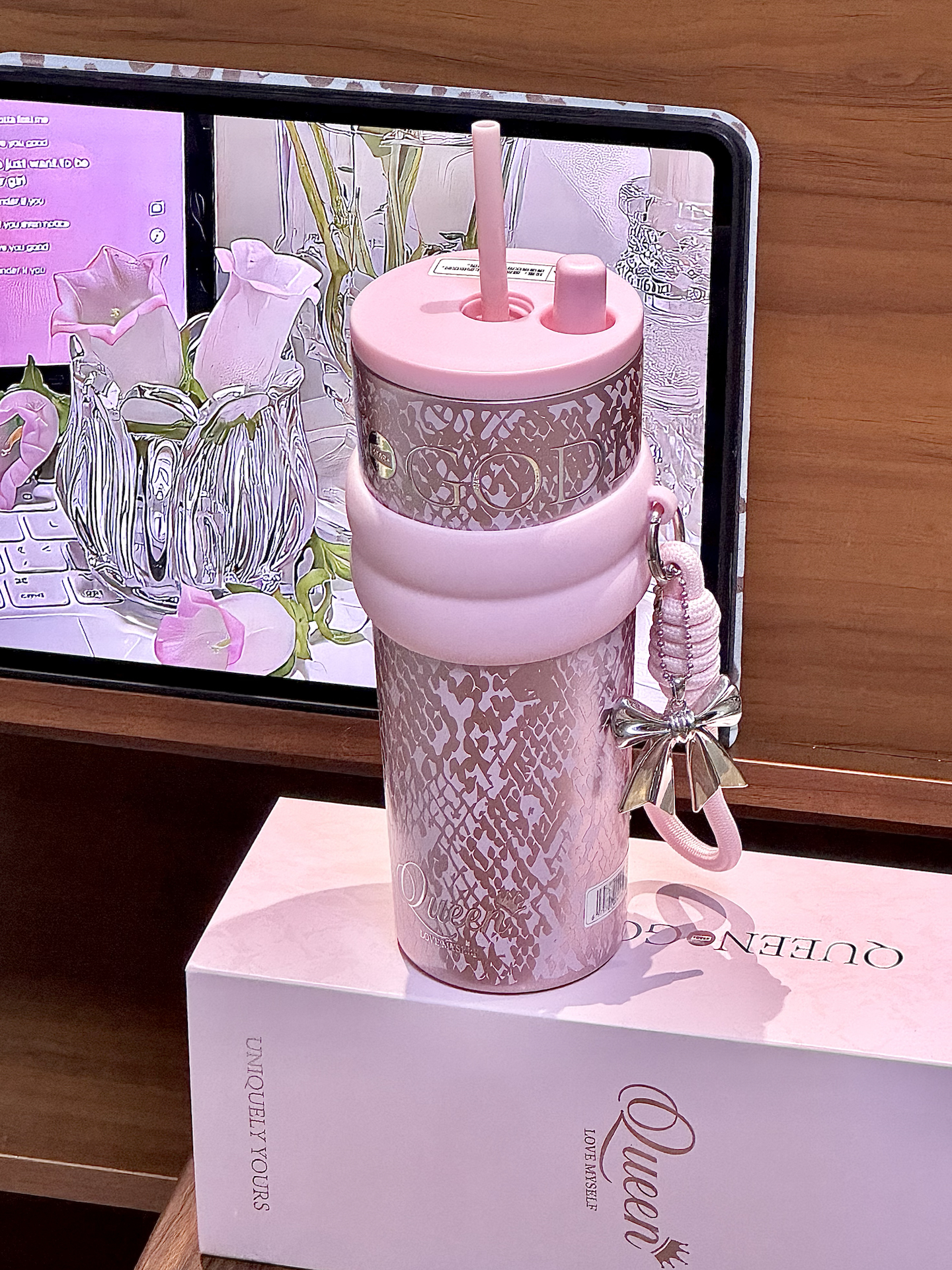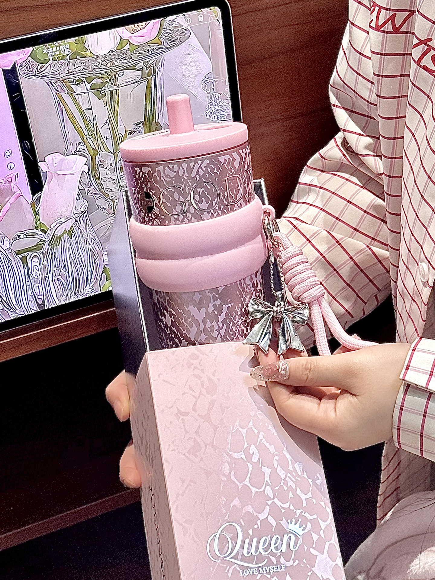 春天尊嘟和粉色吼配呀 来康康我滴喝水新搭子 系世大家的介个极光女神杯 搭配的蝴蝶结手拎绳配饰也挺点睛 710ml的大容量够我喝大半天的 还是覆陶瓷内胆的用着也安心 每天带出门也吼方便內 礼盒包装也hin精致,我感觉用来送人也敲不戳捏