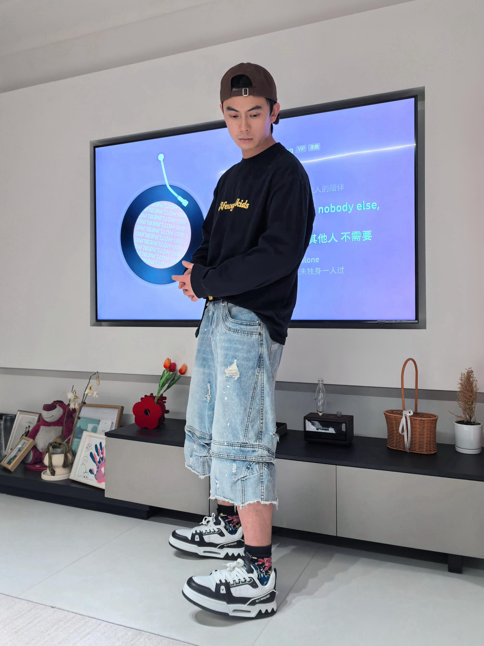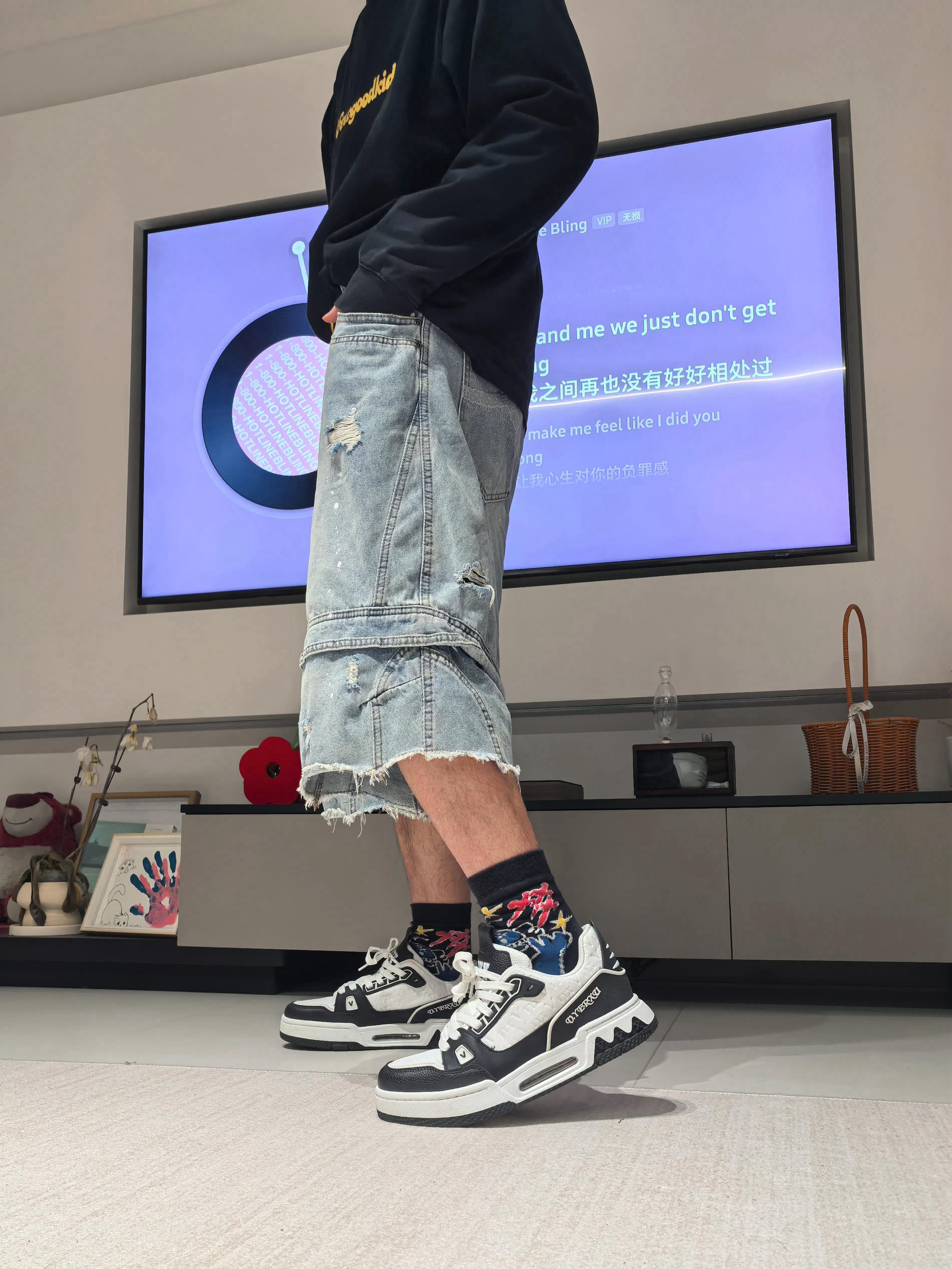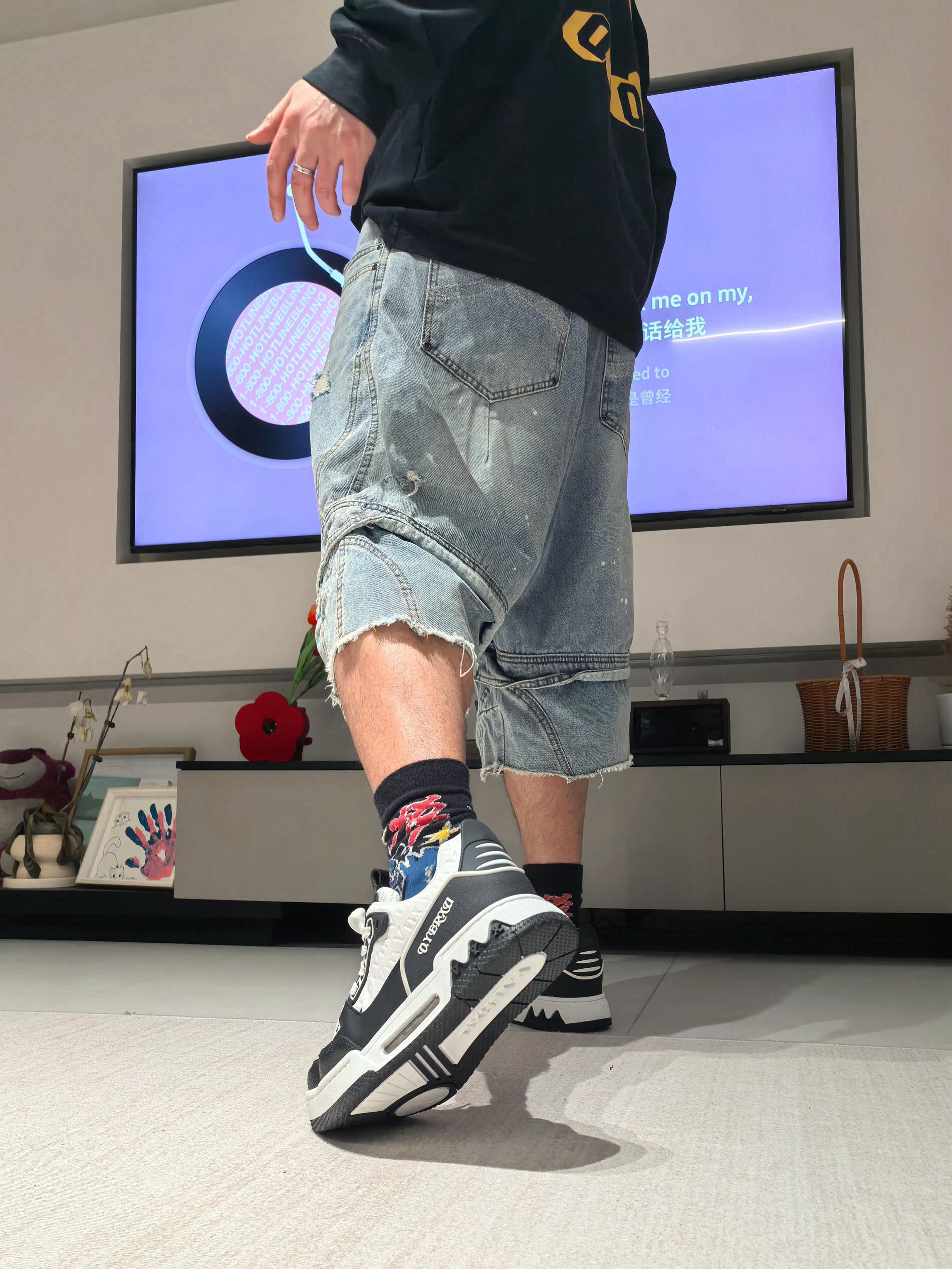 南方的我已经穿上短裤了 ☀️但是搭配这种5分裤,腿短确实不太友好,于是一双增高的休闲Trainer上脚后,确实就没那么别扭了 黑白经典熊猫色,各类型风格都能搭上 🏃适合不冷不热天气,虽然是厚底,但上脚给我的感受比较软弹舒适的 🏍️搭配一件纯黑长T,浅蓝牛仔,袜子用了一些彩色点缀,整体风格虽然基础,但是也有清爽感