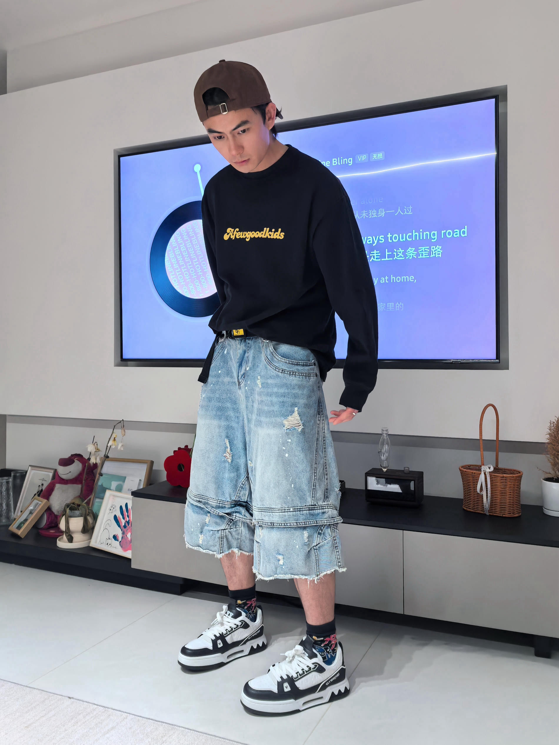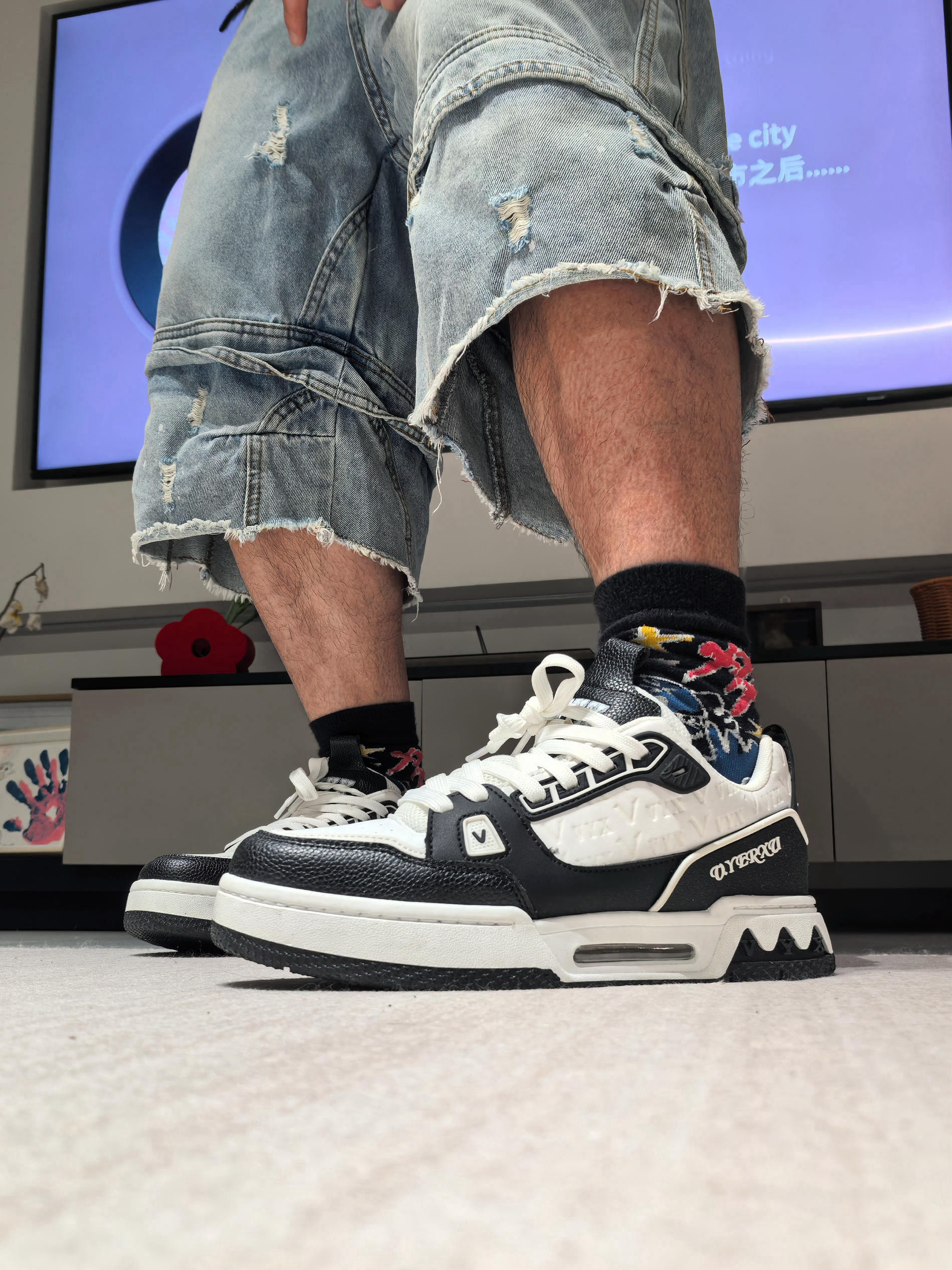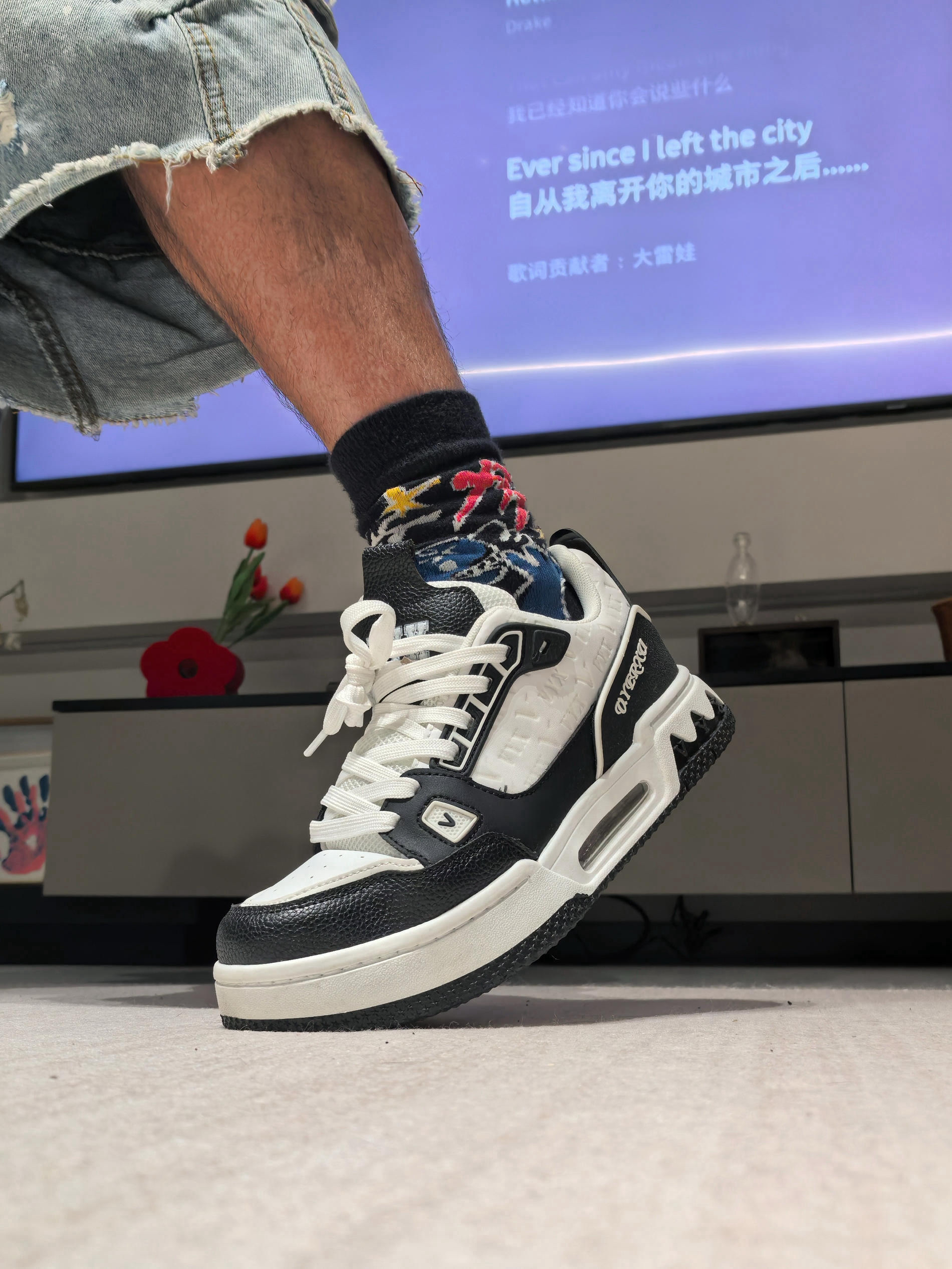 南方的我已经穿上短裤了 ☀️但是搭配这种5分裤,腿短确实不太友好,于是一双增高的休闲Trainer上脚后,确实就没那么别扭了 黑白经典熊猫色,各类型风格都能搭上 🏃适合不冷不热天气,虽然是厚底,但上脚给我的感受比较软弹舒适的 🏍️搭配一件纯黑长T,浅蓝牛仔,袜子用了一些彩色点缀,整体风格虽然基础,但是也有清爽感