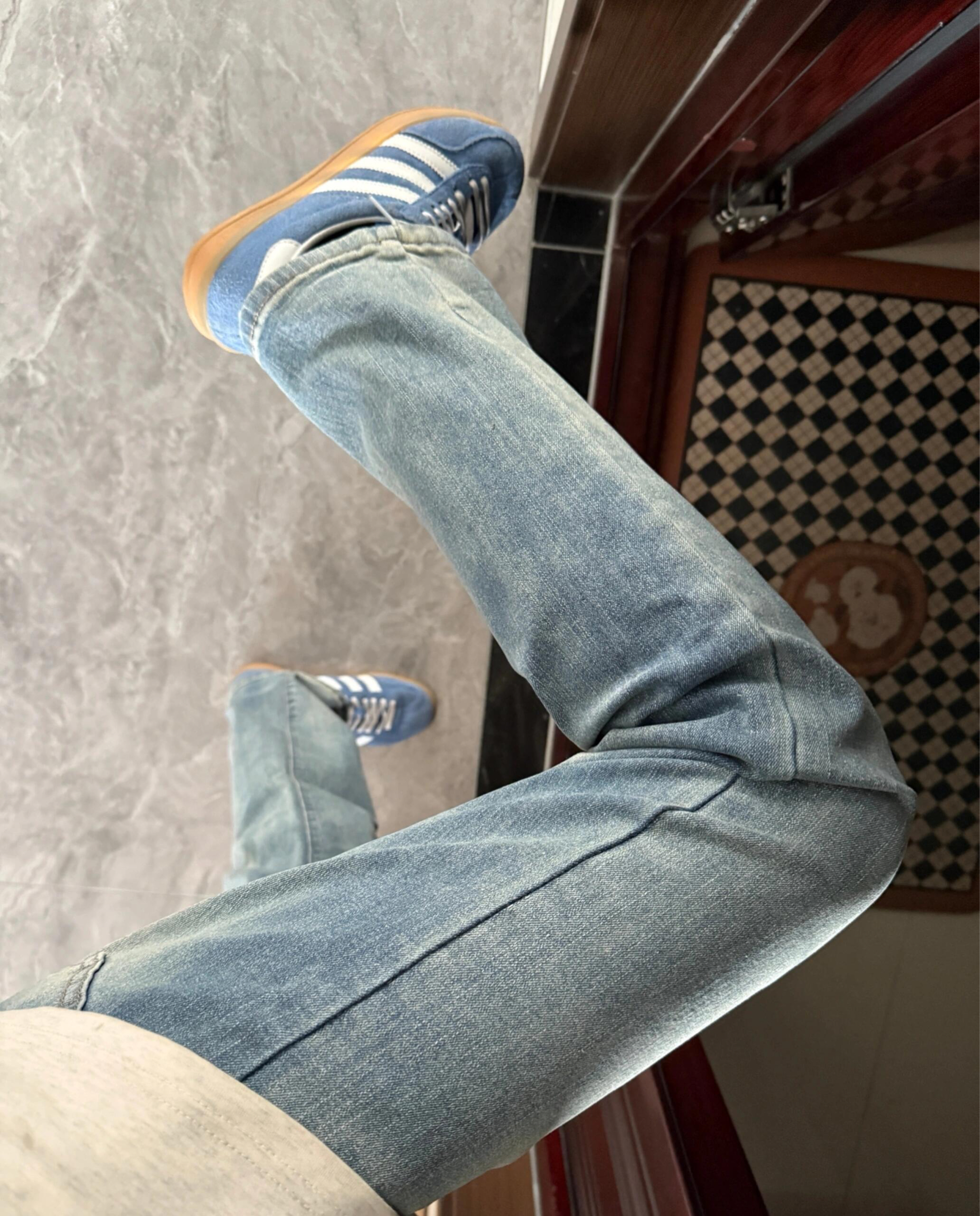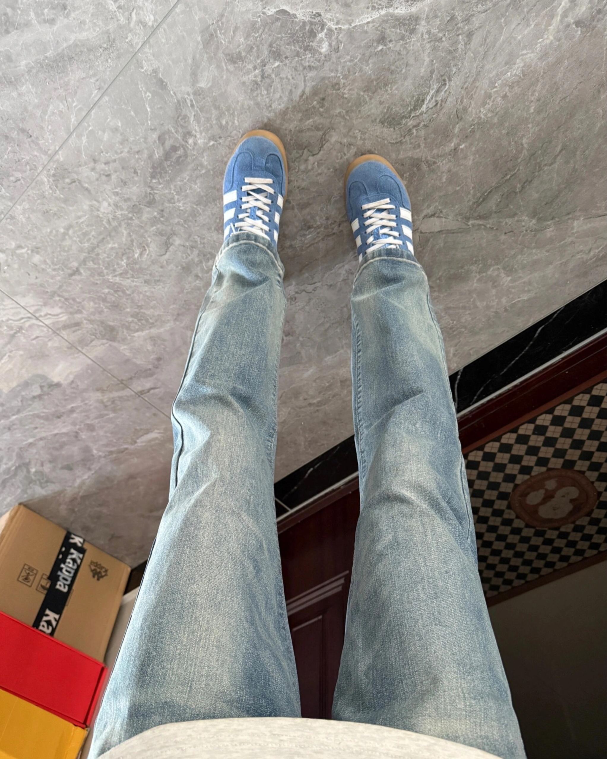好喜欢这种简单干净版型的裤子Q,基础显瘦的版型上身干净利落很显腿长,水洗布料质感满满,搭配蓝色德训鞋简单又帅气,好喜欢这种风格~