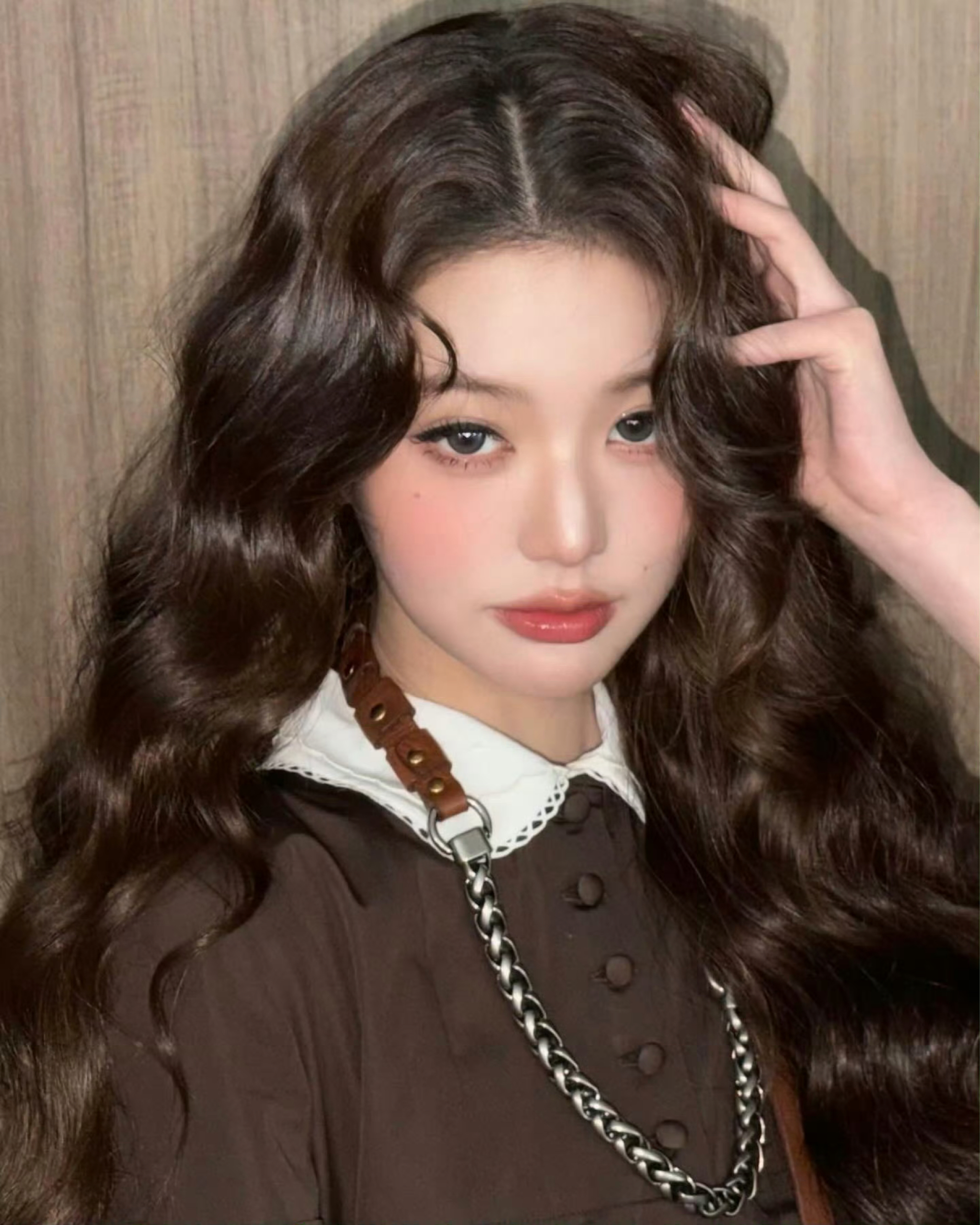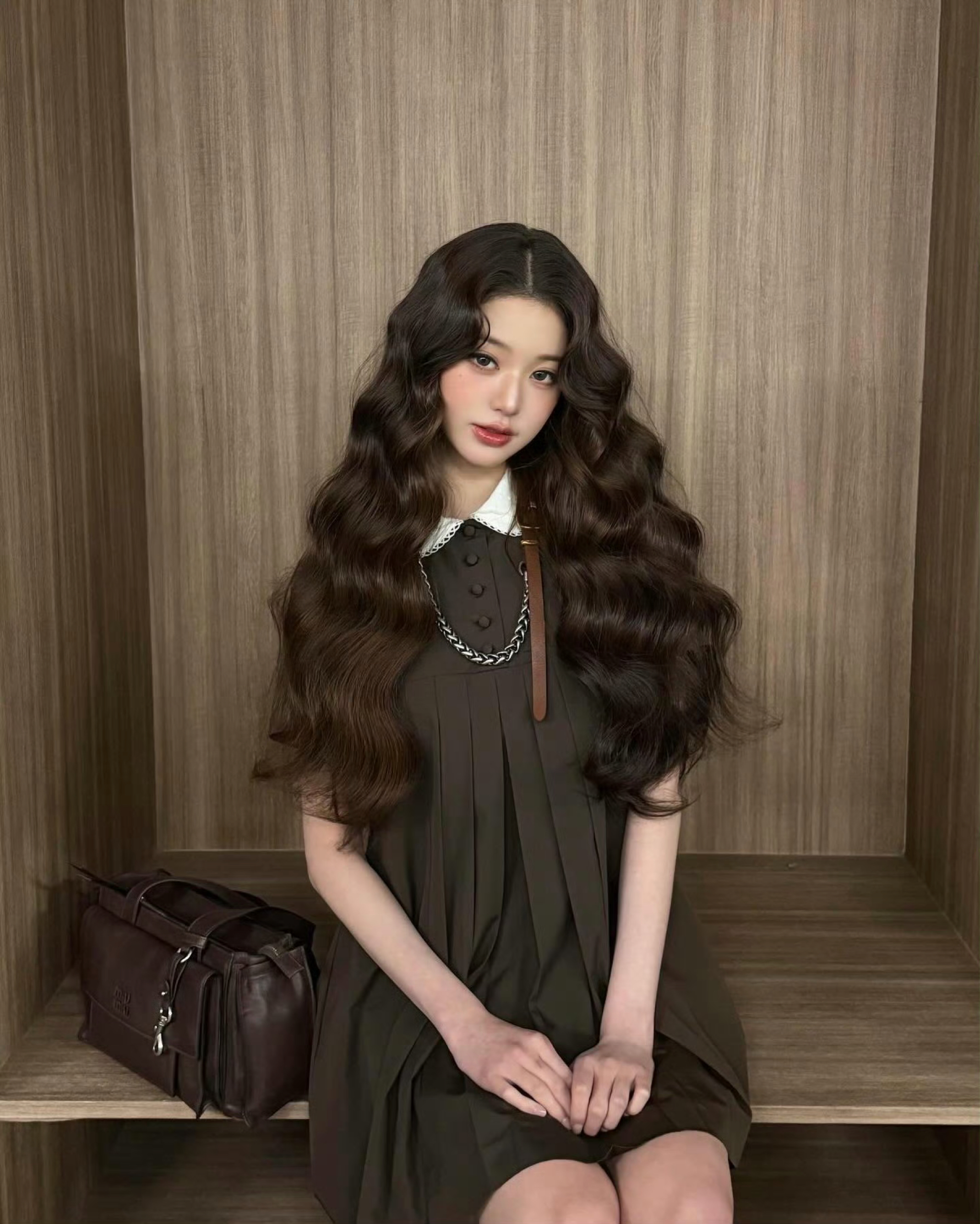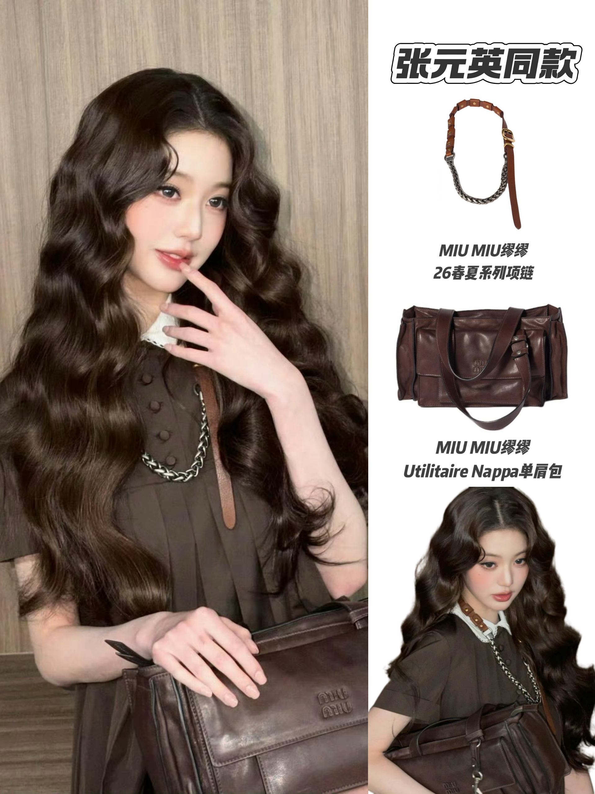 这套张元英同款穿搭太有复古千金感了✨ 深棕百褶裙搭配白色娃娃领,温柔又减龄。重点是MIU MIU的配饰太加分:皮革拼接链条项链叠戴在领口,硬朗金属中和了裙装的柔美,随性又精致; 同色系做旧单肩包呼应整体色调,慵懒随性的托特版型,让整套look更显松弛高级,氛围感直接拉满。