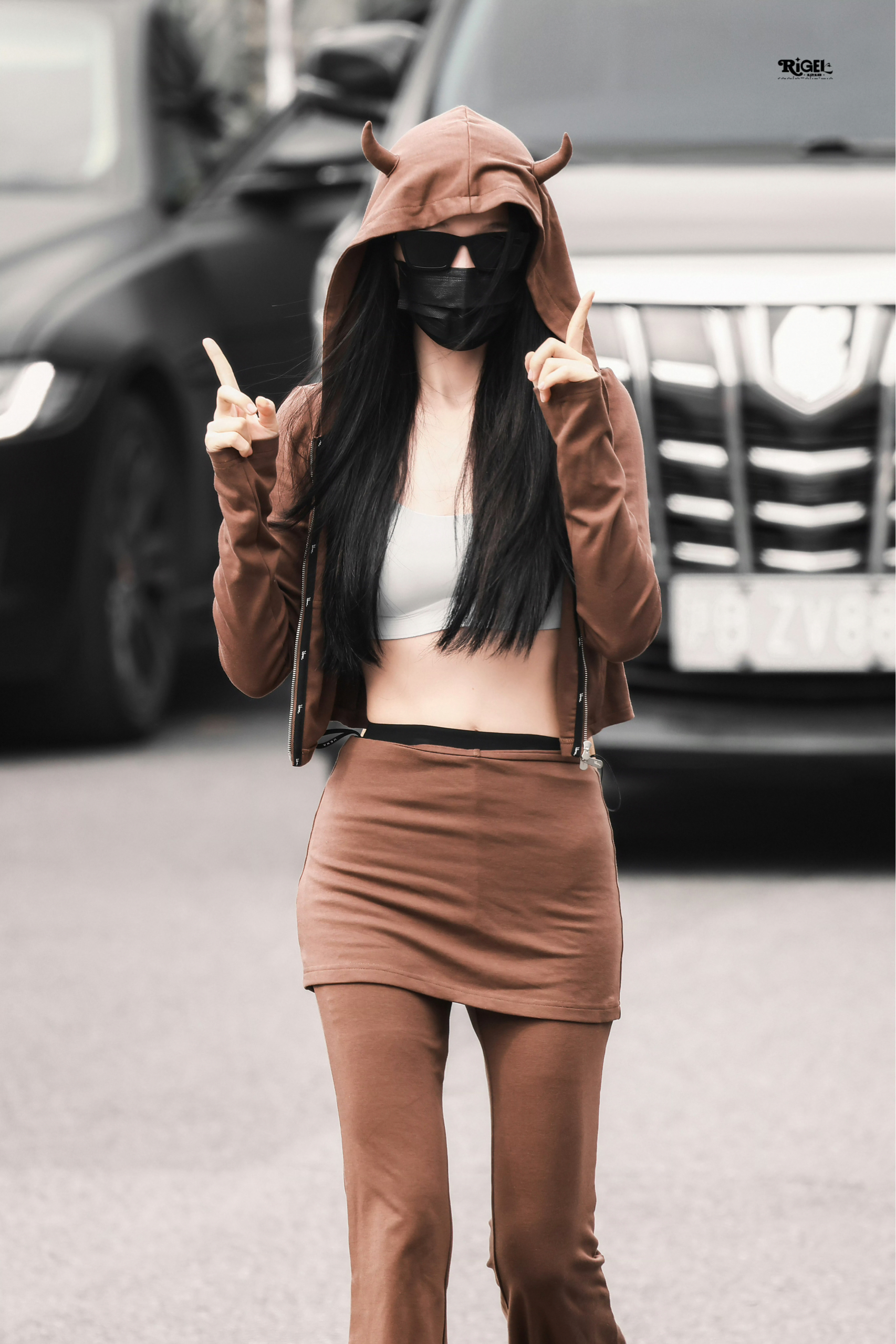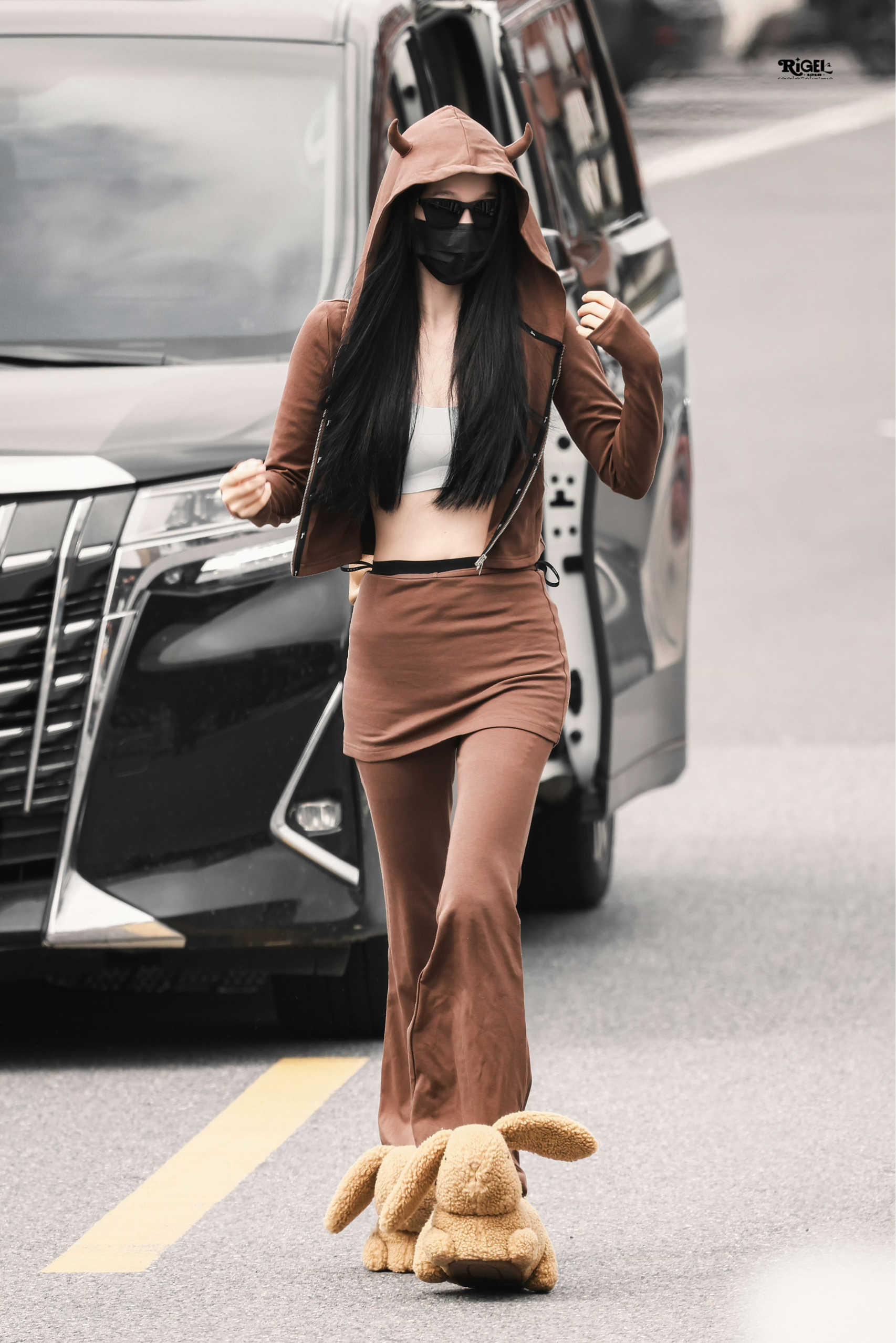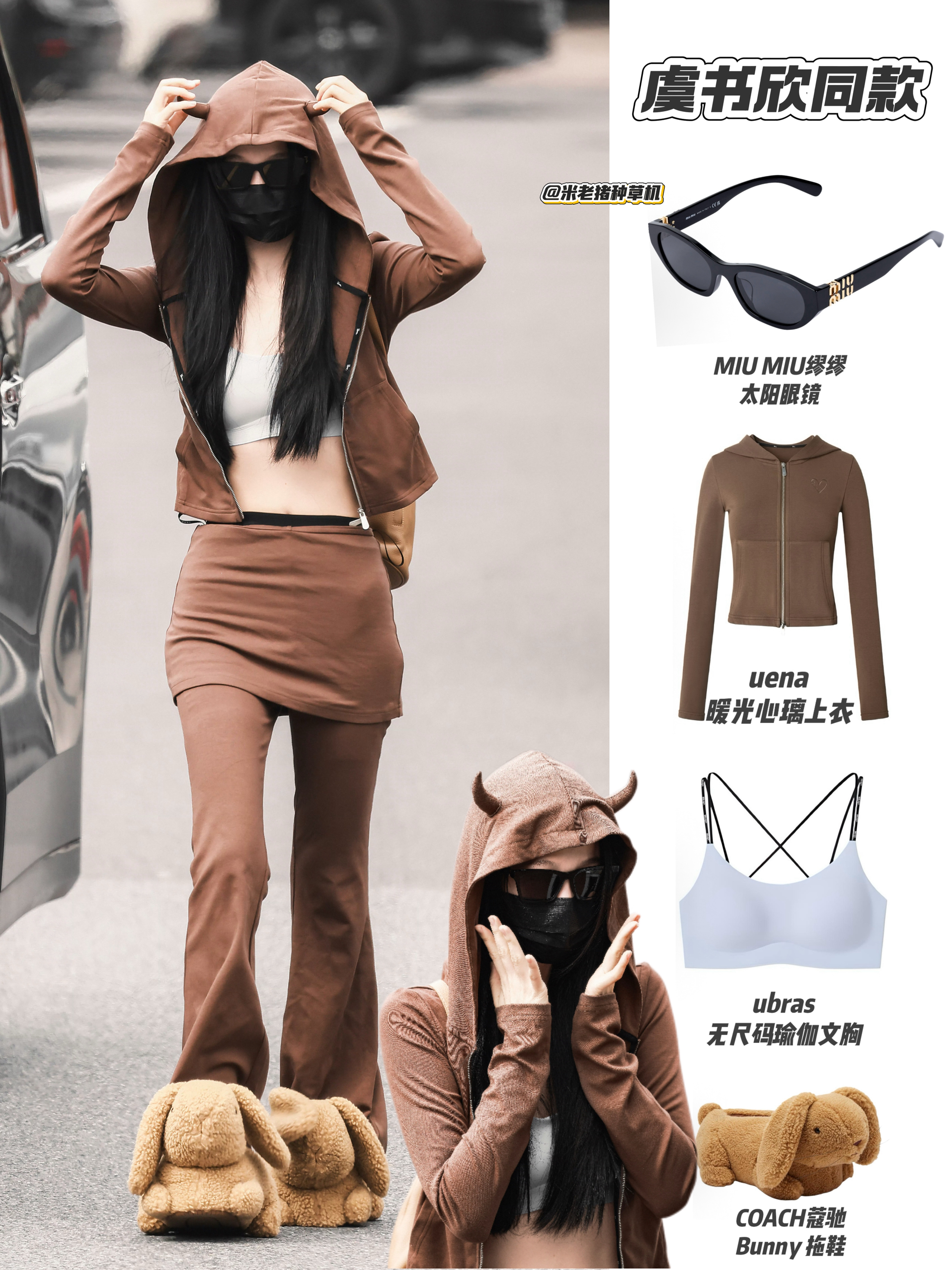 虞书欣路透这套穿搭把甜酷休闲感拿捏得恰到好处✨ 暖棕牛角连帽上衣自带软萌氛围,叠穿浅灰运动内衣,小露腰腹又显活力。同色系裙裤叠穿,拉长腿部线条,慵懒又随性。 MIU MIU墨镜增添酷感,COACH毛绒兔子拖鞋更是点睛之笔,软fufu的可爱感中和了休闲感,整套look甜酷平衡,日常出街超吸睛。