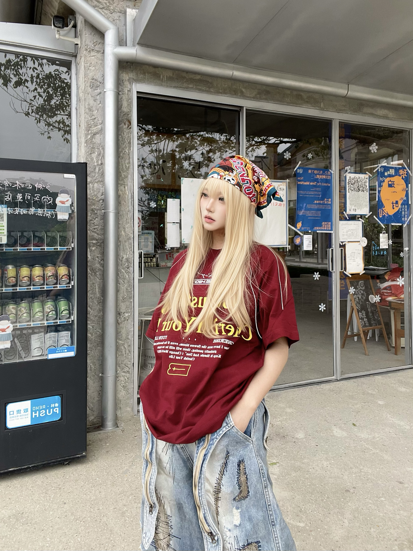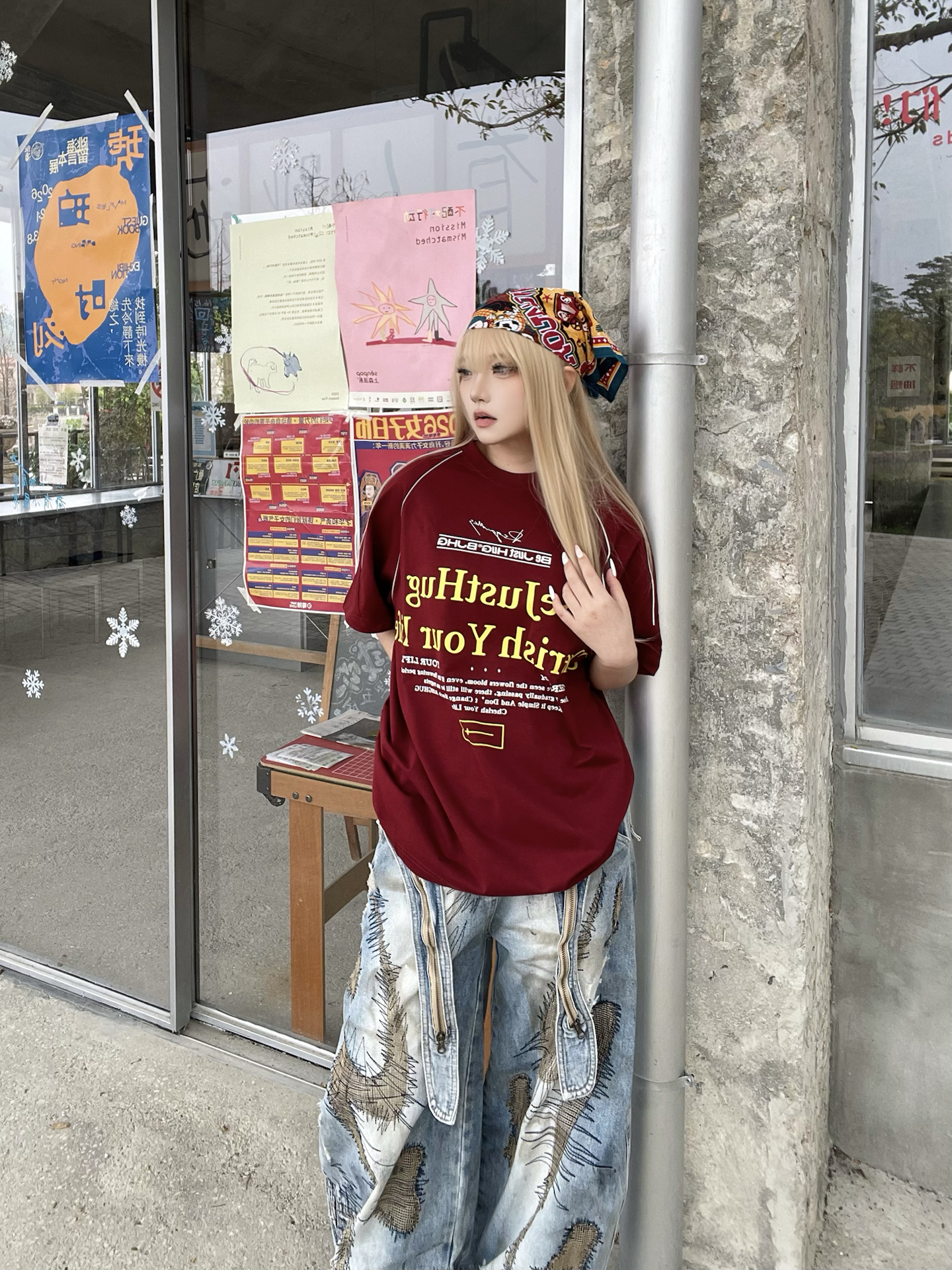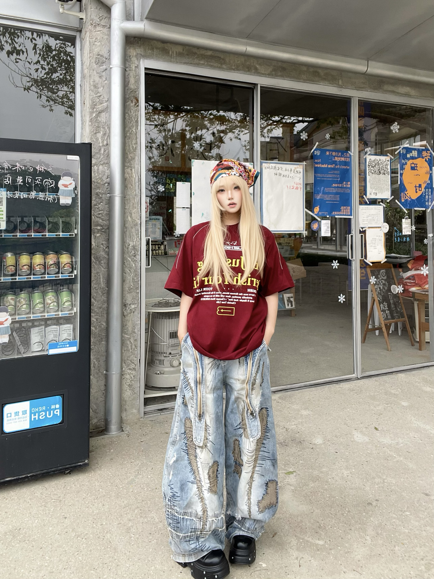 🗣️今日份穿搭分享来啦! 长得帅不如穿得帅-潮人春季单品✅:BJHG美式印花T恤➕做旧弯刀裤,酒红色高级又显白,上身自带复古氛围~ 版型也很oversize哦,舒适度蛮高的,轻松get美式复古感📸 #潮人的春天来了 #早八无脑穿搭 #BJHG谁穿谁好看 #潮流穿搭还得看BJHG #开学一周OOTD