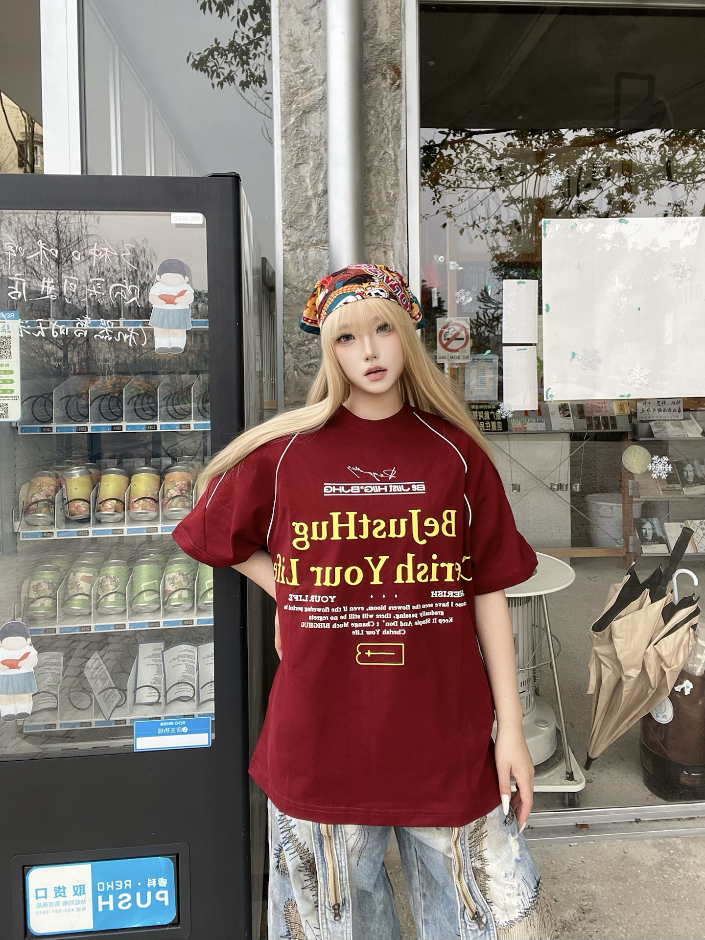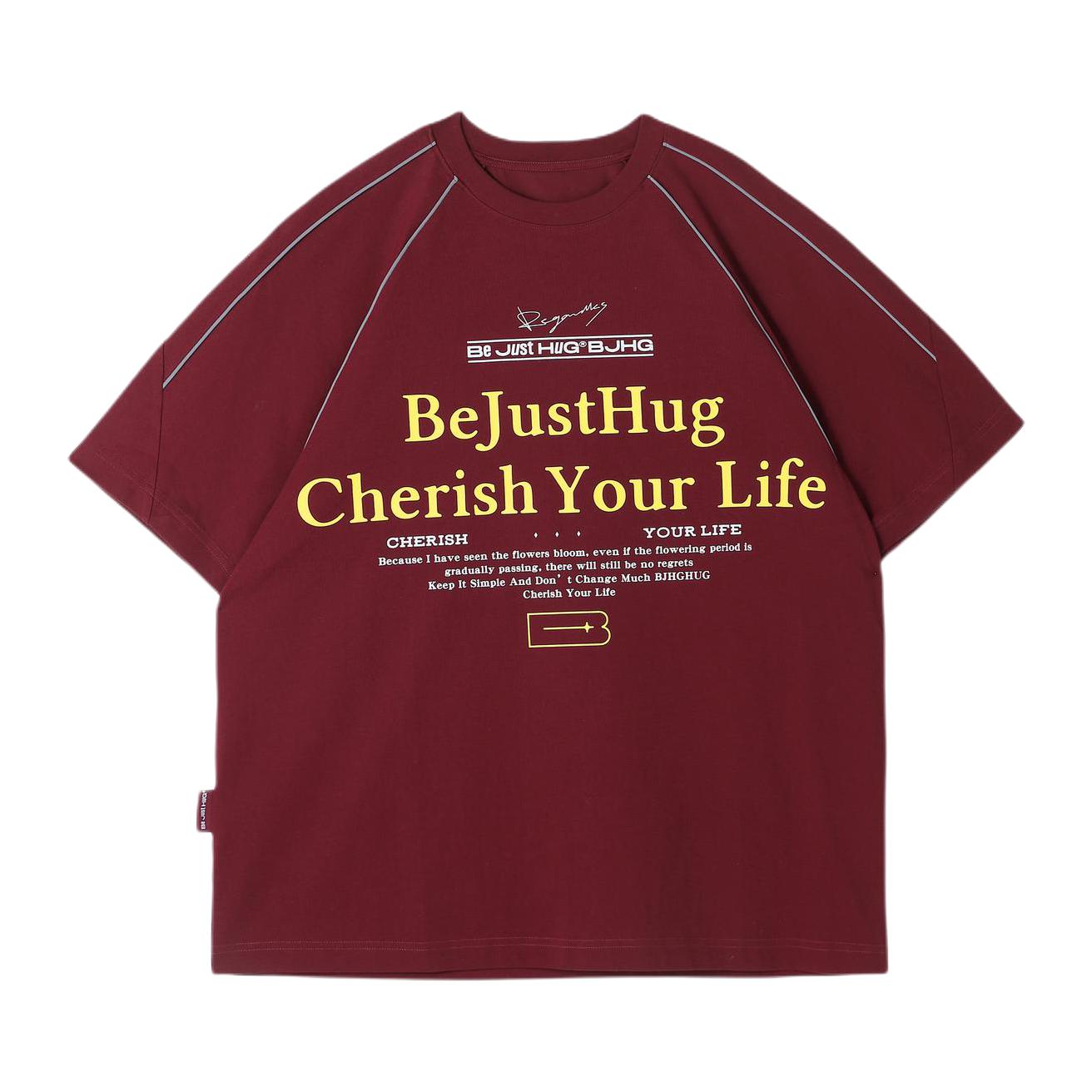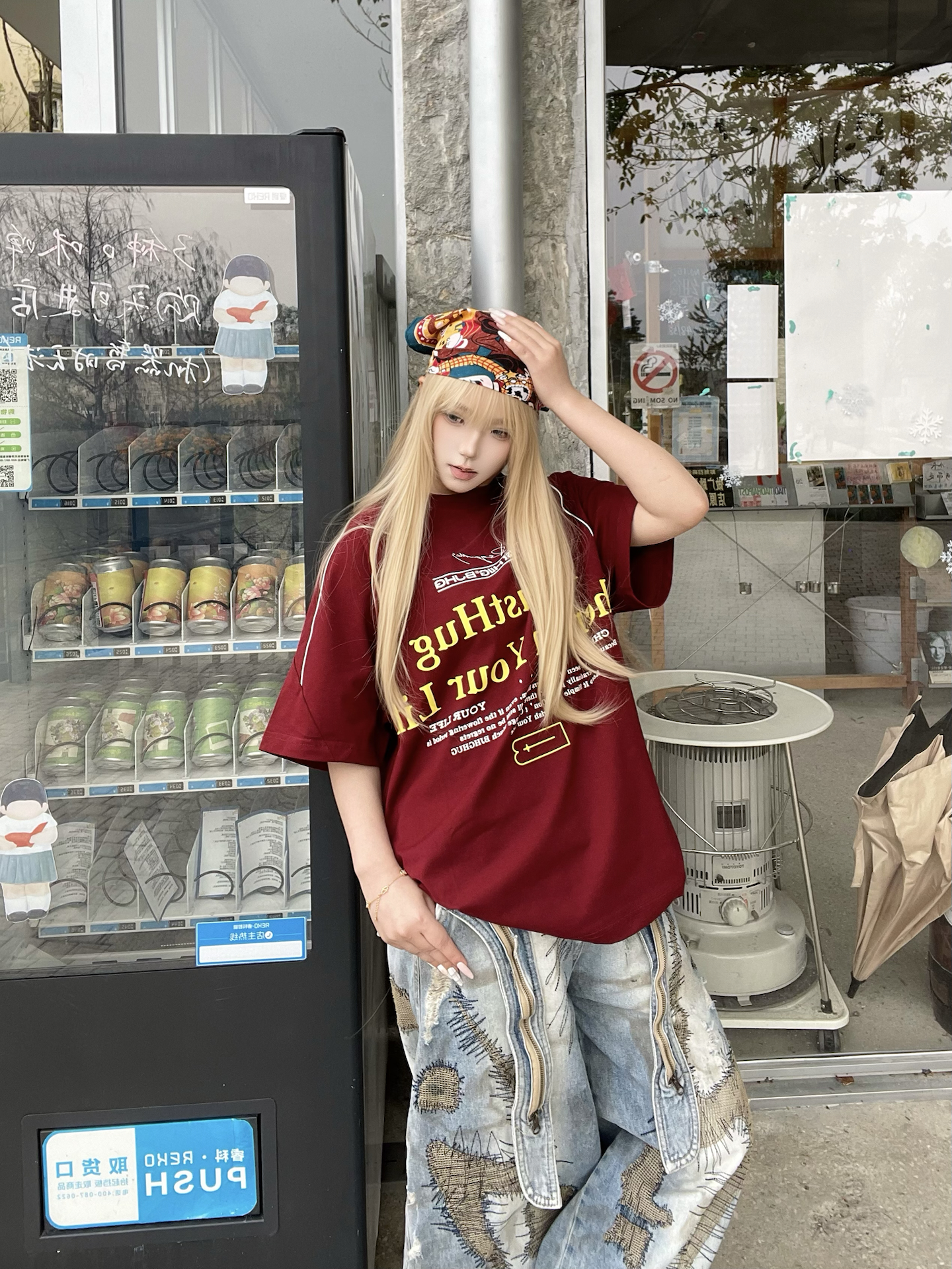 🗣️今日份穿搭分享来啦! 长得帅不如穿得帅-潮人春季单品✅:BJHG美式印花T恤➕做旧弯刀裤,酒红色高级又显白,上身自带复古氛围~ 版型也很oversize哦,舒适度蛮高的,轻松get美式复古感📸 #潮人的春天来了 #早八无脑穿搭 #BJHG谁穿谁好看 #潮流穿搭还得看BJHG #开学一周OOTD