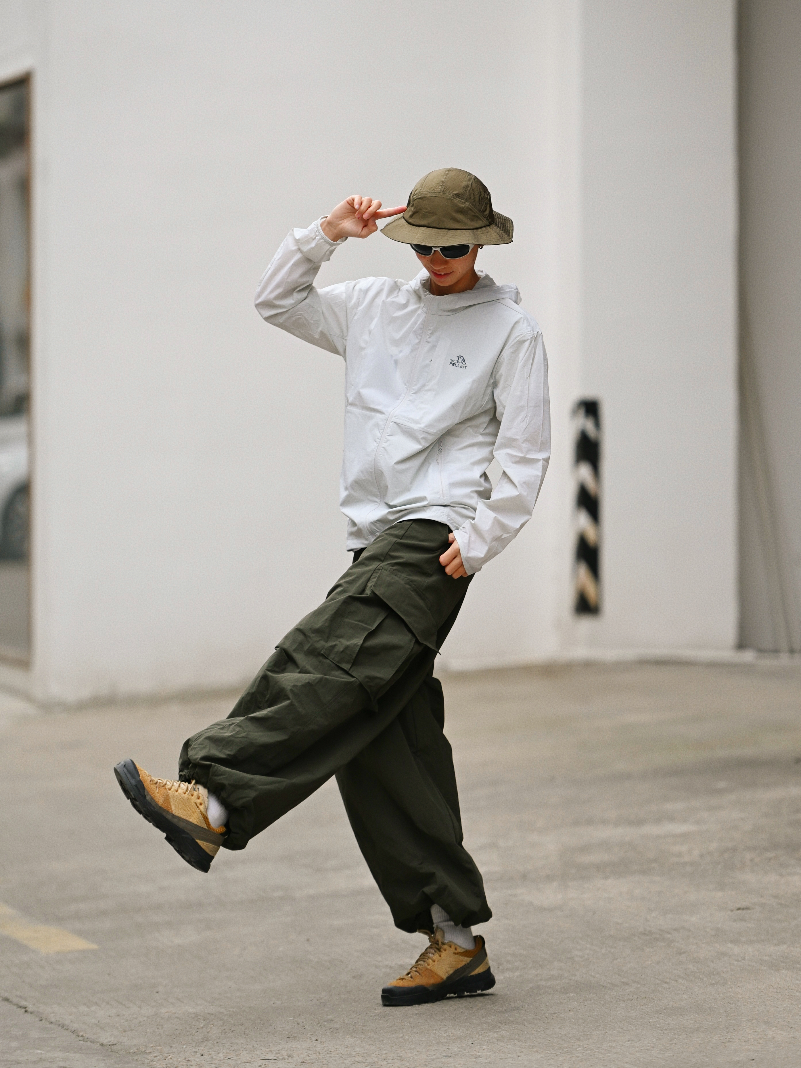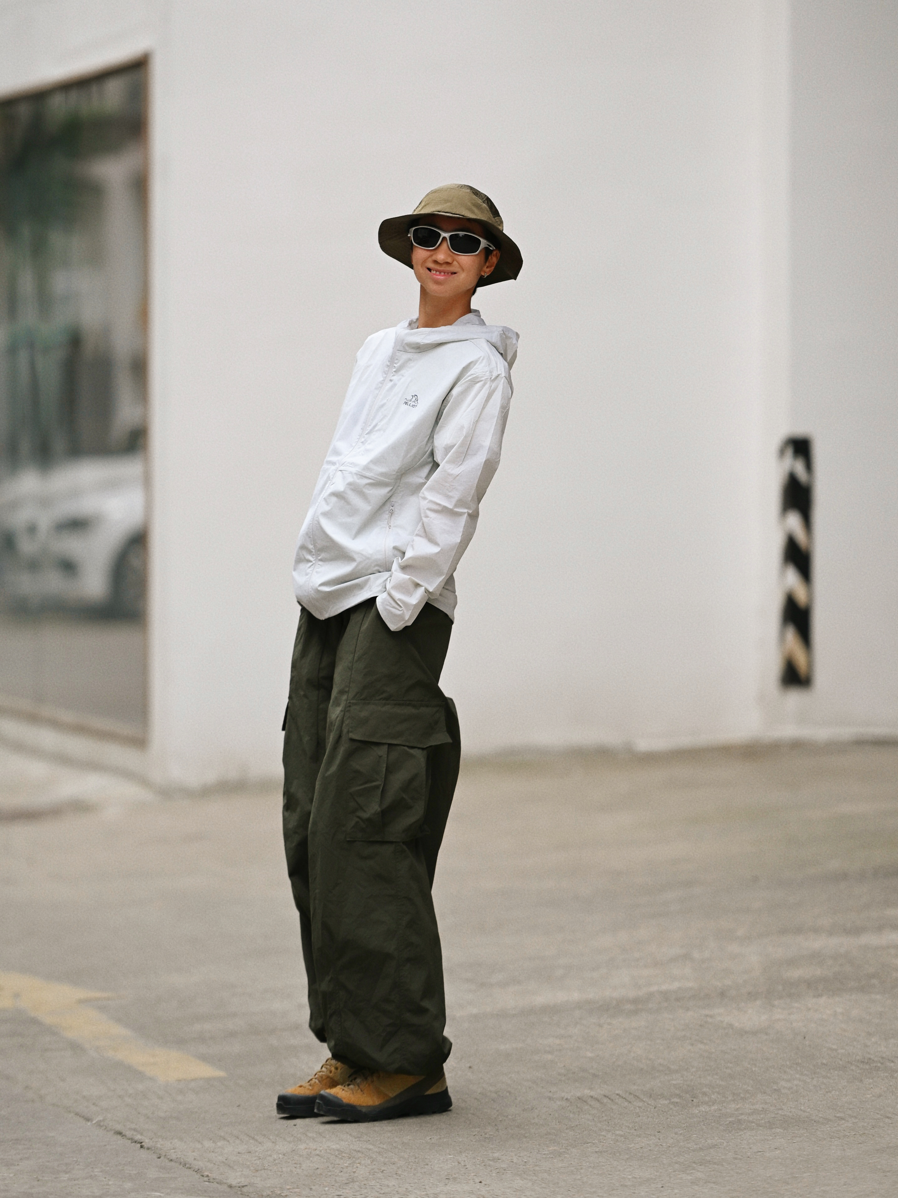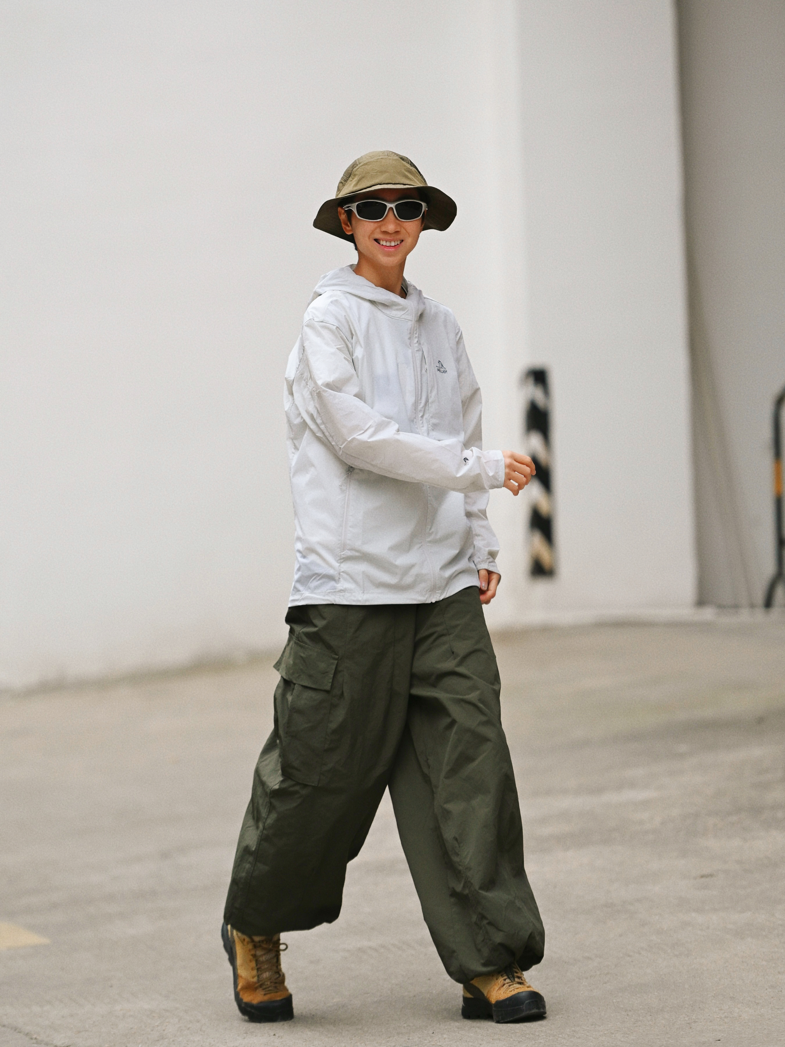 172CM|55KG 👔:m👖:m|👟:39码 春夏街头户外感穿搭来咯~ 上身伯希和防晒服太懂平衡感了! 轻薄透气的面料,防晒和体感自由都拿捏 白色连帽版型干净利落 搭配军绿阔腿工装裤 随性中带着户外机能感 卡其渔夫帽+复古运动鞋 墨镜一戴,街头酷感和户外实用性无缝衔接。