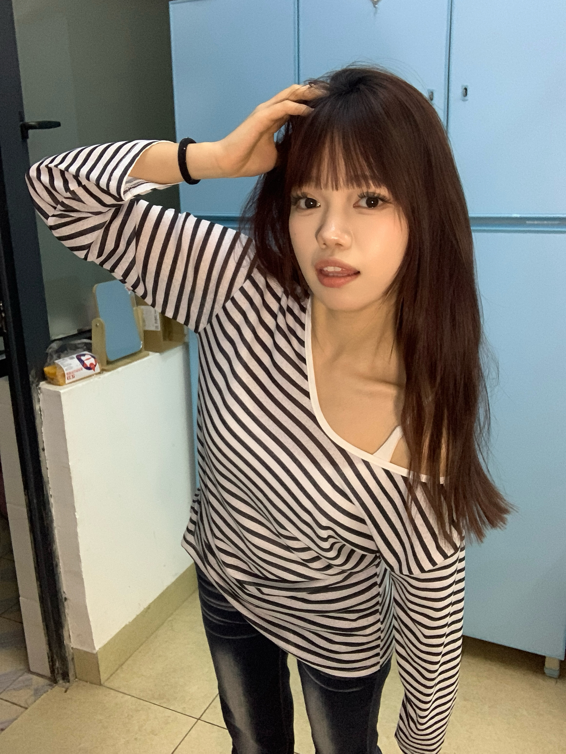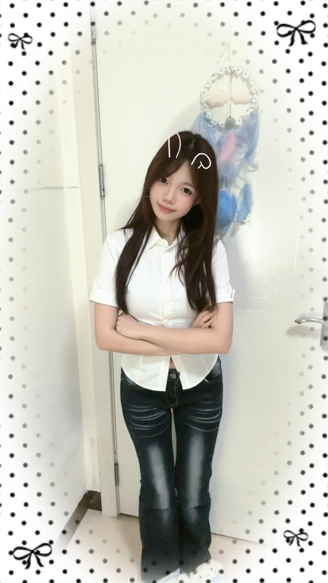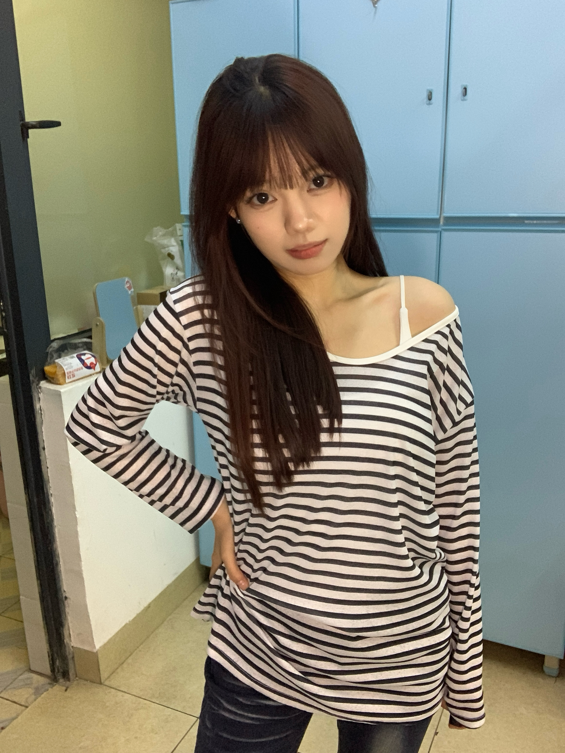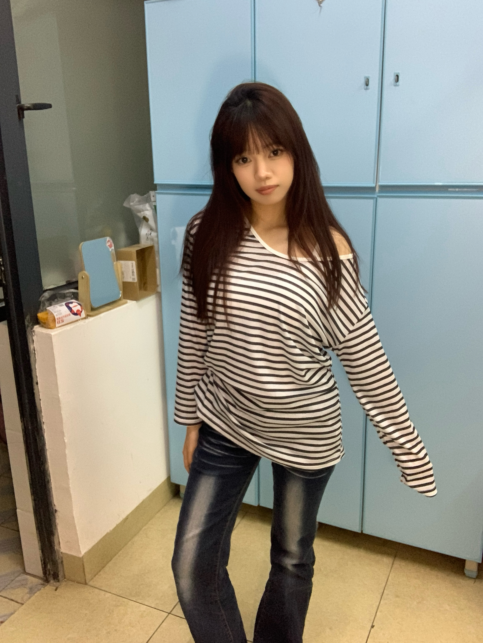 身高|体重:160 90 🧍♂️ 穿搭风格:元气青春 👔 上衣:条纹透气罩衫➕吊带 👖 下装:微喇牛仔裤👖 👟 鞋子:nike板鞋 🎒配饰:珍珠耳钉