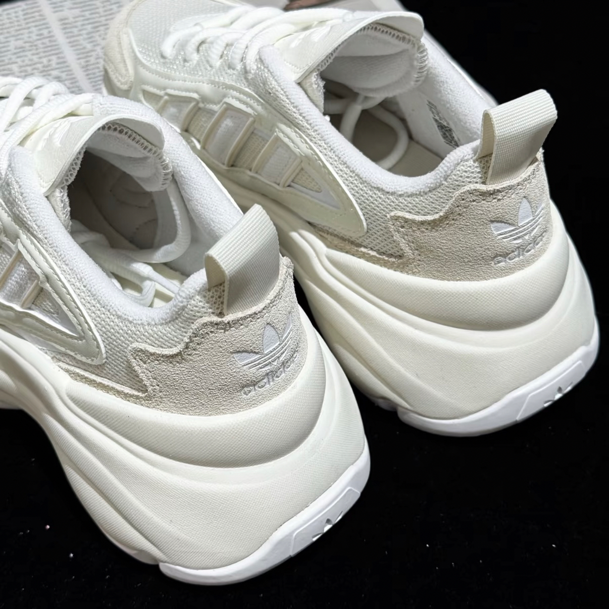 Ozgaia这名字,听起来像某个还没被发现的星球——其实它是Adidas专门用来装云的地方。 纯白配色,白到什么程度?白到像刚从造云工厂下线,还没来得及被天空领走。加厚的中底像发酵刚好的面团,蓬松、饱满、捏一下会回弹的那种。鞋身网面与皮革拼接,层次感像是云层堆叠——不是那种薄薄一层,是能藏住整个下午的厚度。 上脚第一感觉:软,但不是塌陷的软。是那种刚踩上去以为会陷进去,结果被稳稳托住的软——像...
