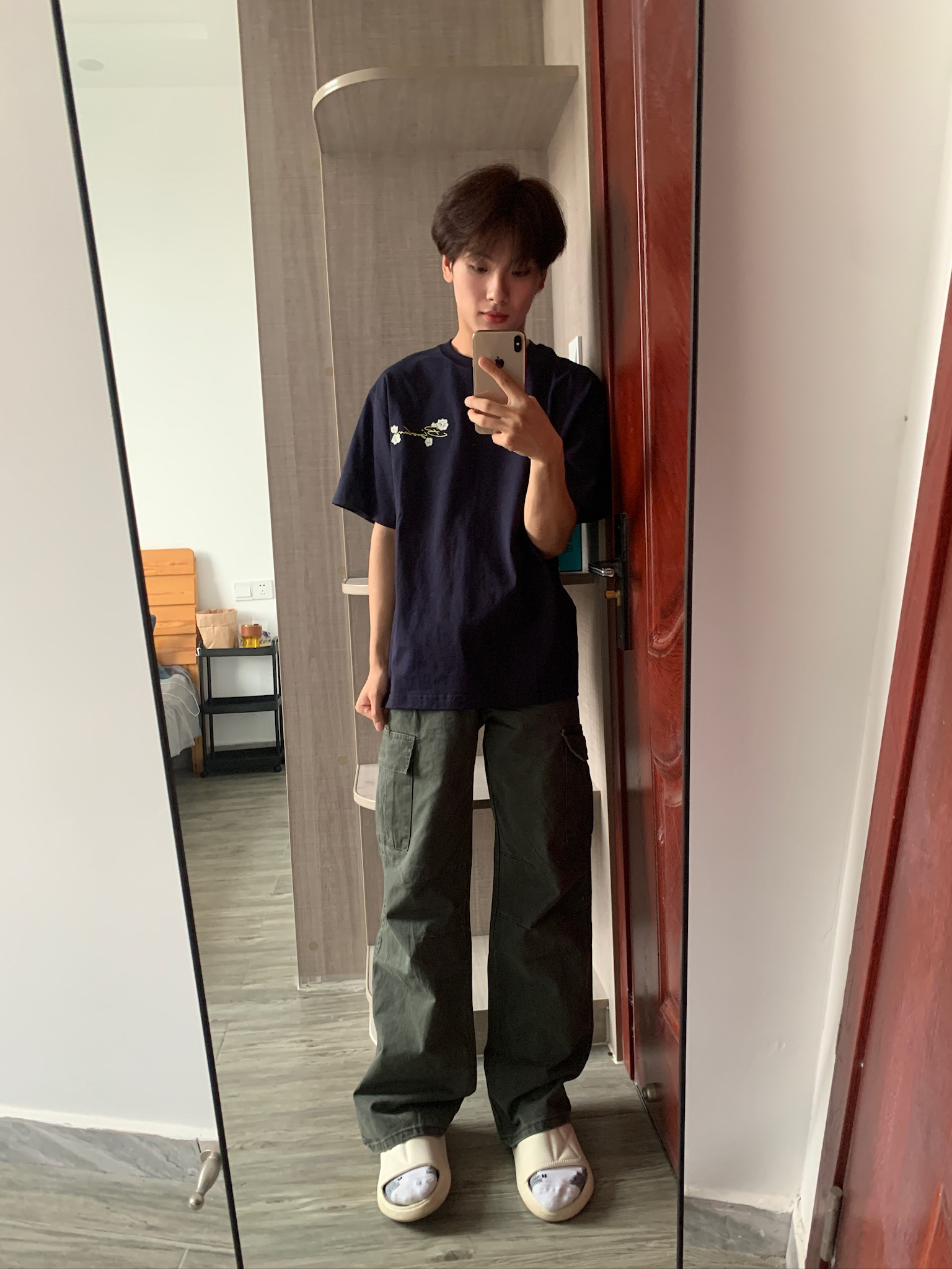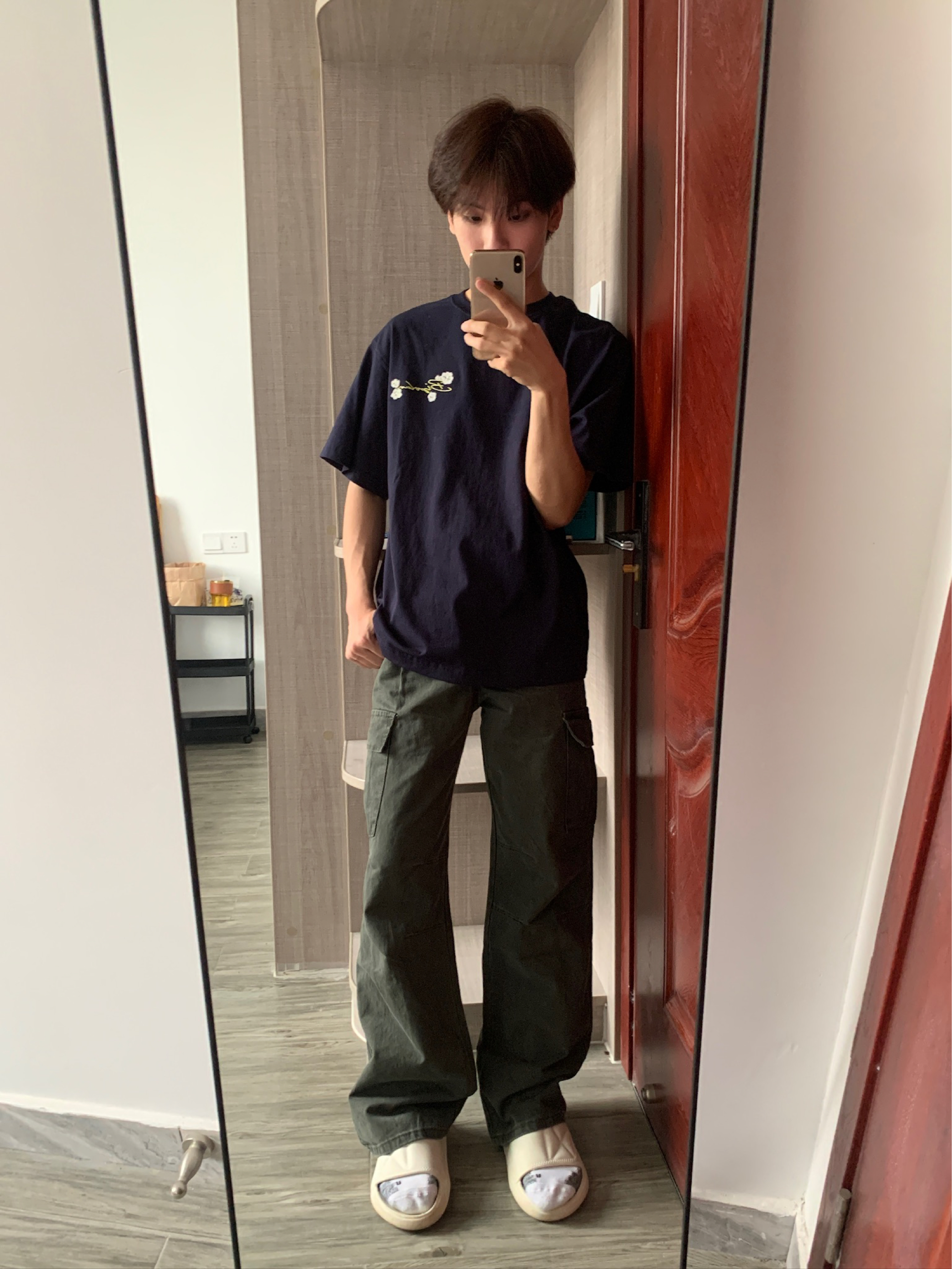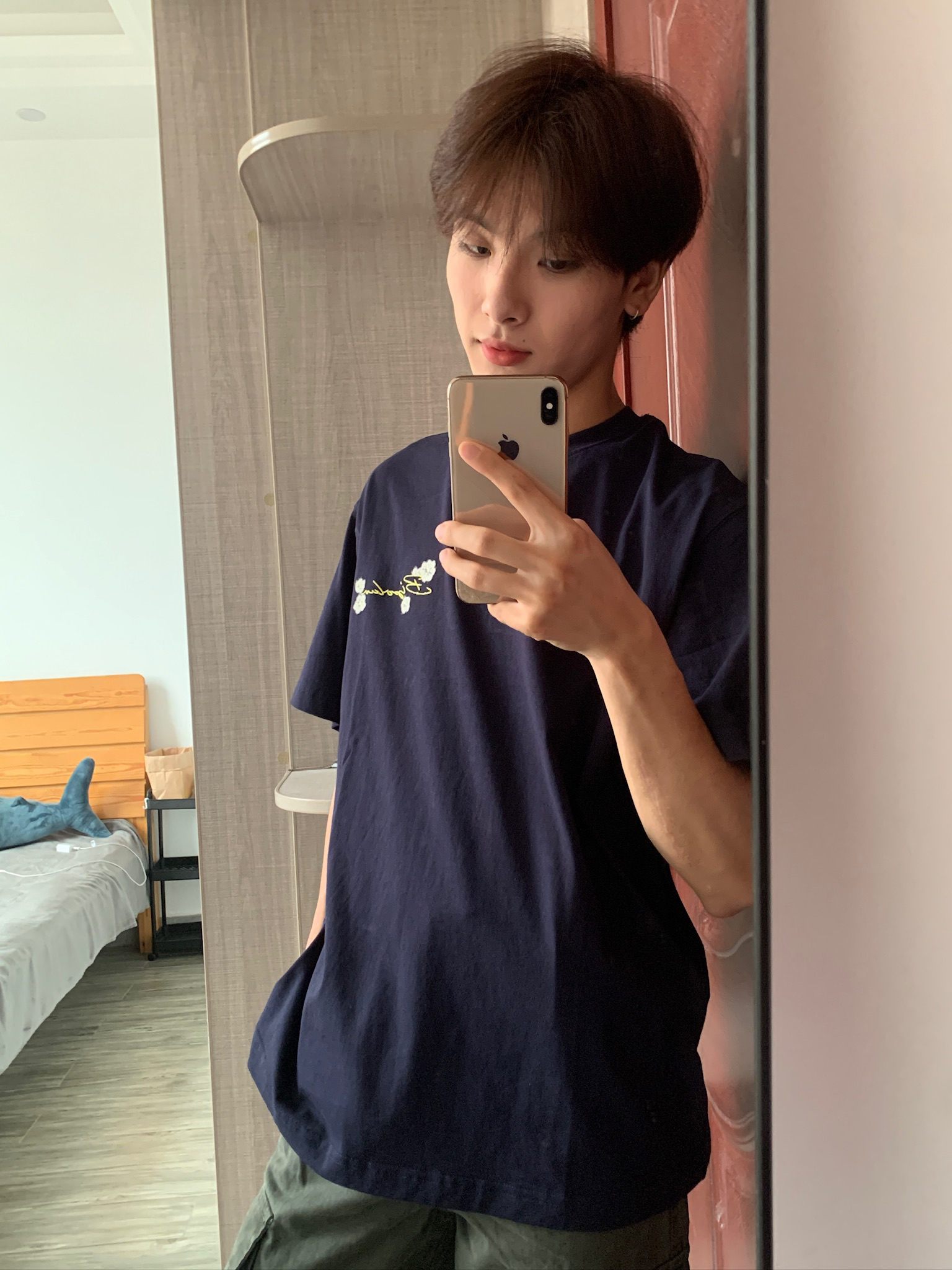 这件藏青T真的太好穿了!料子软软的但不会塌,胸口那几朵小花刺绣很精致,不夸张又有细节👌 搭军绿色工装裤+拖鞋,出门遛弯、上课都舒服,夏天穿也不闷汗,男生日常穿真的很合适~