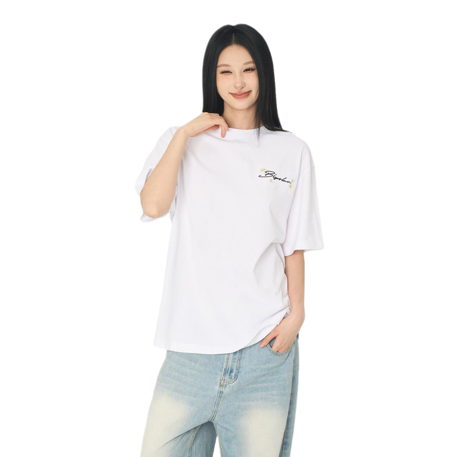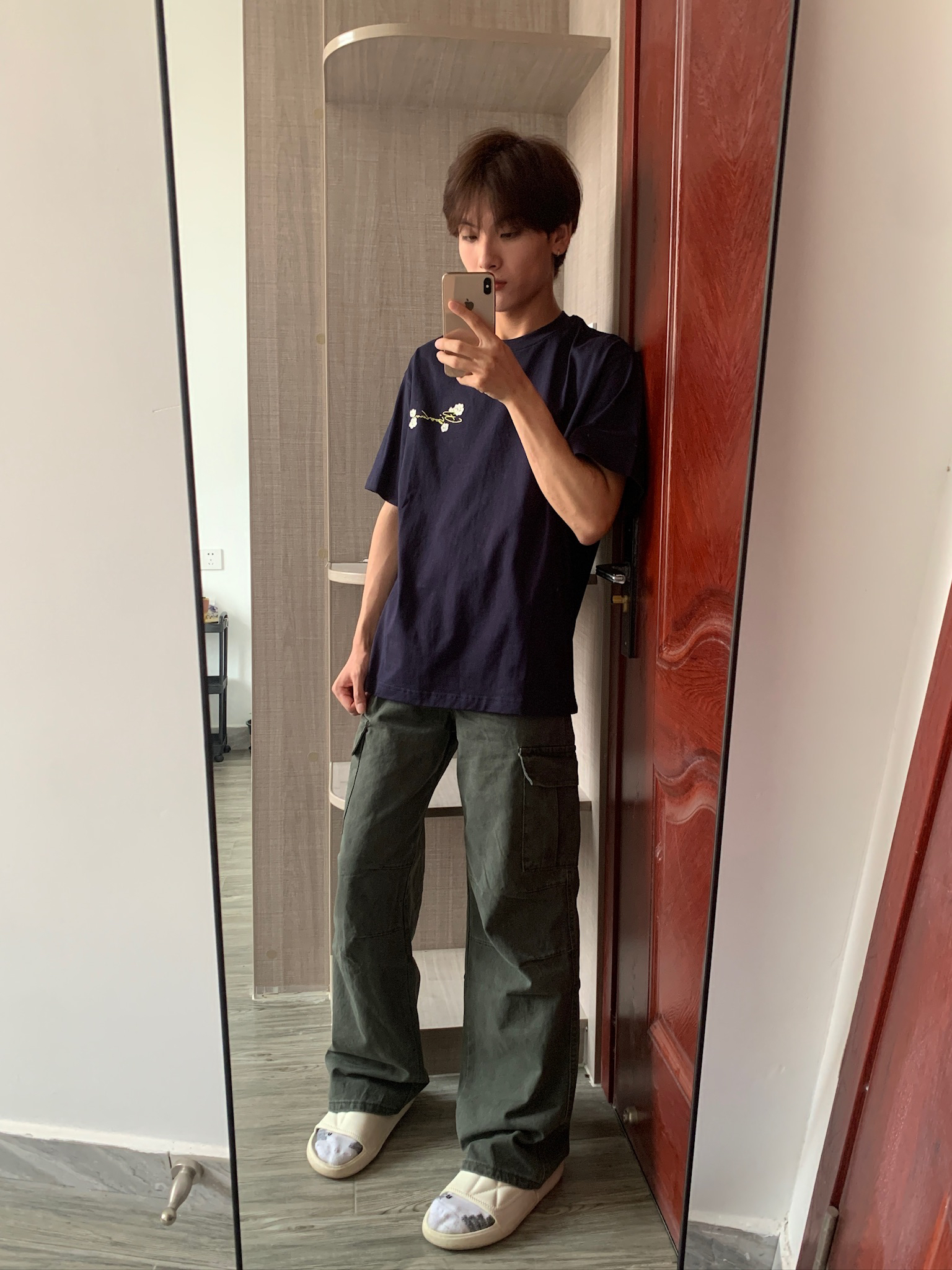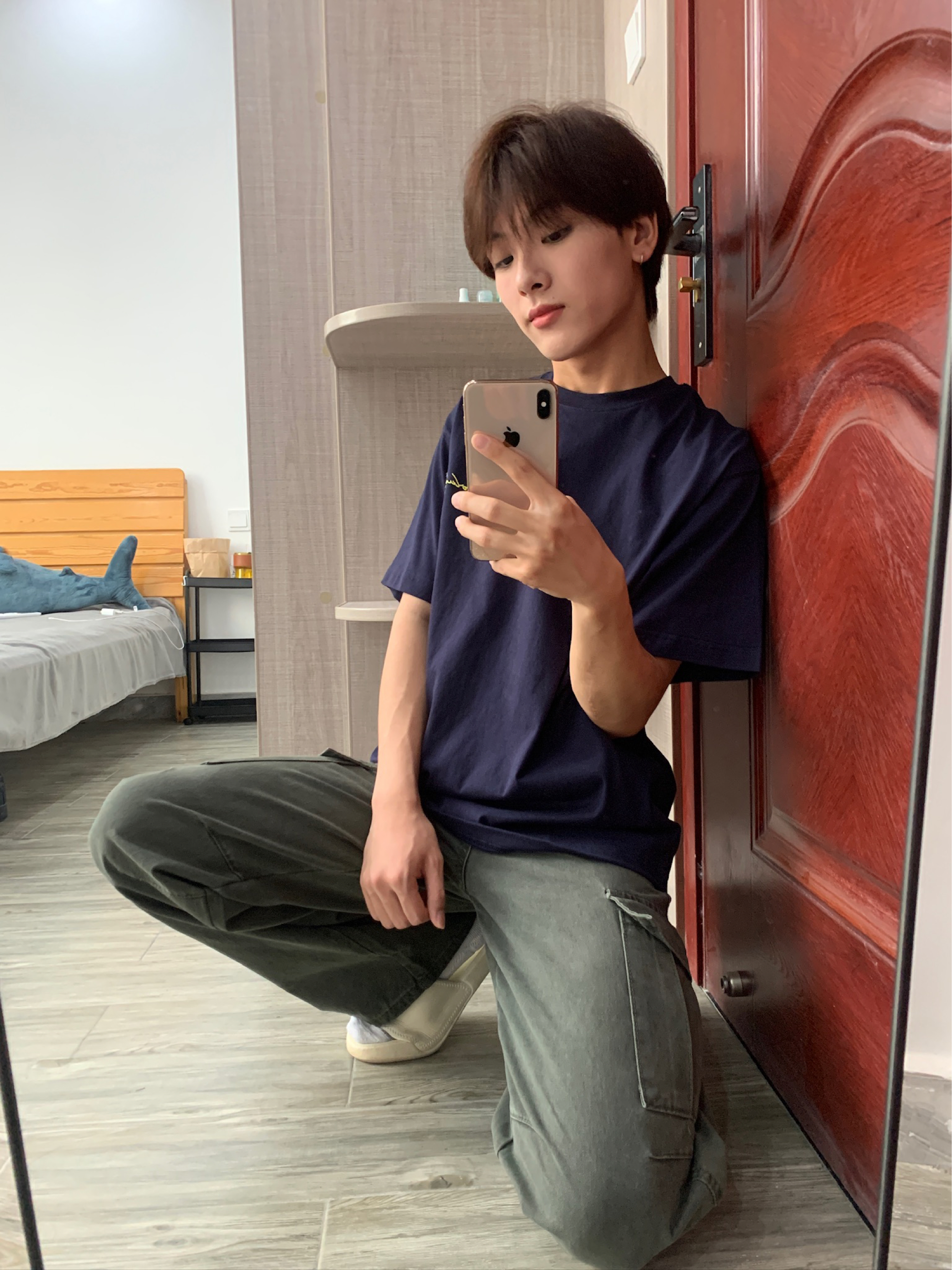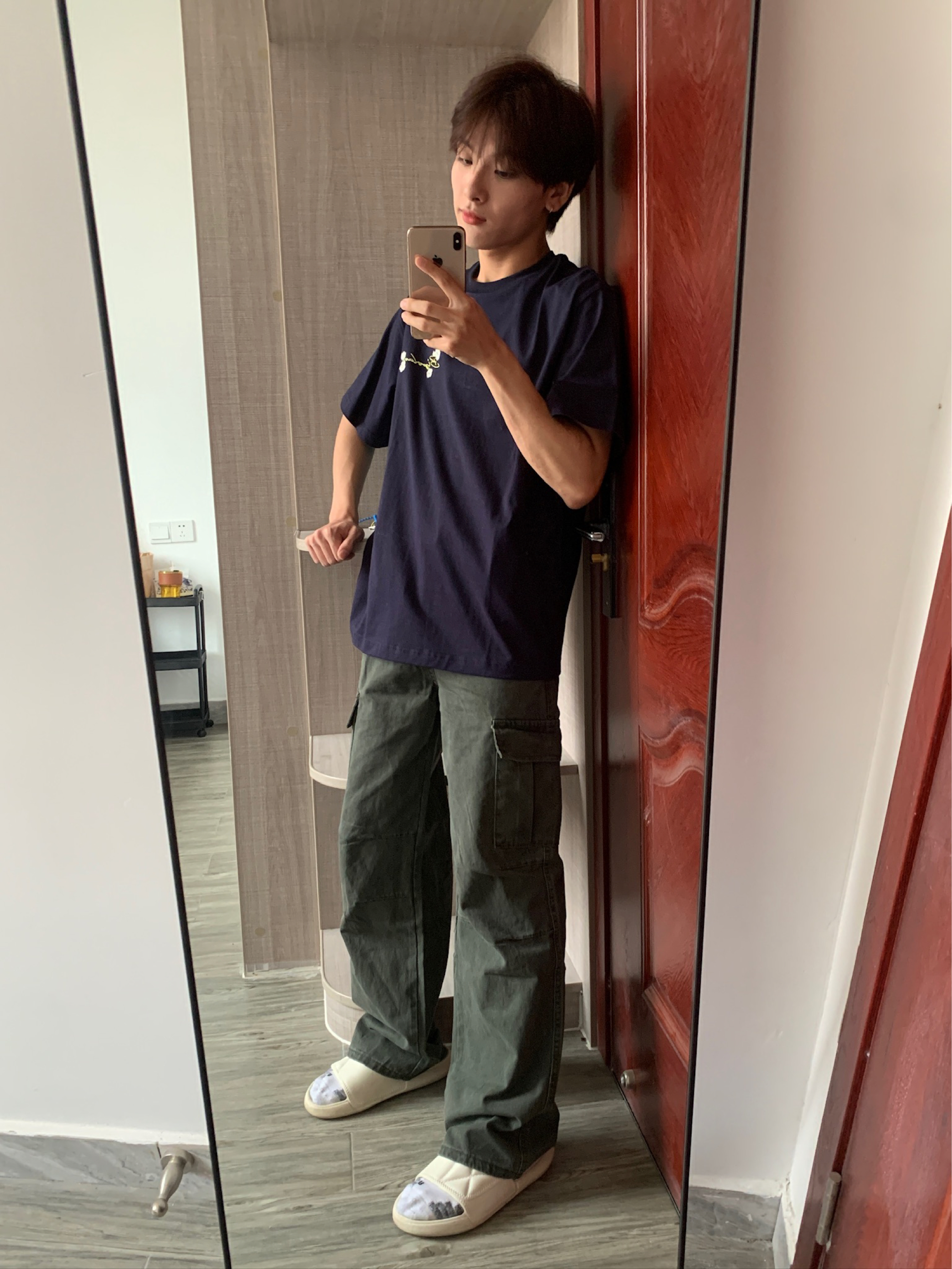 这件藏青T真的太好穿了!料子软软的但不会塌,胸口那几朵小花刺绣很精致,不夸张又有细节👌 搭军绿色工装裤+拖鞋,出门遛弯、上课都舒服,夏天穿也不闷汗,男生日常穿真的很合适~