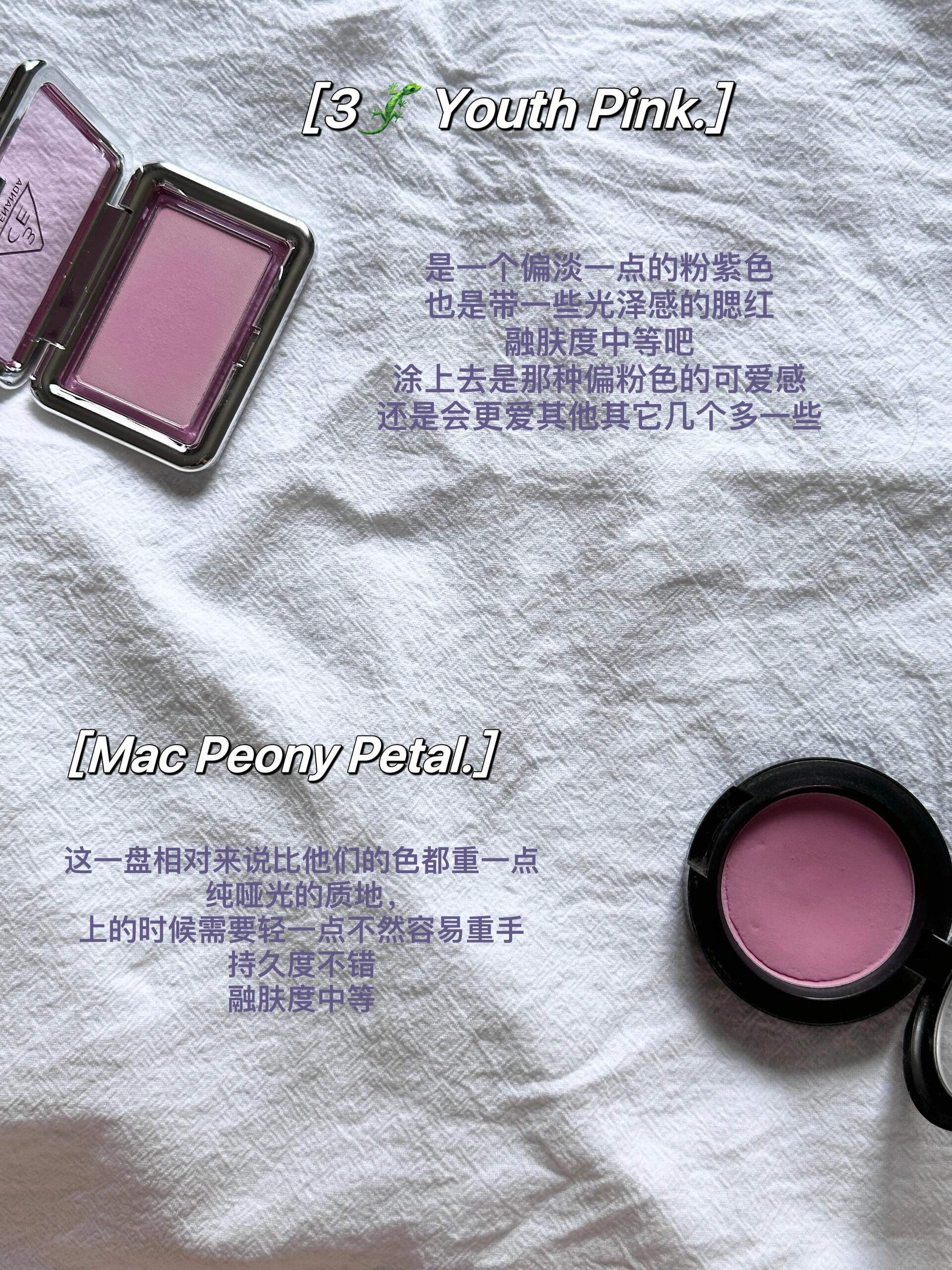 本篇笔记关联了3CE/三熹玉 哑光小方块腮红 低饱和 4.5g 粉紫色YOUTH PINK 、TIMAGE/彩棠 争青流玉三色腮红盘 三合一修饰轮廓提气色粉嫩哑光 13g 02桃羞、NARS/娜斯 氛围感细腻炫色腮红 哑光显嫩持色修饰轮廓 兴奋Thrill等商品,为用户提供真实的使用体验和购买参考。