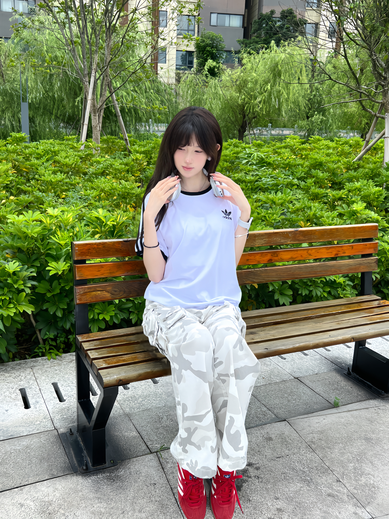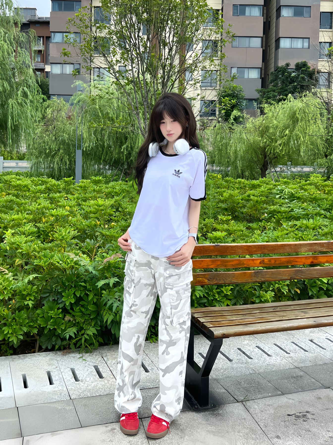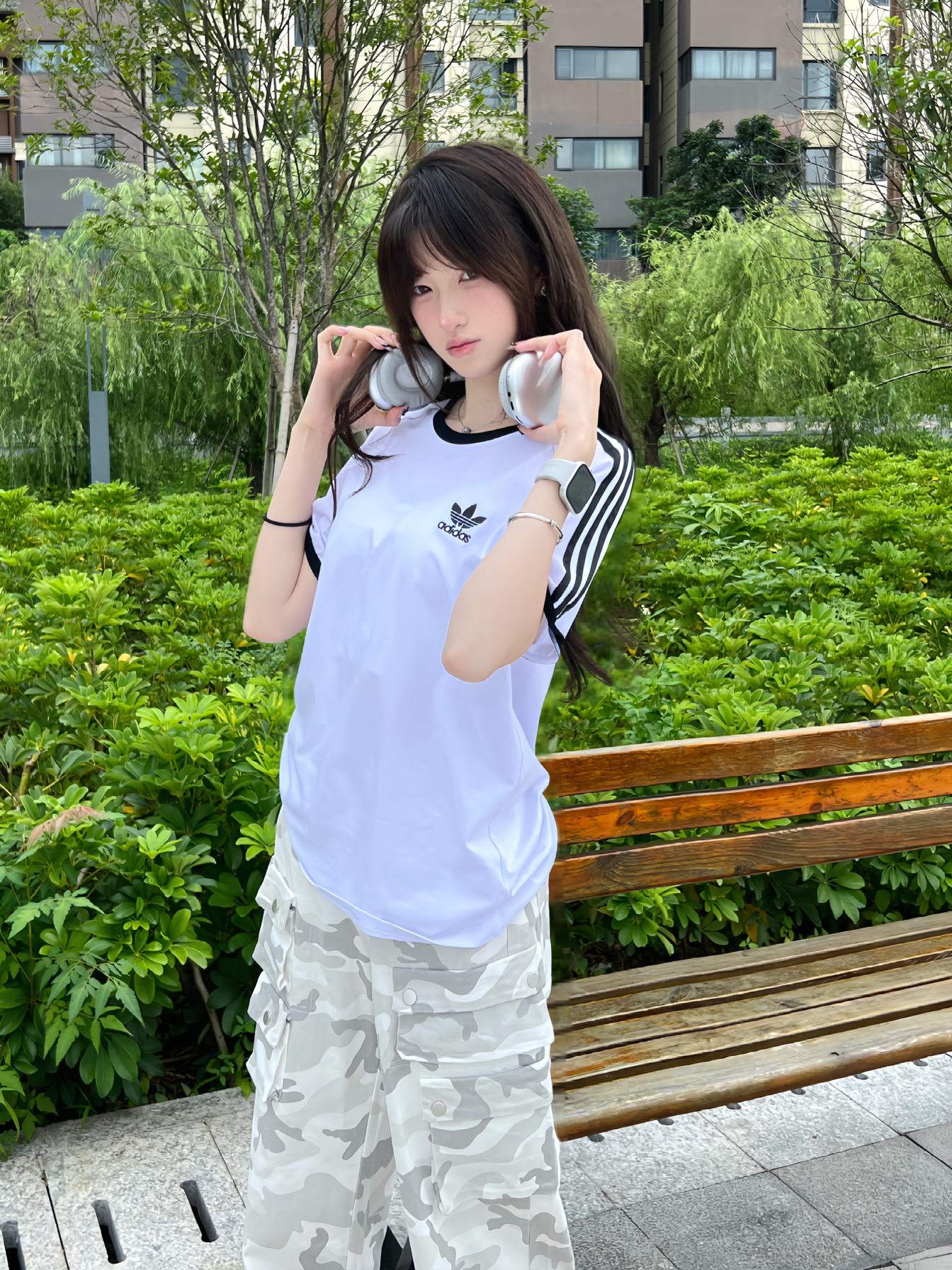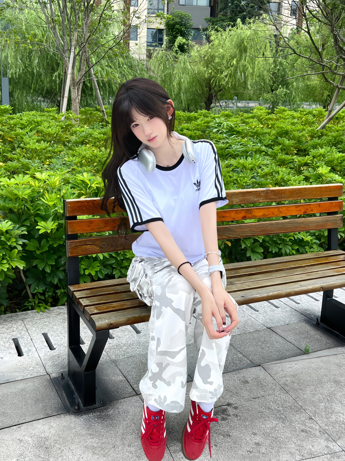 Hello宝宝萌我是羅非鱼~ 🍃夏天就爱这种舒服又随性的穿搭! 经典三条杠白T+浅灰迷彩工装裤, 再踩上一双红鞋子提亮整个造型~ 耳机一挂,慵懒感直接拉满✨ 日常出街/散步都超合适,舒服又上镜! 甜酷少女们快抄作业🥰