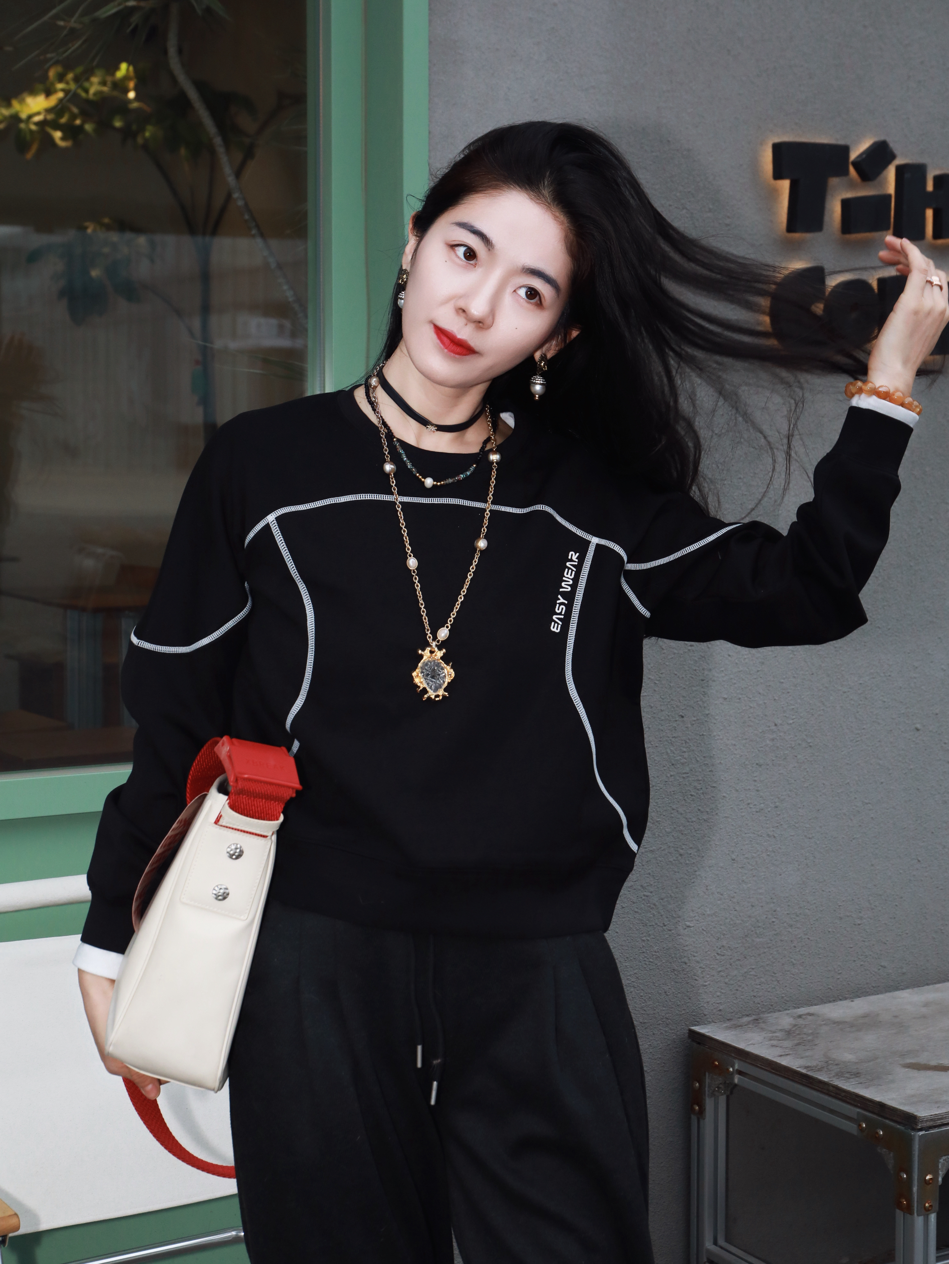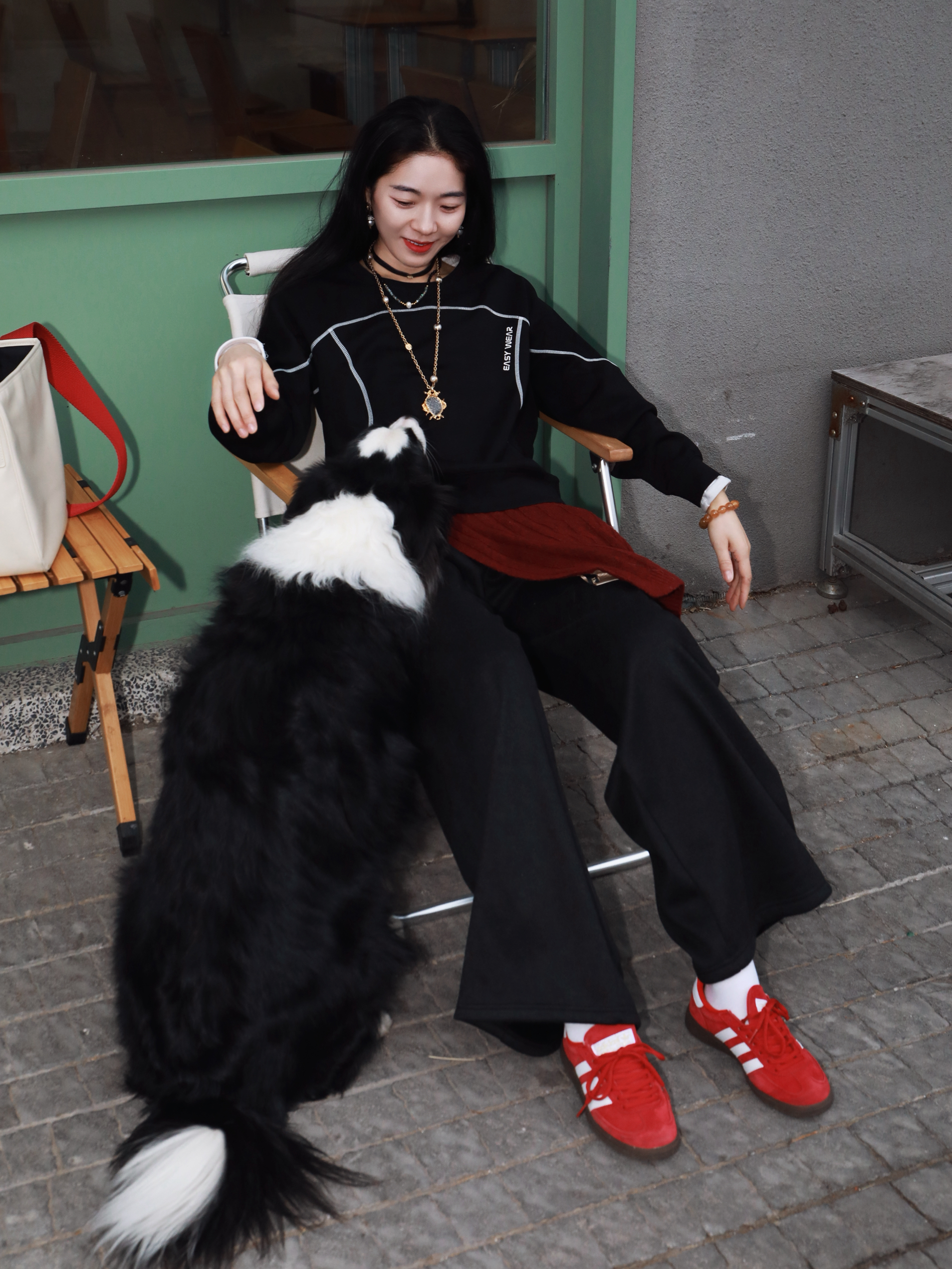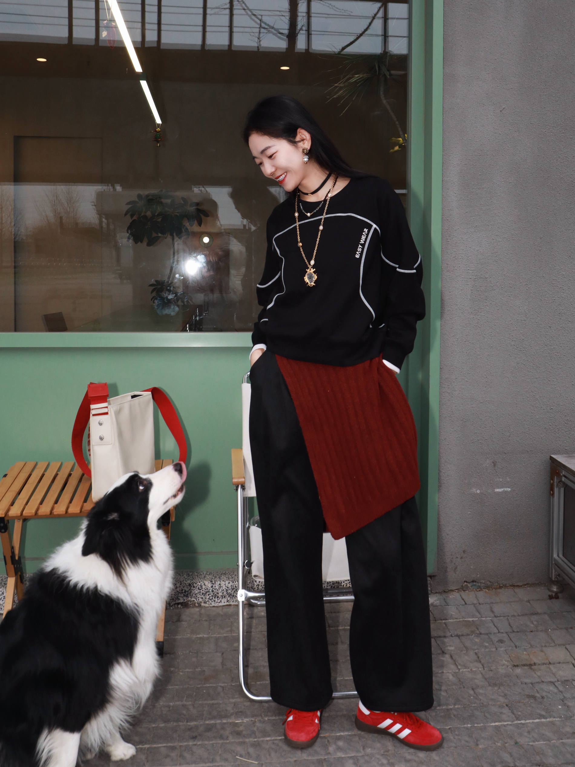 早春穿新衣~尝试小帅点的风格 终于迎来了卫衣的季节 依旧最爱黑色✌️ 懒懒的时髦人,真的需要这样一件 在黑的基础上版型独特,一些线条元素 就很立体🥰🥰 搭上一条阔腿裤,一双红色的板鞋 不挑身形,慵懒又松弛~ 耶,又是遛狗人里那个帅女孩👧