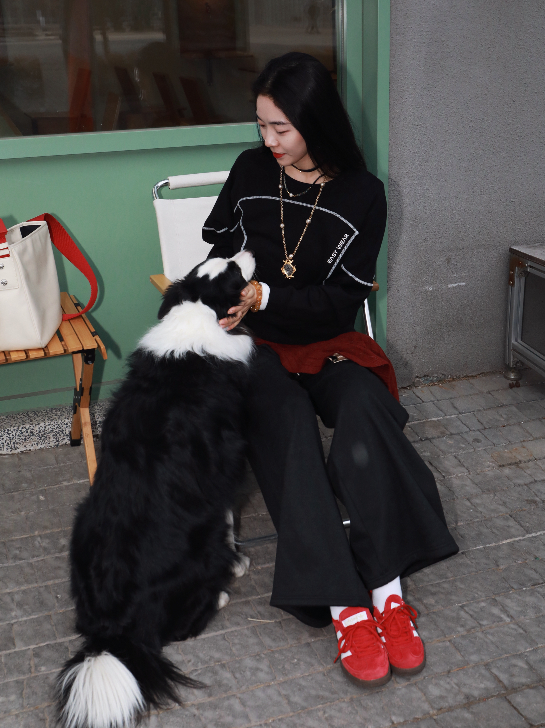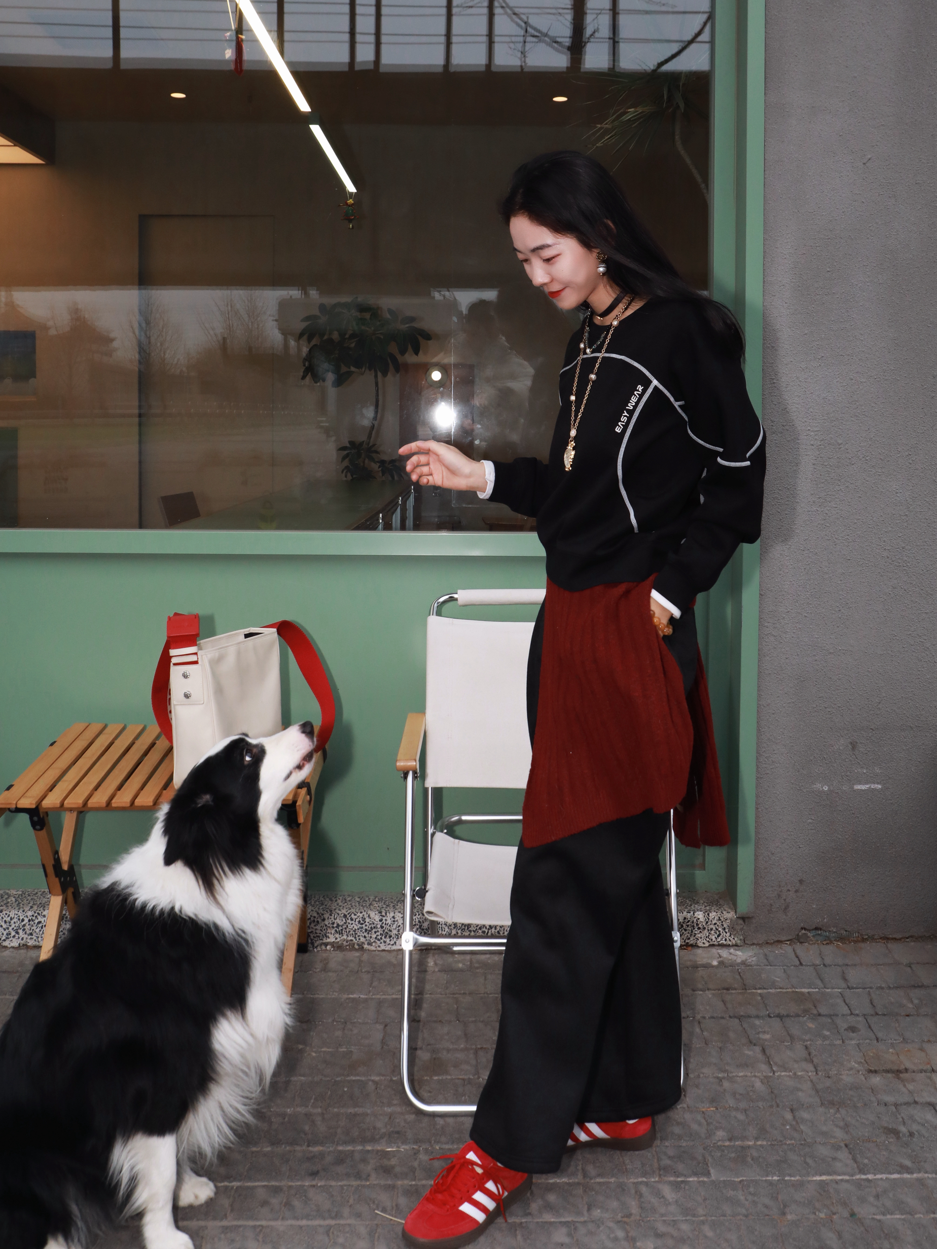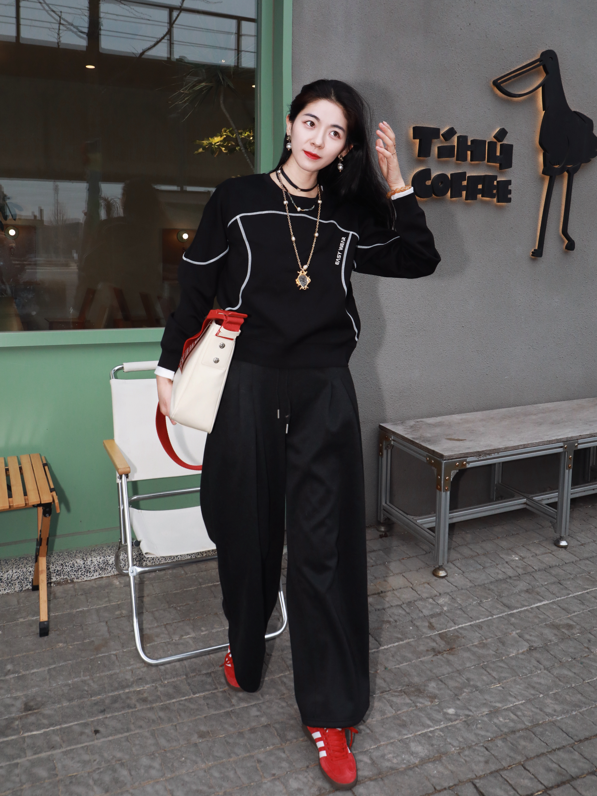 早春穿新衣~尝试小帅点的风格 终于迎来了卫衣的季节 依旧最爱黑色✌️ 懒懒的时髦人,真的需要这样一件 在黑的基础上版型独特,一些线条元素 就很立体🥰🥰 搭上一条阔腿裤,一双红色的板鞋 不挑身形,慵懒又松弛~ 耶,又是遛狗人里那个帅女孩👧