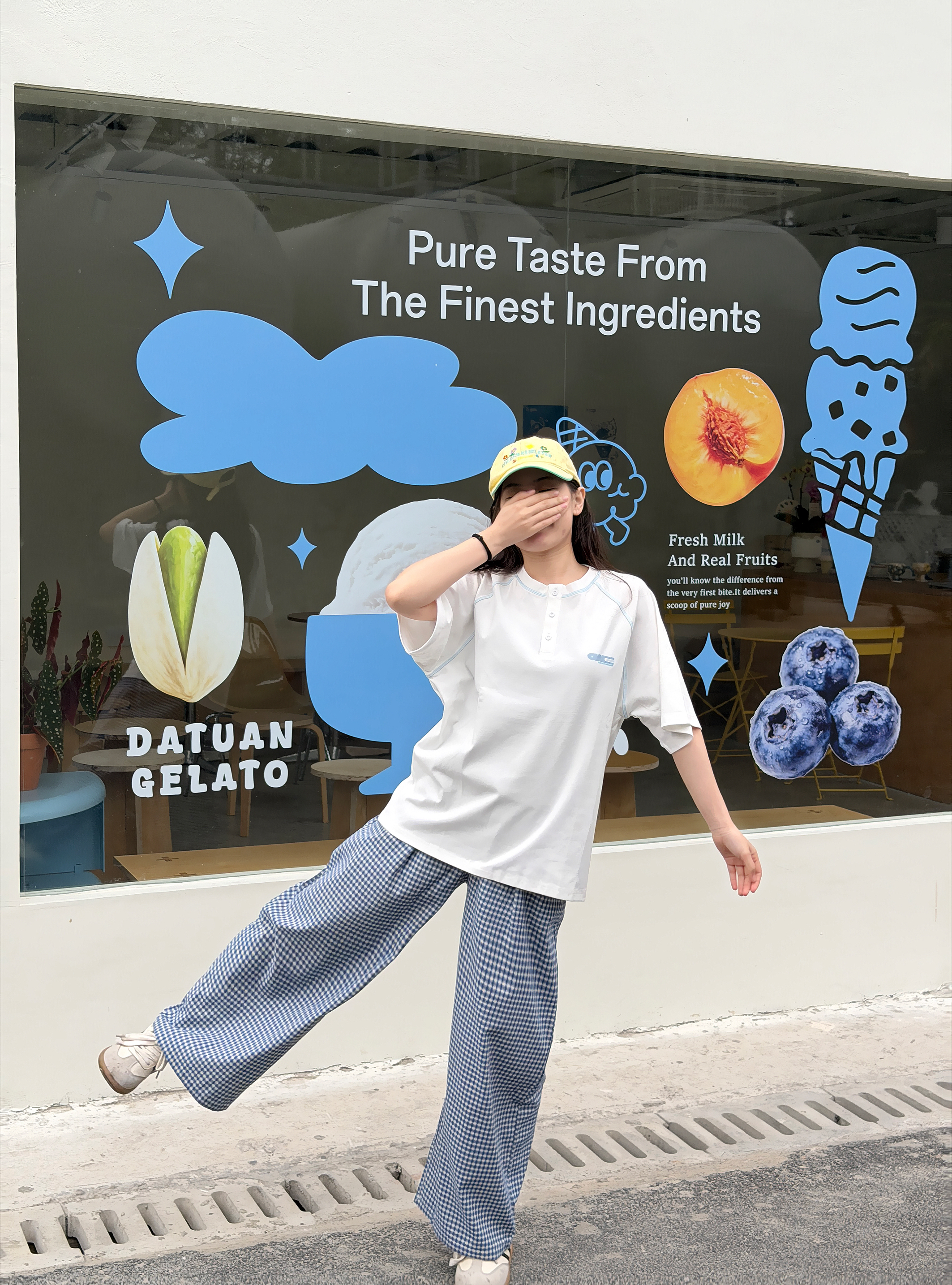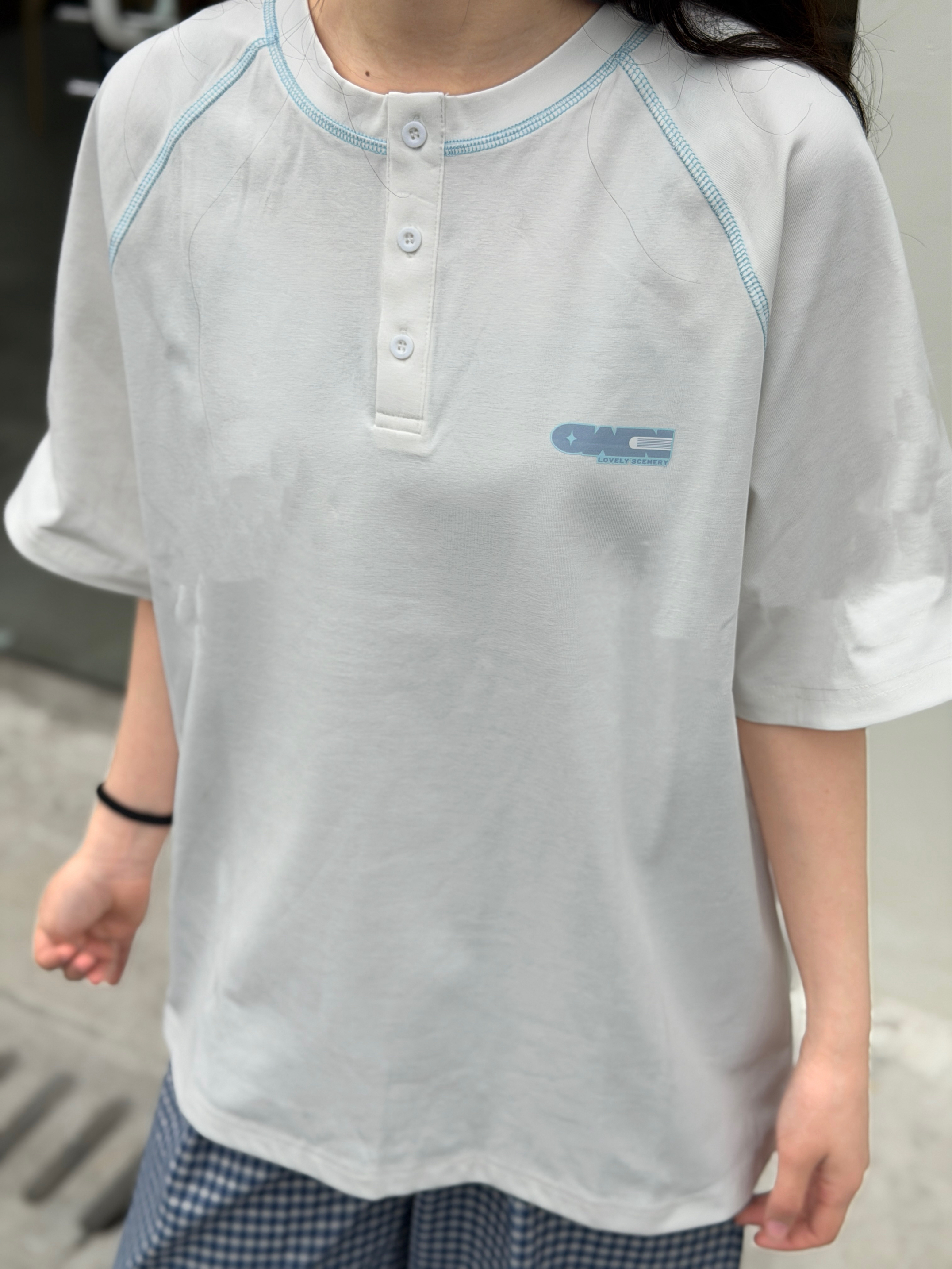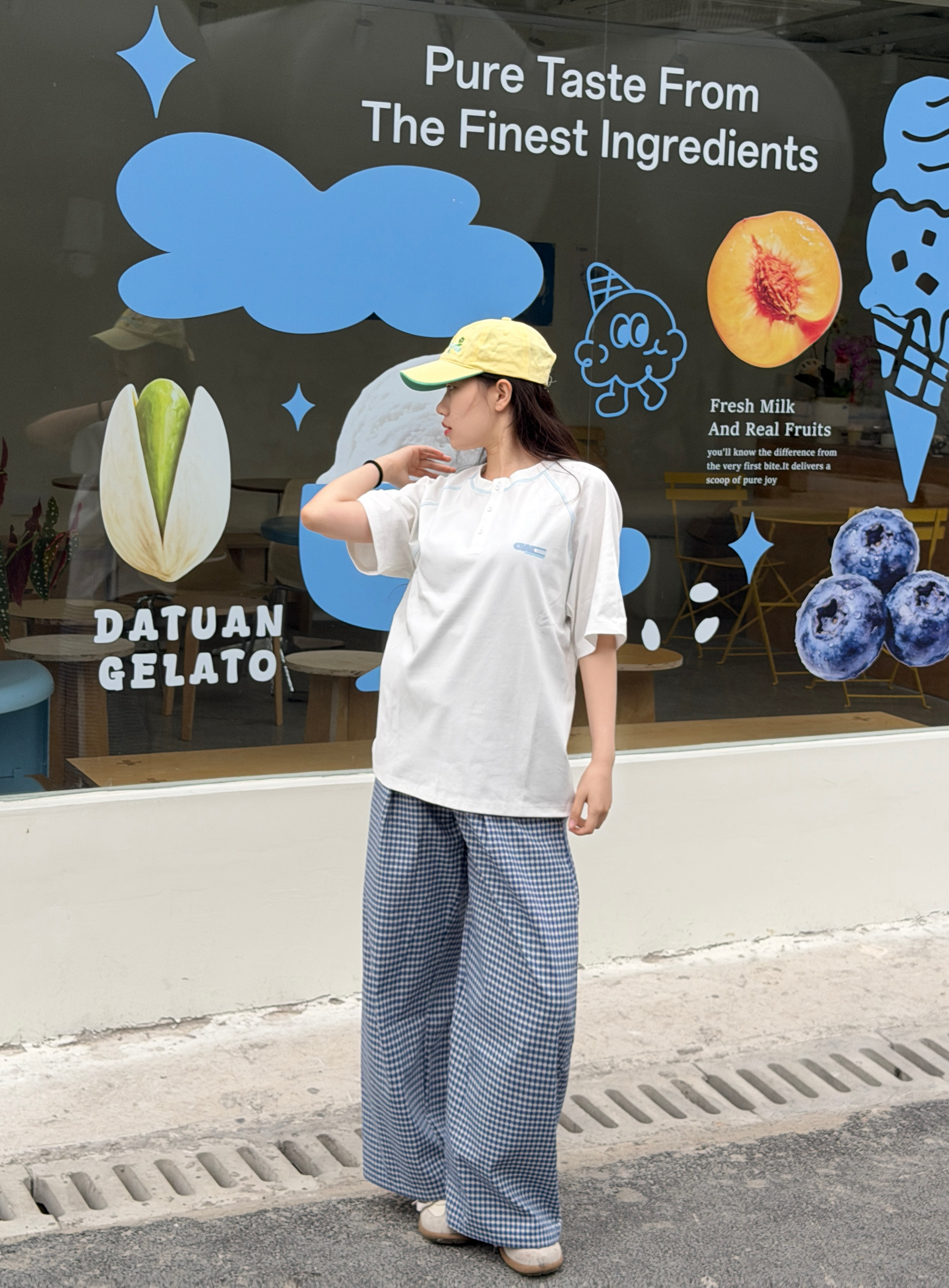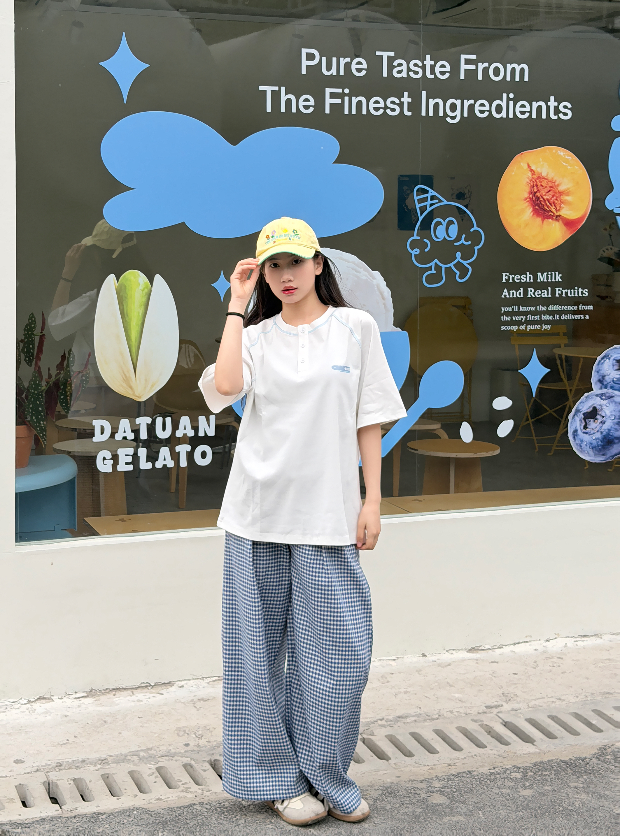 简约亨利领设计 比普通圆T多了点复古感 领口纽扣还能自由调节 通勤上课都合适 面料是软软的棉质 透气不闷汗 夏天穿也舒服 搭配蓝白格纹阔腿裤 一整套就是清爽的美式学院风 再戴个小黄帽 元气感直接拉满
