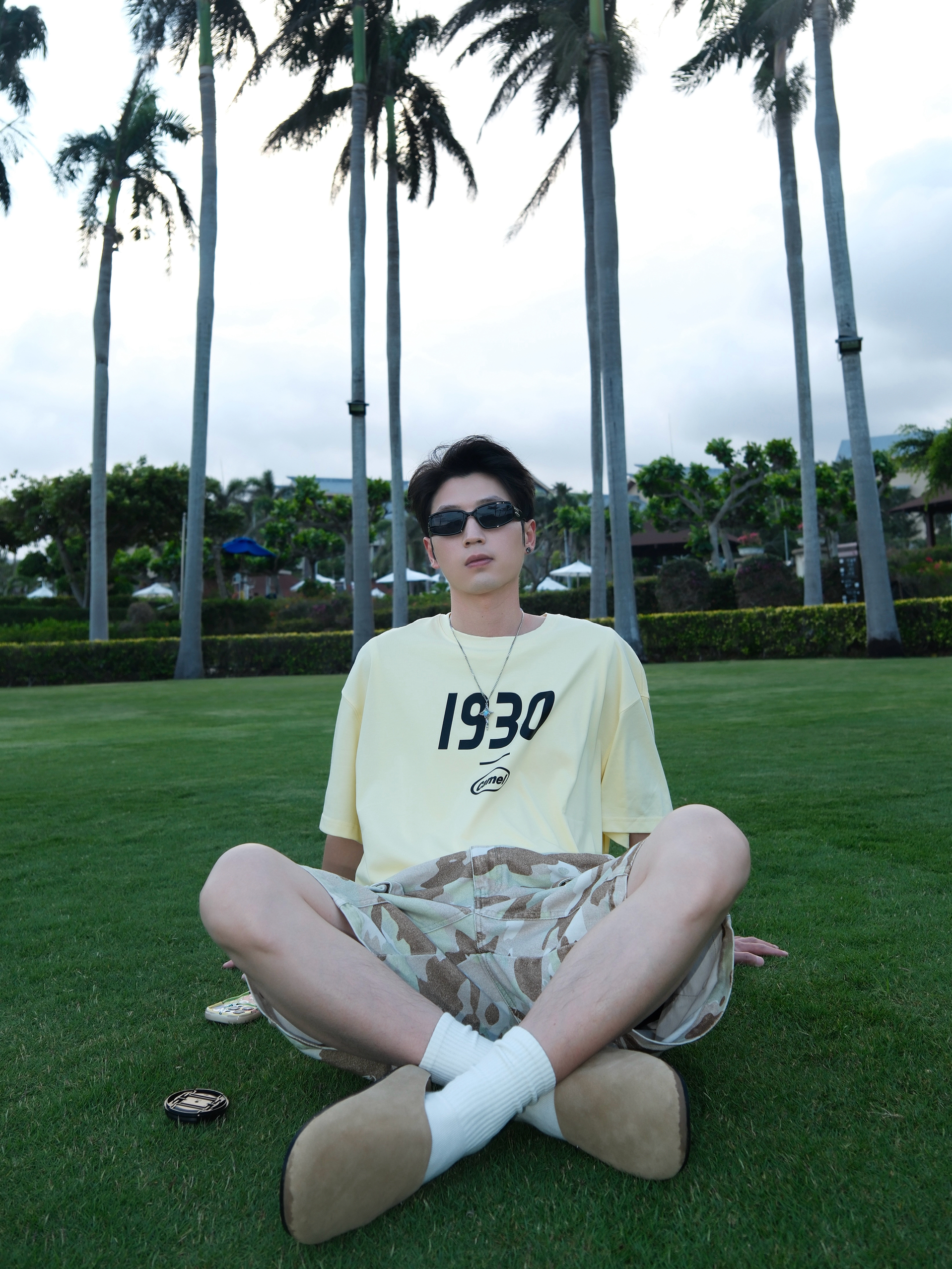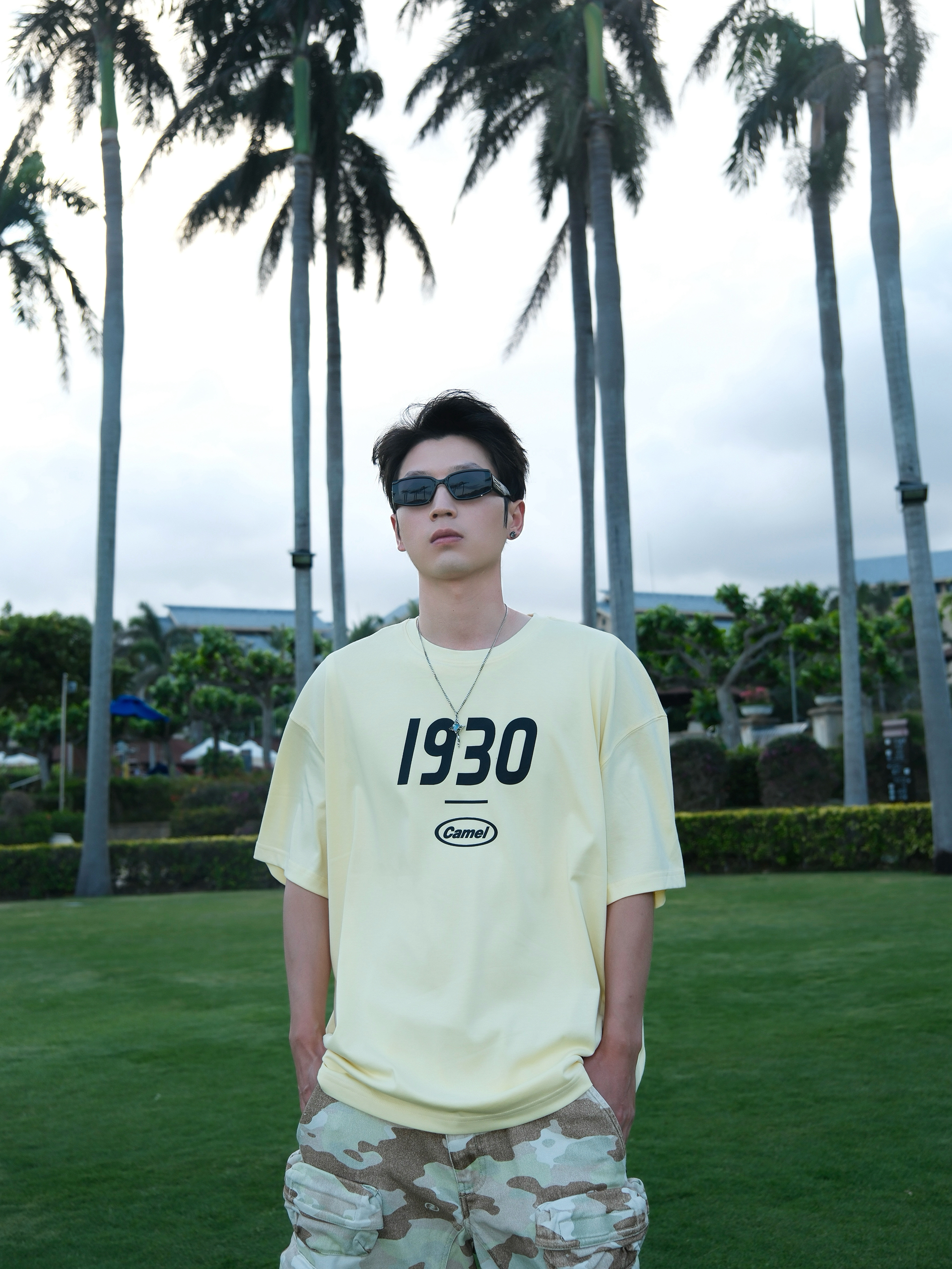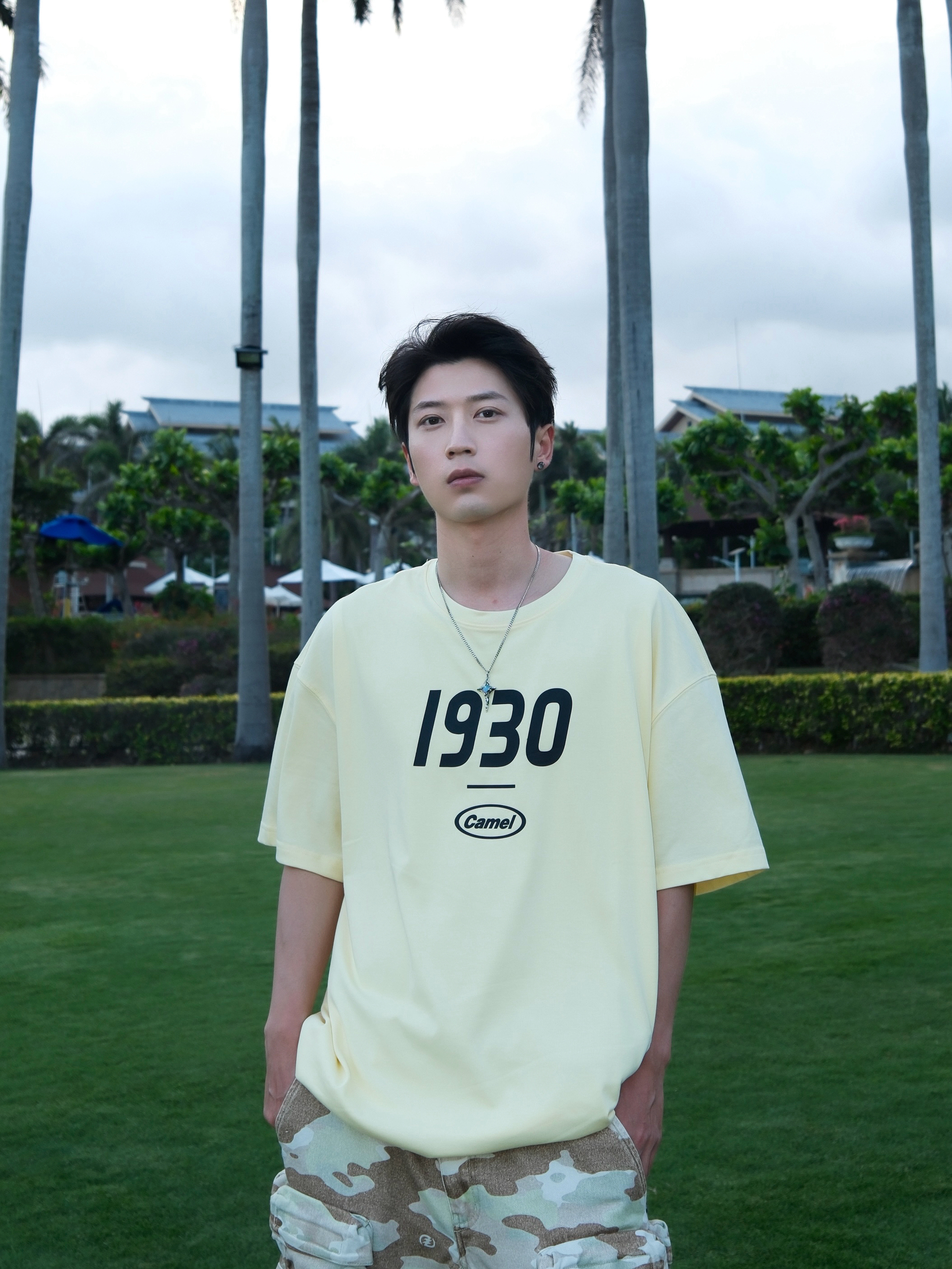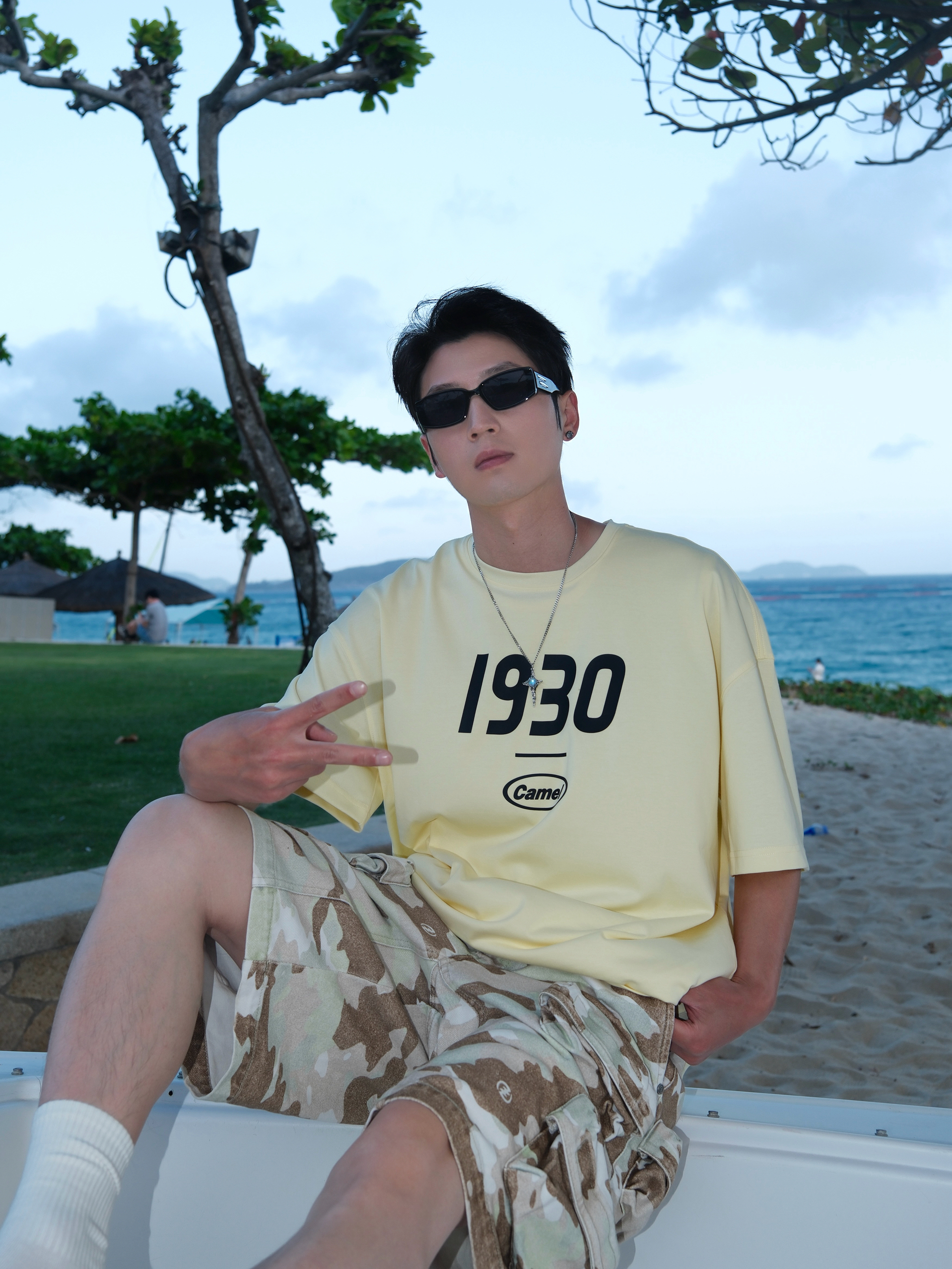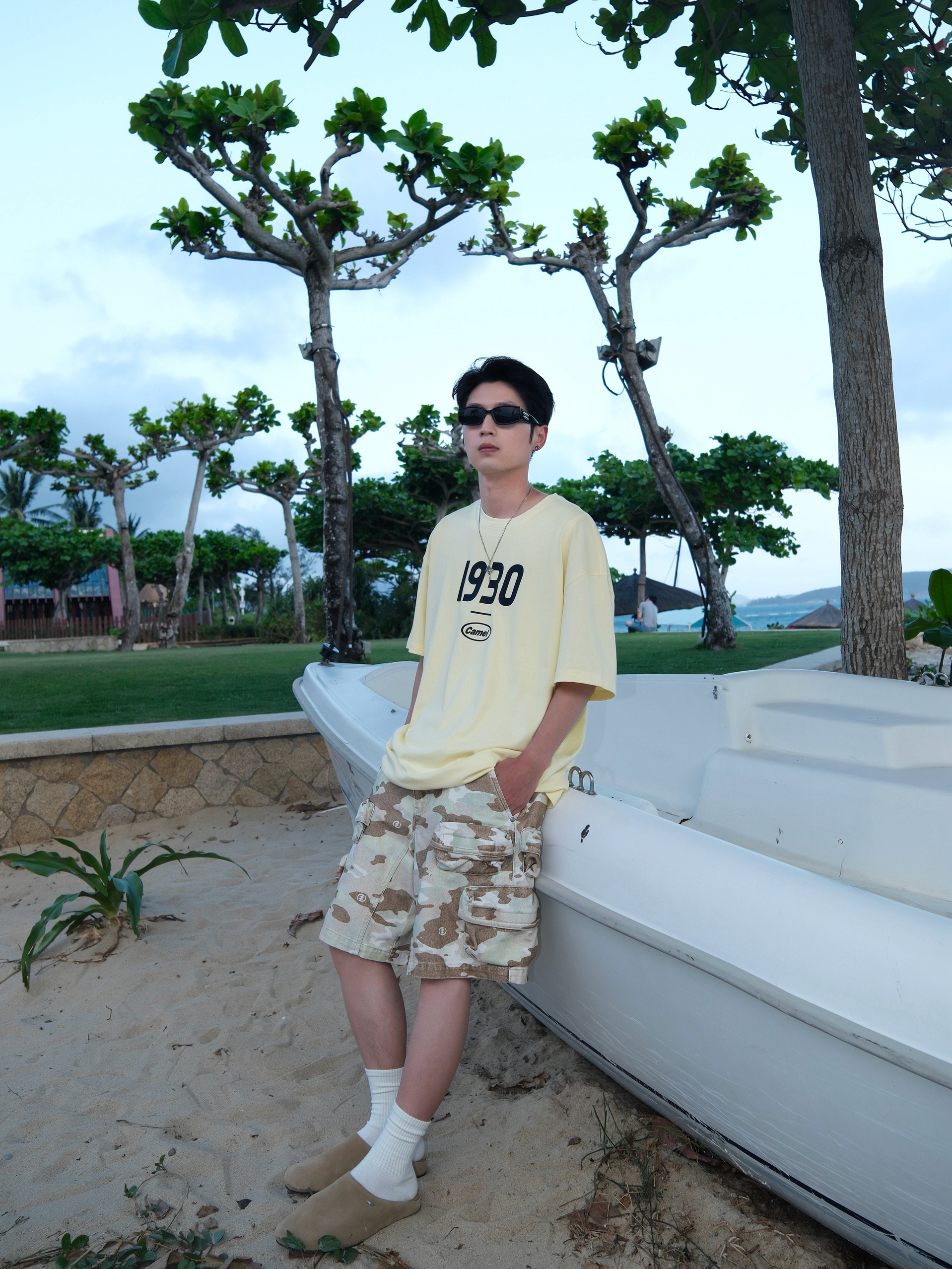 偶尔总得奖励自己 出门简单旅行一下 到三亚 穿搭主打一个清爽自在 浅黄短袖搭配迷彩短裤 干净阳光又有少年感