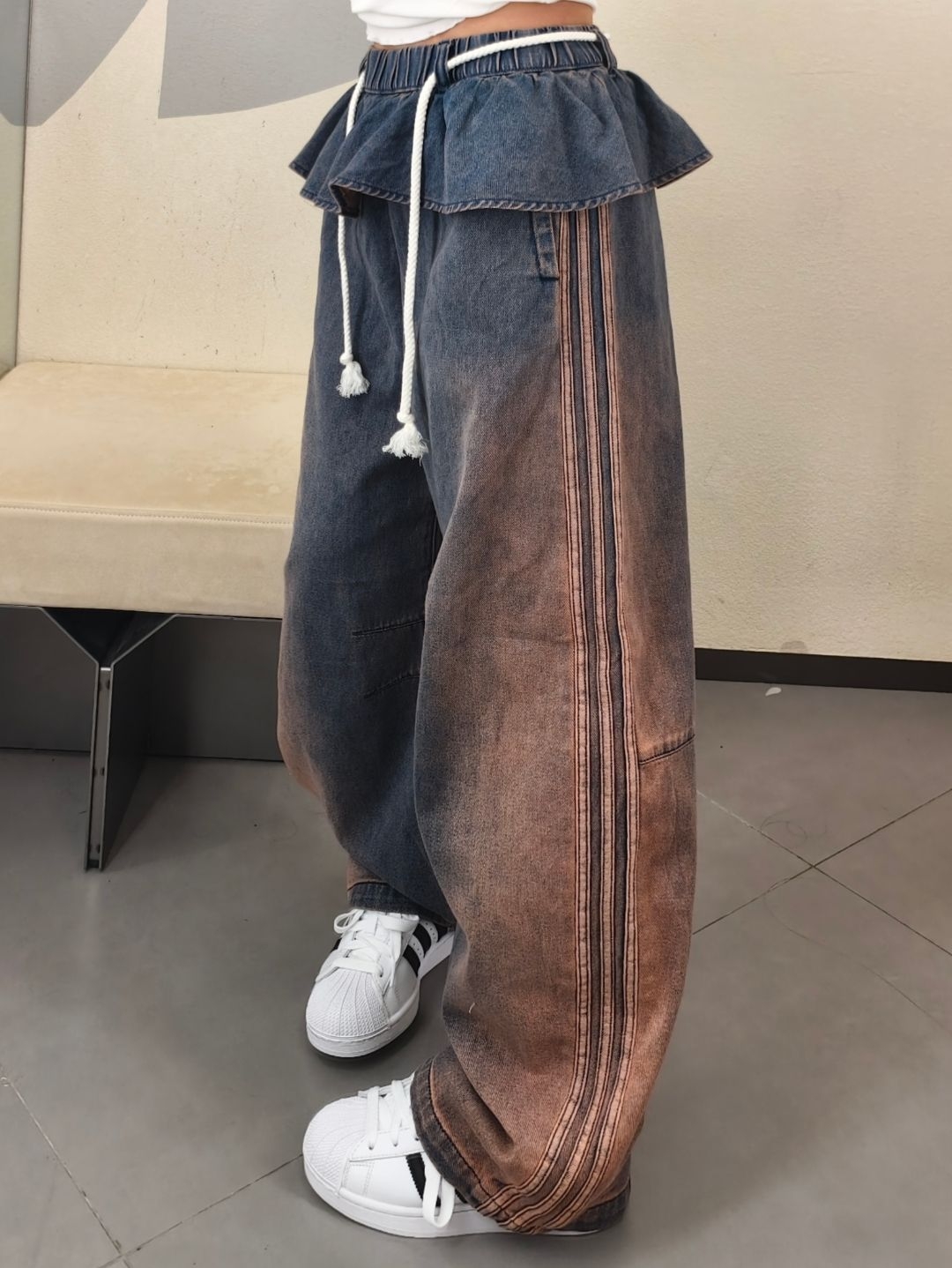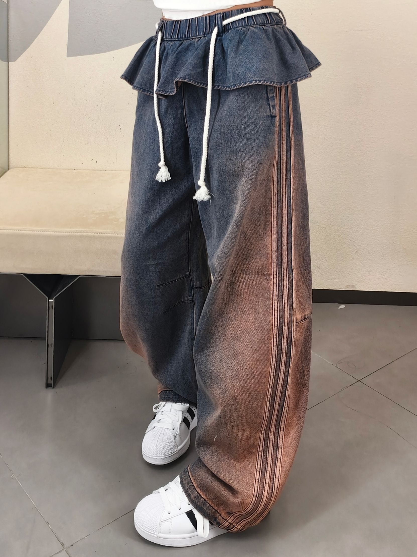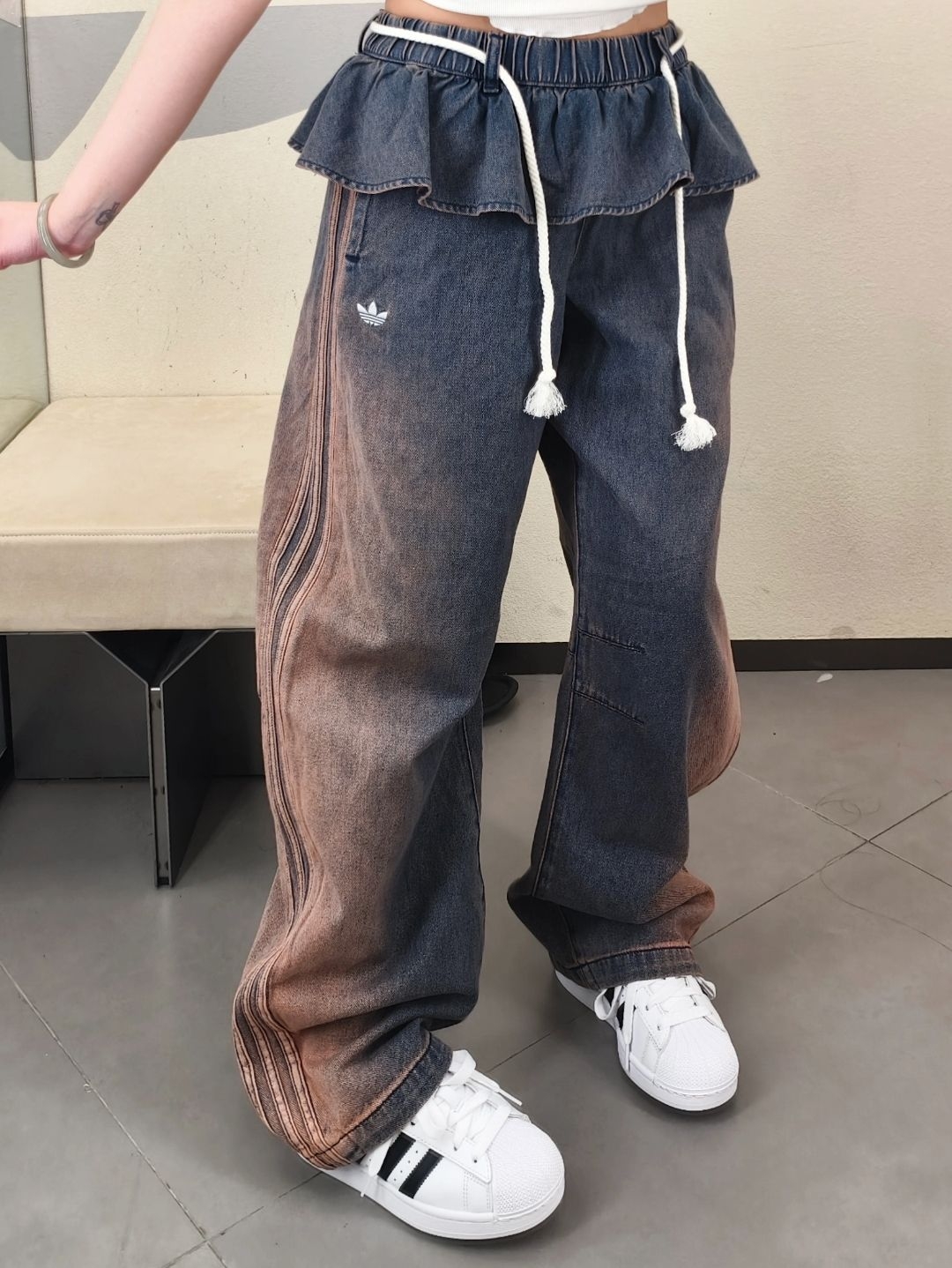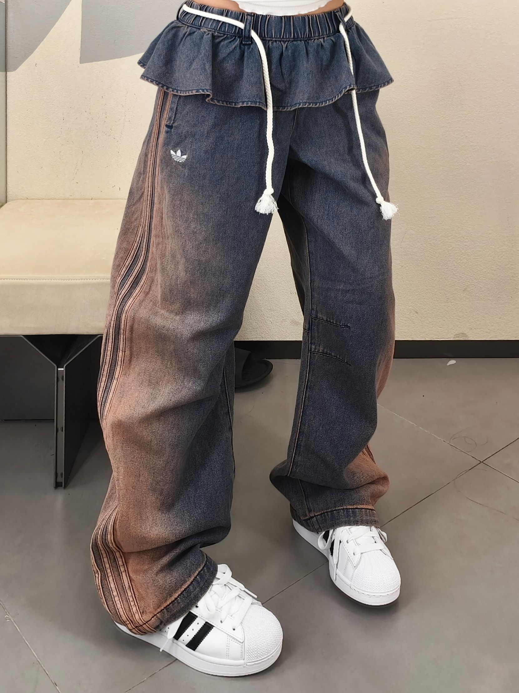 - 渐变水洗做旧感超有层次✨软乎乎牛仔布不硬挺,贴肤很舒服! - 荷叶边腰头+抽绳设计🎀甜酷风拉满,藏住小肚腩还显腰细! - 经典三条纹+阔腿版型🦵藏肉又显腿直,配小白鞋超减龄!