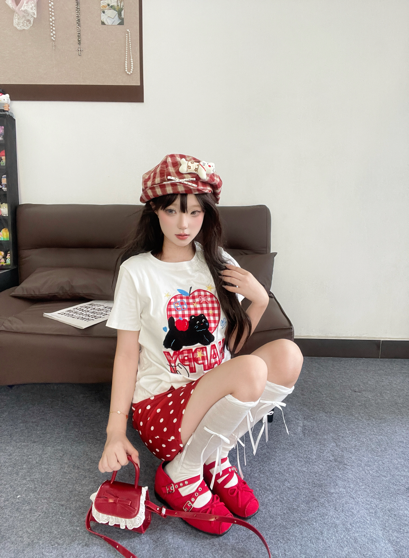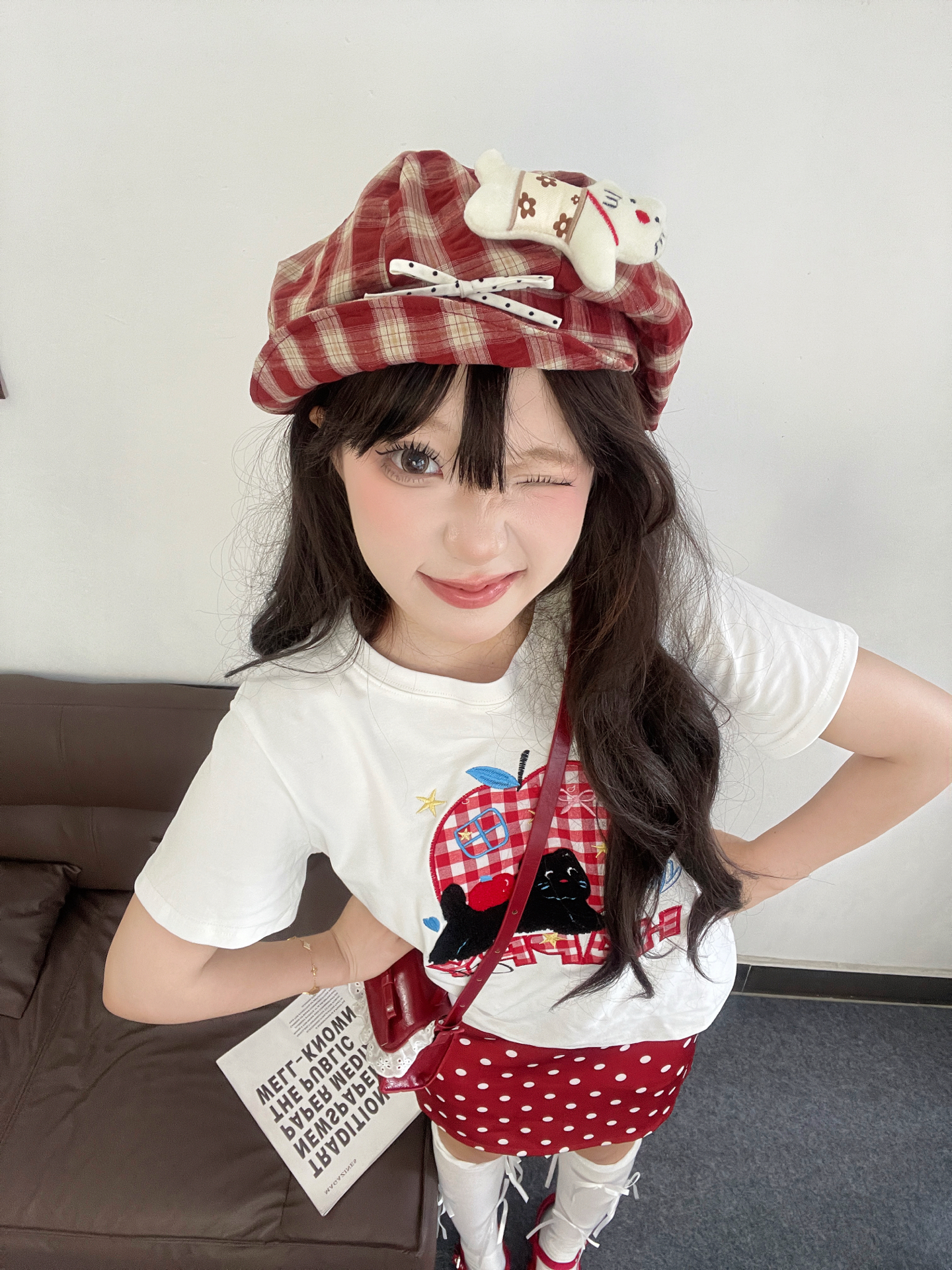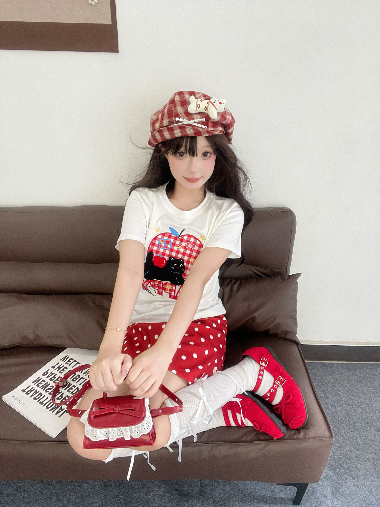 🗣️今日份穿搭分享来啦! 春天就是要穿明媚的色系呀❣️,喜欢这件贴布刺绣🪡T恤,小猫和苹果🍎的图案很可爱哦~搭配同色系的波点裙和鞋子,妥妥的多巴胺氛围📸 还有我的百搭配饰:小狗格纹贝雷帽🦴,宽帽檐戴上很显脸小哦✨ #一件入春穿搭 #春季配饰预习清单 #潮人的春天来了 #早八无脑穿搭 #开学一周OOTD
